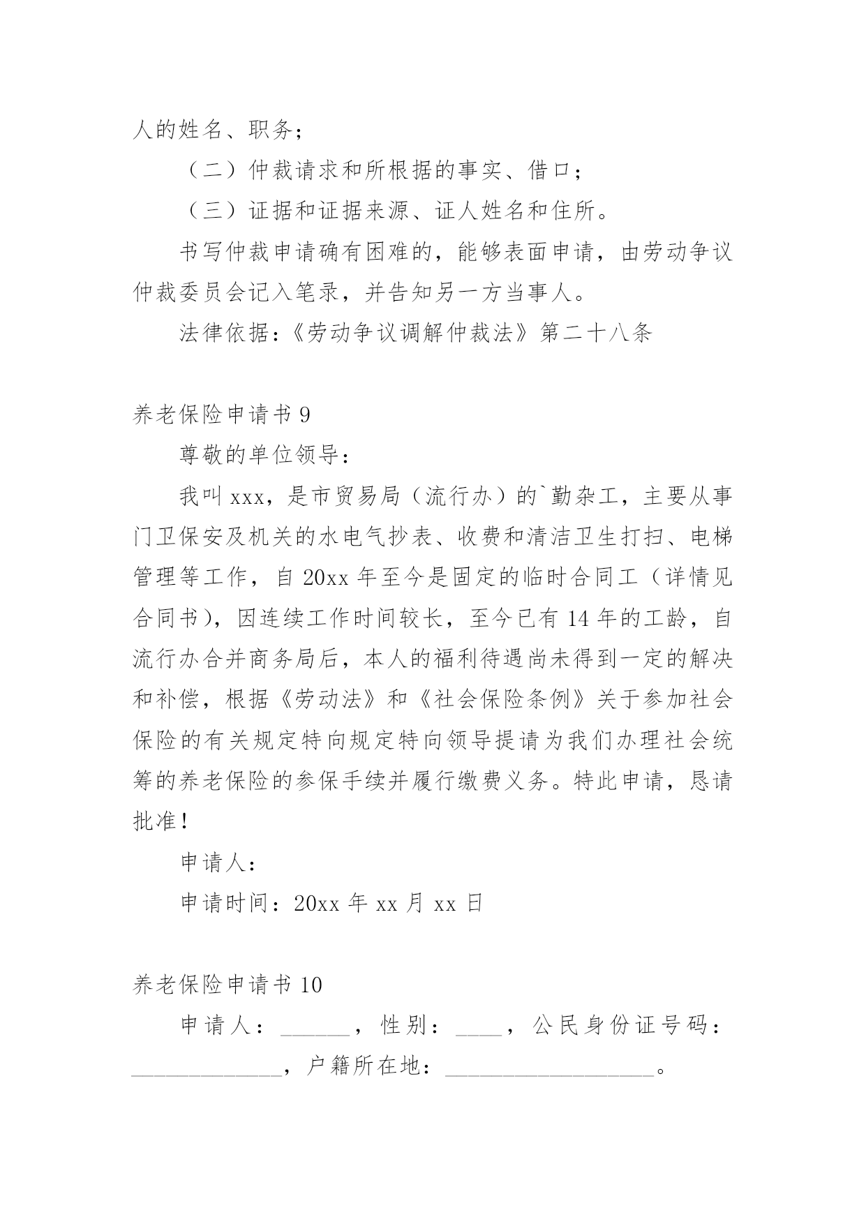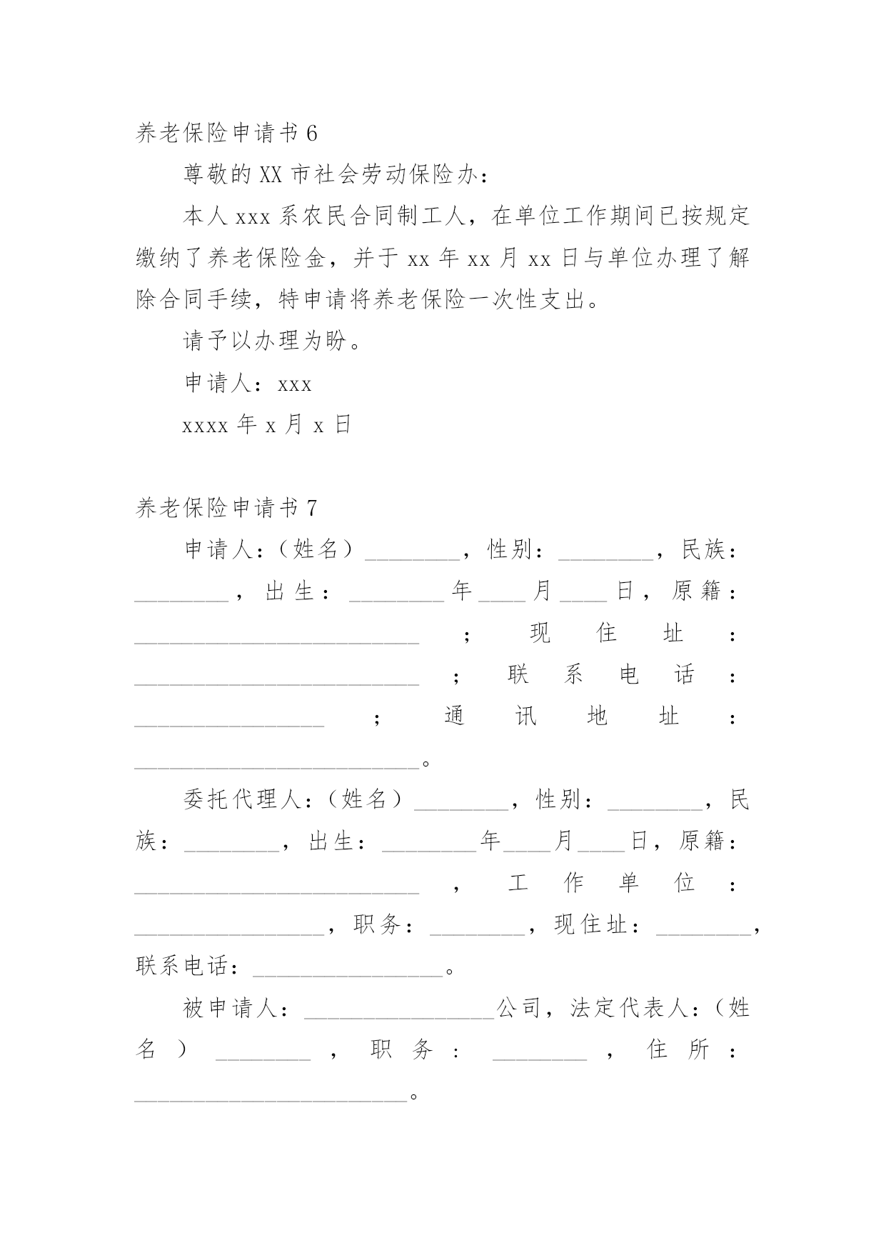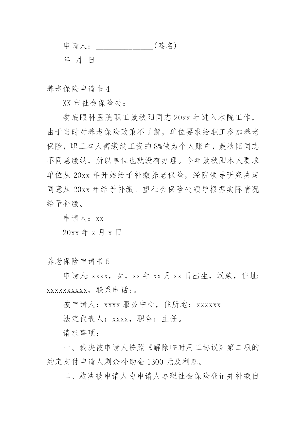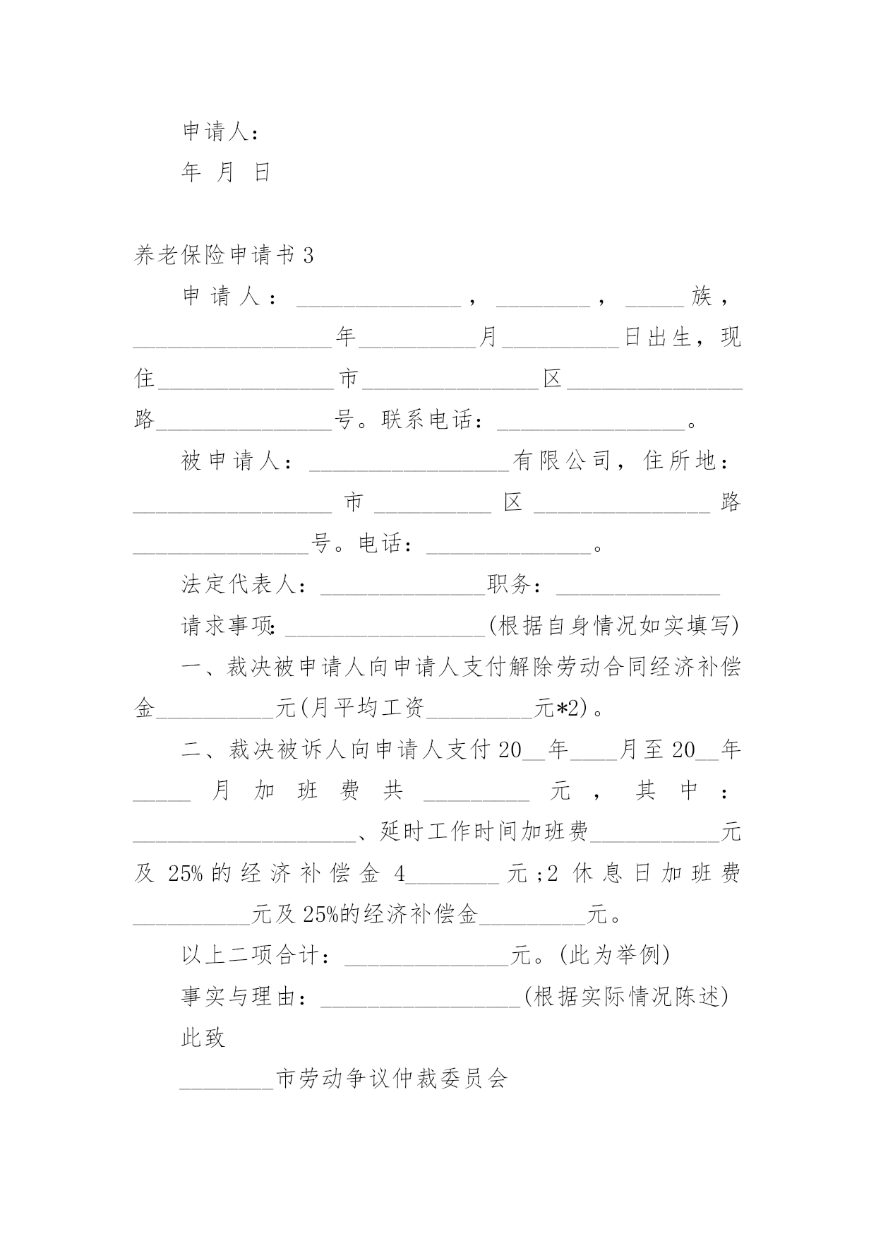 养老保险申请书随着时代在进步,申请书与我们的关系越来越密切,通过申请书,我们可以提出自己的请求。那么申请书应该怎么写才合适呢?下面是小编整理的养老保险申请书,欢迎大家借鉴与参考,希望对大家有所帮助。养老保险申请书1尊敬的公司领导:您好!首先感谢公司领导对我的栽培和帮忙。我是一名,x年x月进于入公司工作,至今已有x年。公司的'不断发展壮大,我个人的潜力也在不断提升和进步。由于珍惜并且热爱这份工作,因此在自我的岗位上,我一向努力工作,认真负责。在此,特向公司申请给予我购买社保的请求,期望公司能够批准为盼,多谢!此致敬礼!申请人:xxx20xx年xx月xx日养老保险申请书2XX市社会劳动保险办:本人______系农民合同制工人,在单位工作期间已按规定缴纳了养老保险金,并于____年__月__日与单位办理了解除合同手续,特申请将养老保险一次性支出。请予以办理为盼。申请人:年月日养老保险申请书3申请人:______________,________,_____族,_________________年__________月__________日出生,现住_______________市_______________区_______________路_______________号。联系电话:________________。被申请人:_________________有限公司,住所地:_________________市__________区_______________路_______________号。电话:______________。法定代表人:______________职务:______________请求事项:_________________(根据自身情况如实填写)一、裁决被申请人向申请人支付解除劳动合同经济补偿金__________元(月平均工资_________元*2)。二、裁决被诉人向申请人支付20__年____月至20__年_____月加班费共_________元,其中:___________________、延时工作时间加班费___________元及25%的经济补偿金4________元;2休息日加班费__________元及25%的经济补偿金_________元。以上二项合计:______________元。(此为举例)事实与理由:_________________(根据实际情况陈述)此致________市劳动争议仲裁委员会申请人:______________(签名)年月日养老保险申请书4XX市社会保险处:娄底眼科医院职工聂秋阳同志20xx年进入本院工作,由于当时对养老保险政策不了解,单位要求给职工参加养老保险,职工本人需缴纳工资的8%做为个人账户,聂秋阳同志不同意缴纳,所以单位也就没有办理。今年聂秋阳本人要求单位从20xx年开始给予补缴养老保险,经院领导研究决定同意从20xx年给予补缴。望社会保险处领导根据实际情况给予补缴。申请人:xx20xx年x月x日养老保险申请书5申请人:xxxx,女,xx年xx月xx日出生,汉族,住址:xxxxxxxxxx,联系电话:。被申请人:xxxx服务中心,住所地:xxxxxx法定代表人:xxxx,职务:主任。请求事项:一、裁决被申请人按照《解除临时用工协议》第二项的约定支付申请人剩余补助金1300元及利息。二、裁决被申请人为申请人办理社会保险登记并补缴自年月日至年月日的养老、工伤、医疗保险。三、裁决被申请人赔偿申请人24个月的失业保险金损失元。事实与理由:申请人xxxx于年到xxxx工商局参加工作,年月与xxxx工商局办理了招工转正手续,属于xxxx工商局职工(有档案为证)。20xx年xxxx工商局脱钩改制,将xxxx的`工作关系转到xxxx服务中心(档案随同移交),申请人与被申请人形成新的劳动关系。但被申请人一直没有为申请人解决编制问题,也没有为被申请人缴纳任何社会保险。年月日,被申请人单方宣布解除脱钩改制转交过来的包括申请人在内的37名员工劳动关系,20xx年3月20日被申请人与申请人签订解除临时用工协议(以下称协议)。协议约定,被申请人根据申请人参加工作时间至协议签订之日计算,每年补助申请人100元,共2600元(元xx年),在签订协议时,首付给申请人50%,剩余50%一年后付清。被申请人于签订协议时已支付给申请人50%的补助,但剩余50%的补助金至今仍未支付,申请人多次催要,均遭拒绝。《劳动法》第72条规定:“用人单位和劳动者必须依法参加社会保险,缴纳社会保险费。”《社会保险费征缴暂行条例》第12条规定:“社会保险费不得减免。”第13条规定:“缴费单位未按规定缴纳和代扣代缴社会保险费的,由劳动保障行政部门或者税务机关责令其限期缴纳;逾期仍不缴纳的,除补缴欠缴的数额