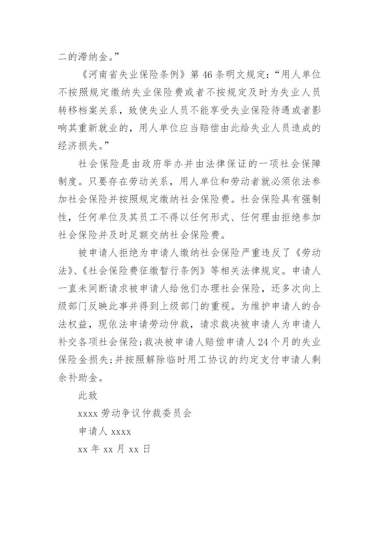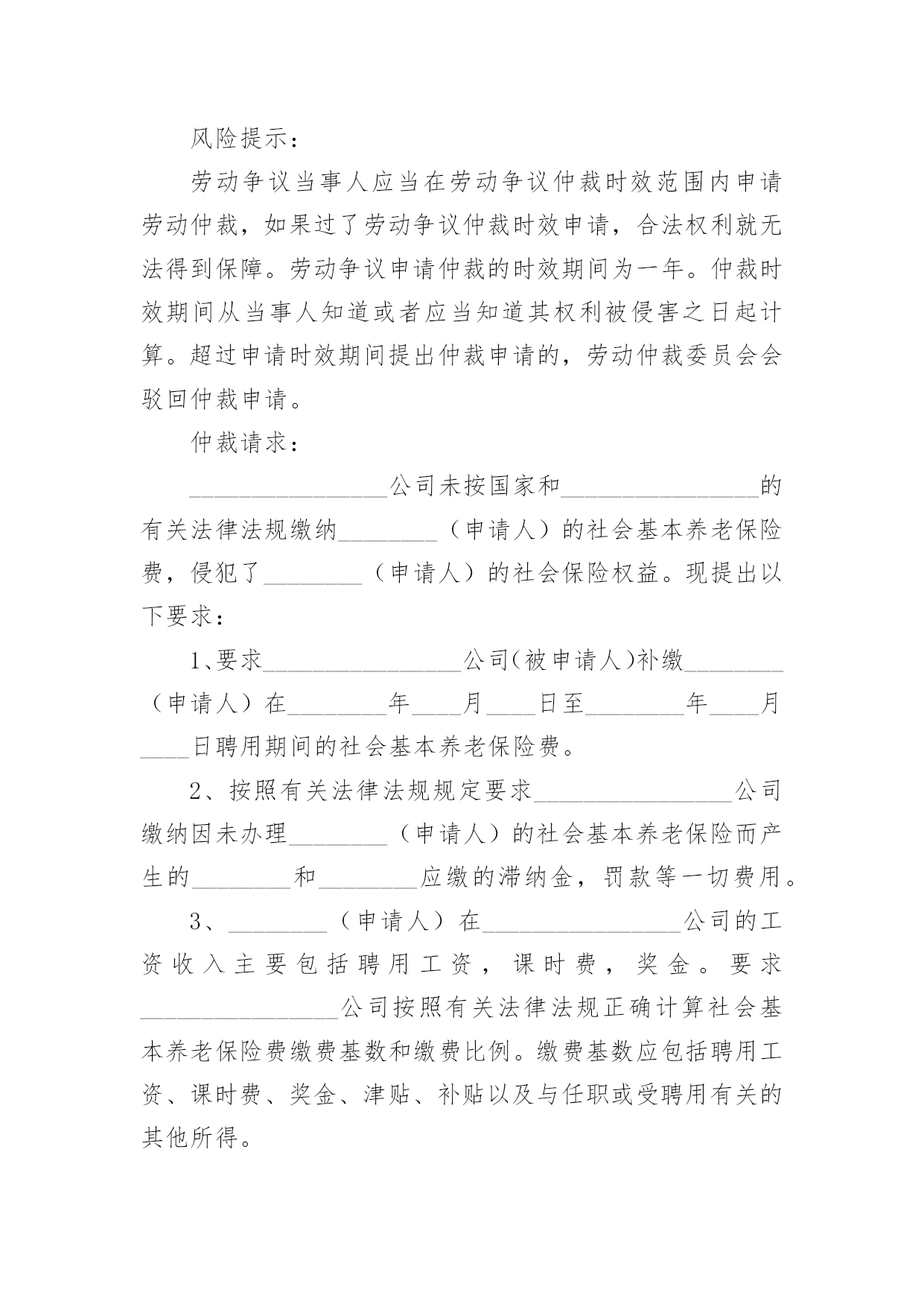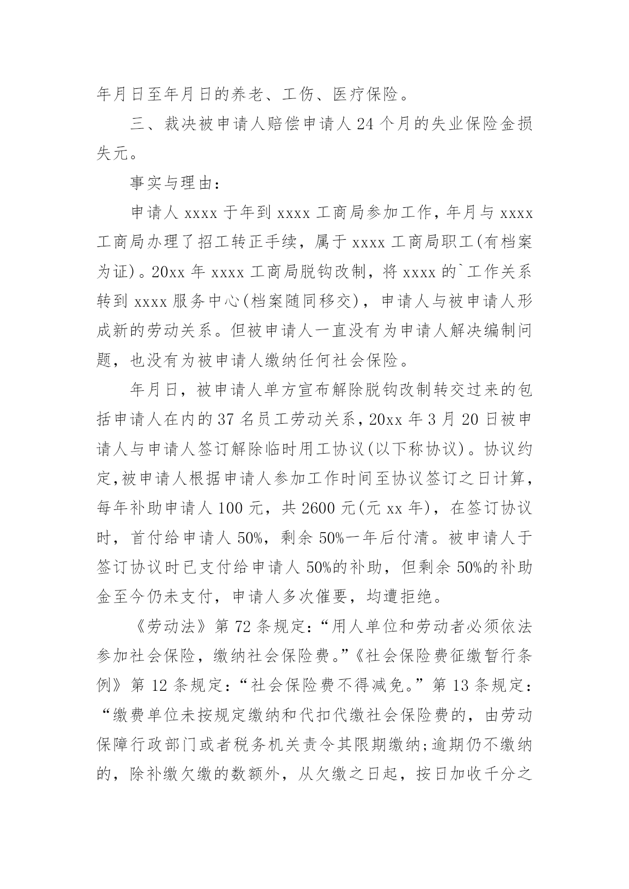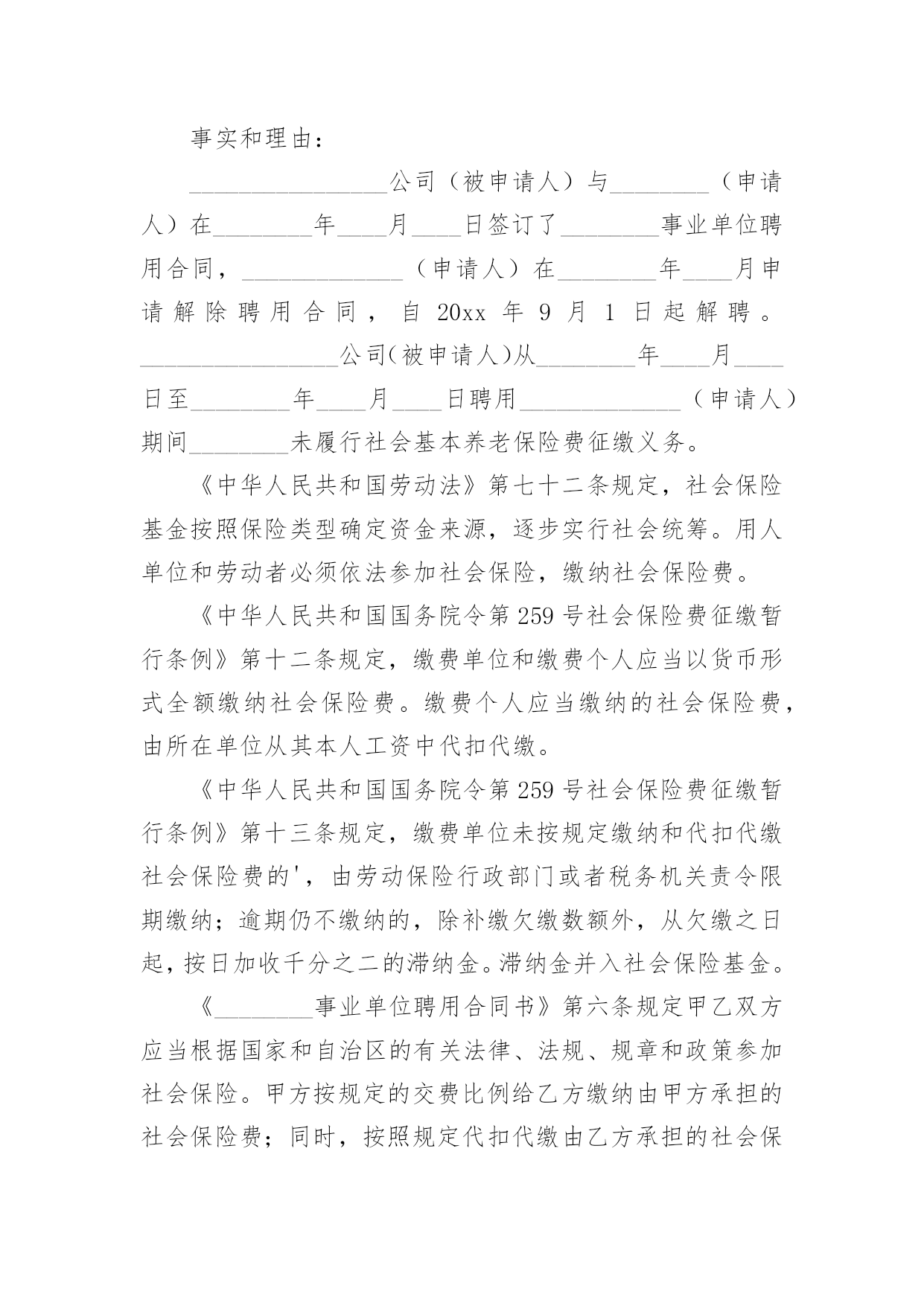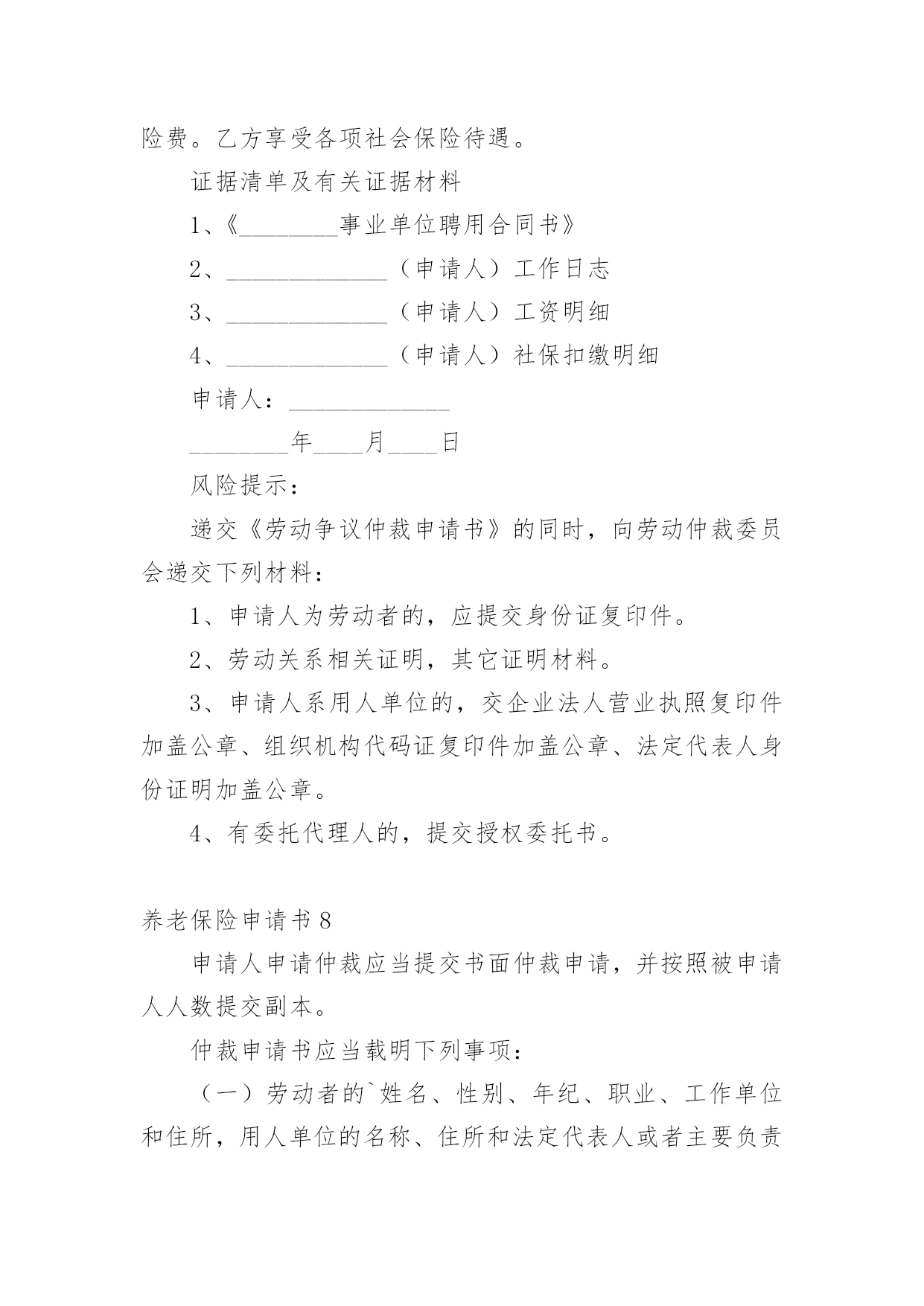 养老保险申请书随着时代在进步,申请书与我们的关系越来越密切,通过申请书,我们可以提出自己的请求。那么申请书应该怎么写才合适呢?下面是小编整理的养老保险申请书,欢迎大家借鉴与参考,希望对大家有所帮助。养老保险申请书1尊敬的公司领导:您好!首先感谢公司领导对我的栽培和帮忙。我是一名,x年x月进于入公司工作,至今已有x年。公司的'不断发展壮大,我个人的潜力也在不断提升和进步。由于珍惜并且热爱这份工作,因此在自我的岗位上,我一向努力工作,认真负责。在此,特向公司申请给予我购买社保的请求,期望公司能够批准为盼,多谢!此致敬礼!申请人:xxx20xx年xx月xx日养老保险申请书2XX市社会劳动保险办:本人______系农民合同制工人,在单位工作期间已按规定缴纳了养老保险金,并于____年__月__日与单位办理了解除合同手续,特申请将养老保险一次性支出。请予以办理为盼。申请人:年月日养老保险申请书3申请人:______________,________,_____族,_________________年__________月__________日出生,现住_______________市_______________区_______________路_______________号。联系电话:________________。被申请人:_________________有限公司,住所地:_________________市__________区_______________路_______________号。电话:______________。法定代表人:______________职务:______________请求事项:_________________(根据自身情况如实填写)一、裁决被申请人向申请人支付解除劳动合同经济补偿金__________元(月平均工资_________元*2)。二、裁决被诉人向申请人支付20__年____月至20__年_____月加班费共_________元,其中:___________________、延时工作时间加班费___________元及25%的经济补偿金4________元;2休息日加班费__________元及25%的经济补偿金_________元。以上二项合计:______________元。(此为举例)事实与理由:_________________(根据实际情况陈述)此致________市劳动争议仲裁委员会申请人:______________(签名)年月日养老保险申请书4XX市社会保险处:娄底眼科医院职工聂秋阳同志20xx年进入本院工作,由于当时对养老保险政策不了解,单位要求给职工参加养老保险,职工本人需缴纳工资的8%做为个人账户,聂秋阳同志不同意缴纳,所以单位也就没有办理。今年聂秋阳本人要求单位从20xx年开始给予补缴养老保险,经院领导研究决定同意从20xx年给予补缴。望社会保险处领导根据实际情况给予补缴。申请人:xx20xx年x月x日养老保险申请书5申请人:xxxx,女,xx年xx月xx日出生,汉族,住址:xxxxxxxxxx,联系电话:。被申请人:xxxx服务中心,住所地:xxxxxx法定代表人:xxxx,职务:主任。请求事项:一、裁决被申请人按照《解除临时用工协议》第二项的约定支付申请人剩余补助金1300元及利息。二、裁决被申请人为申请人办理社会保险登记并补缴自年月日至年月日的养老、工伤、医疗保险。三、裁决被申请人赔偿申请人24个月的失业保险金损失元。事实与理由:申请人xxxx于年到xxxx工商局参加工作,年月与xxxx工商局办理了招工转正手续,属于xxxx工商局职工(有档案为证)。20xx年xxxx工商局脱钩改制,将xxxx的`工作关系转到xxxx服务中心(档案随同移交),申请人与被申请人形成新的劳动关系。但被申请人一直没有为申请人解决编制问题,也没有为被申请人缴纳任何社会保险。年月日,被申请人单方宣布解除脱钩改制转交过来的包括申请人在内的37名员工劳动关系,20xx年3月20日被申请人与申请人签订解除临时用工协议(以下称协议)。协议约定,被申请人根据申请人参加工作时间至协议签订之日计算,每年补助申请人100元,共2600元(元xx年),在签订协议时,首付给申请人50%,剩余50%一年后付清。被申请人于签订协议时已支付给申请人50%的补助,但剩余50%的补助金至今仍未支付,申请人多次催要,均遭拒绝。《劳动法》第72条规定:“用人单位和劳动者必须依法参加社会保险,缴纳社会保险费。”《社会保险费征缴暂行条例》第12条规定:“社会保险费不得减免。”第13条规定:“缴费单位未按规定缴纳和代扣代缴社会保险费的,由劳动保障行政部门或者税务机关责令其限期缴纳;逾期仍不缴纳的,除补缴欠缴的数额