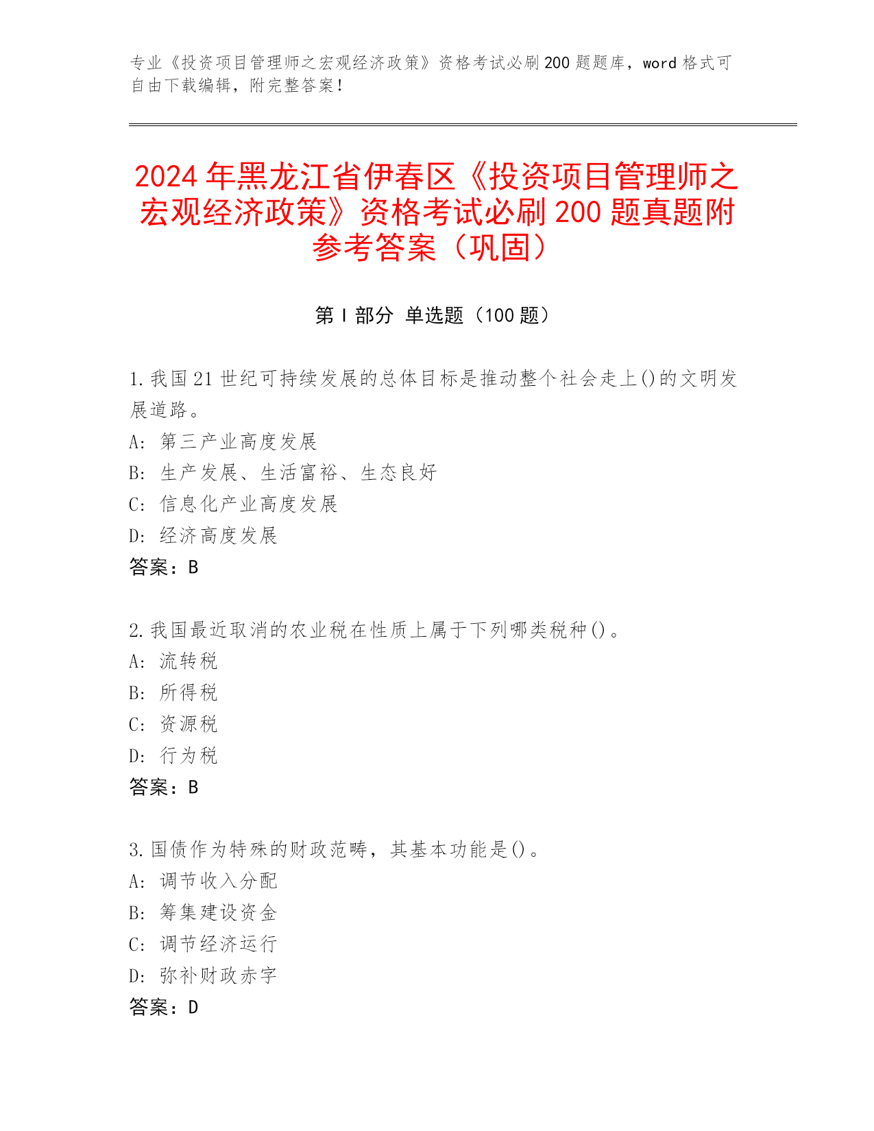 黑龙江省嫩江县《投资项目管理师之宏观经济政策》资格考试必刷200题真题题库(真题汇编)