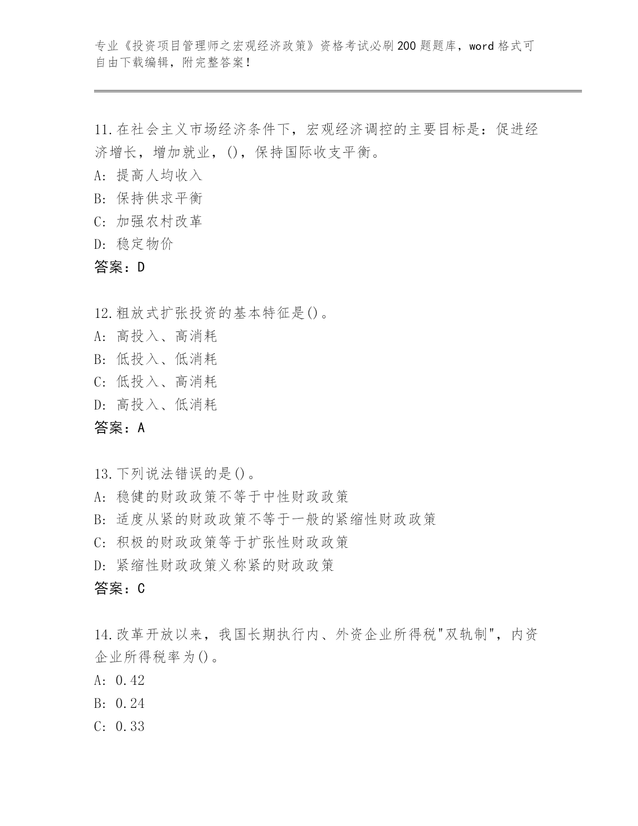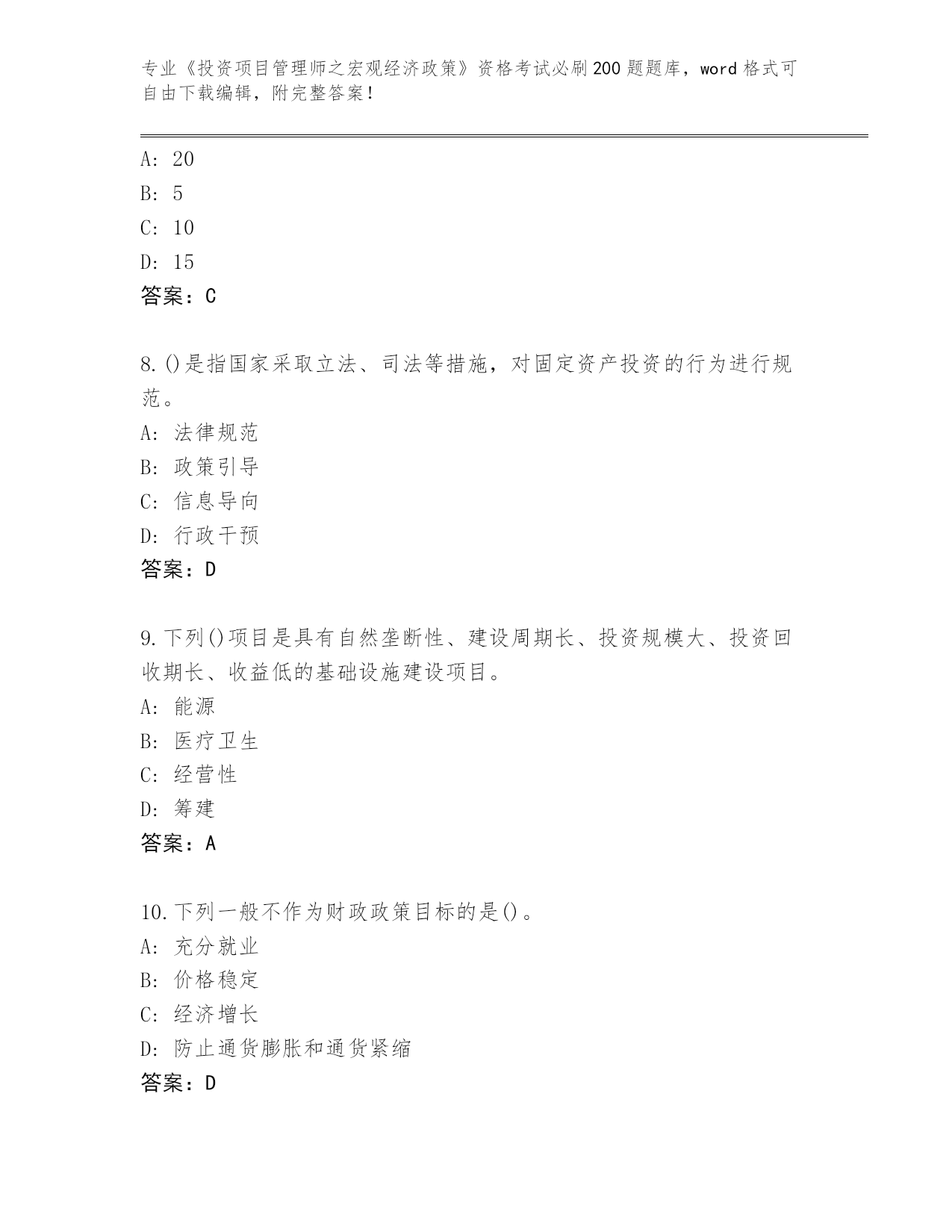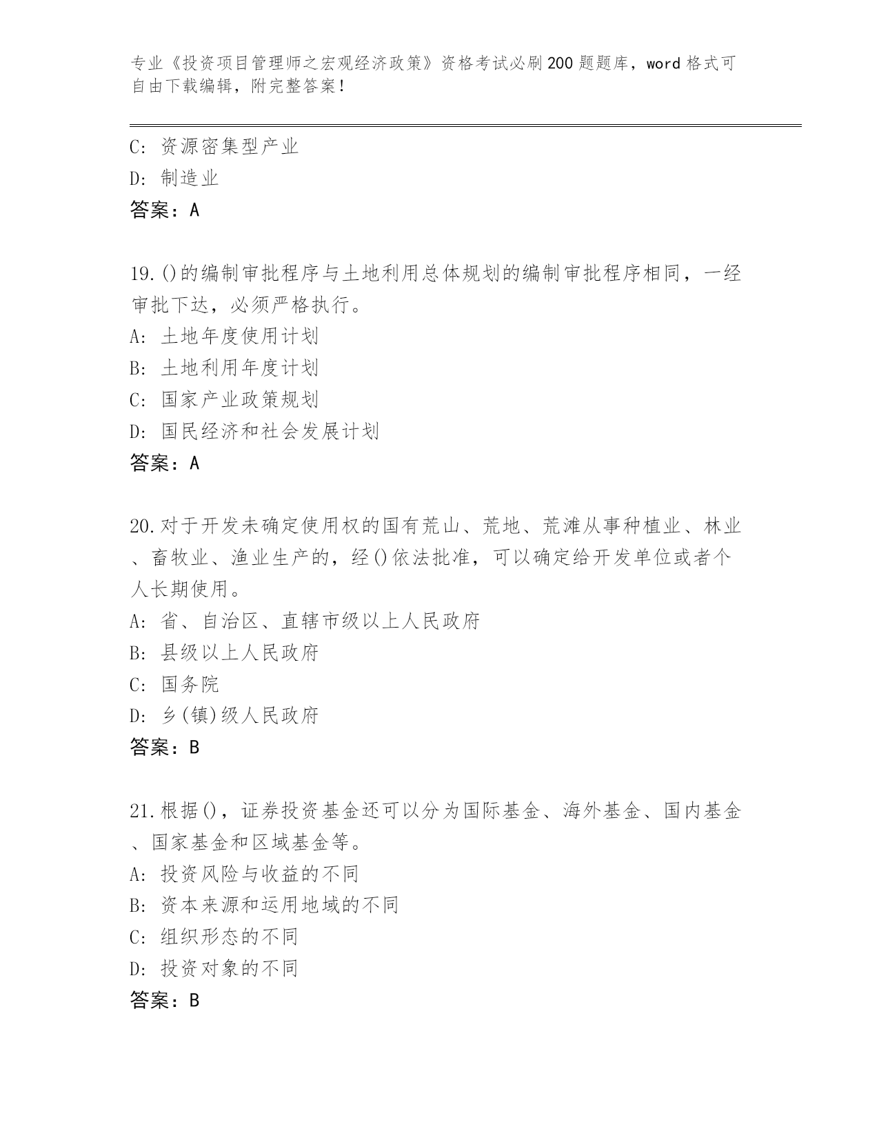 江西省整理《投资项目管理师之宏观经济政策》资格考试必刷200题真题(各地真题)