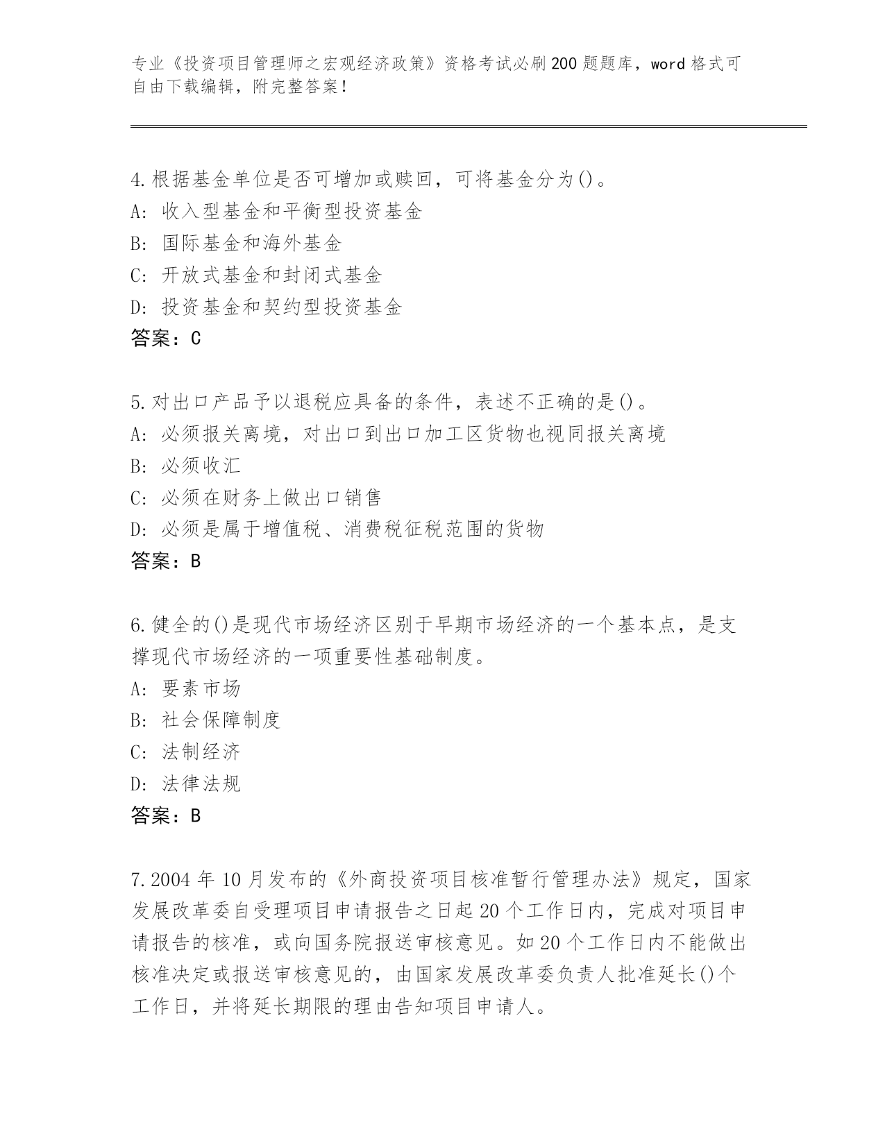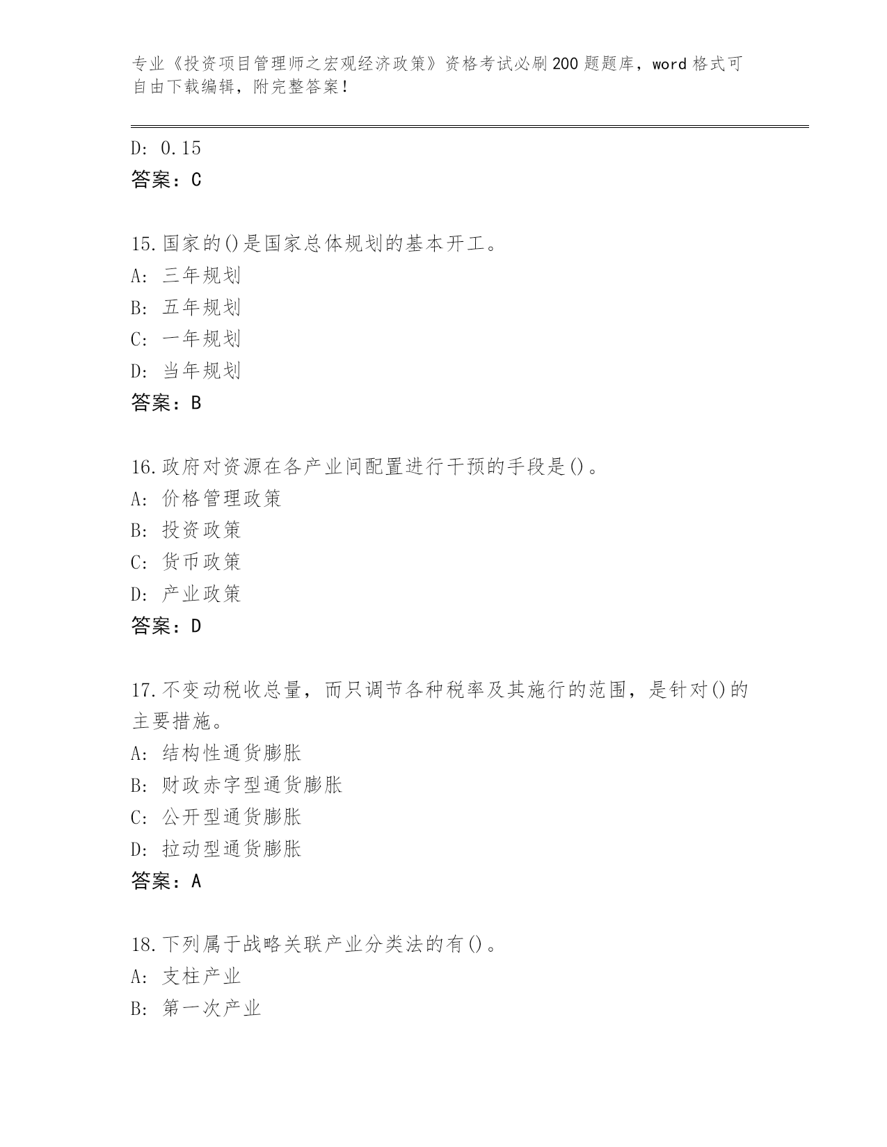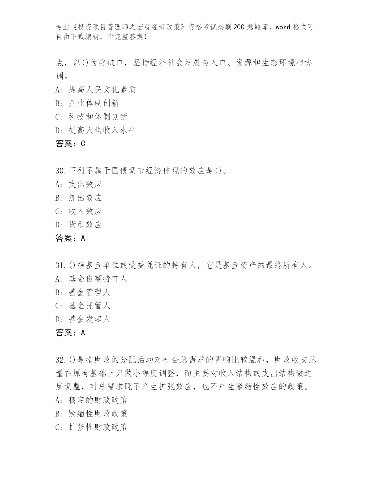 江西省整理《投资项目管理师之宏观经济政策》资格考试必刷200题真题(各地真题)