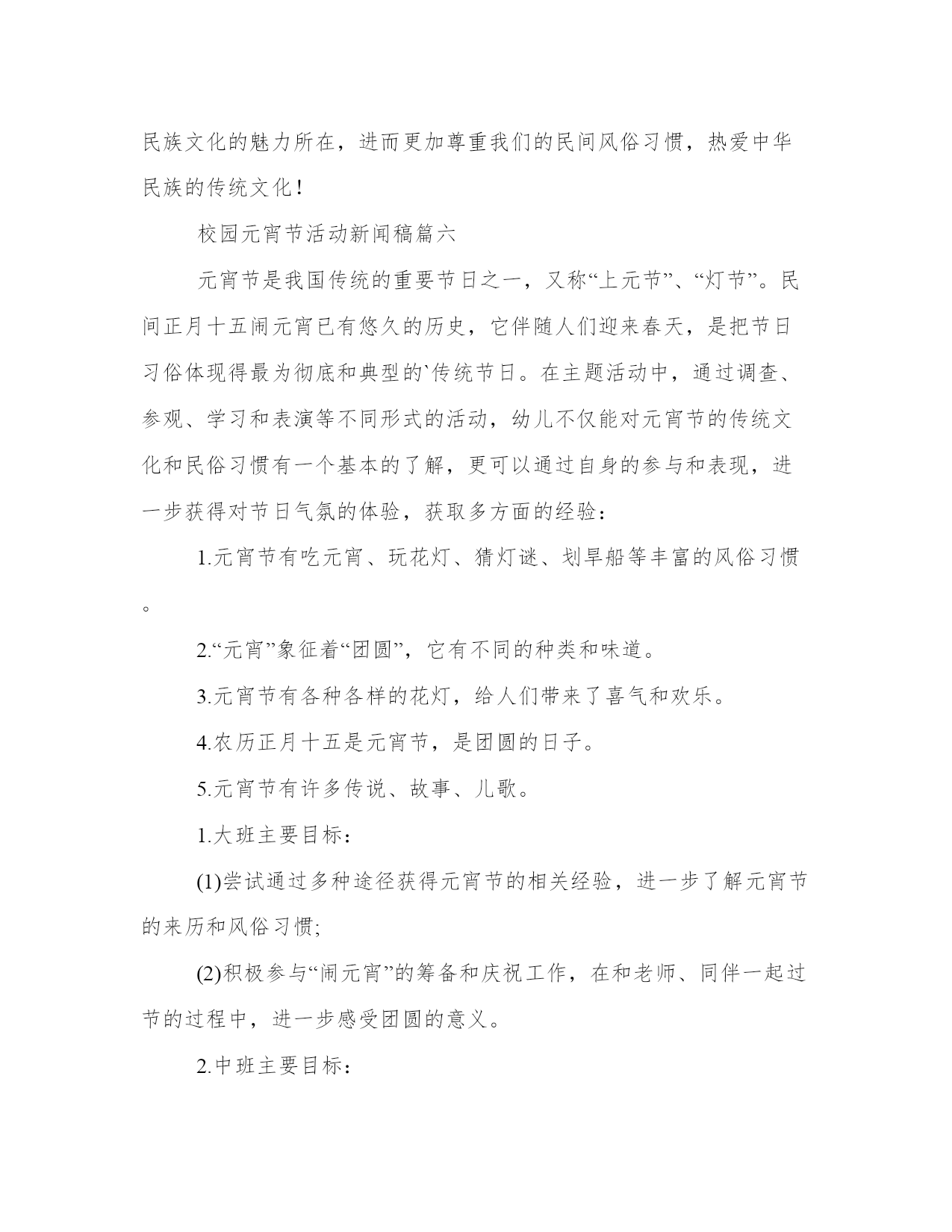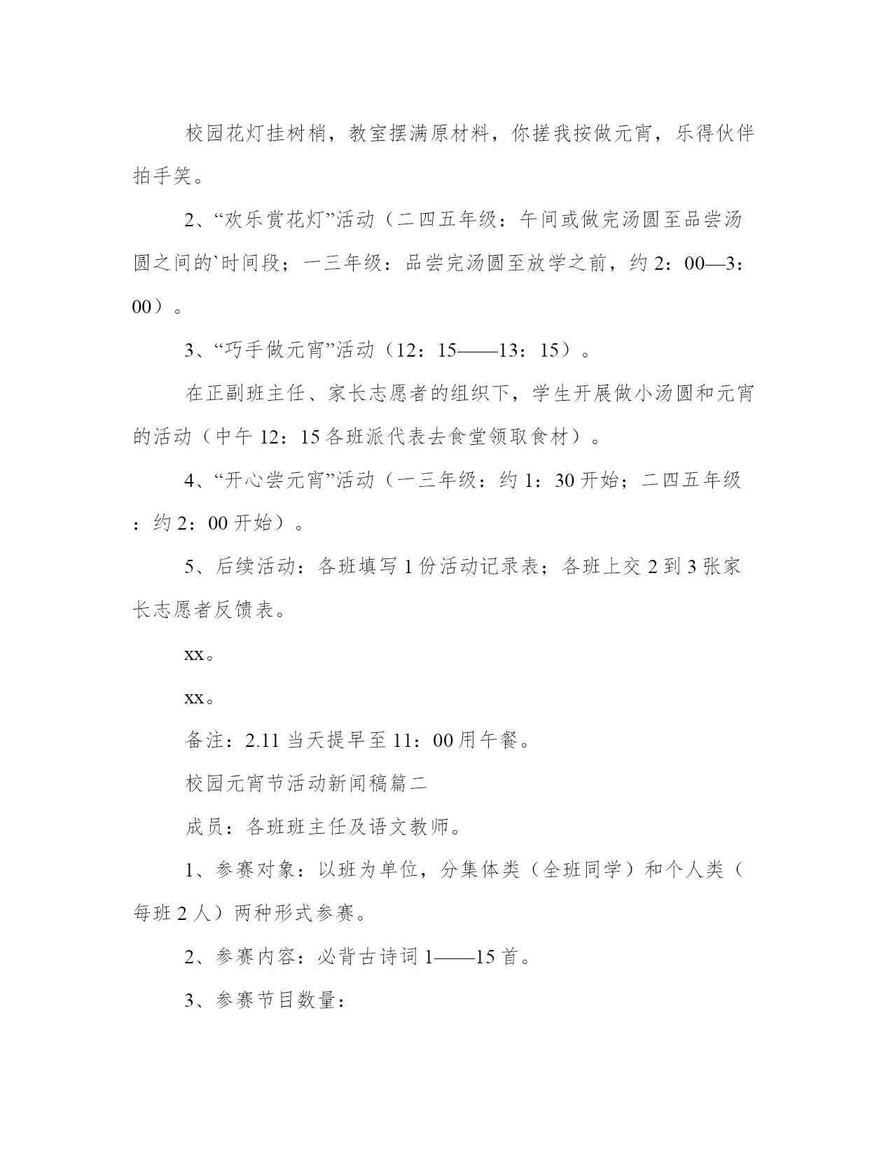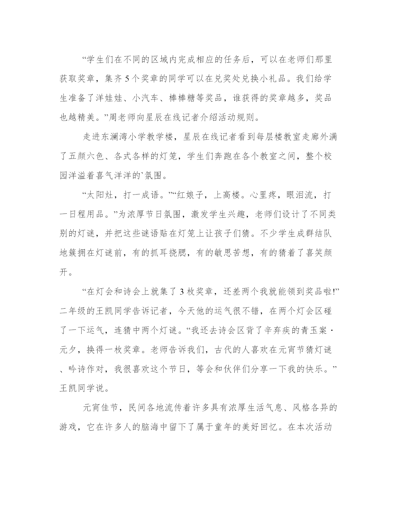 校园元宵节活动新闻稿(热门16篇)总结不仅仅是对过去的总结,也是对未来的规划和展望。在写总结时,不要忘记对过去的经验进行总结和汲取教训。总结是让我们不断优化自己的利器;校园元宵节活动新闻稿篇一为弘扬民族文化,引导学生体会我国传统的元宵节活动的热闹氛围,了解多姿多彩的节日文化,学校将组织学生进行小型多样的闹元宵活动。通过活动,营造欢乐祥和、健康向上的节日氛围,培养学生积极探索、分工合作、乐于分享的态度。金狗迎春到,欢乐闹元宵。20xx年寒假以及2月11日下午,12:15开始。(一)前期准备(寒假)。(二)主题活动(元宵节当天)。1、营造浓郁的活动氛围。(1)电子屏幕滚动播放传统节日文化宣传语、童谣等,营造节日氛围。——xx负责。闹元宵童谣——。正月十五闹元宵,欢庆锣鼓使劲敲,敲得狮子大抖毛,庆贺一年春来到。校园花灯挂树梢,教室摆满原材料,你搓我按做元宵,乐得伙伴拍手笑。2、“欢乐赏花灯”活动(二四五年级:午间或做完汤圆至品尝汤圆之间的`时间段;一三年级:品尝完汤圆至放学之前,约2:00—3:00)。3、“巧手做元宵”活动(12:15——13:15)。在正副班主任、家长志愿者的组织下,学生开展做小汤圆和元宵的活动(中午12:15各班派代表去食堂领取食材)。4、“开心尝元宵”活动(一三年级:约1:30开始;二四五年级:约2:00开始)。5、后续活动:各班填写1份活动记录表;各班上交2到3张家长志愿者反馈表。xx。xx。备注:2.11当天提早至11:00用午餐。校园元宵节活动新闻稿篇二成员:各班班主任及语文教师。1、参赛对象:以班为单位,分集体类(全班同学)和个人类(每班2人)两种形式参赛。2、参赛内容:必背古诗词1——15首。3、参赛节目数量:全员诵读:每班集体类诵读15首,每班比赛时,由评委从各班上报的必背和篇目中随机抽选5至10首必背篇目背诵。背诵时要背齐题目、朝代、个人类:必选作品背诵1——15首必背古诗;自选作品事先准备好一首诗背诵表演,表演形式不限(可加乐器、录音带伴奏)。4、比赛时间:11月29日下午最后两节课。5、比赛地点:教学楼间广常。6、比赛形式:现场打分,现场统计。评委:马池兴王玲徐华。成绩统计:管新月毛慧中王奕苏。1、学生集体奖:去掉一个分,去掉一个最低分,其余总成绩平均分为该班的参赛成绩,取前两名获优胜奖。2、个人奖:去掉一个分,去掉一个最低分,其余总成绩平均分为其成绩,设三个奖次,一等奖2个,二等奖2个,三等奖4个。1、各班主任及语文教师要高度重视,组织学生扎实开展读书活动,保证学生读书时间,积极参加本次竞赛活动,扩大学生知识积累,提高学生阅读兴趣和能力,营造书香校园,提升文化品位。2、全体语文教师要认真选材,悉心指导,努力创新形式,丰富内容,确保竞赛活动的.针对性和实效性。3、活动中,要求学生人人参与,个个登台,统一着装,培养学生的参与意识和集体荣誉感。4、竞赛活动结束后,各教师要通过早读阅读指导,课堂教学渗透,语文综合性学习,读书成果展评等形式,将读书活动、经典名篇诵读活动深入持久的开展下去。校园元宵节活动新闻稿篇三初中部和高中各年级领导对这次活动高度重视,都提前做了充分准备,领导自始自终不离现场,整个活动组织有序,活动前后校园卫生保持良好,做到了喜庆安全。这次活动内容十分丰富,各个组织单位都精心安排,相互竞争,各显其能,高下难分,充分展示了各自的工作特色。如,高补年级充分利用文化广场的资源优势,会场布置有创意、主题明确、灯笼花色品种多样、灯谜充足,花灯从悬挂到最后回收责任到班,善始善终。高三年级除组织学生竞猜灯谜、现场抢答外,还安排了保龄球、三人四条腿、乒乓球打靶、足球射门、足球绕杆、转呼拉圈、运蓝球比快、摸石头过河、自行车比慢、才艺展示等12项趣味比赛,活动内容丰富多彩,持续时间长。高二年级的活动分两段时间安排,全体学生先参加猜灯谜活动,然后统一在学校操场举行了跳绳、三分球、卡拉ok、骑自行车、中场射门、羽毛球发球进框、盲人走路、数纸、写数字等8项游戏活动,学生热情高,效果好。高一年级活动方案细致,有安排,有总结,主题鲜明,除猜灯谜外,还组织了小型演唱会,花灯悬挂有专人看护,会场布置保持时间长。初中部会场布置花灯悬挂赏心悦目,灯谜充足,打印形式整齐美观,内容丰富,知识性强,以教研组为单位组织兑奖,学生参与面广,秩序很好。本次活动以猜灯谜活动为主,知识性强,全校师生员工广泛参与,发展了学生智力,活跃了校园生活,增进了师生感情,丰富了校园文化内涵。由于是首次组织5000多名大规模的学生活动,缺乏经验,本次活动还存在以下值得今后改进之处:一是有的年级灯谜数量准备不足,也没有事先做好活动时间控制,整个活动持续时间较短;