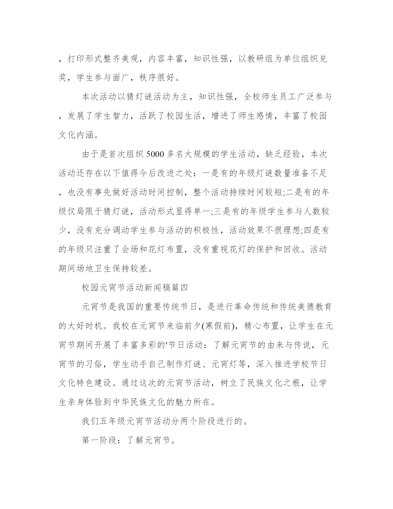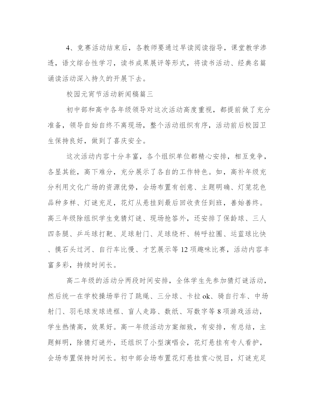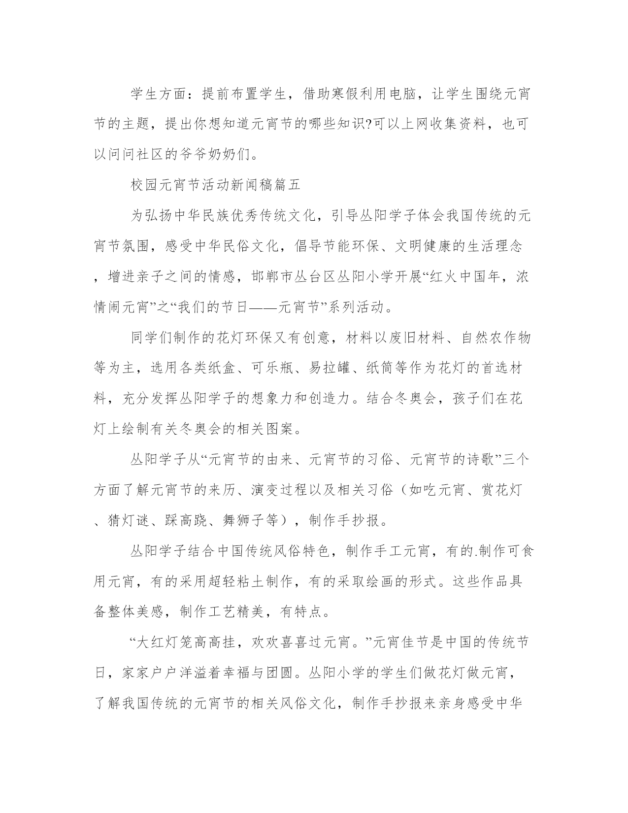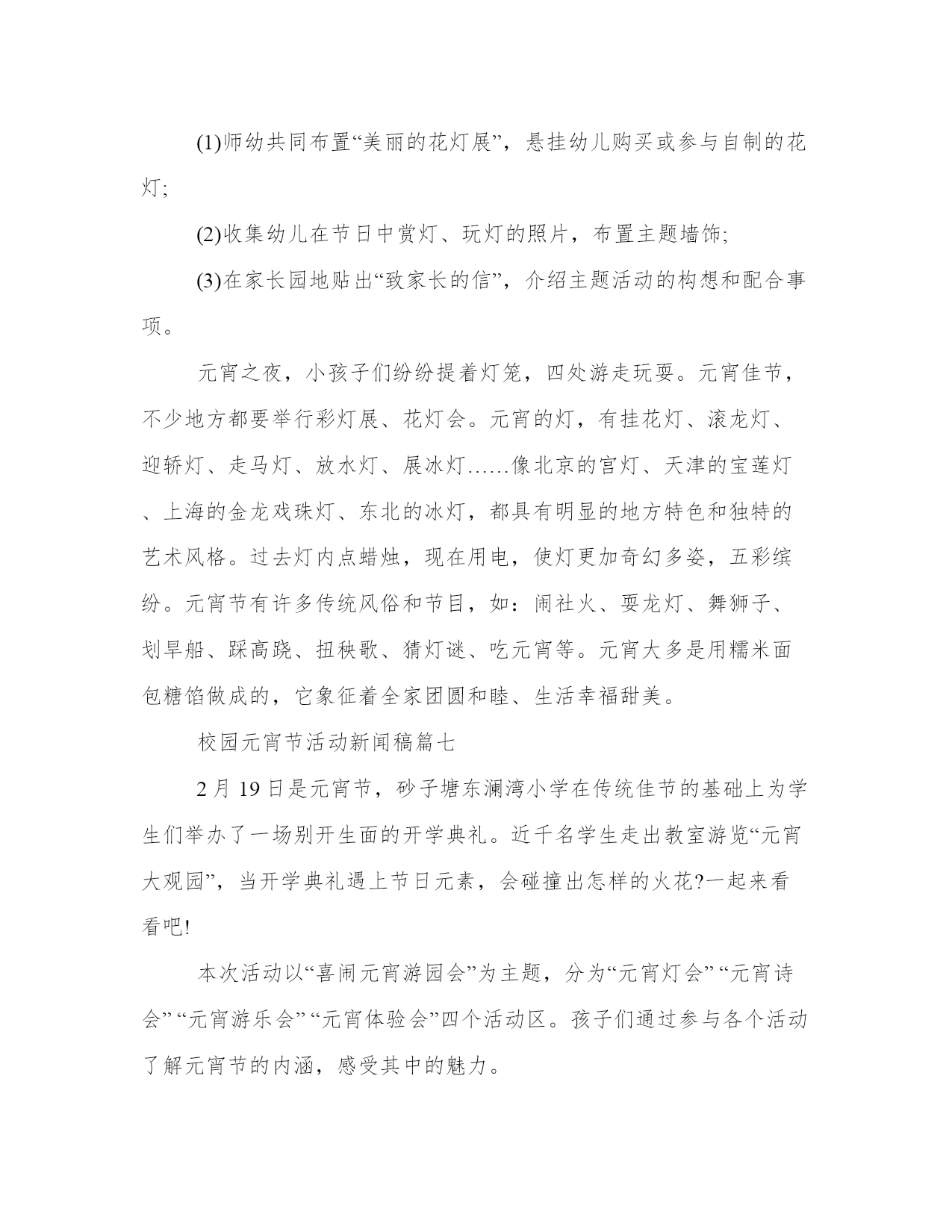 校园元宵节活动新闻稿(热门16篇)总结不仅仅是对过去的总结,也是对未来的规划和展望。在写总结时,不要忘记对过去的经验进行总结和汲取教训。总结是让我们不断优化自己的利器;校园元宵节活动新闻稿篇一为弘扬民族文化,引导学生体会我国传统的元宵节活动的热闹氛围,了解多姿多彩的节日文化,学校将组织学生进行小型多样的闹元宵活动。通过活动,营造欢乐祥和、健康向上的节日氛围,培养学生积极探索、分工合作、乐于分享的态度。金狗迎春到,欢乐闹元宵。20xx年寒假以及2月11日下午,12:15开始。(一)前期准备(寒假)。(二)主题活动(元宵节当天)。1、营造浓郁的活动氛围。(1)电子屏幕滚动播放传统节日文化宣传语、童谣等,营造节日氛围。——xx负责。闹元宵童谣——。正月十五闹元宵,欢庆锣鼓使劲敲,敲得狮子大抖毛,庆贺一年春来到。校园花灯挂树梢,教室摆满原材料,你搓我按做元宵,乐得伙伴拍手笑。2、“欢乐赏花灯”活动(二四五年级:午间或做完汤圆至品尝汤圆之间的`时间段;一三年级:品尝完汤圆至放学之前,约2:00—3:00)。3、“巧手做元宵”活动(12:15——13:15)。在正副班主任、家长志愿者的组织下,学生开展做小汤圆和元宵的活动(中午12:15各班派代表去食堂领取食材)。4、“开心尝元宵”活动(一三年级:约1:30开始;二四五年级:约2:00开始)。5、后续活动:各班填写1份活动记录表;各班上交2到3张家长志愿者反馈表。xx。xx。备注:2.11当天提早至11:00用午餐。校园元宵节活动新闻稿篇二成员:各班班主任及语文教师。1、参赛对象:以班为单位,分集体类(全班同学)和个人类(每班2人)两种形式参赛。2、参赛内容:必背古诗词1——15首。3、参赛节目数量:全员诵读:每班集体类诵读15首,每班比赛时,由评委从各班上报的必背和篇目中随机抽选5至10首必背篇目背诵。背诵时要背齐题目、朝代、个人类:必选作品背诵1——15首必背古诗;自选作品事先准备好一首诗背诵表演,表演形式不限(可加乐器、录音带伴奏)。4、比赛时间:11月29日下午最后两节课。5、比赛地点:教学楼间广常。6、比赛形式:现场打分,现场统计。评委:马池兴王玲徐华。成绩统计:管新月毛慧中王奕苏。1、学生集体奖:去掉一个分,去掉一个最低分,其余总成绩平均分为该班的参赛成绩,取前两名获优胜奖。2、个人奖:去掉一个分,去掉一个最低分,其余总成绩平均分为其成绩,设三个奖次,一等奖2个,二等奖2个,三等奖4个。1、各班主任及语文教师要高度重视,组织学生扎实开展读书活动,保证学生读书时间,积极参加本次竞赛活动,扩大学生知识积累,提高学生阅读兴趣和能力,营造书香校园,提升文化品位。2、全体语文教师要认真选材,悉心指导,努力创新形式,丰富内容,确保竞赛活动的.针对性和实效性。3、活动中,要求学生人人参与,个个登台,统一着装,培养学生的参与意识和集体荣誉感。4、竞赛活动结束后,各教师要通过早读阅读指导,课堂教学渗透,语文综合性学习,读书成果展评等形式,将读书活动、经典名篇诵读活动深入持久的开展下去。校园元宵节活动新闻稿篇三初中部和高中各年级领导对这次活动高度重视,都提前做了充分准备,领导自始自终不离现场,整个活动组织有序,活动前后校园卫生保持良好,做到了喜庆安全。这次活动内容十分丰富,各个组织单位都精心安排,相互竞争,各显其能,高下难分,充分展示了各自的工作特色。如,高补年级充分利用文化广场的资源优势,会场布置有创意、主题明确、灯笼花色品种多样、灯谜充足,花灯从悬挂到最后回收责任到班,善始善终。高三年级除组织学生竞猜灯谜、现场抢答外,还安排了保龄球、三人四条腿、乒乓球打靶、足球射门、足球绕杆、转呼拉圈、运蓝球比快、摸石头过河、自行车比慢、才艺展示等12项趣味比赛,活动内容丰富多彩,持续时间长。高二年级的活动分两段时间安排,全体学生先参加猜灯谜活动,然后统一在学校操场举行了跳绳、三分球、卡拉ok、骑自行车、中场射门、羽毛球发球进框、盲人走路、数纸、写数字等8项游戏活动,学生热情高,效果好。高一年级活动方案细致,有安排,有总结,主题鲜明,除猜灯谜外,还组织了小型演唱会,花灯悬挂有专人看护,会场布置保持时间长。初中部会场布置花灯悬挂赏心悦目,灯谜充足,打印形式整齐美观,内容丰富,知识性强,以教研组为单位组织兑奖,学生参与面广,秩序很好。本次活动以猜灯谜活动为主,知识性强,全校师生员工广泛参与,发展了学生智力,活跃了校园生活,增进了师生感情,丰富了校园文化内涵。由于是首次组织5000多名大规模的学生活动,缺乏经验,本次活动还存在以下值得今后改进之处:一是有的年级灯谜数量准备不足,也没有事先做好活动时间控制,整个活动持续时间较短;