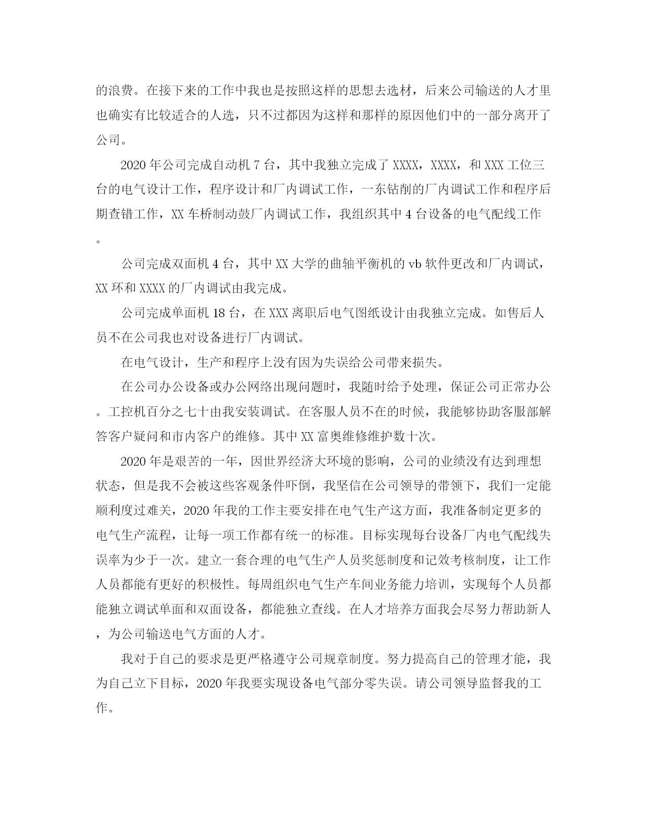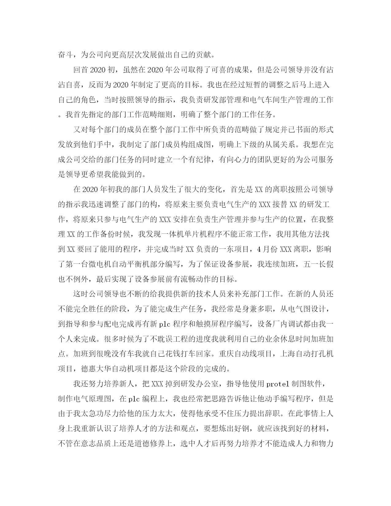 此资料由网络收集而来,如有侵权请告知上传者立即删除。资料共分享,我们负责传递知识。工程技术人员工作总结模板工程技术人员工作总结模板(一)转眼间,我进××公司近一年了,在这期间,我由一个对社会一无所知的学生变成一个合格的员工。当初进入公司,我什么都不懂,对岗位、操作的概念理解只限于书面,没有实事求是、追根问题的精神,在操作上也没有做安全确认,这导致我进入公司不久后造成跑料事件,给公司造成很大的经济损失,同时也给领导、同事带来很大麻烦。领导及时对我说服教育,让我明白并养成了安全操作的意识和习惯。从那以后,我认真吸取跑料事件的经验教训,坚持不断地学习理论知识、总结工作经验,培养自身思想修养,努力提高综合素质,严格遵守厂部各项,完成了自我岗位的各项职责,回顾这一年来的工作,我在车间领导、师傅及各位同事的支持与帮忙下,严格要求自我,按照公司的要求,较好地完成了自我的本职工作。透过一年来的学习与工作,工作思想、方式有了较大的改变,在那里将自我的思想、工作学习状况简要的总结如下:一、我一向在加强学习,不断提高自身素质,努力为公司、车间做出更大贡献。我们车间岗位比较多,在什么岗位我始终以饱满的热情对待自我的工作,勤勤恳恳、尽职尽责、踏踏实实的完成自我的本职工作。反应简单,操作同样需要严谨细致,这要求我要对设备及反应过程状况务必熟悉的了解与掌握,同时还应具有较强的理论知识。我想自我的工作经验一方面是自我工作的积累,更重领导和同事们信任和支持的结果!正因如此,我将更加珍视自我的岗位,以无比的热情与努力争取更大的进步!二、工作中,严以律己,宽以待人,向身边的先进学习。一年来,我在平时工作中,始终严格要求自我,遵守车间的各项,力求时刻严格要求自我,有条不紊地做好各项工作。我认真坚持厂里的制度,用心学习各种操作规程和方法,在思想觉悟和对岗位职责的认识上均得到了进一步提高。透过系列的学习与批评和自我批评活动,我的思想得到了净化,工作的职责心得到了加强。三、对安全的理解与认识更加深刻。进入公司以来,从入厂安全教育、车间、班组安全教育上,学到很多知识,真正懂得人生安全和生产安全。公司还定期以发放简报、问卷的形式,宣传安全知识,提高员工安全意识。我深深感到,要持续生产的安全稳定运行,各级领导的重视和支持是基本条件,全体职工的用心参基本保证,安全资金的大力投入是物质基础,落实各级安全职责制是根本关键。而这些,我们公司做的很好,个性每次总结安全工作和案例时,我们清醒地看到安全上存在的不足,使我们在今后的工作中逐步加以改善。四、缺点与不足我也很清楚自我还存在很多的不足与缺点,自我的总结和领导同事们的批评和指导,对我今后的提高是十分必要的,我的缺点与不足自我总结可有以下几点:1、在工作过程中,细节上方处理的不够好,不会造成影响损失,细节处理不好就是隐患,还需继续努力。2、与同事交流少,这直接影响大家经验交流和学习。回顾这一段时光的工作,我在自我的岗位上能完成各项任务,这与领导的支持和师傅、同事们的帮忙是分不开的,在此表示诚挚的谢意。我的工作存在不足,我会努力改正,不断完善自我,坚持不懈地努力工作,争取为公司发展做出自我的贡献。工程技术人员工作总结模板(二)2020年是我在公司工作的第三年,在这三年里随着公司在不断的发展和壮大我个人也从一个不知所谓的棱头青逐渐的变的成熟,从一个对平衡机毫无了解的门外汉变成一个熟悉平衡机原理熟悉公司各种产品的专业技术人员,而且在对部门的管理和与人沟通方面我也有了更深层次的认识,我深知我取得的这些进步和公司领导的培养是分不开的。没有他们不厌其烦的教导和一次次的给予机会我不会取得今天的进步,展望2020年是机遇和挑战并存的一年,我将团在公司领导核心周围,努力工作,艰苦奋斗,为公司向更高层次发展做出自己的贡献。回首2020初,虽然在2020年公司取得了可喜的成果,但是公司领导并没有沾沾自喜,反而为2020年制定了更高的目标。我也在经过短暂的调整之后马上进入自己的角色,当时按照领导的指示,我负责研发部管理和电气车间生产管理的工作。我首先指定的部门工作范畴细则,明确了整个部门的工作任务。又对每个部门的成员在整个部门工作中所负责的范畴做了规定并已书面的形式发放到他们手中,我制定了部门成员构组成图,明确上下级的从属关系。我想在完成公司交给的部门任务的同时建立一个有纪律,有向心力的团队更好的为公司服务是领导更希望我能做到的。在2020年初我的部门人员发生了很大的变化,首先是XX的离职按照公司领导的指示我迅速调整了部门的构,将原来主要负责电气生产的XXX接替XX的研发工作,将原来只参与电气生产的XXX安排在负责生产管理并参与生产的位置,在我整理XX的工作备份时候,我发现一体机单片机程序不能正常工作,我用其他方法找