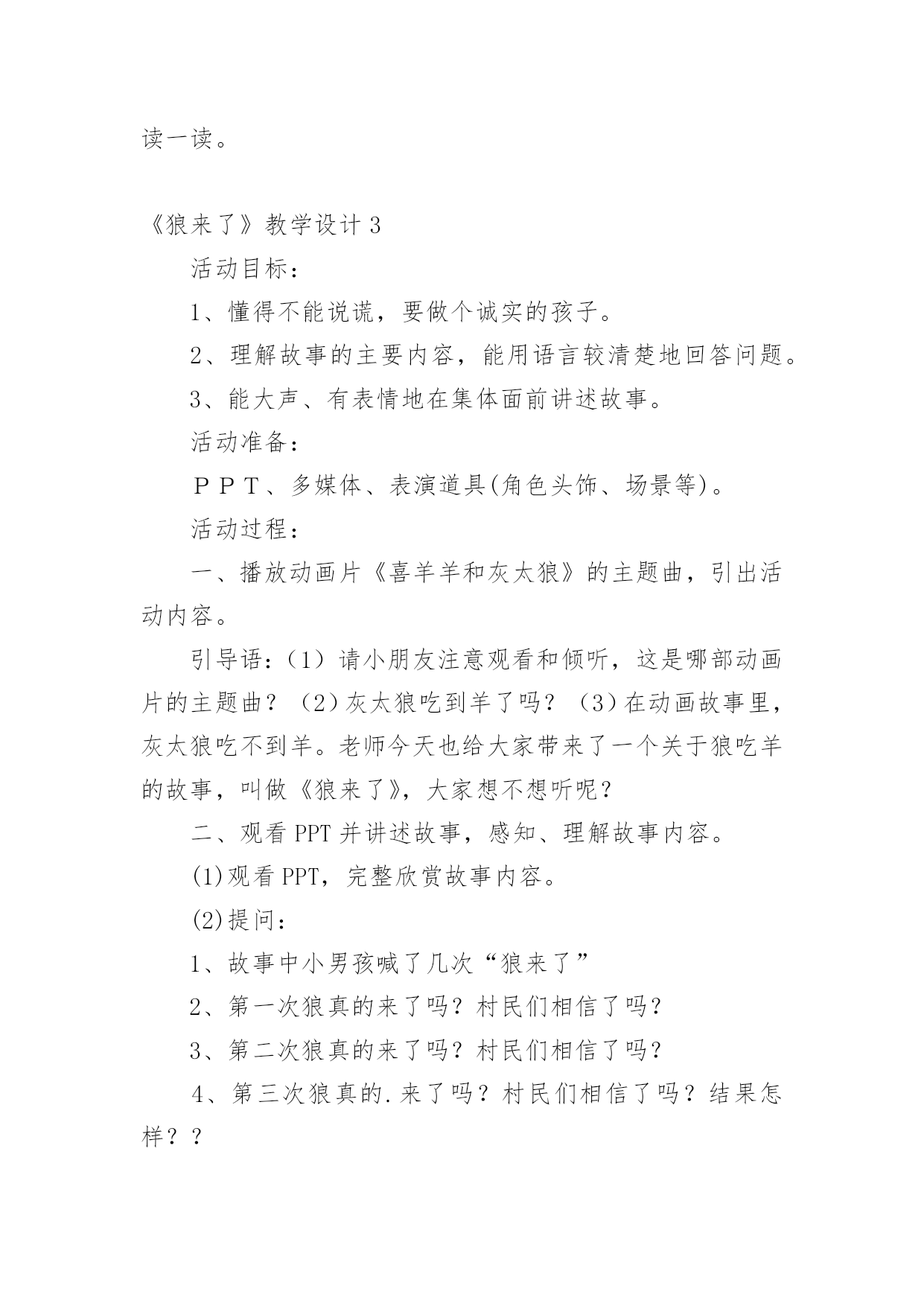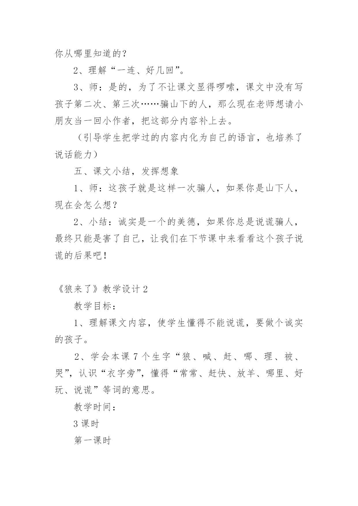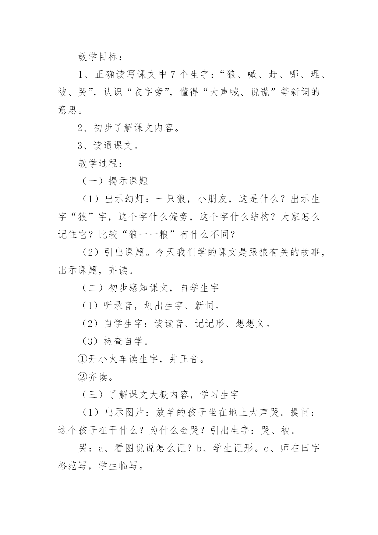 《狼来了》教学设计作为一名老师,通常需要用到教学设计来辅助教学,借助教学设计可以提高教学质量,收到预期的教学效果。如何把教学设计做到重点突出呢?下面是小编为大家整理的《狼来了》教学设计,供大家参考借鉴,希望可以帮助到有需要的朋友。《狼来了》教学设计1教学目标:1、理解课文内容,使学生懂得不能说谎,要做个诚实的孩子。2、学会本课7个生字;理解“赶快、说谎、一连、常常”等词的意思;认识衣字旁。3、会用“赶快”说一句话。4、会正确有感情地朗读课文,并能学着讲这个故事。教学重难点:通过看图,有感情地朗读,会讲故事,并懂得要做一个诚实的孩子。课时安排:2课时教学准备:(1)孩子两次喊“狼来了”时的图片:狼的图片。(2)有关练习题的投影片。教学要点:1、初读课文,了解课文大意。2、学会“狼、喊、赶、哪”4个生字;理解“赶快、一连”等词意思。3、学习1-3自然段。教学过程:一、看图导入,谈话揭题1、看图,这是什么动物?(狼)你觉得它给你什么感觉?教学“狼”。2、师:是啊,狼很凶,专吃兔子,小羊等小动物,有时还会伤人,真可怕呀!今天我们要学的新课文,题目就是《狼来了》(板书课题)这是一个有趣的故事,它还会告诉我们一个道理。二、初读课文,自学生字词1、轻声读课文,划出带生字的词,并认真读一读。2、检查自学效果。(1)出示生字卡片,开小火车轮读。(2)提一些不懂的问题。3、同桌对读,读通课文师:把课文读好,这才是真本领呢!(1)同桌对读,读错了,纠正。(2)故事发生在什么时候?(从前)指导学生结合插图理解词意。三、再读课文,边读边思1、“狼来了”是谁说的?放羊的孩子说了几次?快速朗读课文,把它划下来,再读一读。2、学生交流学习情况。(投影显示)图片出示,孩子两次喊“狼来了”时的图片,请学生找一找哪一幅是第一次喊时的情景;哪一幅是第二次喊时的情景,并同桌讨论说说原因。(引导学生从整体感知课文内容)四、深入学习课文(一)教学第二自然段1、指名朗读第二自然段。2、放羊的孩子第一次是怎么喊的?谁来表演一下?3、评议、引导学生从表情、动作、语气方面考虑。4、山下的人听见了,心里可着急了!谁能看图来说一说?5、书上又是怎么写的呢?师读,故意把“赶快”“忙”漏下不读。6、学生纠正师错处,随机理解“赶快”,认能找个近义词?(马上,连忙等)7、指导朗读,体会加上“赶快、忙”使句子语气更强烈,更显山下人着急。8、(自由读——指名——评议——指名朗读)9、放羊的孩子呢?为什么“笑”?指导朗读。10、分角色表演放羊的'孩子骗山下的人的事。(二)教学第三自然段1、师:放羊的孩子是不是就这样骗了一次?(不是)你从哪里知道的?2、理解“一连、好几回”。3、师:是的,为了不让课文显得啰嗦,课文中没有写孩子第二次、第三次……骗山下的人,那么现在老师想请小朋友当一回小作者,把这部分内容补上去。(引导学生把学过的内容内化为自己的语言,也培养了说话能力)五、课文小结,发挥想象1、师:这孩子就是这样一次骗人,如果你是山下人,现在会怎么想?2、小结:诚实是一个的美德,如果你总是说谎骗人,最终只能是害了自己,让我们在下节课中来看看这个孩子说谎的后果吧!《狼来了》教学设计2教学目标:1、理解课文内容,使学生懂得不能说谎,要做个诚实的孩子。2、学会本课7个生字“狼、喊、赶、哪、理、被、哭”,认识“衣字旁”,懂得“常常、赶快、放羊、哪里、好玩、说谎”等词的意思。教学时间:3课时第一课时教学目标:1、正确读写课文中7个生字:“狼、喊、赶、哪、理、被、哭”,认识“衣字旁”,懂得“大声喊、说谎”等新词的意思。2、初步了解课文内容。3、读通课文。教学过程:(一)揭示课题(1)出示幻灯:一只狼,小朋友,这是什么?出示生字“狼”字,这个字什么偏旁,这个字什么结构?大家怎么记住它?比较“狼一一粮”有什么不同?(2)引出课题。今天我们学的课文是跟狼有关的故事,出示课题,齐读。(二)初步感知课文,自学生字(1)听录音,划出生字、新词。(2)自学生字:读读音、记记形、想想义。(3)检查自学。①开小火车读生字,井正音。②齐读。(三)了解课文大概内容,学习生字(1)出示图片:放羊的孩子坐在地上大声哭。提问:这个孩子在干什么?为什么会哭?引出生字:哭、被。哭:a、看图说说怎么记?b、学生记形。c、师在田字格范写,学生临写。被:什么偏旁?什么结构?比较“衣字旁”和“示字旁”有什么不同,说说怎么记?(2)放羊的孩子看见狼要吃羊时,向山下的人求救了吗?山下的.人是怎么做的?引出生字“理”,说说你用什么好办法来记?(3)为什么山下的人不去救呢?因为小孩经常要说谎骗人,他们以为那孩子又在骗人了。)小孩子是怎么骗人的?大人上当了吗?从哪里看出来?引出生字:喊、赶、哪。说说用什么办法记?“喊”字中有两个口,可见“喊”时嘴巴要张得大,