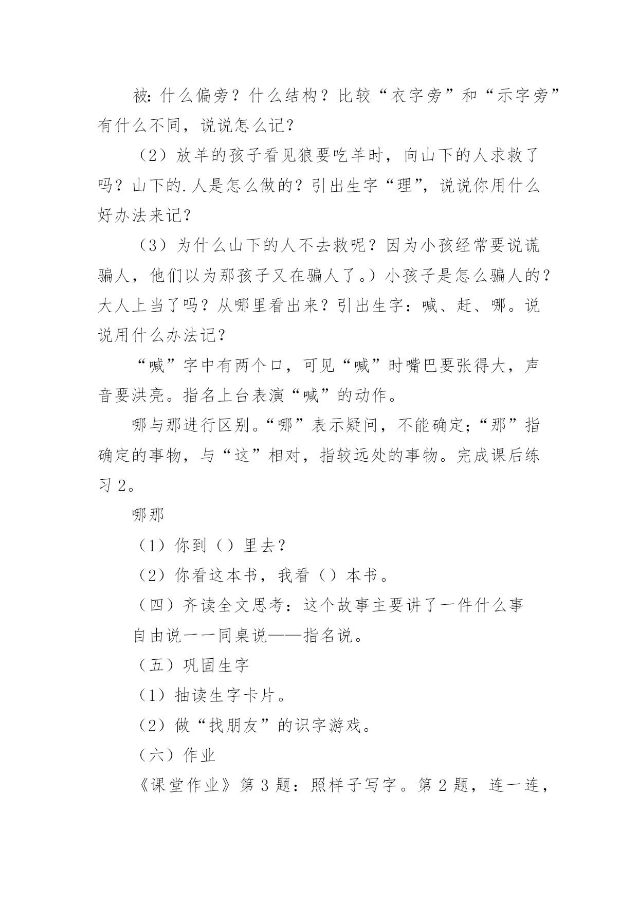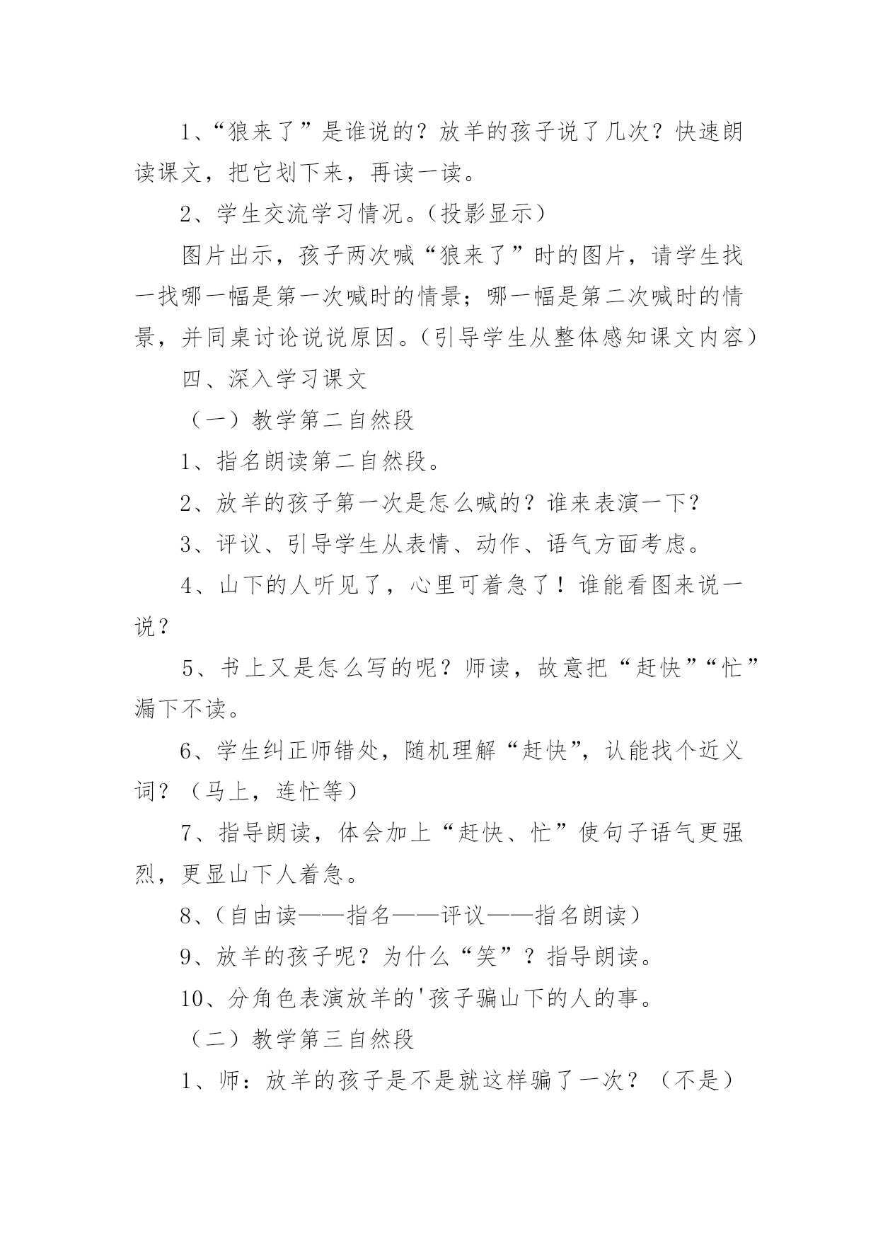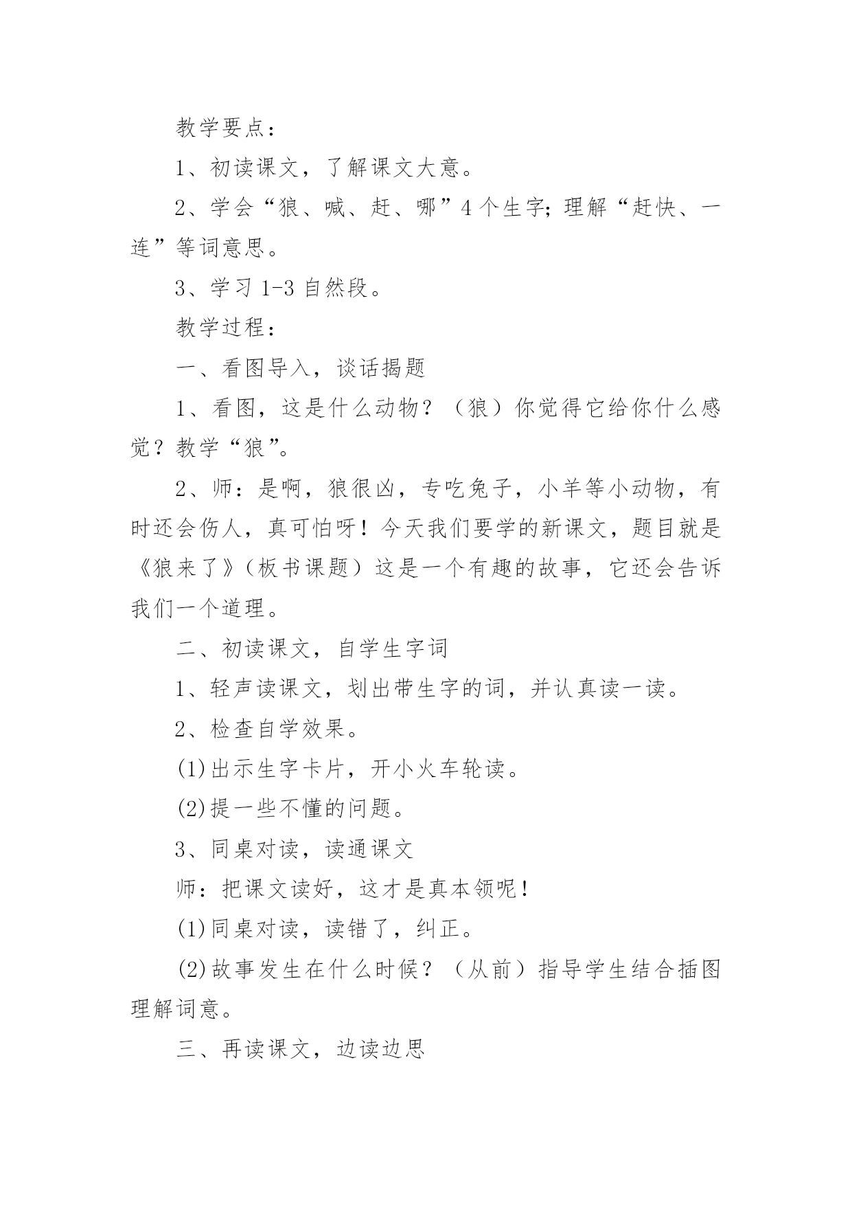 《狼来了》教学设计作为一名老师,通常需要用到教学设计来辅助教学,借助教学设计可以提高教学质量,收到预期的教学效果。如何把教学设计做到重点突出呢?下面是小编为大家整理的《狼来了》教学设计,供大家参考借鉴,希望可以帮助到有需要的朋友。《狼来了》教学设计1教学目标:1、理解课文内容,使学生懂得不能说谎,要做个诚实的孩子。2、学会本课7个生字;理解“赶快、说谎、一连、常常”等词的意思;认识衣字旁。3、会用“赶快”说一句话。4、会正确有感情地朗读课文,并能学着讲这个故事。教学重难点:通过看图,有感情地朗读,会讲故事,并懂得要做一个诚实的孩子。课时安排:2课时教学准备:(1)孩子两次喊“狼来了”时的图片:狼的图片。(2)有关练习题的投影片。教学要点:1、初读课文,了解课文大意。2、学会“狼、喊、赶、哪”4个生字;理解“赶快、一连”等词意思。3、学习1-3自然段。教学过程:一、看图导入,谈话揭题1、看图,这是什么动物?(狼)你觉得它给你什么感觉?教学“狼”。2、师:是啊,狼很凶,专吃兔子,小羊等小动物,有时还会伤人,真可怕呀!今天我们要学的新课文,题目就是《狼来了》(板书课题)这是一个有趣的故事,它还会告诉我们一个道理。二、初读课文,自学生字词1、轻声读课文,划出带生字的词,并认真读一读。2、检查自学效果。(1)出示生字卡片,开小火车轮读。(2)提一些不懂的问题。3、同桌对读,读通课文师:把课文读好,这才是真本领呢!(1)同桌对读,读错了,纠正。(2)故事发生在什么时候?(从前)指导学生结合插图理解词意。三、再读课文,边读边思1、“狼来了”是谁说的?放羊的孩子说了几次?快速朗读课文,把它划下来,再读一读。2、学生交流学习情况。(投影显示)图片出示,孩子两次喊“狼来了”时的图片,请学生找一找哪一幅是第一次喊时的情景;哪一幅是第二次喊时的情景,并同桌讨论说说原因。(引导学生从整体感知课文内容)四、深入学习课文(一)教学第二自然段1、指名朗读第二自然段。2、放羊的孩子第一次是怎么喊的?谁来表演一下?3、评议、引导学生从表情、动作、语气方面考虑。4、山下的人听见了,心里可着急了!谁能看图来说一说?5、书上又是怎么写的呢?师读,故意把“赶快”“忙”漏下不读。6、学生纠正师错处,随机理解“赶快”,认能找个近义词?(马上,连忙等)7、指导朗读,体会加上“赶快、忙”使句子语气更强烈,更显山下人着急。8、(自由读——指名——评议——指名朗读)9、放羊的孩子呢?为什么“笑”?指导朗读。10、分角色表演放羊的'孩子骗山下的人的事。(二)教学第三自然段1、师:放羊的孩子是不是就这样骗了一次?(不是)你从哪里知道的?2、理解“一连、好几回”。3、师:是的,为了不让课文显得啰嗦,课文中没有写孩子第二次、第三次……骗山下的人,那么现在老师想请小朋友当一回小作者,把这部分内容补上去。(引导学生把学过的内容内化为自己的语言,也培养了说话能力)五、课文小结,发挥想象1、师:这孩子就是这样一次骗人,如果你是山下人,现在会怎么想?2、小结:诚实是一个的美德,如果你总是说谎骗人,最终只能是害了自己,让我们在下节课中来看看这个孩子说谎的后果吧!《狼来了》教学设计2教学目标:1、理解课文内容,使学生懂得不能说谎,要做个诚实的孩子。2、学会本课7个生字“狼、喊、赶、哪、理、被、哭”,认识“衣字旁”,懂得“常常、赶快、放羊、哪里、好玩、说谎”等词的意思。教学时间:3课时第一课时教学目标:1、正确读写课文中7个生字:“狼、喊、赶、哪、理、被、哭”,认识“衣字旁”,懂得“大声喊、说谎”等新词的意思。2、初步了解课文内容。3、读通课文。教学过程:(一)揭示课题(1)出示幻灯:一只狼,小朋友,这是什么?出示生字“狼”字,这个字什么偏旁,这个字什么结构?大家怎么记住它?比较“狼一一粮”有什么不同?(2)引出课题。今天我们学的课文是跟狼有关的故事,出示课题,齐读。(二)初步感知课文,自学生字(1)听录音,划出生字、新词。(2)自学生字:读读音、记记形、想想义。(3)检查自学。①开小火车读生字,井正音。②齐读。(三)了解课文大概内容,学习生字(1)出示图片:放羊的孩子坐在地上大声哭。提问:这个孩子在干什么?为什么会哭?引出生字:哭、被。哭:a、看图说说怎么记?b、学生记形。c、师在田字格范写,学生临写。被:什么偏旁?什么结构?比较“衣字旁”和“示字旁”有什么不同,说说怎么记?(2)放羊的孩子看见狼要吃羊时,向山下的人求救了吗?山下的.人是怎么做的?引出生字“理”,说说你用什么好办法来记?(3)为什么山下的人不去救呢?因为小孩经常要说谎骗人,他们以为那孩子又在骗人了。)小孩子是怎么骗人的?大人上当了吗?从哪里看出来?引出生字:喊、赶、哪。说说用什么办法记?“喊”字中有两个口,可见“喊”时嘴巴要张得大,