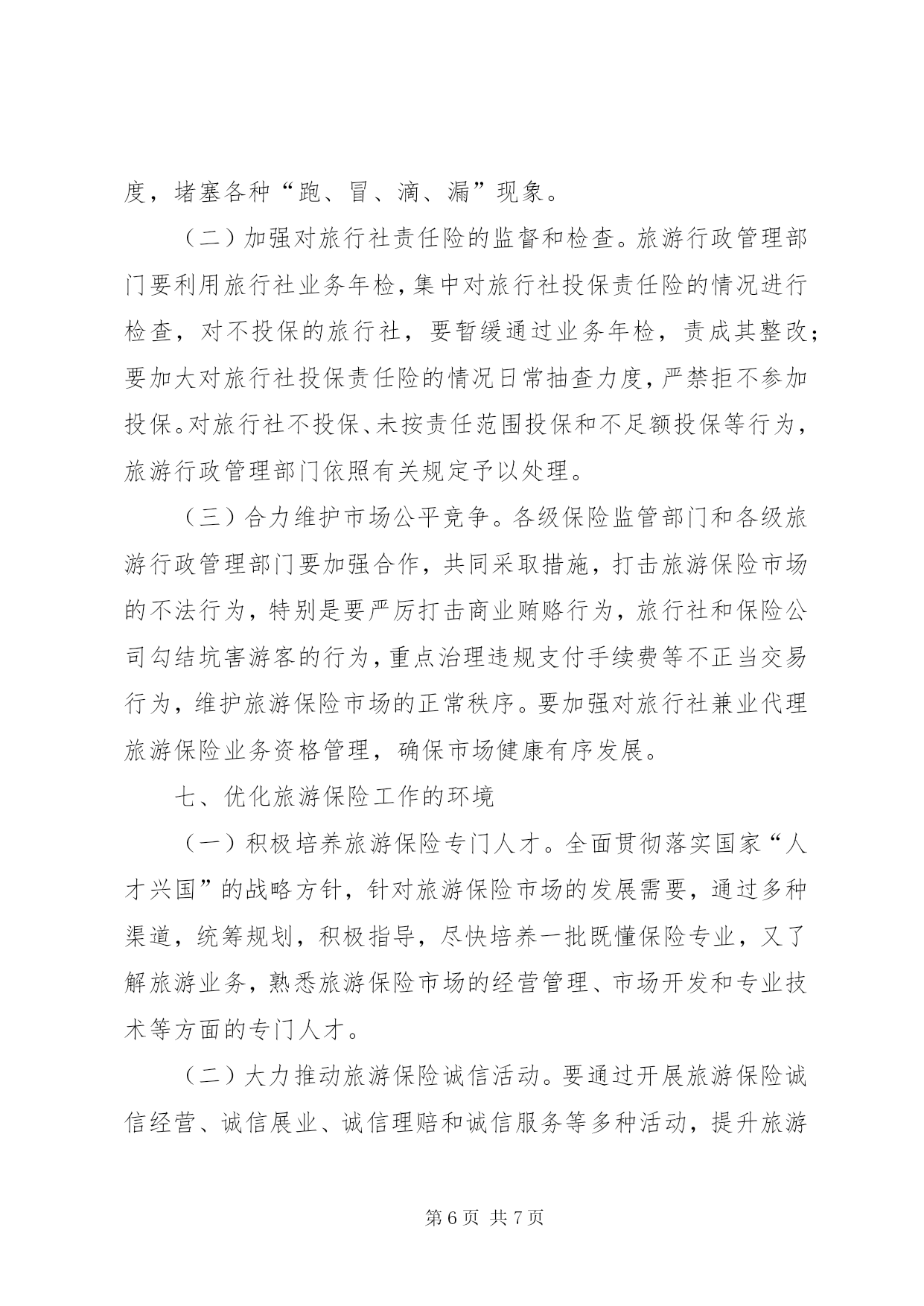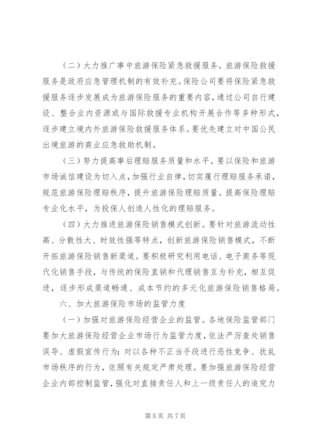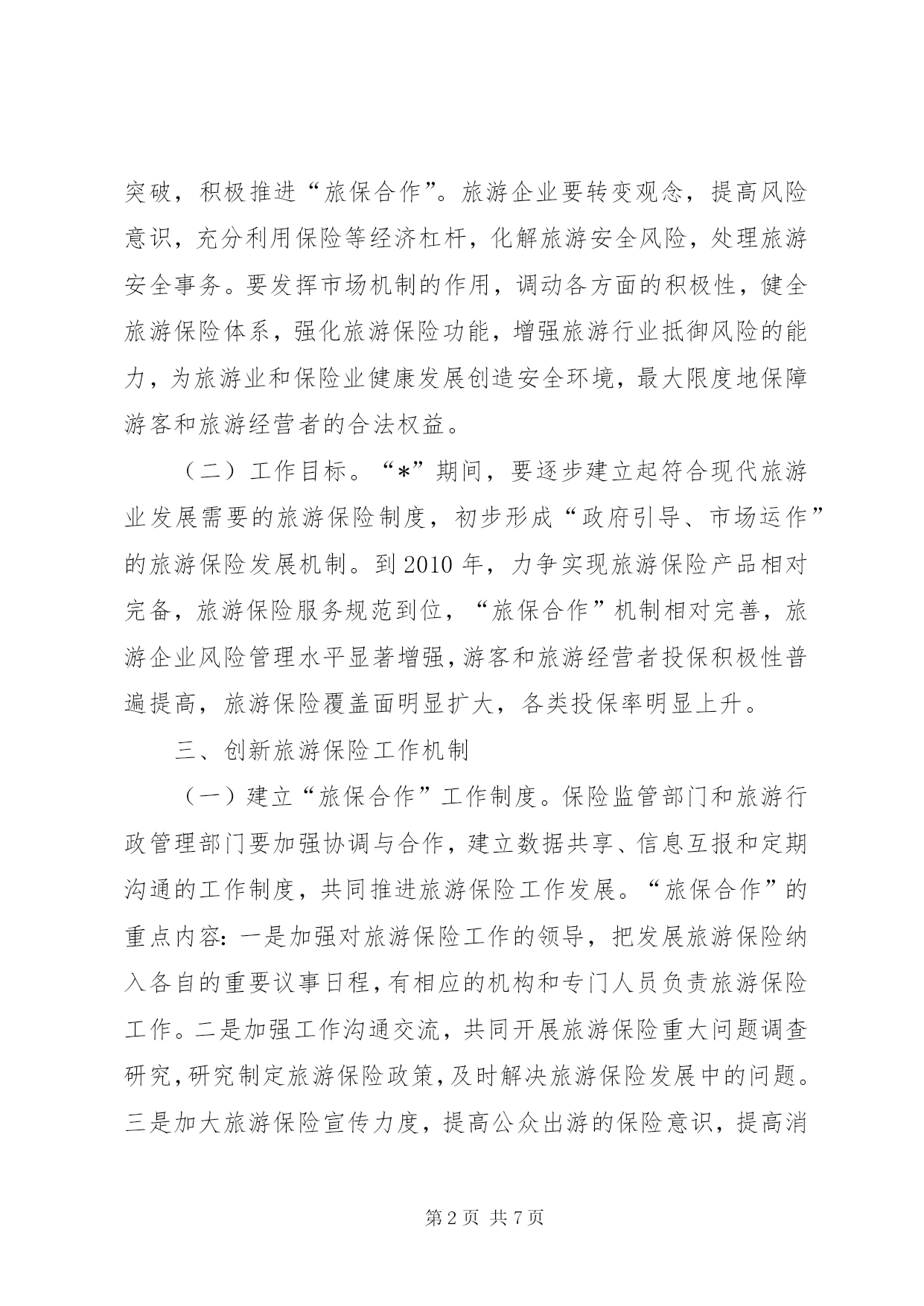 第PAGE\*Arabic\*MERGEFORMAT7页共NUMPAGES\*MERGEFORMAT7页旅游保险工作意见党的*届五中全会把安全发展重要理念纳入我国社会主义现代化建设的总体战略之中,这是树立和落实科学发展观,构建社会主义和谐社会的根本要求。旅游保险是实现旅游安全发展的重要保障,也是保险业发展的重要领域。现就进一步做好旅游保险工作提出如下意见。一、进一步做好旅游保险工作的必要性近年来,我国旅游业快速发展,旅游人数规模巨大,旅游各环节中的自然灾害、意外事故、法律风险和违约责任等风险日益突出。各级旅游行政管理部门和旅游经营单位为消除安全隐患,做了大量卓有成效的工作;保险业充分发挥经济补偿和辅助管理职能,努力保障广大游客及旅游经营者的合法权益,总体上保证了旅游业安全有序发展。但与旅游业需要相比,旅游保险的发展还存在一些问题,主要表现在:游客和旅游经营者的风险意识普遍不足,旅游保险投保率不高;旅游保险机制不健全,市场竞争不规范;旅游产品不丰富,服务水平有待提高。因此,深入做好旅游保险工作,是保险监管部门和旅游行政管理部门一项紧迫而艰巨的任务。二、旅游保险工作的指导原则和工作目标(一)指导原则。以邓小平理论和“三个代表”重要思想为指导,树立和落实科学发展观,坚持以人为本、改革创新、重点突破,积极推进“旅保合作”。旅游企业要转变观念,提高风险意识,充分利用保险等经济杠杆,化解旅游安全风险,处理旅游安全事务。要发挥市场机制的作用,调动各方面的积极性,健全旅游保险体系,强化旅游保险功能,增强旅游行业抵御风险的能力,为旅游业和保险业健康发展创造安全环境,最大限度地保障游客和旅游经营者的合法权益。(二)工作目标。“*”期间,要逐步建立起符合现代旅游业发展需要的旅游保险制度,初步形成“政府引导、市场运作”的旅游保险发展机制。到2010年,力争实现旅游保险产品相对完备,旅游保险服务规范到位,“旅保合作”机制相对完善,旅游企业风险管理水平显著增强,游客和旅游经营者投保积极性普遍提高,旅游保险覆盖面明显扩大,各类投保率明显上升。三、创新旅游保险工作机制(一)建立“旅保合作”工作制度。保险监管部门和旅游行政管理部门要加强协调与合作,建立数据共享、信息互报和定期沟通的工作制度,共同推进旅游保险工作发展。“旅保合作”的重点内容:一是加强对旅游保险工作的领导,把发展旅游保险纳入各自的重要议事日程,有相应的机构和专门人员负责旅游保险工作。二是加强工作沟通交流,共同开展旅游保险重大问题调查研究,研究制定旅游保险政策,及时解决旅游保险发展中的问题。三是加大旅游保险宣传力度,提高公众出游的保险意识,提高消费者对旅游保险的认同度。(二)探索建立多元化旅游保险纠纷调解机制。探索建立由旅游、保险和法律三方专业人员组成的专业化旅游保险纠纷调节机构,逐步形成当事方协商、纠纷调解机构调解、仲裁和诉讼等不同层次的多元化旅游保险纠纷处理机制,快捷有效处理旅游保险中发生的各种纠纷。(三)鼓励投保方式的创新。针对旅行社行业特点,在旅游部门指导下,鼓励行业协会等地方组织,通过整合旅游保险资源,创新投保方式,选择信誉良好、经营规范的保险公司统一投保旅行社责任险。四、完善旅游保险产品体系(一)着力完善旅行社责任保险。要通过试点,重点研究解决旅行社责任保险在责任范围、赔偿限额、纠纷调解、救援服务、理赔程序和无过错责任等方面的实际需要,逐步建立科学合理的旅行社责任划分办法,切实增强责任险转嫁风险的能力。要努力建立与旅行社管理风险相匹配的保险费率体系,促进旅行社提高风险管理水平,有效化解旅行社经营风险。(二)改进旅游意外伤害保险。要针对游客的实际需求,改进旅游意外保险产品,提高产品品质。要积极拓宽旅游意外伤害保险的销售渠道,允许和鼓励旅行社在征得游客同意的前提下,通过合法手续为游客办理人身意外伤害险。(三)大力发展新兴旅游保险和特种旅游保险。及时跟踪旅游市场发展的新动向,对自驾车、自由行、自助游等新兴旅游业态,要在其开发推广过程中,加强旅游与保险的合作,提前做好新兴旅游市场的风险管控工作。要深入研究老年旅游、滑雪、探险、漂流等特种旅游类型的风险特点,积极开发相关的特种保险产品,为旅游业提供全面的风险保障。(四)积极推进旅游各环节保险。要依托各级政府和各行业主管部门,督促宾馆、餐馆、景点、车船、索道和游乐场所等旅游经营主体投保相关责任险,建立系统化的旅游保险链,分担旅游各环节中的风险;保险公司要有针对性地开发系列化的责任保险产品,供各旅游经营主体选择投保;旅行社要将是否投保责任险作为采购服务项目的条件之一。五、提高旅游保险服务质量和水平(一)切实加强事前风险管控。保险行业要积极为旅游企业、广大游客提供保险风险管理和咨询服务工作;要跟踪旅游市场发展的新动向做好市场的风