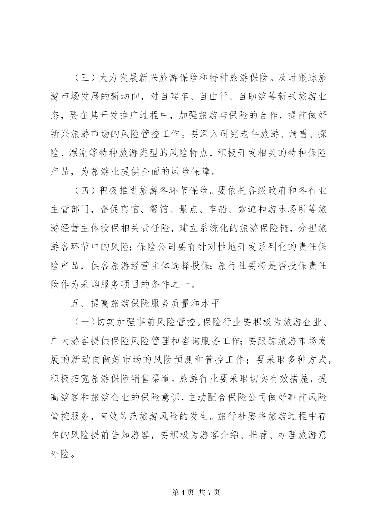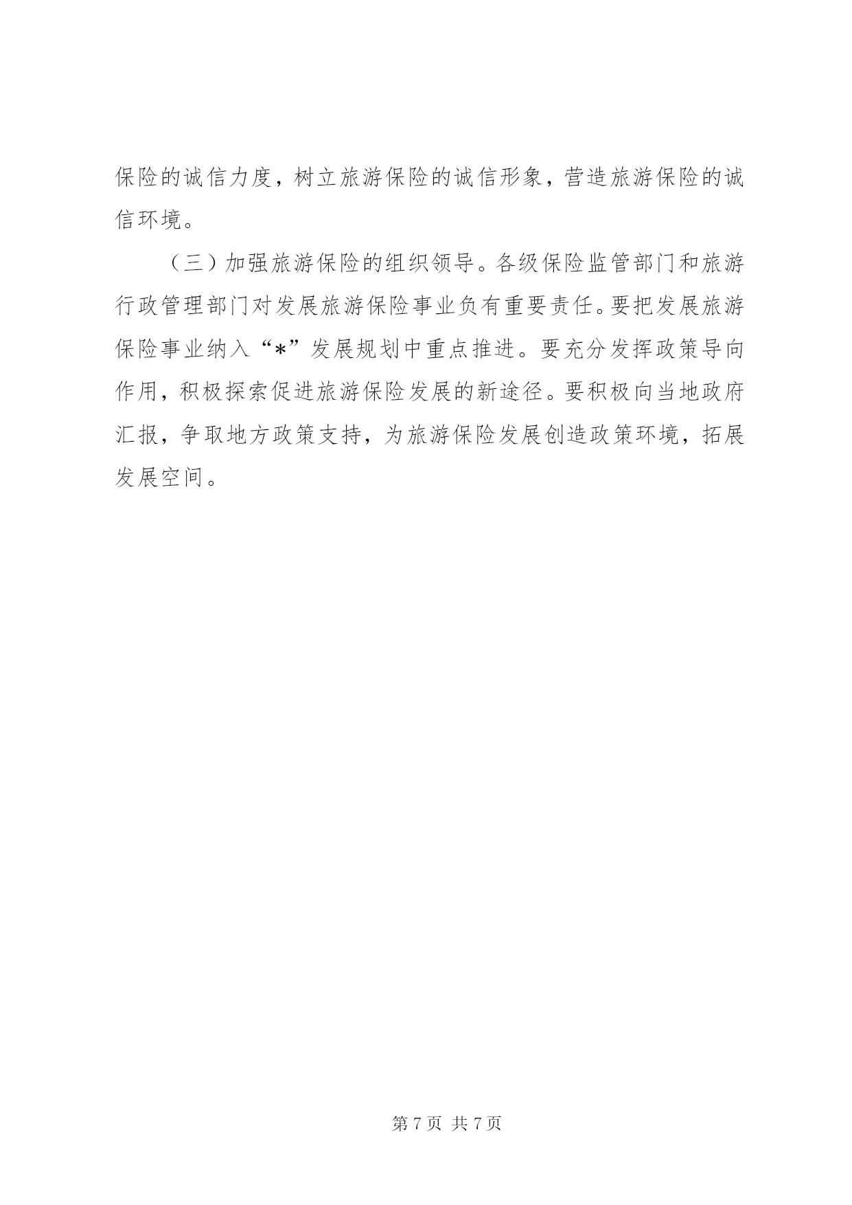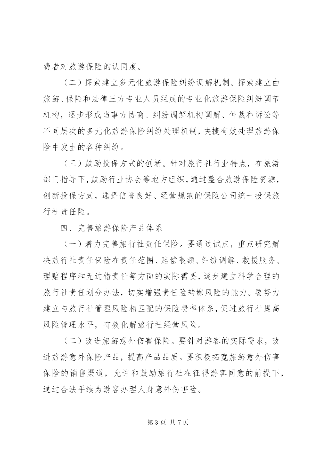 第PAGE\*Arabic\*MERGEFORMAT7页共NUMPAGES\*MERGEFORMAT7页旅游保险工作意见党的*届五中全会把安全发展重要理念纳入我国社会主义现代化建设的总体战略之中,这是树立和落实科学发展观,构建社会主义和谐社会的根本要求。旅游保险是实现旅游安全发展的重要保障,也是保险业发展的重要领域。现就进一步做好旅游保险工作提出如下意见。一、进一步做好旅游保险工作的必要性近年来,我国旅游业快速发展,旅游人数规模巨大,旅游各环节中的自然灾害、意外事故、法律风险和违约责任等风险日益突出。各级旅游行政管理部门和旅游经营单位为消除安全隐患,做了大量卓有成效的工作;保险业充分发挥经济补偿和辅助管理职能,努力保障广大游客及旅游经营者的合法权益,总体上保证了旅游业安全有序发展。但与旅游业需要相比,旅游保险的发展还存在一些问题,主要表现在:游客和旅游经营者的风险意识普遍不足,旅游保险投保率不高;旅游保险机制不健全,市场竞争不规范;旅游产品不丰富,服务水平有待提高。因此,深入做好旅游保险工作,是保险监管部门和旅游行政管理部门一项紧迫而艰巨的任务。二、旅游保险工作的指导原则和工作目标(一)指导原则。以邓小平理论和“三个代表”重要思想为指导,树立和落实科学发展观,坚持以人为本、改革创新、重点突破,积极推进“旅保合作”。旅游企业要转变观念,提高风险意识,充分利用保险等经济杠杆,化解旅游安全风险,处理旅游安全事务。要发挥市场机制的作用,调动各方面的积极性,健全旅游保险体系,强化旅游保险功能,增强旅游行业抵御风险的能力,为旅游业和保险业健康发展创造安全环境,最大限度地保障游客和旅游经营者的合法权益。(二)工作目标。“*”期间,要逐步建立起符合现代旅游业发展需要的旅游保险制度,初步形成“政府引导、市场运作”的旅游保险发展机制。到2010年,力争实现旅游保险产品相对完备,旅游保险服务规范到位,“旅保合作”机制相对完善,旅游企业风险管理水平显著增强,游客和旅游经营者投保积极性普遍提高,旅游保险覆盖面明显扩大,各类投保率明显上升。三、创新旅游保险工作机制(一)建立“旅保合作”工作制度。保险监管部门和旅游行政管理部门要加强协调与合作,建立数据共享、信息互报和定期沟通的工作制度,共同推进旅游保险工作发展。“旅保合作”的重点内容:一是加强对旅游保险工作的领导,把发展旅游保险纳入各自的重要议事日程,有相应的机构和专门人员负责旅游保险工作。二是加强工作沟通交流,共同开展旅游保险重大问题调查研究,研究制定旅游保险政策,及时解决旅游保险发展中的问题。三是加大旅游保险宣传力度,提高公众出游的保险意识,提高消费者对旅游保险的认同度。(二)探索建立多元化旅游保险纠纷调解机制。探索建立由旅游、保险和法律三方专业人员组成的专业化旅游保险纠纷调节机构,逐步形成当事方协商、纠纷调解机构调解、仲裁和诉讼等不同层次的多元化旅游保险纠纷处理机制,快捷有效处理旅游保险中发生的各种纠纷。(三)鼓励投保方式的创新。针对旅行社行业特点,在旅游部门指导下,鼓励行业协会等地方组织,通过整合旅游保险资源,创新投保方式,选择信誉良好、经营规范的保险公司统一投保旅行社责任险。四、完善旅游保险产品体系(一)着力完善旅行社责任保险。要通过试点,重点研究解决旅行社责任保险在责任范围、赔偿限额、纠纷调解、救援服务、理赔程序和无过错责任等方面的实际需要,逐步建立科学合理的旅行社责任划分办法,切实增强责任险转嫁风险的能力。要努力建立与旅行社管理风险相匹配的保险费率体系,促进旅行社提高风险管理水平,有效化解旅行社经营风险。(二)改进旅游意外伤害保险。要针对游客的实际需求,改进旅游意外保险产品,提高产品品质。要积极拓宽旅游意外伤害保险的销售渠道,允许和鼓励旅行社在征得游客同意的前提下,通过合法手续为游客办理人身意外伤害险。(三)大力发展新兴旅游保险和特种旅游保险。及时跟踪旅游市场发展的新动向,对自驾车、自由行、自助游等新兴旅游业态,要在其开发推广过程中,加强旅游与保险的合作,提前做好新兴旅游市场的风险管控工作。要深入研究老年旅游、滑雪、探险、漂流等特种旅游类型的风险特点,积极开发相关的特种保险产品,为旅游业提供全面的风险保障。(四)积极推进旅游各环节保险。要依托各级政府和各行业主管部门,督促宾馆、餐馆、景点、车船、索道和游乐场所等旅游经营主体投保相关责任险,建立系统化的旅游保险链,分担旅游各环节中的风险;保险公司要有针对性地开发系列化的责任保险产品,供各旅游经营主体选择投保;旅行社要将是否投保责任险作为采购服务项目的条件之一。五、提高旅游保险服务质量和水平(一)切实加强事前风险管控。保险行业要积极为旅游企业、广大游客提供保险风险管理和咨询服务工作;要跟踪旅游市场发展的新动向做好市场的风