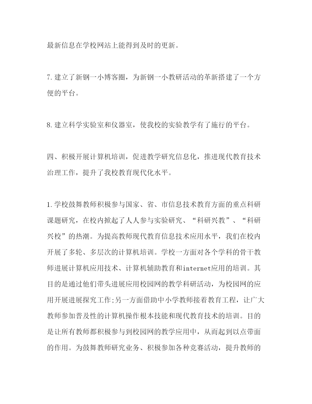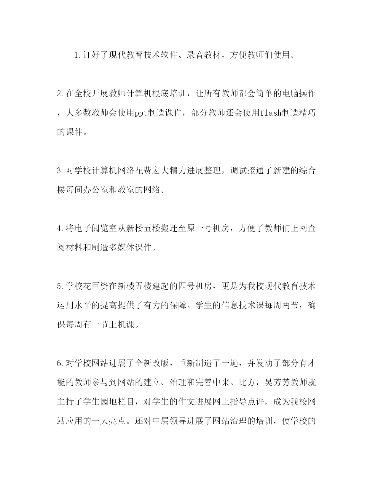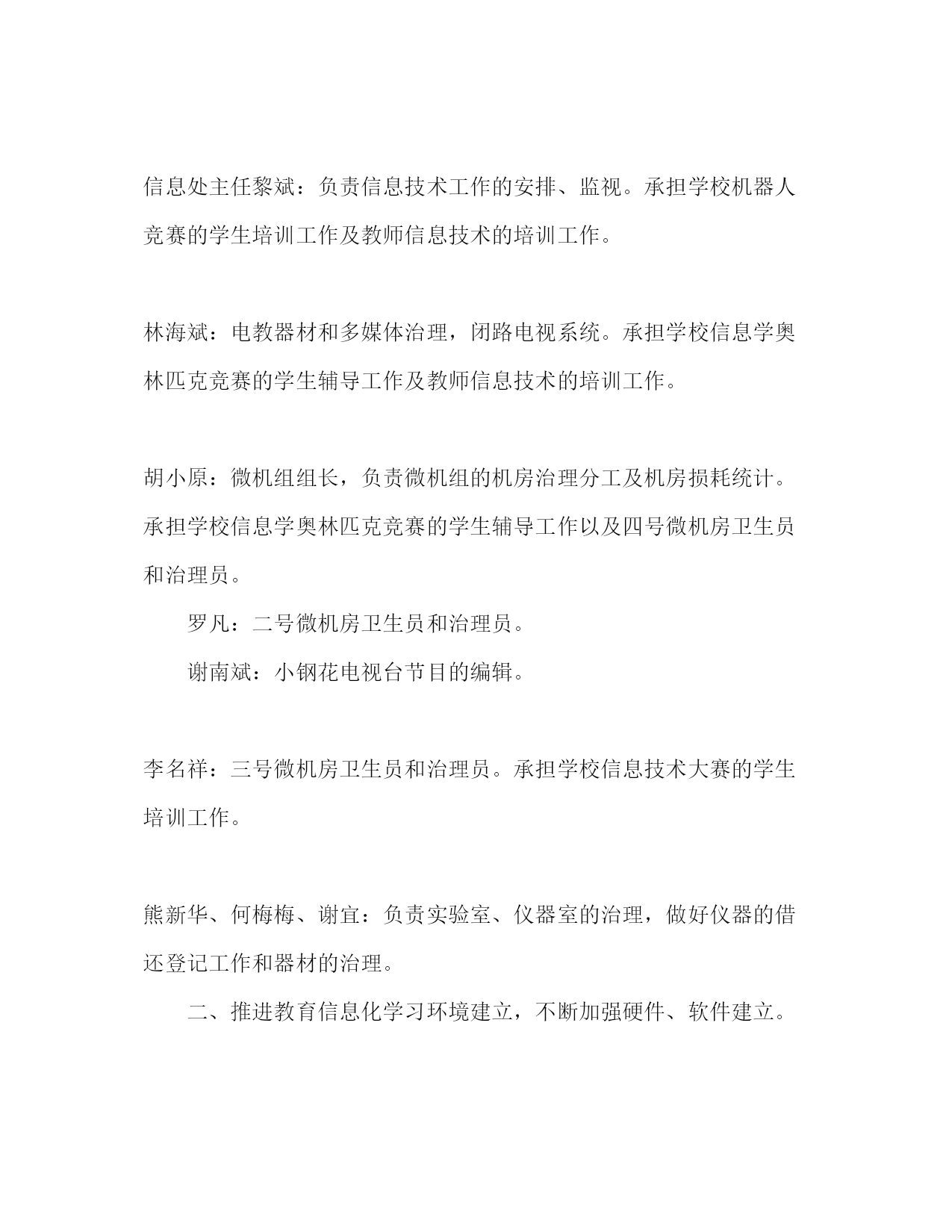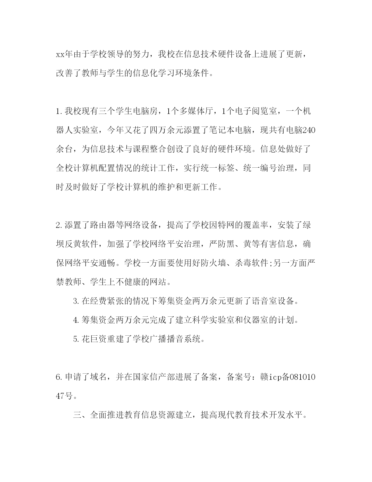 2021年信息技术教学工作参考总结(通用)本学期,我校为适应社会的飞速开展、科学技术的突飞猛进,在党的“xx大”精神和三个代表重要思想的指导下,认真进展新课程改革实验,大力推进素养教育,加强了学校的教育装备工作,充分运用学校的教学仪器和现代化的教学设备,对照现代教育技术示范学校的标准,标准学校的办学行为,端正办学思想,不断加大投入,加强硬件、软件建立,开展师资培训,积极推行运用信息技术手段,掀起信息技术普及、应用、探究、创新的高潮,使教育教学质量迈上新台阶,现将我校信息技术工作总结如下:一、加强领导,分工明确,完善了组织建立。由于近来学校的人员有所变动,现代教育技术领导小组进展适当的调整。详细分工:分管信息处副校长敖姝琴:全面负责学校信息技术工作,检查各项信息技术工作。信息处主任黎斌:负责信息技术工作的安排、监视。承担学校机器人竞赛的学生培训工作及教师信息技术的培训工作。林海斌:电教器材和多媒体治理,闭路电视系统。承担学校信息学奥林匹克竞赛的学生辅导工作及教师信息技术的培训工作。胡小原:微机组组长,负责微机组的机房治理分工及机房损耗统计。承担学校信息学奥林匹克竞赛的学生辅导工作以及四号微机房卫生员和治理员。罗凡:二号微机房卫生员和治理员。谢南斌:小钢花电视台节目的编辑。李名祥:三号微机房卫生员和治理员。承担学校信息技术大赛的学生培训工作。熊新华、何梅梅、谢宜:负责实验室、仪器室的治理,做好仪器的借还登记工作和器材的治理。二、推进教育信息化学习环境建立,不断加强硬件、软件建立。xx年由于学校领导的努力,我校在信息技术硬件设备上进展了更新,改善了教师与学生的信息化学习环境条件。1.我校现有三个学生电脑房,1个多媒体厅,1个电子阅览室,一个机器人实验室,今年又花了四万余元添置了笔记本电脑,现共有电脑240余台,为信息技术与课程整合创设了良好的硬件环境。信息处做好了全校计算机配置情况的统计工作,实行统一标签、统一编号治理,同时及时做好了学校计算机的维护和更新工作。2.添置了路由器等网络设备,提高了学校因特网的覆盖率,安装了绿坝反黄软件,加强了学校网络平安治理,严防黑、黄等有害信息,确保网络平安通畅。学校一方面要使用好防火墙、杀毒软件;另一方面严禁教师、学生上不健康的网站。3.在经费紧张的情况下筹集资金两万余元更新了语音室设备。4.筹集资金两万余元完成了建立科学实验室和仪器室的计划。5.花巨资重建了学校广播播音系统。6.申请了域名,并在国家信产部进展了备案,备案号:赣icp备08101047号。三、全面推进教育信息资源建立,提高现代教育技术开发水平。1.订好了现代教育技术软件、录音教材,方便教师们使用。2.在全校开展教师计算机根底培训,让所有教师都会简单的电脑操作,大多数教师会使用ppt制造课件,部分教师还会使用flash制造精巧的课件。3.对学校计算机网络花费宏大精力进展整理,调试接通了新建的综合楼每间办公室和教室的网络。4.将电子阅览室从新楼五楼搬迁至原一号机房,方便了教师们上网查阅材料和制造多媒体课件。5.学校花巨资在新楼五楼建起的四号机房,更是为我校现代教育技术运用水平的提高提供了有力的保障。学生的信息技术课每周两节,确保每周有一节上机课。6.对学校网站进展了全新改版,重新制造了一遍,并发动了部分有才能的教师参与到网站的建立、治理和完善中来。比方,吴芳芳教师就主持了学生园地栏目,对学生的作文进展网上指导点评,成为我校网站应用的一大亮点。还对中层领导进展了网站治理的培训,使学校的最新信息在学校网站上能得到及时的更新。7.建立了新钢一小博客圈,为新钢一小教研活动的革新搭建了一个方便的平台。8.建立科学实验室和仪器室,使我校的实验教学有了施行的平台。四、积极开展计算机培训,促进教学研究信息化,推进现代教育技术治理工作,提升了我校教育现代化水平。1.学校鼓舞教师积极参与国家、省、市信息技术教育方面的重点科研课题研究,在校内掀起了人人参与实验研究、“科研兴教”、“科研兴校”的热潮。为提高教师现代教育信息技术应用水平,我们在校内开展了多轮、多层次的计算机培训。学校一方面对各个学科的骨干教师进展计算机应用技术、计算机辅助教育和internet应用的培训。其目的是通过他们带头进展应用校园网的教学科研活动,为校园网的应用开展进展探究工作;另一方面借助中小学教师接着教育工程,让广大教师参加普及性的计算机操作根本技能和现代教育技术的培训。目的是让所有教师都积极参与到校园网的教学应用中,从而起到以点带面的作用。为鼓舞教师研究业务、积极参加各种竞赛活动,提升教师的教学业务水平和教学才能,我校制定了明确的奖励条例,但凡在市级以上的各类竞赛中获奖者,学校均将在教师的评优评先、小教高级竞聘等考评