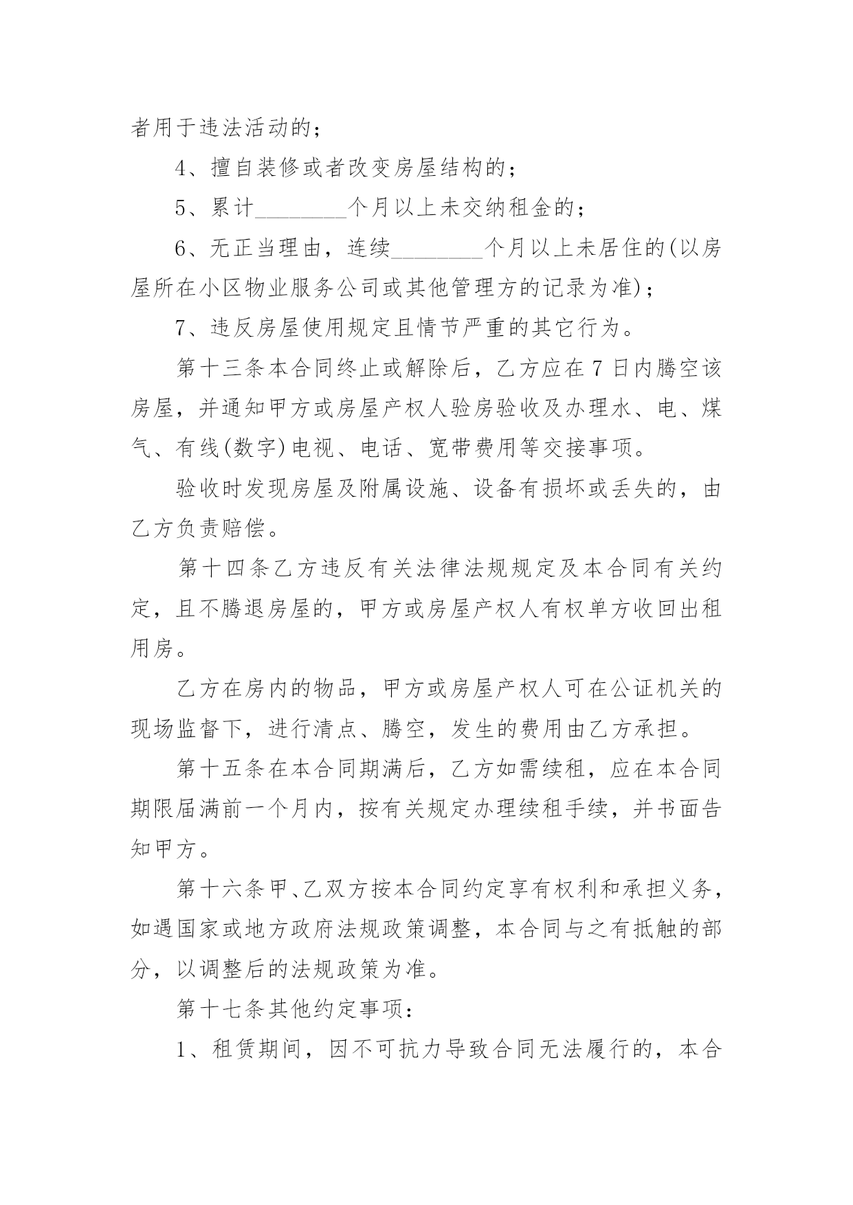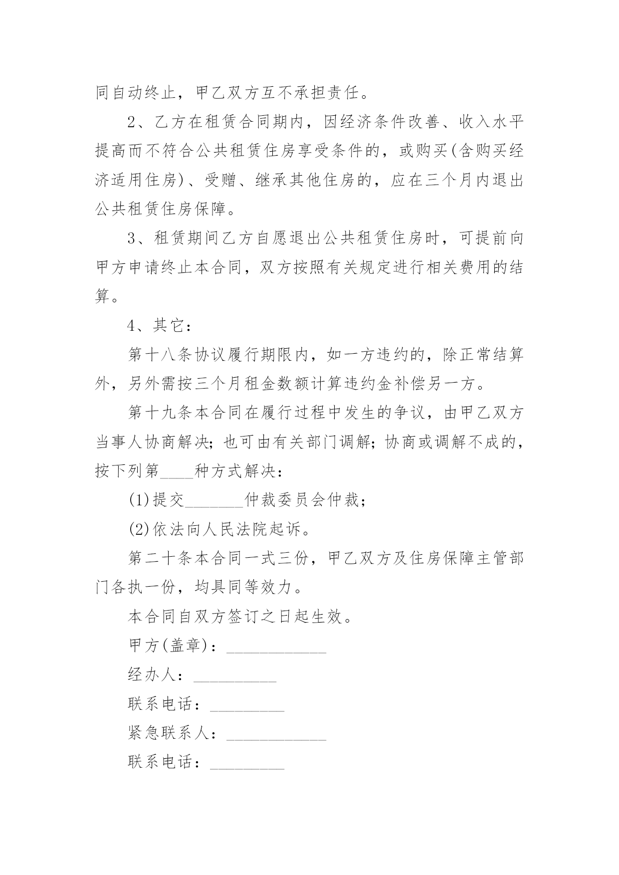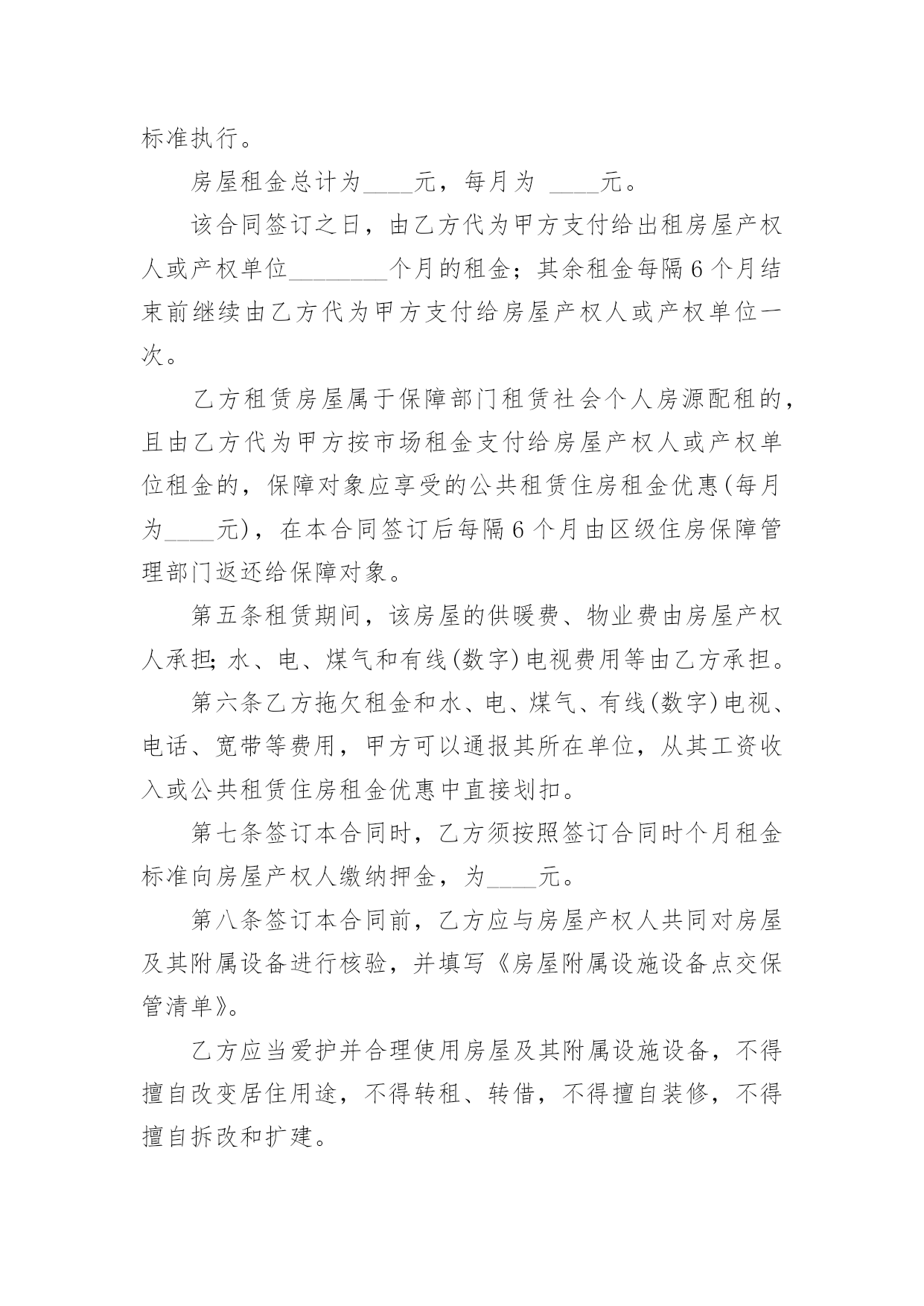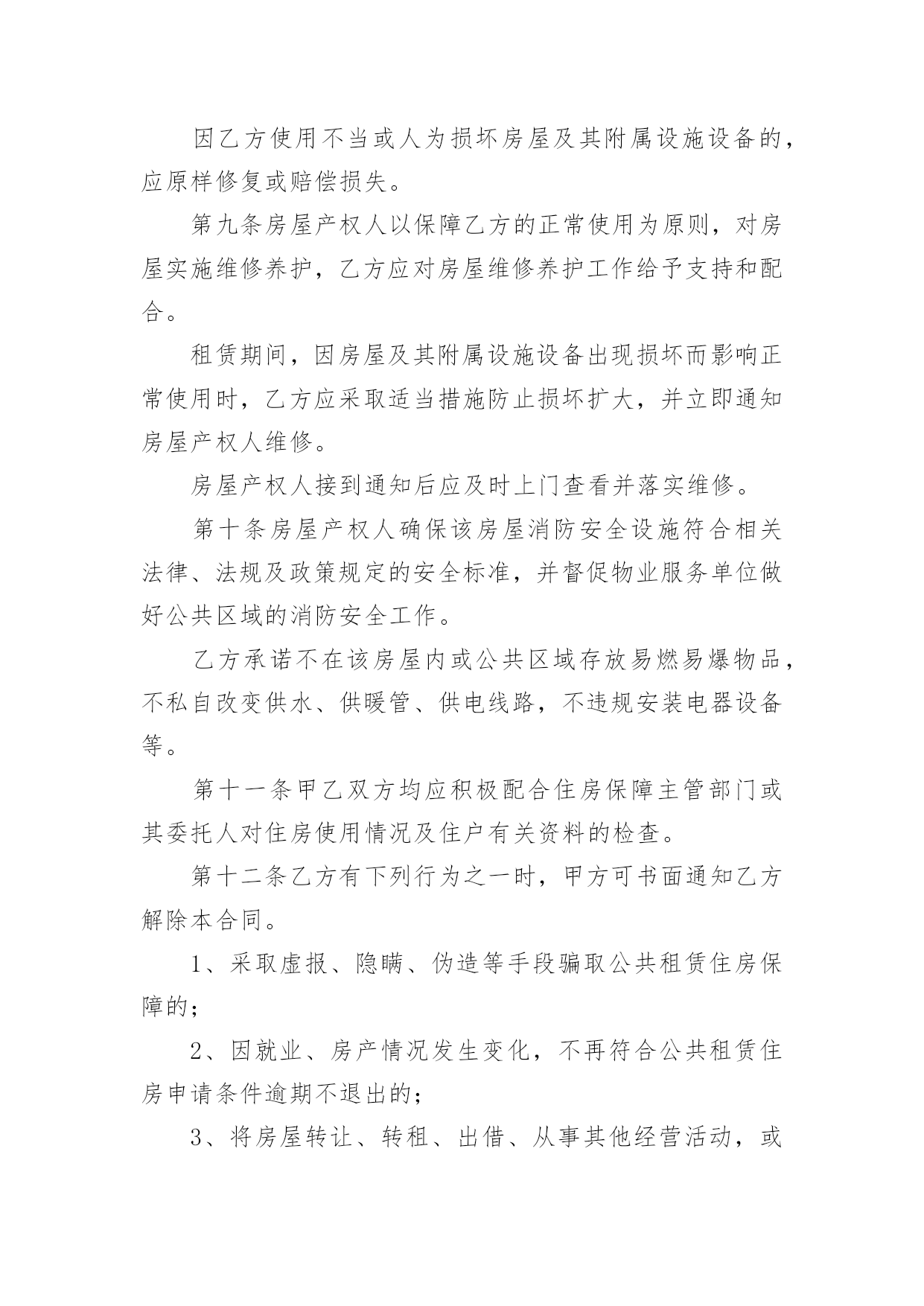 公共出租住房租赁合同在人们越来越相信法律的社会中,合同在生活中的使用越来越广泛,它可以保护民事法律关系。知道吗,写合同可是有方法的哦,下面是小编收集整理的公共出租住房租赁合同,希望对大家有所帮助。甲方(出租方):____________乙方(承租方):____________依据《中华人民共和国民法典》等有关法律法规规定,为明确公共租赁住房租赁双方的权利和义务,保护双方合法权益,经双方协商签订如下合同:第一条甲方同意将区的住房(产权人为________),作为公共租赁住房配租给乙方使用,建筑面积____平方米。第二条该房屋仅限乙方居住或与其家庭成员共同居住__,乙方无权擅自处分该房屋。第三条房屋租赁期限自市住房保障主管部门备案之日自____年____月____日起至____年____月____日止。第四条租金每6个月支付一次,乙方应于每________个月结束前向甲方交纳下________个月租金。乙方逾期交纳租金的,甲方从逾期之日起每日加收欠交租金总额________%的滞纳金。房屋租金标准为每月每平方米建筑面积____元。本合同期内如遇政府调整租金,仍按本合同约定的租金标准执行。房屋租金总计为____元,每月为____元。该合同签订之日,由乙方代为甲方支付给出租房屋产权人或产权单位________个月的租金;其余租金每隔6个月结束前继续由乙方代为甲方支付给房屋产权人或产权单位一次。乙方租赁房屋属于保障部门租赁社会个人房源配租的,且由乙方代为甲方按市场租金支付给房屋产权人或产权单位租金的,保障对象应享受的公共租赁住房租金优惠(每月为____元),在本合同签订后每隔6个月由区级住房保障管理部门返还给保障对象。第五条租赁期间,该房屋的供暖费、物业费由房屋产权人承担;水、电、煤气和有线(数字)电视费用等由乙方承担。第六条乙方拖欠租金和水、电、煤气、有线(数字)电视、电话、宽带等费用,甲方可以通报其所在单位,从其工资收入或公共租赁住房租金优惠中直接划扣。第七条签订本合同时,乙方须按照签订合同时个月租金标准向房屋产权人缴纳押金,为____元。第八条签订本合同前,乙方应与房屋产权人共同对房屋及其附属设备进行核验,并填写《房屋附属设施设备点交保管清单》。乙方应当爱护并合理使用房屋及其附属设施设备,不得擅自改变居住用途,不得转租、转借,不得擅自装修,不得擅自拆改和扩建。因乙方使用不当或人为损坏房屋及其附属设施设备的,应原样修复或赔偿损失。第九条房屋产权人以保障乙方的正常使用为原则,对房屋实施维修养护,乙方应对房屋维修养护工作给予支持和配合。租赁期间,因房屋及其附属设施设备出现损坏而影响正常使用时,乙方应采取适当措施防止损坏扩大,并立即通知房屋产权人维修。房屋产权人接到通知后应及时上门查看并落实维修。第十条房屋产权人确保该房屋消防安全设施符合相关法律、法规及政策规定的安全标准,并督促物业服务单位做好公共区域的消防安全工作。乙方承诺不在该房屋内或公共区域存放易燃易爆物品,不私自改变供水、供暖管、供电线路,不违规安装电器设备等。第十一条甲乙双方均应积极配合住房保障主管部门或其委托人对住房使用情况及住户有关资料的检查。第十二条乙方有下列行为之一时,甲方可书面通知乙方解除本合同。1、采取虚报、隐瞒、伪造等手段骗取公共租赁住房保障的;2、因就业、房产情况发生变化,不再符合公共租赁住房申请条件逾期不退出的;3、将房屋转让、转租、出借、从事其他经营活动,或者用于违法活动的;4、擅自装修或者改变房屋结构的;5、累计________个月以上未交纳租金的;6、无正当理由,连续________个月以上未居住的(以房屋所在小区物业服务公司或其他管理方的记录为准);7、违反房屋使用规定且情节严重的其它行为。第十三条本合同终止或解除后,乙方应在7日内腾空该房屋,并通知甲方或房屋产权人验房验收及办理水、电、煤气、有线(数字)电视、电话、宽带费用等交接事项。验收时发现房屋及附属设施、设备有损坏或丢失的,由乙方负责赔偿。第十四条乙方违反有关法律法规规定及本合同有关约定,且不腾退房屋的,甲方或房屋产权人有权单方收回出租用房。乙方在房内的物品,甲方或房屋产权人可在公证机关的现场监督下,进行清点、腾空,发生的费用由乙方承担。第十五条在本合同期满后,乙方如需续租,应在本合同期限届满前一个月内,按有关规定办理续租手续,并书面告知甲方。第十六条甲、乙双方按本合同约定享有权利和承担义务,如遇国家或地方政府法规政策调整,本合同与之有抵触的部分,以调整后的法规政策为准。第十七条其他约定事项:1、租赁期间,因不可抗力导致合同无法履行的,本合同自动终止,甲乙双方互不承担责任。2、乙方在租赁合同期内,因经济条件改善、收入水平提高而不符合公共租赁住房享受条件的,或购买(含购买经济适用住房)、受赠、
