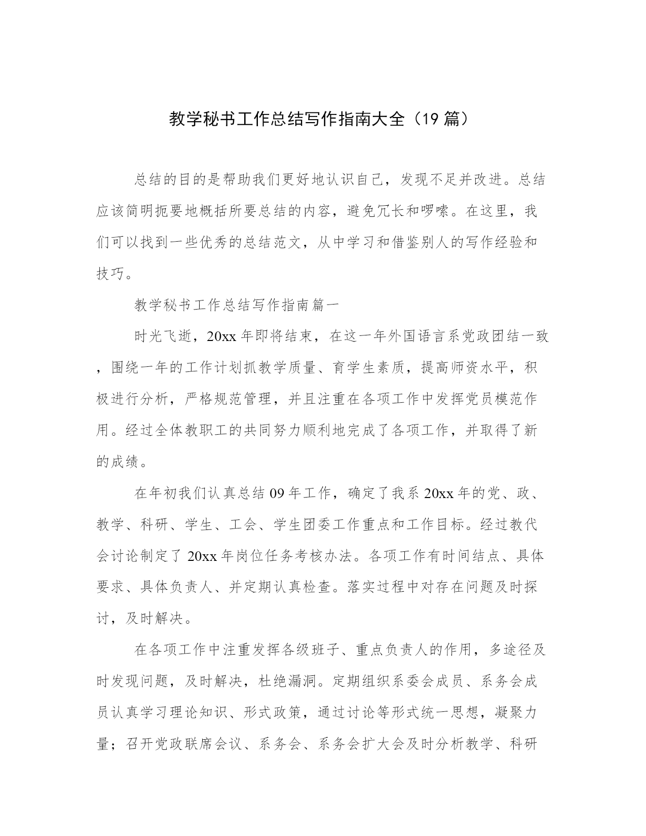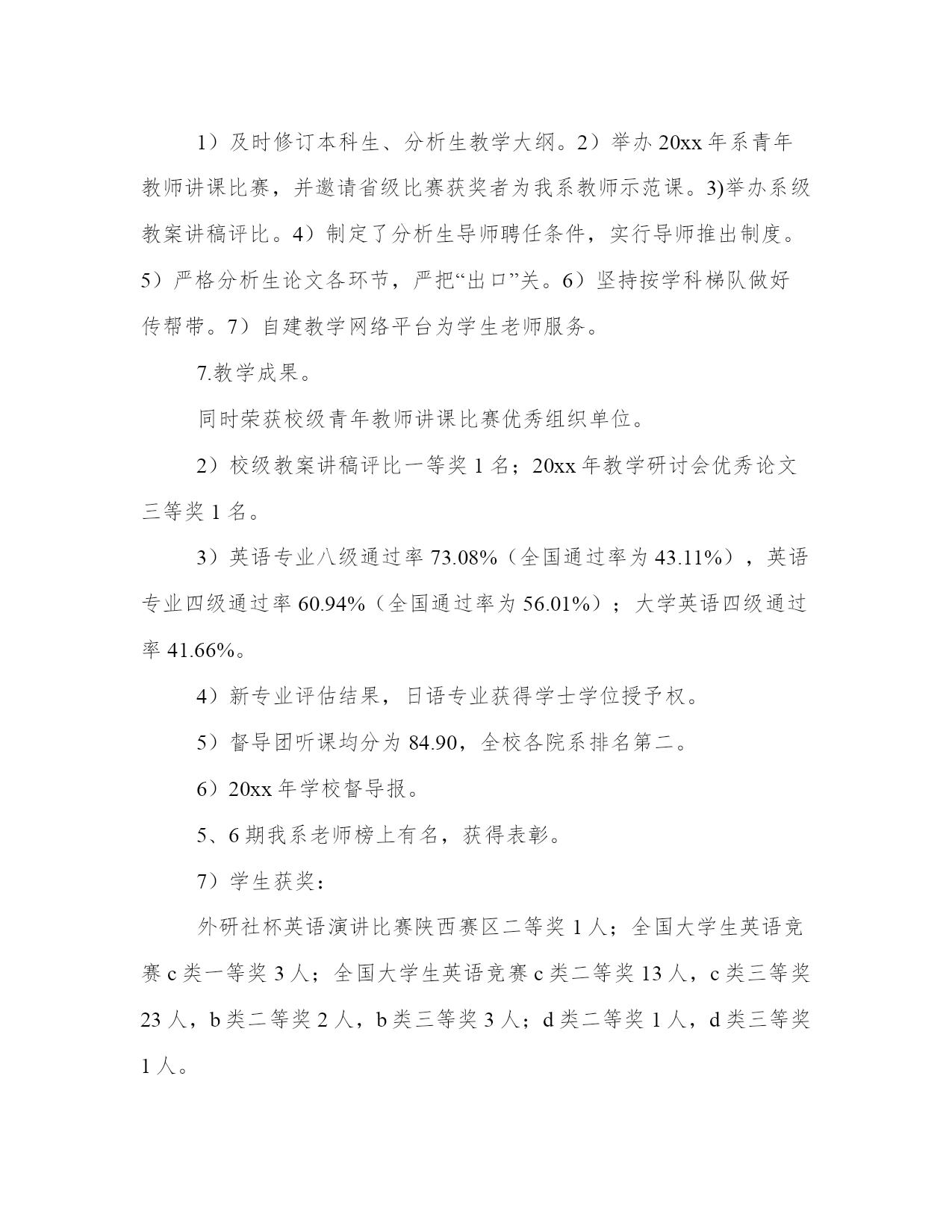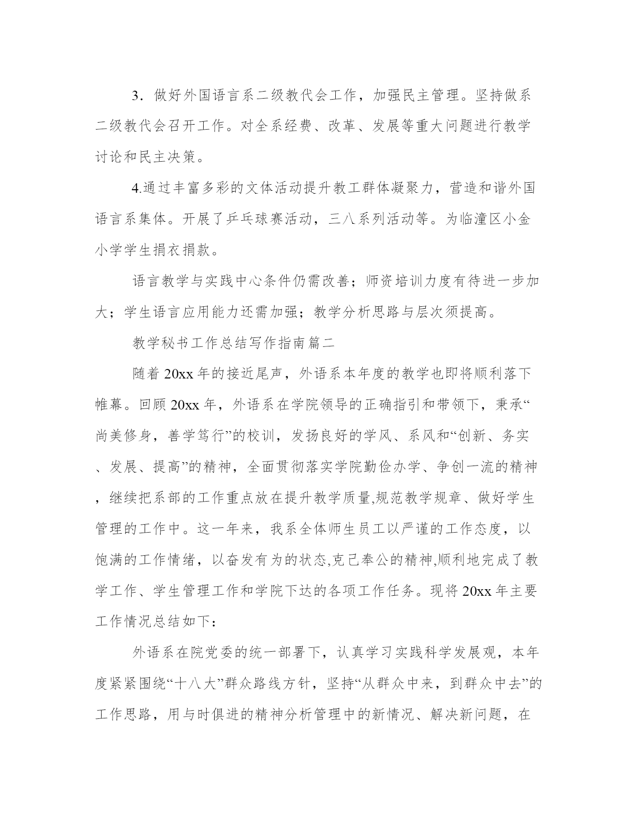 教学秘书工作总结写作指南大全(19篇)总结的目的是帮助我们更好地认识自己,发现不足并改进。总结应该简明扼要地概括所要总结的内容,避免冗长和啰嗦。在这里,我们可以找到一些优秀的总结范文,从中学习和借鉴别人的写作经验和技巧。教学秘书工作总结写作指南篇一时光飞逝,20xx年即将结束,在这一年外国语言系党政团结一致,围绕一年的工作计划抓教学质量、育学生素质,提高师资水平,积极进行分析,严格规范管理,并且注重在各项工作中发挥党员模范作用。经过全体教职工的共同努力顺利地完成了各项工作,并取得了新的成绩。在年初我们认真总结09年工作,确定了我系20xx年的党、政、教学、科研、学生、工会、学生团委工作重点和工作目标。经过教代会讨论制定了20xx年岗位任务考核办法。各项工作有时间结点、具体要求、具体负责人、并定期认真检查。落实过程中对存在问题及时探讨,及时解决。在各项工作中注重发挥各级班子、重点负责人的作用,多途径及时发现问题,及时解决,杜绝漏洞。定期组织系委会成员、系务会成员认真学习理论知识、形式政策,通过讨论等形式统一思想,凝聚力量;召开党政联席会议、系务会、系务会扩大会及时分析教学、科研、人事、发展、学科建设、师资培养等方面问题与解决办法;定期召开学生教育工作会议对学生心理、生活、学习等问题进行总结、分析探讨;召开不同层次的教师、学生座谈会,了解教师学生的心声与问题;召开总支委员会、支部委员会,加强党组织各项职能的发挥,确保党员先进性在工作中的充分体现;工会组织广大师生学习理论,开展丰富多彩的教职工活动,加大沟通,发挥了桥梁纽带作用。1.教学任务:20xx年教学工作任务是确保学校各项教学任务的完成,做好每学期的三期检查,做好学生毕业设计,积极进行教学分析,修订教学大纲,完成新专业验收,提高教师教学水平,提高学生语言应用能力。2.完成数量:20xx年我系承担了我校各层次的外语教学任务,共完成35672学时的教学任务,人均424.7学时。向全校开设公共选修课24门次。本年度共听课638次,平均每人8次。开设示范课10次。3.完成过程:每学期坚持做好学期初的教学计划和重点,认真发挥督导组的作用,强化检查落实情况,每周在系务会和教研会上进行总结,期末进行评比,将教学质量、育人工作和年终岗位考核挂钩。4.教学质量的提高。一、二等奖的老师来我。系开示范课等。2)学生学习质量的提高。教学质量的提高最终要落实体现在学生学习质量上。作为语言专业的学生,掌握语言应用技能是至关重要的。因此,在加强课堂教与学的同时,我们重点放在为学生创建语言氛围和应用机会。我们采取下列办法:举办英语演讲比赛;英语竞赛;读书活动;英文电影配音;外语文化月;观看外语电视;分析生指导本科生学习活动;学生利用语言实验中心设备自己录制英文节目;参加省级、全国英语竞赛活动。5.语言教学实践中心条件改善服务教学科研效果突出。1)20xx年4月份和9月份分别新增安装了英语写作课件包系统和大学英语教学双语平行语料库系统。20xx年底还将安装新视野大学英语在线教学课程。2)高校外语十项全能数据库20xx年主要用于教师备课和资料的查询。其中电子课件和外文资料部分使用较多。为教师备课和学生学习提供平台。3)英语写作课件包系统是外国语言系自己开发的教学平台,目前还在完善当中。自从4月份试运行以来,两个专业63位学生参与了实践,取得了良好的效果并提出了中肯的建议。4)大学英语教学双语平行语料库是我系几个科研及教改项目的综合在线呈现体系。该系统的试用目前正在进行中,也将为教学科研提供新的平台。5)有39名学生参与外语广播电台节目制作播出。目前已播出自制的英文及日文节目66期。采集整合最新最快的英语学习资料并及时向同学们播放,已播放236期。实时转播中央国际广播电台英文频道的优秀节目约155天。还承担了全校外语类考试的听力播放。6.特色活动。1)及时修订本科生、分析生教学大纲。2)举办20xx年系青年教师讲课比赛,并邀请省级比赛获奖者为我系教师示范课。3)举办系级教案讲稿评比。4)制定了分析生导师聘任条件,实行导师推出制度。5)严格分析生论文各环节,严把“出口”关。6)坚持按学科梯队做好传帮带。7)自建教学网络平台为学生老师服务。7.教学成果。同时荣获校级青年教师讲课比赛优秀组织单位。2)校级教案讲稿评比一等奖1名;20xx年教学研讨会优秀论文三等奖1名。3)英语专业八级通过率73.08%(全国通过率为43.11%),英语专业四级通过率60.94%(全国通过率为56.01%);大学英语四级通过率41.66%。4)新专业评估结果,日语专业获得学士学位授予权。5)督导团听课均分为84.90,全校各院系排名第二。6)20xx年学校督导报。5、6期我系老师榜上有名,获