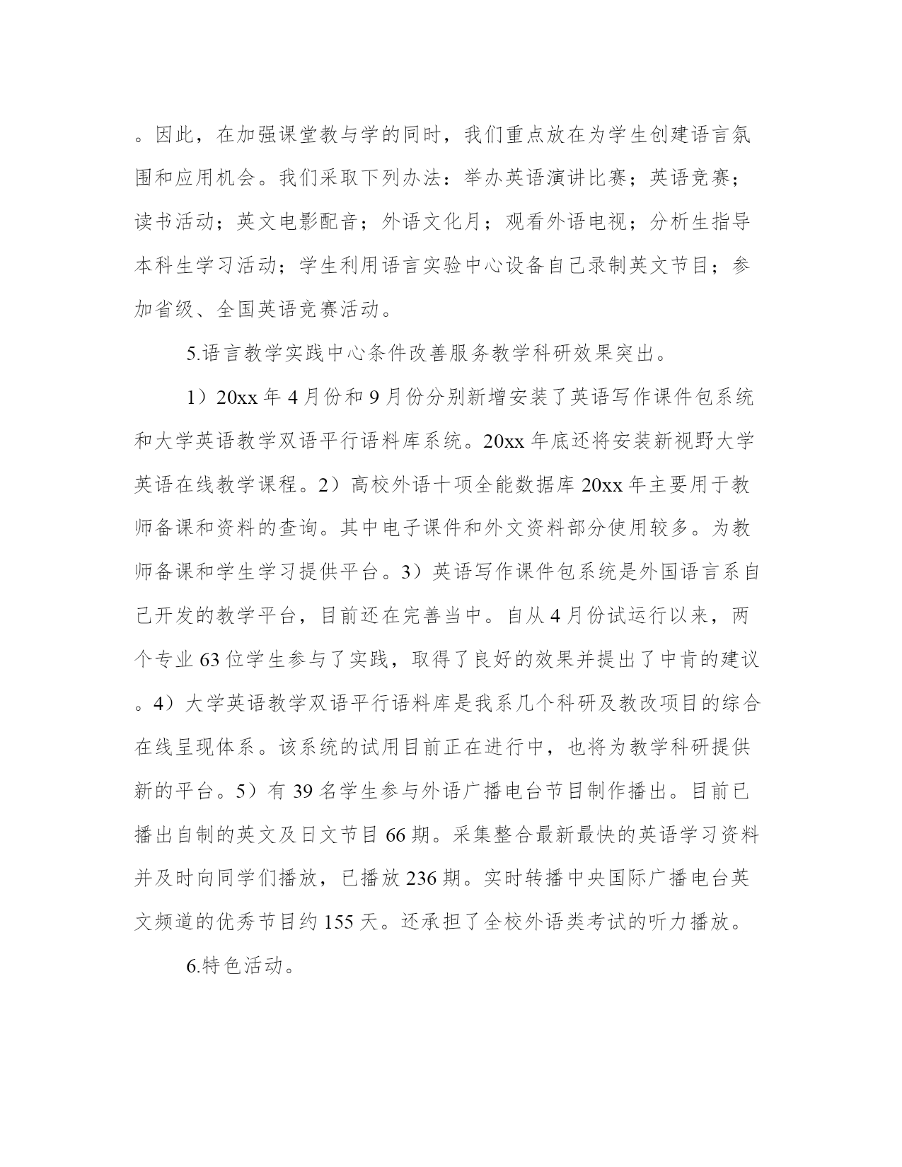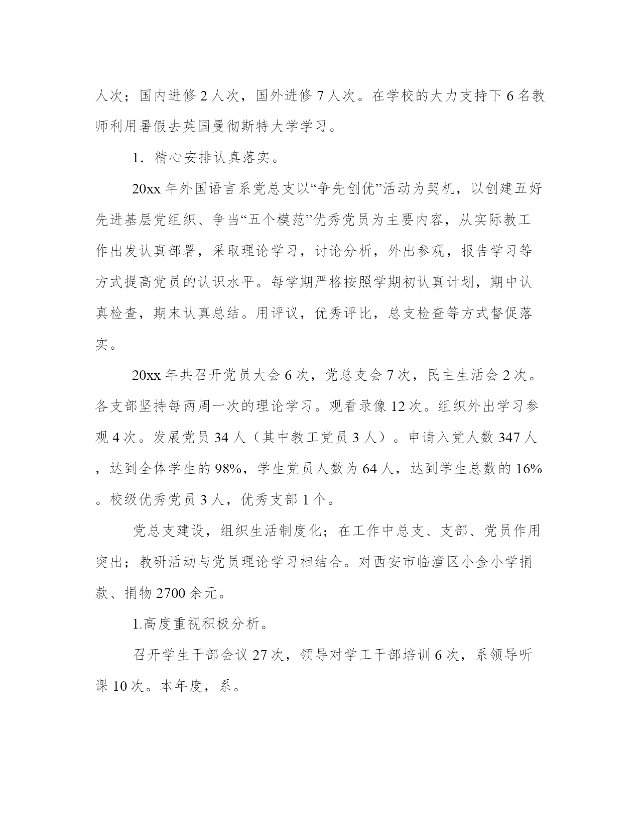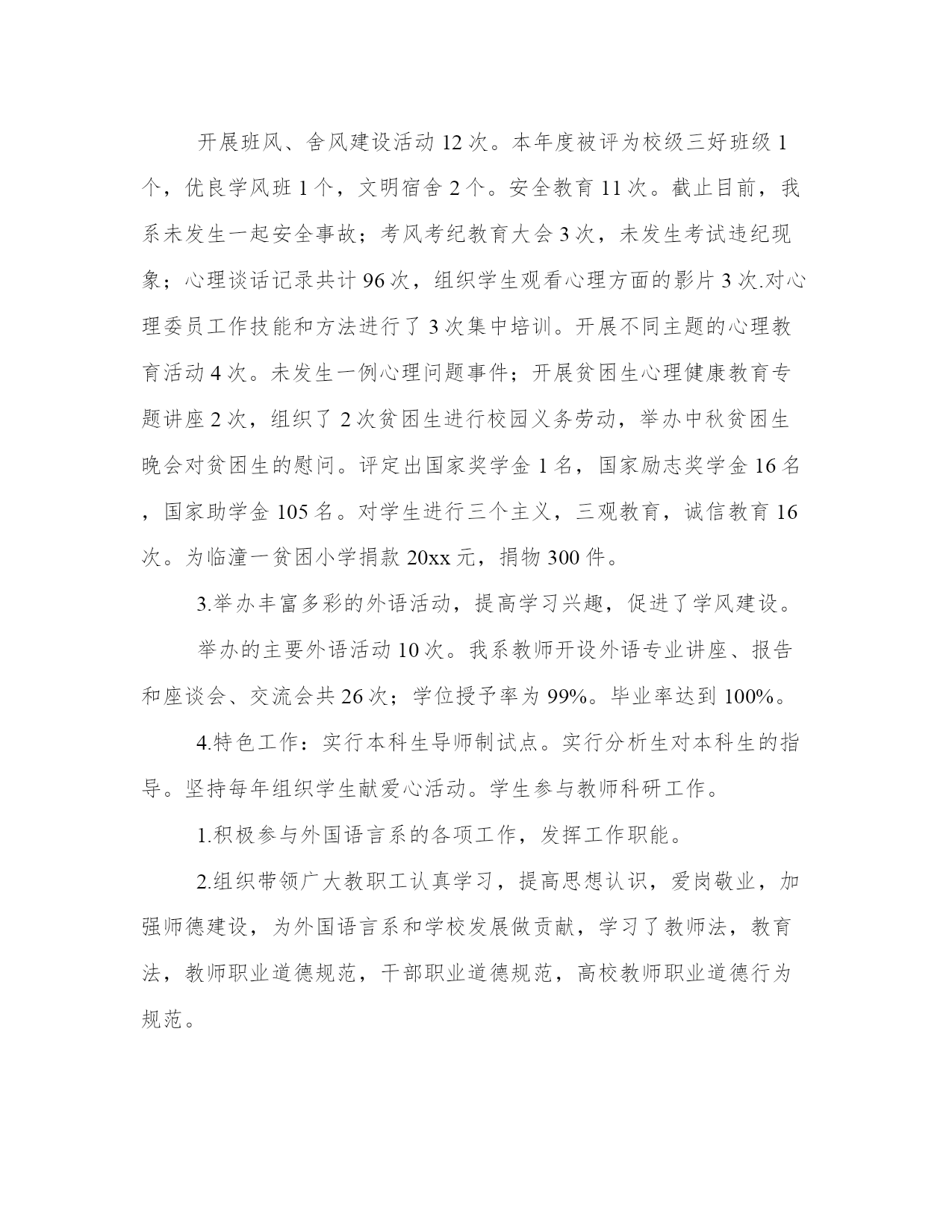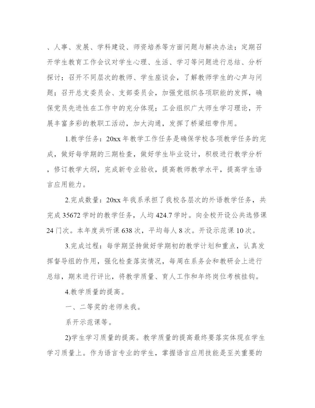 教学秘书工作总结写作指南大全(19篇)总结的目的是帮助我们更好地认识自己,发现不足并改进。总结应该简明扼要地概括所要总结的内容,避免冗长和啰嗦。在这里,我们可以找到一些优秀的总结范文,从中学习和借鉴别人的写作经验和技巧。教学秘书工作总结写作指南篇一时光飞逝,20xx年即将结束,在这一年外国语言系党政团结一致,围绕一年的工作计划抓教学质量、育学生素质,提高师资水平,积极进行分析,严格规范管理,并且注重在各项工作中发挥党员模范作用。经过全体教职工的共同努力顺利地完成了各项工作,并取得了新的成绩。在年初我们认真总结09年工作,确定了我系20xx年的党、政、教学、科研、学生、工会、学生团委工作重点和工作目标。经过教代会讨论制定了20xx年岗位任务考核办法。各项工作有时间结点、具体要求、具体负责人、并定期认真检查。落实过程中对存在问题及时探讨,及时解决。在各项工作中注重发挥各级班子、重点负责人的作用,多途径及时发现问题,及时解决,杜绝漏洞。定期组织系委会成员、系务会成员认真学习理论知识、形式政策,通过讨论等形式统一思想,凝聚力量;召开党政联席会议、系务会、系务会扩大会及时分析教学、科研、人事、发展、学科建设、师资培养等方面问题与解决办法;定期召开学生教育工作会议对学生心理、生活、学习等问题进行总结、分析探讨;召开不同层次的教师、学生座谈会,了解教师学生的心声与问题;召开总支委员会、支部委员会,加强党组织各项职能的发挥,确保党员先进性在工作中的充分体现;工会组织广大师生学习理论,开展丰富多彩的教职工活动,加大沟通,发挥了桥梁纽带作用。1.教学任务:20xx年教学工作任务是确保学校各项教学任务的完成,做好每学期的三期检查,做好学生毕业设计,积极进行教学分析,修订教学大纲,完成新专业验收,提高教师教学水平,提高学生语言应用能力。2.完成数量:20xx年我系承担了我校各层次的外语教学任务,共完成35672学时的教学任务,人均424.7学时。向全校开设公共选修课24门次。本年度共听课638次,平均每人8次。开设示范课10次。3.完成过程:每学期坚持做好学期初的教学计划和重点,认真发挥督导组的作用,强化检查落实情况,每周在系务会和教研会上进行总结,期末进行评比,将教学质量、育人工作和年终岗位考核挂钩。4.教学质量的提高。一、二等奖的老师来我。系开示范课等。2)学生学习质量的提高。教学质量的提高最终要落实体现在学生学习质量上。作为语言专业的学生,掌握语言应用技能是至关重要的。因此,在加强课堂教与学的同时,我们重点放在为学生创建语言氛围和应用机会。我们采取下列办法:举办英语演讲比赛;英语竞赛;读书活动;英文电影配音;外语文化月;观看外语电视;分析生指导本科生学习活动;学生利用语言实验中心设备自己录制英文节目;参加省级、全国英语竞赛活动。5.语言教学实践中心条件改善服务教学科研效果突出。1)20xx年4月份和9月份分别新增安装了英语写作课件包系统和大学英语教学双语平行语料库系统。20xx年底还将安装新视野大学英语在线教学课程。2)高校外语十项全能数据库20xx年主要用于教师备课和资料的查询。其中电子课件和外文资料部分使用较多。为教师备课和学生学习提供平台。3)英语写作课件包系统是外国语言系自己开发的教学平台,目前还在完善当中。自从4月份试运行以来,两个专业63位学生参与了实践,取得了良好的效果并提出了中肯的建议。4)大学英语教学双语平行语料库是我系几个科研及教改项目的综合在线呈现体系。该系统的试用目前正在进行中,也将为教学科研提供新的平台。5)有39名学生参与外语广播电台节目制作播出。目前已播出自制的英文及日文节目66期。采集整合最新最快的英语学习资料并及时向同学们播放,已播放236期。实时转播中央国际广播电台英文频道的优秀节目约155天。还承担了全校外语类考试的听力播放。6.特色活动。1)及时修订本科生、分析生教学大纲。2)举办20xx年系青年教师讲课比赛,并邀请省级比赛获奖者为我系教师示范课。3)举办系级教案讲稿评比。4)制定了分析生导师聘任条件,实行导师推出制度。5)严格分析生论文各环节,严把“出口”关。6)坚持按学科梯队做好传帮带。7)自建教学网络平台为学生老师服务。7.教学成果。同时荣获校级青年教师讲课比赛优秀组织单位。2)校级教案讲稿评比一等奖1名;20xx年教学研讨会优秀论文三等奖1名。3)英语专业八级通过率73.08%(全国通过率为43.11%),英语专业四级通过率60.94%(全国通过率为56.01%);大学英语四级通过率41.66%。4)新专业评估结果,日语专业获得学士学位授予权。5)督导团听课均分为84.90,全校各院系排名第二。6)20xx年学校督导报。5、6期我系老师榜上有名,获