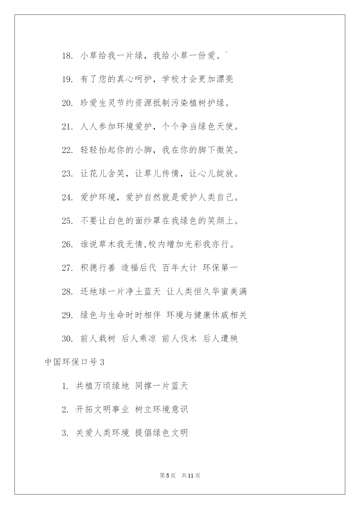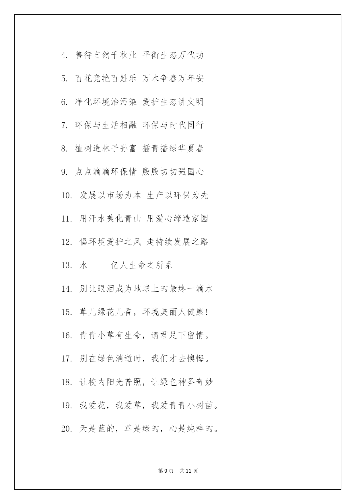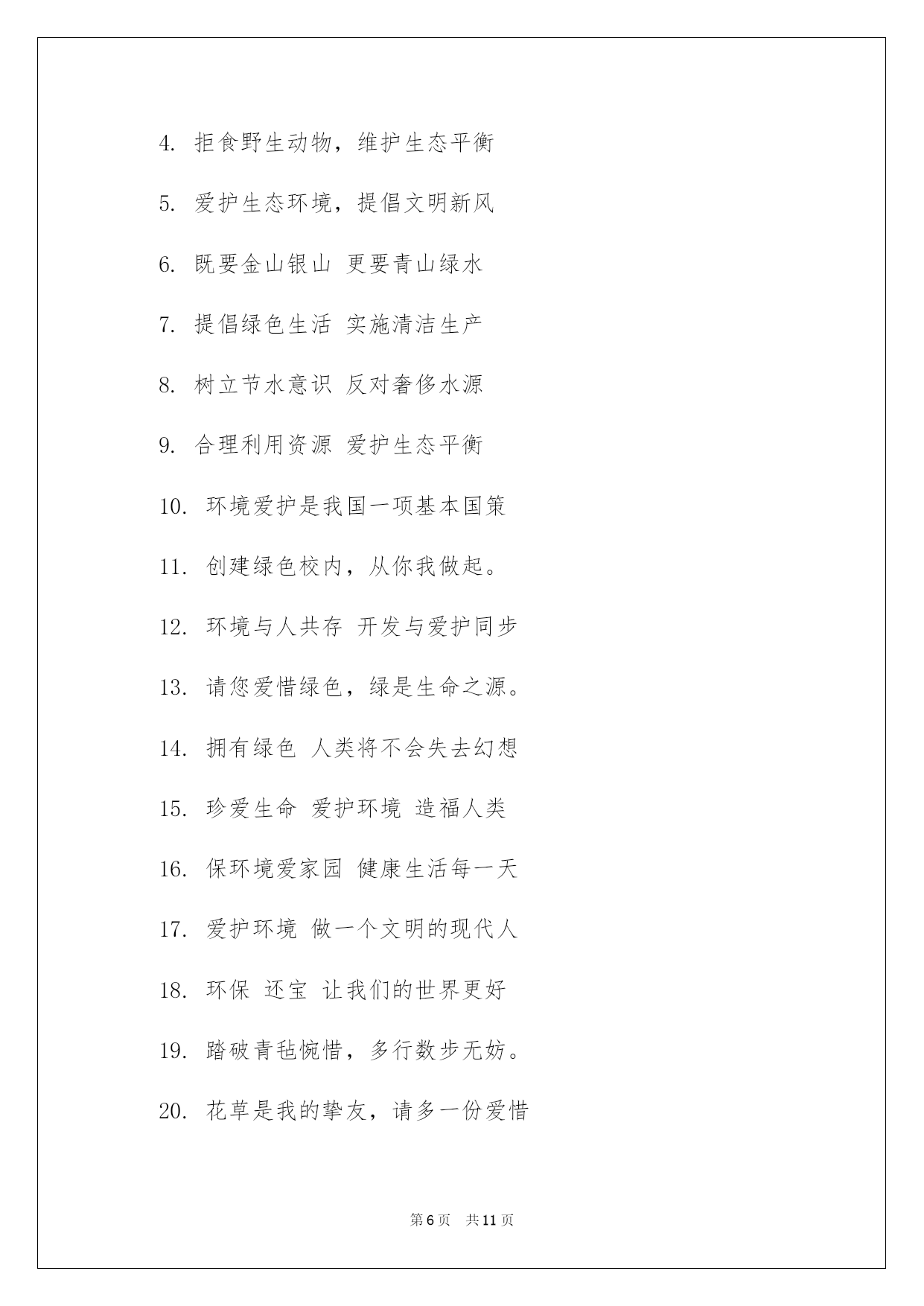 第PAGE\*Arabic\*MERGEFORMAT11页共NUMPAGES\*Arabic\*MERGEFORMAT11页第PAGE\*MERGEFORMAT11页共NUMPAGES\*MERGEFORMAT11页第PAGE\*MERGEFORMAT11页共NUMPAGES\*MERGEFORMAT11页第PAGE\*MERGEFORMAT11页共NUMPAGES\*MERGEFORMAT11页第PAGE\*MERGEFORMAT11页共NUMPAGES\*MERGEFORMAT11页第PAGE\*MERGEFORMAT11页共NUMPAGES\*MERGEFORMAT11页第PAGE\*MERGEFORMAT11页共NUMPAGES\*MERGEFORMAT11页第PAGE\*MERGEFORMAT11页共NUMPAGES\*MERGEFORMAT11页第PAGE\*MERGEFORMAT11页共NUMPAGES\*MERGEFORMAT11页第PAGE\*MERGEFORMAT11页共NUMPAGES\*MERGEFORMAT11页第PAGE\*MERGEFORMAT11页共NUMPAGES\*MERGEFORMAT11页2022中国环保口号中国环保口号中国环保口号11.心系人类命运营造生命绿洲——中国环保2.绿色世界你我共创清爽气息大家共享3.漂亮的心灵须要塑造美丽的环境须要爱护4.全面建设小康社会切实走可持续发展之路5.花儿以花香回报我们,我们只需脚下留情。6.爱护环境从我做起,爱惜学校从学生做起。7.爱护环境谁受益造福子孙我为先人人自律8.轻轻地我走了,正如我轻轻地来。(图书馆)9.花香阵阵,鸟鸣声声。琅琅书声,浓浓情深。10.小草青青,花香飘飘;青草鲜花,应当疼惜。11.鸟儿渴望干净的天空,人类渴望绿色的家园。12.不图自己“顺便”,且为绿色校内行个便利。13.追求环保是你我的心愿参加环保是你我的责任14.“取之思尽、用之思绝”请珍惜我们有限的资源15.同处蓝天下共栖地球上——让我们的世界更好16.除了踪迹、什么也不留;除了摄影、什么也不取17.爱护环境,少说多做,让校内成为绿色的殿堂。18.青青绿叶红花,岂能肆意践踏(请勿践踏草坪)19.还天地之本原传人类之文明环境爱护人人有责20.只要赐予一些爱,就能给你带来郁郁葱葱的绿荫。21.风调雨顺始自环境爱护人寿年丰源于生态平衡22.爱山爱水爱林爱鸟爱人类护天护地护花护草护环境23.绿化祖国山青水碧千秋美平衡生态人杰地灵万里春24.多一声感谢,多一个挚友,多一声愧疚,多一份宽容。25.留意了,每个人都望见你在这里的一举一动。(走廊)26.垃圾——你对我的遗弃,等于将你的道德也给丢弃了。27.挽救地球刻不待时爱护环境燃眉之急共建家园任重道远28.绿色光明了我们的眼睛,是为了让我们看清足下绿的生命。29.人类只有好好地对待大自然,大自然才能无限地回报人类。30.除了踪迹,什么都不能遗留;除了回忆,什么都不要拎走。31.用我们的双手栽下漫天的绿色用我们的心灵守望五彩的家园32.既要金山银山又要碧波青山有了碧波青山才有金山银山33.喝干净的`水,呼吸簇新的空气,这须要您每时每刻爱惜环境!34.爱青山绿水爱蓝天白云让生命在爱中每时每刻充溢活力35.你挥一挥袖,不带走一片云彩。我动一动手,不留下任何纸屑。36.小草——清不要把您名贵的脚压在我的身上,因为我也会哭泣的。37.得到的不是永恒的拥有失去的将永不会再来——爱护环境人人有责38.树成荫草成被花吐艳驻四季皆春山变绿水变清鸟歌颂迎八方清风39.草木——假如我香消玉陨,就无法装扮校内的漂亮校内.假如你怜香惜玉,请您给我们一些关爱吧!40.我爱花我爱草我爱青青小树苗不摘花不踏草不折树枝不乱摇花草树木是挚友大家都要爱惜好中国环保口号21.以法爱护自然环境以德创建社会文明2.文明村村村迈大步环保户户户奔小康3.清爽氧气源于绿色健康生命源于自然4.树立环境爱护意识建设绿色文明家园5.爱护人类生态环境提倡全球绿色文明6.大力增加环保意识提高全民环保素养7.金钱是一时的利益环境是永恒的资本8.蓝天碧海热忱的心环境爱护高尚的人9.人人参加环境爱护个个争当绿色天使10.手拉手办绿色奥运心连心迎五洲健儿11.为大地添一抹绿意为世界增一份朝气12.呼喊公民环保意识建立绿色生活方式13.同心关爱自然容颜携手描绘美妙河山14.提高环境道德水平建设文明小康城区15.全面建设小康社会同心共创美妙家园16.让大气清爽、让天空蔚蓝、让河山碧绿17.提高环境爱护意识爱惜我们共有家园18.小草给我一片绿,我给
