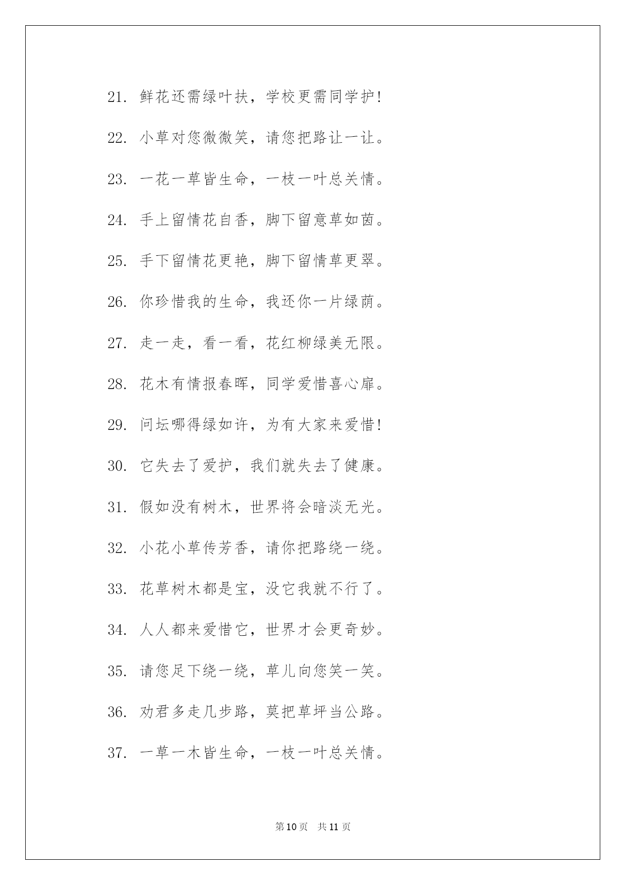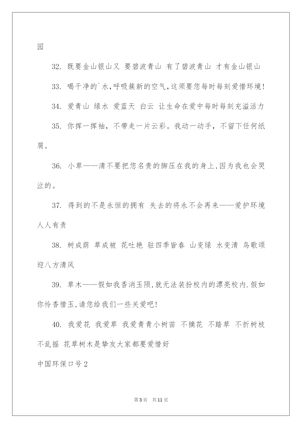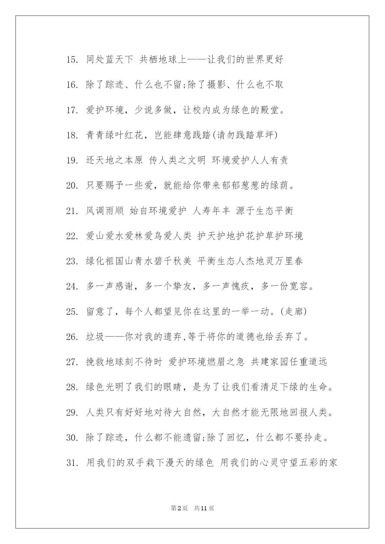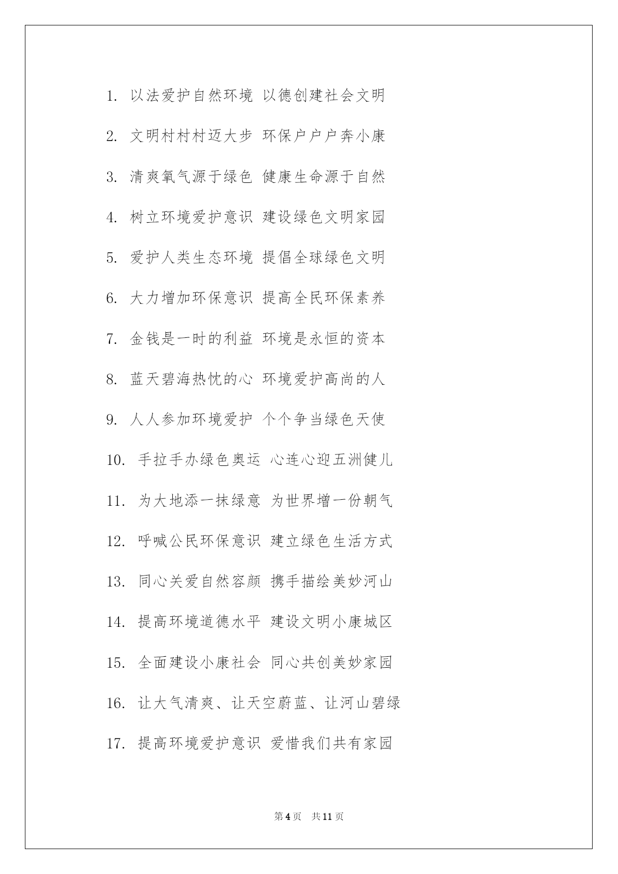 第PAGE\*Arabic\*MERGEFORMAT11页共NUMPAGES\*Arabic\*MERGEFORMAT11页第PAGE\*MERGEFORMAT11页共NUMPAGES\*MERGEFORMAT11页第PAGE\*MERGEFORMAT11页共NUMPAGES\*MERGEFORMAT11页第PAGE\*MERGEFORMAT11页共NUMPAGES\*MERGEFORMAT11页第PAGE\*MERGEFORMAT11页共NUMPAGES\*MERGEFORMAT11页第PAGE\*MERGEFORMAT11页共NUMPAGES\*MERGEFORMAT11页第PAGE\*MERGEFORMAT11页共NUMPAGES\*MERGEFORMAT11页第PAGE\*MERGEFORMAT11页共NUMPAGES\*MERGEFORMAT11页第PAGE\*MERGEFORMAT11页共NUMPAGES\*MERGEFORMAT11页第PAGE\*MERGEFORMAT11页共NUMPAGES\*MERGEFORMAT11页第PAGE\*MERGEFORMAT11页共NUMPAGES\*MERGEFORMAT11页2022中国环保口号中国环保口号中国环保口号11.心系人类命运营造生命绿洲——中国环保2.绿色世界你我共创清爽气息大家共享3.漂亮的心灵须要塑造美丽的环境须要爱护4.全面建设小康社会切实走可持续发展之路5.花儿以花香回报我们,我们只需脚下留情。6.爱护环境从我做起,爱惜学校从学生做起。7.爱护环境谁受益造福子孙我为先人人自律8.轻轻地我走了,正如我轻轻地来。(图书馆)9.花香阵阵,鸟鸣声声。琅琅书声,浓浓情深。10.小草青青,花香飘飘;青草鲜花,应当疼惜。11.鸟儿渴望干净的天空,人类渴望绿色的家园。12.不图自己“顺便”,且为绿色校内行个便利。13.追求环保是你我的心愿参加环保是你我的责任14.“取之思尽、用之思绝”请珍惜我们有限的资源15.同处蓝天下共栖地球上——让我们的世界更好16.除了踪迹、什么也不留;除了摄影、什么也不取17.爱护环境,少说多做,让校内成为绿色的殿堂。18.青青绿叶红花,岂能肆意践踏(请勿践踏草坪)19.还天地之本原传人类之文明环境爱护人人有责20.只要赐予一些爱,就能给你带来郁郁葱葱的绿荫。21.风调雨顺始自环境爱护人寿年丰源于生态平衡22.爱山爱水爱林爱鸟爱人类护天护地护花护草护环境23.绿化祖国山青水碧千秋美平衡生态人杰地灵万里春24.多一声感谢,多一个挚友,多一声愧疚,多一份宽容。25.留意了,每个人都望见你在这里的一举一动。(走廊)26.垃圾——你对我的遗弃,等于将你的道德也给丢弃了。27.挽救地球刻不待时爱护环境燃眉之急共建家园任重道远28.绿色光明了我们的眼睛,是为了让我们看清足下绿的生命。29.人类只有好好地对待大自然,大自然才能无限地回报人类。30.除了踪迹,什么都不能遗留;除了回忆,什么都不要拎走。31.用我们的双手栽下漫天的绿色用我们的心灵守望五彩的家园32.既要金山银山又要碧波青山有了碧波青山才有金山银山33.喝干净的`水,呼吸簇新的空气,这须要您每时每刻爱惜环境!34.爱青山绿水爱蓝天白云让生命在爱中每时每刻充溢活力35.你挥一挥袖,不带走一片云彩。我动一动手,不留下任何纸屑。36.小草——清不要把您名贵的脚压在我的身上,因为我也会哭泣的。37.得到的不是永恒的拥有失去的将永不会再来——爱护环境人人有责38.树成荫草成被花吐艳驻四季皆春山变绿水变清鸟歌颂迎八方清风39.草木——假如我香消玉陨,就无法装扮校内的漂亮校内.假如你怜香惜玉,请您给我们一些关爱吧!40.我爱花我爱草我爱青青小树苗不摘花不踏草不折树枝不乱摇花草树木是挚友大家都要爱惜好中国环保口号21.以法爱护自然环境以德创建社会文明2.文明村村村迈大步环保户户户奔小康3.清爽氧气源于绿色健康生命源于自然4.树立环境爱护意识建设绿色文明家园5.爱护人类生态环境提倡全球绿色文明6.大力增加环保意识提高全民环保素养7.金钱是一时的利益环境是永恒的资本8.蓝天碧海热忱的心环境爱护高尚的人9.人人参加环境爱护个个争当绿色天使10.手拉手办绿色奥运心连心迎五洲健儿11.为大地添一抹绿意为世界增一份朝气12.呼喊公民环保意识建立绿色生活方式13.同心关爱自然容颜携手描绘美妙河山14.提高环境道德水平建设文明小康城区15.全面建设小康社会同心共创美妙家园16.让大气清爽、让天空蔚蓝、让河山碧绿17.提高环境爱护意识爱惜我们共有家园18.小草给我一片绿,我给