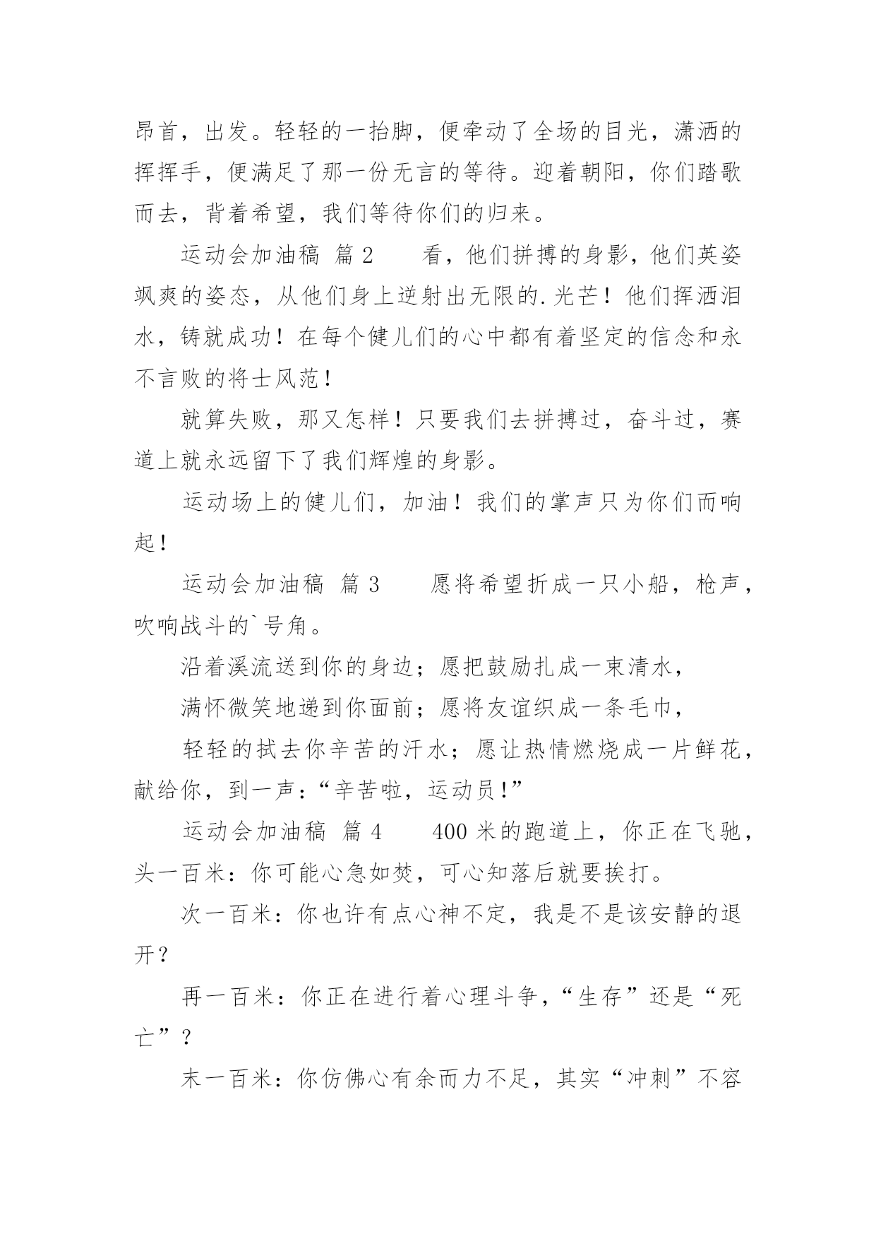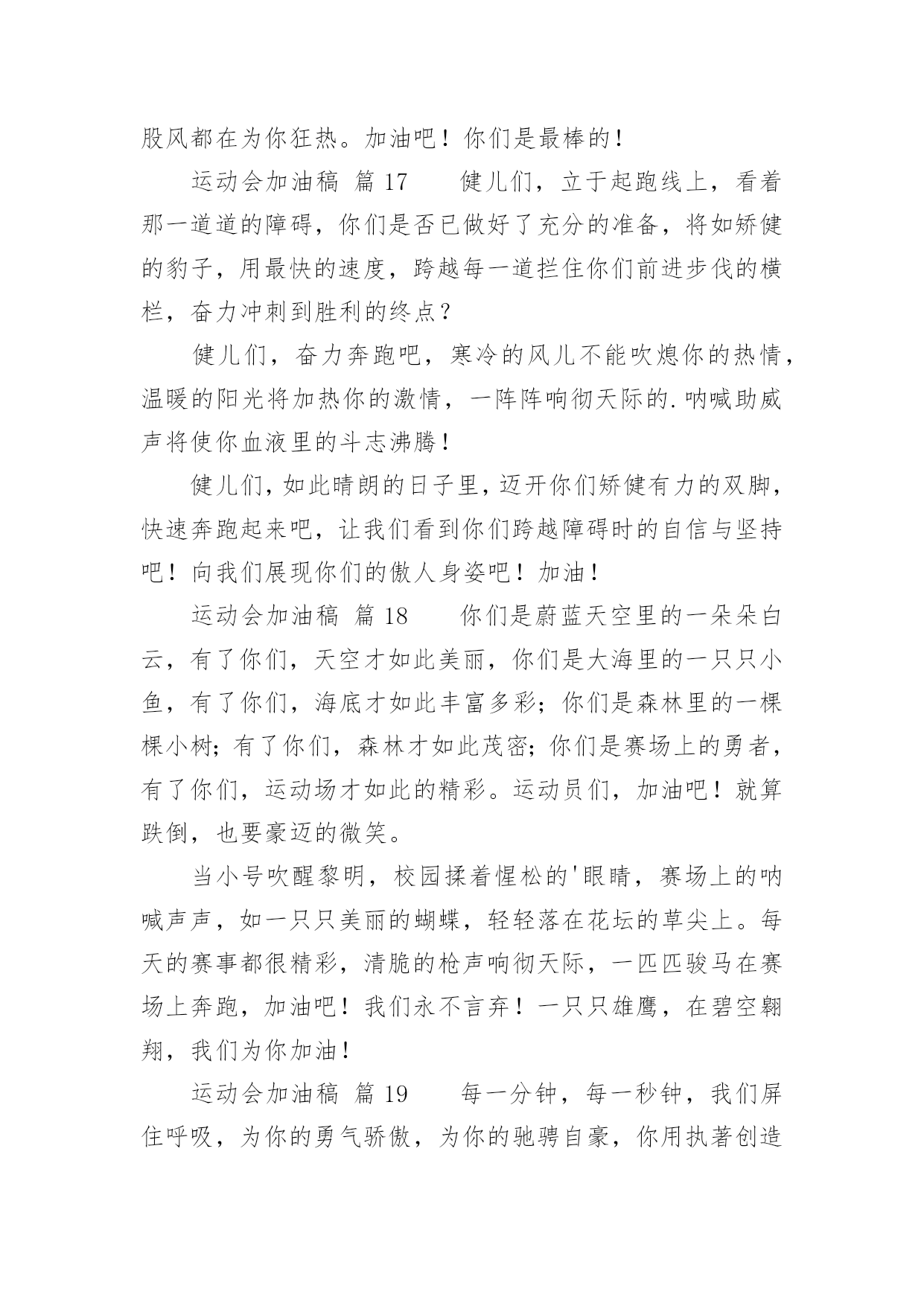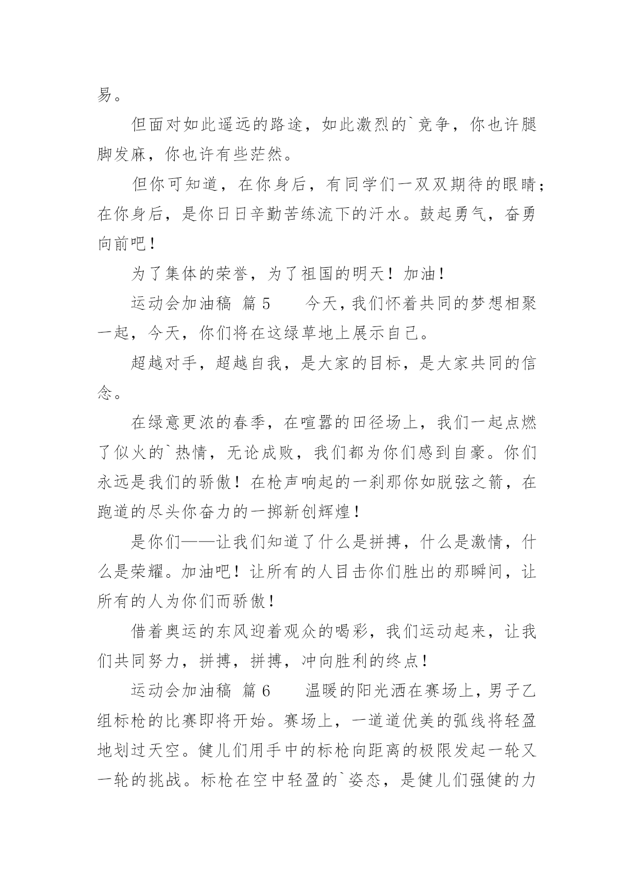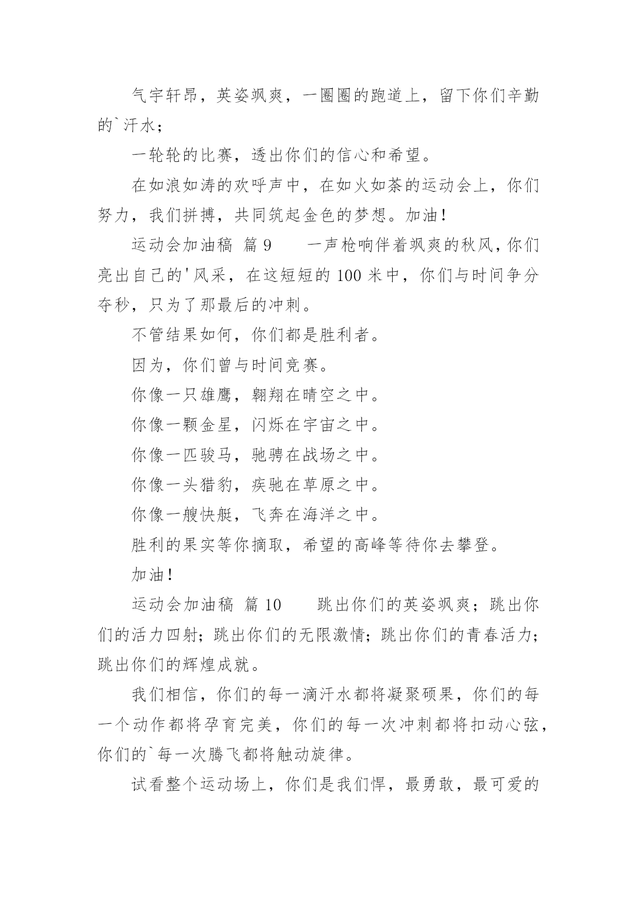 运动会加油稿(优)运动会加油稿25篇现如今,我们都跟加油稿有着直接或间接的联系,加油稿可以起到鼓励场上的人、增添其信心的作用。你知道加油稿怎样才能写的好吗?下面是小编收集整理的运动会加油稿,欢迎大家分享。运动会加油稿篇1不长不短的距离,需要的是全身心全程投入,自始至终你们都在拼尽全力,此时此刻,你们处在最风光的一刻,无论第几坚持胜利的信心,只要跑下来,你们就是英雄,不为鲜花的'围绕,不为刹那的荣耀,只有执着的信念,化作不停的奔跑,心中燃烧着梦想,脚下不停的步伐,不为掌声的注释,不为刻意的征服,不为失败的痛苦,只有辛勤的汗水,化作成功的脚步。加油!汗水,泪水;笑声,歌声;我们尽情挥洒。开幕式上,运动场上,我们尽情展现,多少艰辛,多少困苦,我们勇敢承担。因为年轻,因为张扬,因为我们知道:用今天的汗水换来明天的微笑。坚定,执着,耐力与希望,在延伸的白色跑道中点点凝聚!力量,信念,拼搏与奋斗,在遥远的终点线上渐渐明亮!时代的强音正在你的脚下踏响。就像花儿准备了春、秋、冬,就是为了红透整个盛夏。就像雪花经历了春、夏、秋就是为了洁白整个严冬。蹲下,昂首,出发。轻轻的一抬脚,便牵动了全场的目光,潇洒的挥挥手,便满足了那一份无言的等待。迎着朝阳,你们踏歌而去,背着希望,我们等待你们的归来。运动会加油稿篇2看,他们拼搏的身影,他们英姿飒爽的姿态,从他们身上逆射出无限的.光芒!他们挥洒泪水,铸就成功!在每个健儿们的心中都有着坚定的信念和永不言败的将士风范!就算失败,那又怎样!只要我们去拼搏过,奋斗过,赛道上就永远留下了我们辉煌的身影。运动场上的健儿们,加油!我们的掌声只为你们而响起!运动会加油稿篇3愿将希望折成一只小船,枪声,吹响战斗的`号角。沿着溪流送到你的身边;愿把鼓励扎成一束清水,满怀微笑地递到你面前;愿将友谊织成一条毛巾,轻轻的拭去你辛苦的汗水;愿让热情燃烧成一片鲜花,献给你,到一声:“辛苦啦,运动员!”运动会加油稿篇4400米的跑道上,你正在飞驰,头一百米:你可能心急如焚,可心知落后就要挨打。次一百米:你也许有点心神不定,我是不是该安静的退开?再一百米:你正在进行着心理斗争,“生存”还是“死亡”?末一百米:你仿佛心有余而力不足,其实“冲刺”不容易。但面对如此遥远的路途,如此激烈的`竞争,你也许腿脚发麻,你也许有些茫然。但你可知道,在你身后,有同学们一双双期待的眼睛;在你身后,是你日日辛勤苦练流下的汗水。鼓起勇气,奋勇向前吧!为了集体的荣誉,为了祖国的明天!加油!运动会加油稿篇5今天,我们怀着共同的梦想相聚一起,今天,你们将在这绿草地上展示自己。超越对手,超越自我,是大家的目标,是大家共同的信念。在绿意更浓的春季,在喧嚣的田径场上,我们一起点燃了似火的`热情,无论成败,我们都为你们感到自豪。你们永远是我们的骄傲!在枪声响起的一刹那你如脱弦之箭,在跑道的尽头你奋力的一掷新创辉煌!是你们——让我们知道了什么是拼搏,什么是激情,什么是荣耀。加油吧!让所有的人目击你们胜出的那瞬间,让所有的人为你们而骄傲!借着奥运的东风迎着观众的喝彩,我们运动起来,让我们共同努力,拼搏,拼搏,冲向胜利的终点!运动会加油稿篇6温暖的阳光洒在赛场上,男子乙组标枪的比赛即将开始。赛场上,一道道优美的弧线将轻盈地划过天空。健儿们用手中的标枪向距离的极限发起一轮又一轮的挑战。标枪在空中轻盈的`姿态,是健儿们强健的力量和熟练的技巧的结合。谁能在这场激烈的竞争中获胜?让我们拭目以待,让我们为他们呐喊、助威吧!只有将力量与技巧合二为一的人,才能获得胜利的桂冠!有多少次挥汗如雨,伤痛曾添满记忆,只因为始终相信,去拼搏才能胜利。总在鼓舞自己,要成功就得努力。热血在赛场沸腾,巨人在赛场升起。相信自己,你将赢得胜利,创造奇迹;相信自己,梦想在你手中,这是你的天地。当一切过去,你们将是第一。相信自己,你们将超越极限,超越自己!相信自己,加油吧,健儿们,相信你自己。运动会加油稿篇7春意盎然,微风习习,站在绿茵场上,你屏住呼吸。助跑,起跳,腾空,青春的身影掠过天空;加速,冲刺,落地,腾空的飞沙满载希望!无论远近,胸中的热血永不停歇;无关成败,心中的热情无限绽放!从你们昂首挺胸迈向赛场时起,你们便是万众瞩目的焦点,青春的.道路上,期待你们浓墨重彩的一笔。向前冲吧!让晶莹的汗水肆意挥洒;向前冲吧!让胜利的曙光遍布赛场;向前冲吧!让你们的辉煌响彻云霄!短短的跑道,承载着我们的期望,声声的发令,紧扣着你们的心弦。越短的路程,就越是考验运动员的反应、爆发力。你们看到了吗?那终点线就在前方;你们听到了吗?那加油声就在耳中。拼搏吧,加油吧,奔跑吧!让你们的力量在这一刻澎湃而出,成为赛场上最璀璨的光辉。运动会加油稿篇8金秋,寒风瑟瑟;运动员,奋力拼搏。气宇轩昂,英姿飒爽,一圈圈的跑道上,留下你们辛勤的`汗