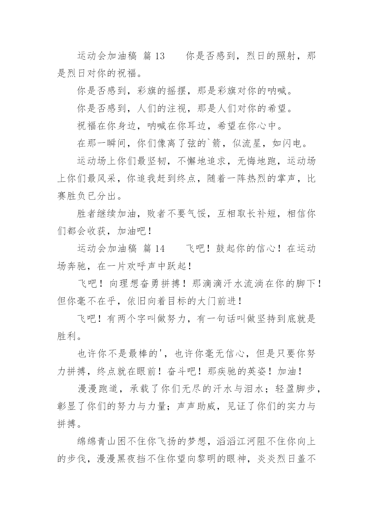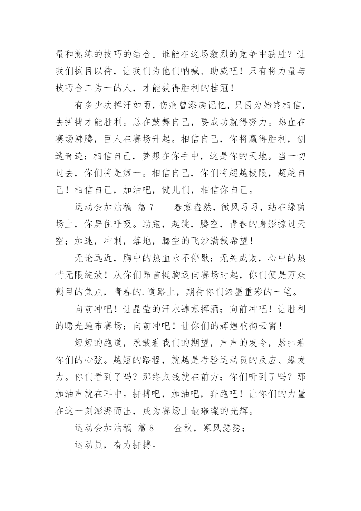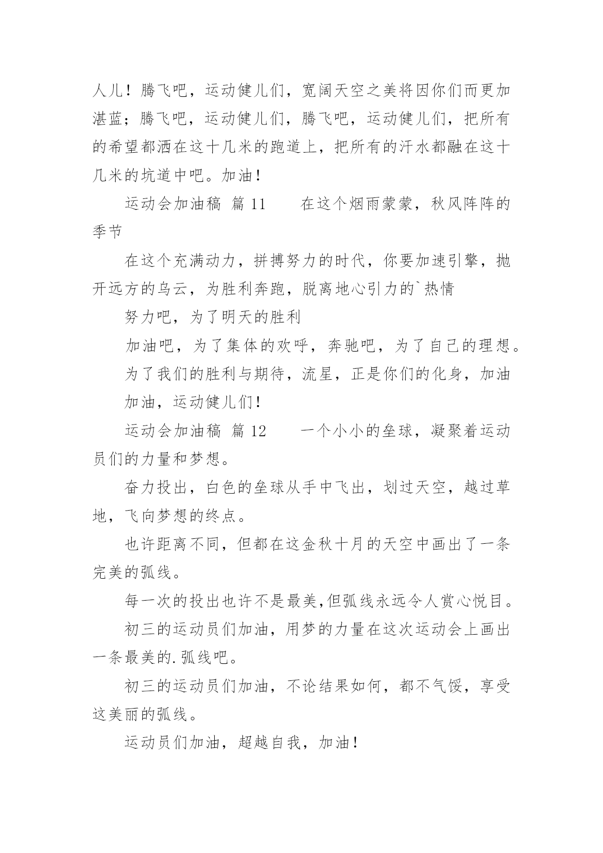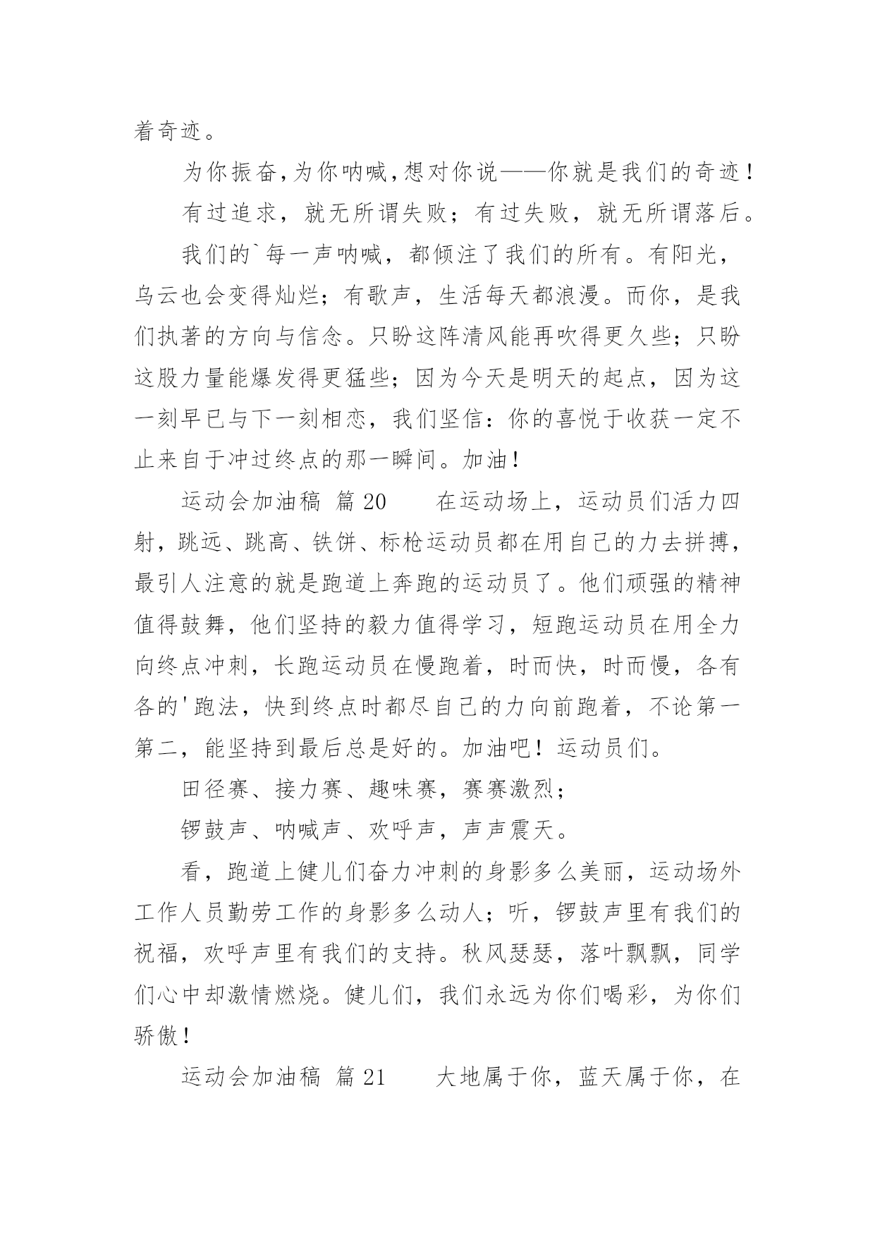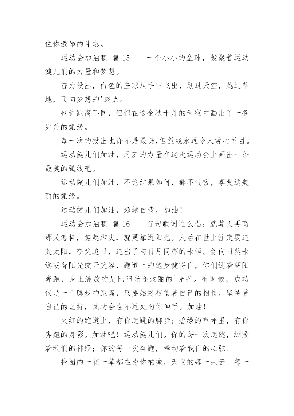 运动会加油稿(优)运动会加油稿25篇现如今,我们都跟加油稿有着直接或间接的联系,加油稿可以起到鼓励场上的人、增添其信心的作用。你知道加油稿怎样才能写的好吗?下面是小编收集整理的运动会加油稿,欢迎大家分享。运动会加油稿篇1不长不短的距离,需要的是全身心全程投入,自始至终你们都在拼尽全力,此时此刻,你们处在最风光的一刻,无论第几坚持胜利的信心,只要跑下来,你们就是英雄,不为鲜花的'围绕,不为刹那的荣耀,只有执着的信念,化作不停的奔跑,心中燃烧着梦想,脚下不停的步伐,不为掌声的注释,不为刻意的征服,不为失败的痛苦,只有辛勤的汗水,化作成功的脚步。加油!汗水,泪水;笑声,歌声;我们尽情挥洒。开幕式上,运动场上,我们尽情展现,多少艰辛,多少困苦,我们勇敢承担。因为年轻,因为张扬,因为我们知道:用今天的汗水换来明天的微笑。坚定,执着,耐力与希望,在延伸的白色跑道中点点凝聚!力量,信念,拼搏与奋斗,在遥远的终点线上渐渐明亮!时代的强音正在你的脚下踏响。就像花儿准备了春、秋、冬,就是为了红透整个盛夏。就像雪花经历了春、夏、秋就是为了洁白整个严冬。蹲下,昂首,出发。轻轻的一抬脚,便牵动了全场的目光,潇洒的挥挥手,便满足了那一份无言的等待。迎着朝阳,你们踏歌而去,背着希望,我们等待你们的归来。运动会加油稿篇2看,他们拼搏的身影,他们英姿飒爽的姿态,从他们身上逆射出无限的.光芒!他们挥洒泪水,铸就成功!在每个健儿们的心中都有着坚定的信念和永不言败的将士风范!就算失败,那又怎样!只要我们去拼搏过,奋斗过,赛道上就永远留下了我们辉煌的身影。运动场上的健儿们,加油!我们的掌声只为你们而响起!运动会加油稿篇3愿将希望折成一只小船,枪声,吹响战斗的`号角。沿着溪流送到你的身边;愿把鼓励扎成一束清水,满怀微笑地递到你面前;愿将友谊织成一条毛巾,轻轻的拭去你辛苦的汗水;愿让热情燃烧成一片鲜花,献给你,到一声:“辛苦啦,运动员!”运动会加油稿篇4400米的跑道上,你正在飞驰,头一百米:你可能心急如焚,可心知落后就要挨打。次一百米:你也许有点心神不定,我是不是该安静的退开?再一百米:你正在进行着心理斗争,“生存”还是“死亡”?末一百米:你仿佛心有余而力不足,其实“冲刺”不容易。但面对如此遥远的路途,如此激烈的`竞争,你也许腿脚发麻,你也许有些茫然。但你可知道,在你身后,有同学们一双双期待的眼睛;在你身后,是你日日辛勤苦练流下的汗水。鼓起勇气,奋勇向前吧!为了集体的荣誉,为了祖国的明天!加油!运动会加油稿篇5今天,我们怀着共同的梦想相聚一起,今天,你们将在这绿草地上展示自己。超越对手,超越自我,是大家的目标,是大家共同的信念。在绿意更浓的春季,在喧嚣的田径场上,我们一起点燃了似火的`热情,无论成败,我们都为你们感到自豪。你们永远是我们的骄傲!在枪声响起的一刹那你如脱弦之箭,在跑道的尽头你奋力的一掷新创辉煌!是你们——让我们知道了什么是拼搏,什么是激情,什么是荣耀。加油吧!让所有的人目击你们胜出的那瞬间,让所有的人为你们而骄傲!借着奥运的东风迎着观众的喝彩,我们运动起来,让我们共同努力,拼搏,拼搏,冲向胜利的终点!运动会加油稿篇6温暖的阳光洒在赛场上,男子乙组标枪的比赛即将开始。赛场上,一道道优美的弧线将轻盈地划过天空。健儿们用手中的标枪向距离的极限发起一轮又一轮的挑战。标枪在空中轻盈的`姿态,是健儿们强健的力量和熟练的技巧的结合。谁能在这场激烈的竞争中获胜?让我们拭目以待,让我们为他们呐喊、助威吧!只有将力量与技巧合二为一的人,才能获得胜利的桂冠!有多少次挥汗如雨,伤痛曾添满记忆,只因为始终相信,去拼搏才能胜利。总在鼓舞自己,要成功就得努力。热血在赛场沸腾,巨人在赛场升起。相信自己,你将赢得胜利,创造奇迹;相信自己,梦想在你手中,这是你的天地。当一切过去,你们将是第一。相信自己,你们将超越极限,超越自己!相信自己,加油吧,健儿们,相信你自己。运动会加油稿篇7春意盎然,微风习习,站在绿茵场上,你屏住呼吸。助跑,起跳,腾空,青春的身影掠过天空;加速,冲刺,落地,腾空的飞沙满载希望!无论远近,胸中的热血永不停歇;无关成败,心中的热情无限绽放!从你们昂首挺胸迈向赛场时起,你们便是万众瞩目的焦点,青春的.道路上,期待你们浓墨重彩的一笔。向前冲吧!让晶莹的汗水肆意挥洒;向前冲吧!让胜利的曙光遍布赛场;向前冲吧!让你们的辉煌响彻云霄!短短的跑道,承载着我们的期望,声声的发令,紧扣着你们的心弦。越短的路程,就越是考验运动员的反应、爆发力。你们看到了吗?那终点线就在前方;你们听到了吗?那加油声就在耳中。拼搏吧,加油吧,奔跑吧!让你们的力量在这一刻澎湃而出,成为赛场上最璀璨的光辉。运动会加油稿篇8金秋,寒风瑟瑟;运动员,奋力拼搏。气宇轩昂,英姿飒爽,一圈圈的跑道上,留下你们辛勤的`汗
