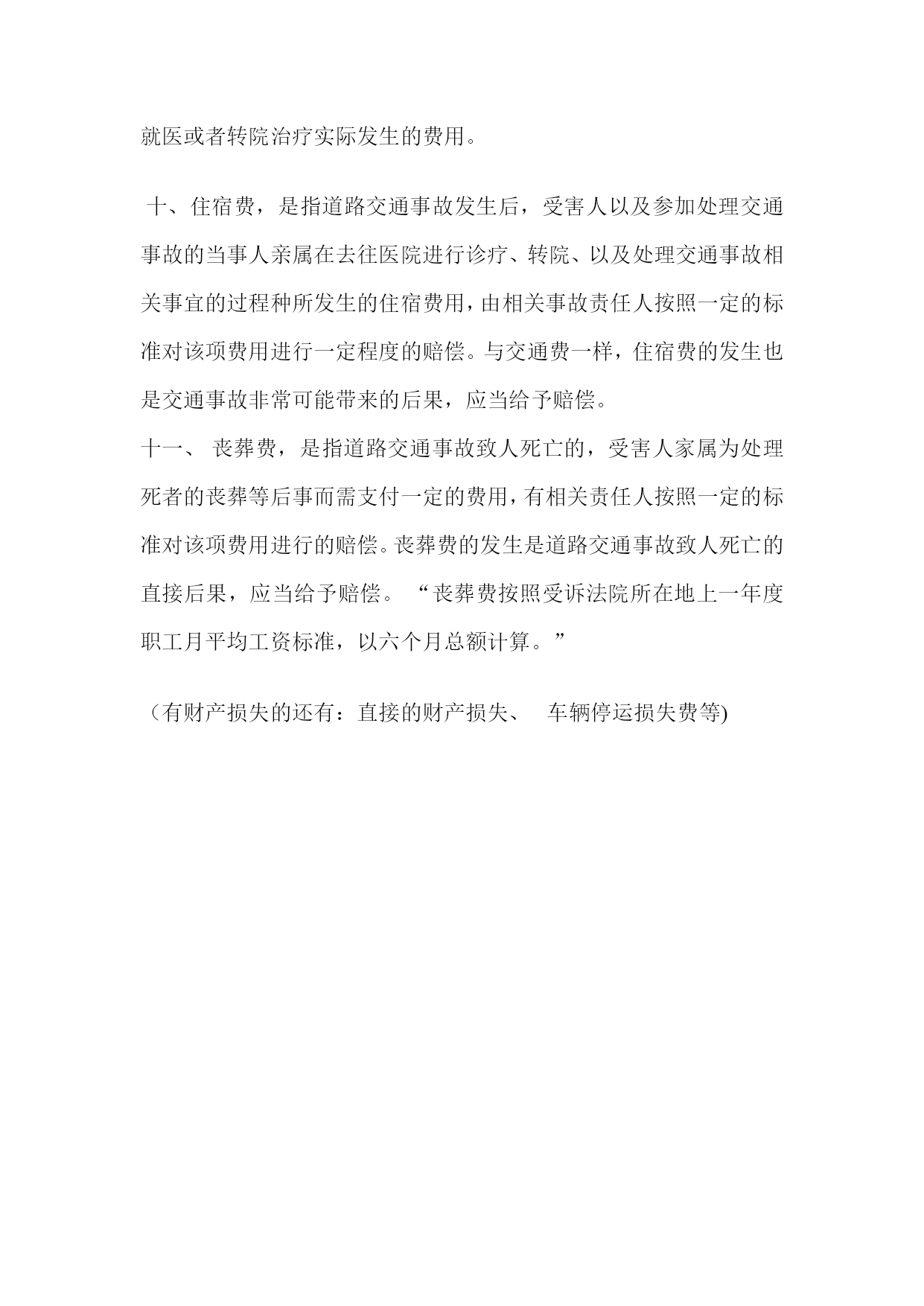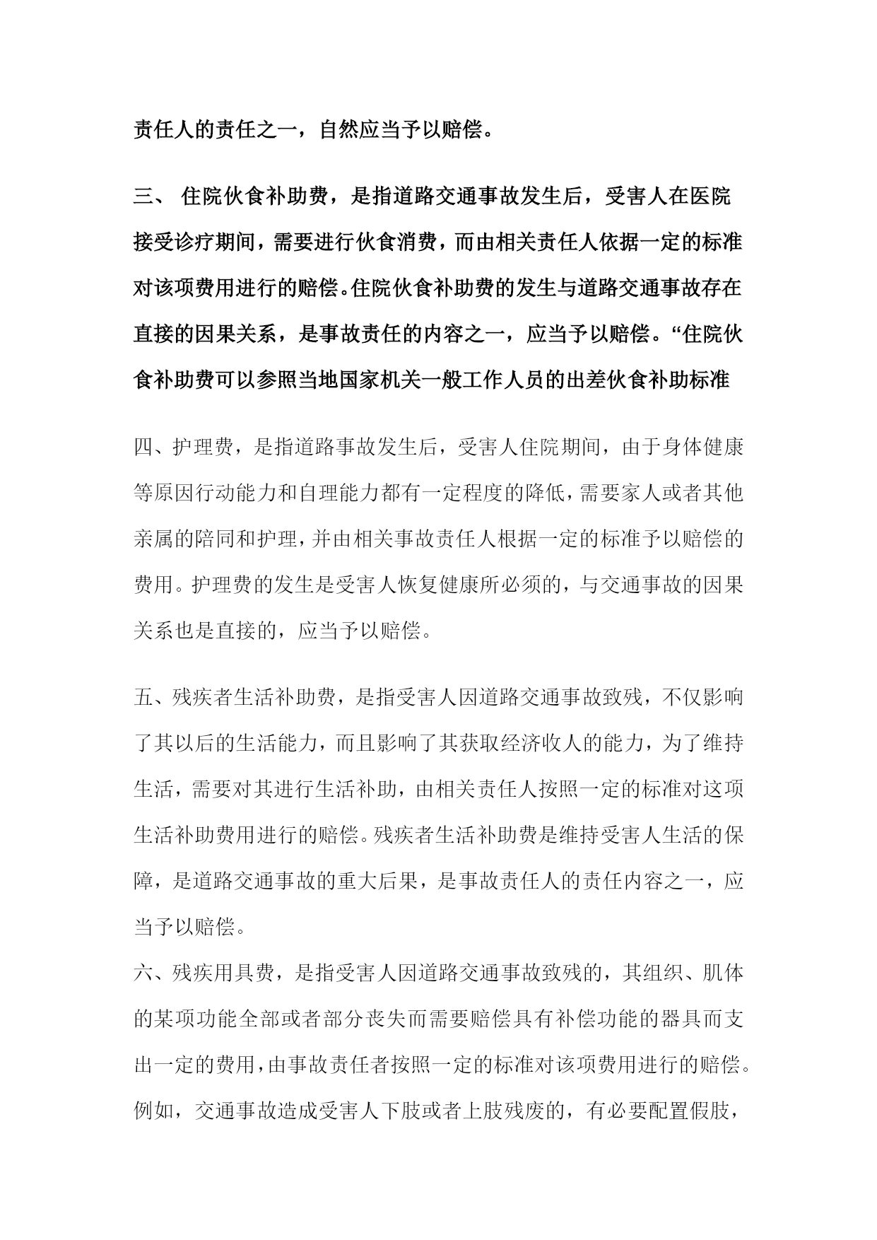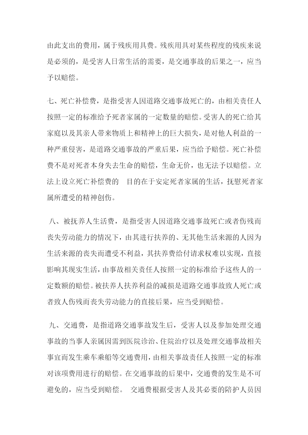 交通事故赔偿口诀口诀:医误护交住食养;残扶助精死后丧。解析:普通交通事故,需赔7项款:医疗费(含二次手术费)、误工费、护理费、交通费、住宿费、住院伙食费、必要的营养费;残疾的:残:残疾赔偿金,扶:被抚养人生活补助费;助:辅助的器具费;精:精神抚慰金死亡的:再加丧葬费(死后再葬)。操作:交通事故赔偿标准:一、医疗费,是指道路交通事故发生后,由于造成一定的人身伤害,为恢复健康而需要就医诊治,按照医院对当事人的交通事故创伤治疗所必须的费用。医疗费主要包括挂号费、检查费、化验费、手术费、治疗费、住院费和药费等。医疗费可以为住院医疗费,也可以为门诊医疗费,但支出的目的在于治疗交通事故中的受伤人员、伤残人员以及抢救伤重死亡人员。二、误工费,是指道路交通事故发生后,遭受人身损害的受害人需要接受诊治以恢复健康,以及当事人的相关亲属需要参加交通事故的处理,无法正常参加工作或者从事日常的经营活动,因此而造成经济收入的减少,由负有责任的一方按照一定的标准对该项减少的收人给予的赔偿。误工费的发生与交通事故之间存在直接的因果关系,是事故责任人的责任之一,自然应当予以赔偿。三、住院伙食补助费,是指道路交通事故发生后,受害人在医院接受诊疗期间,需要进行伙食消费,而由相关责任人依据一定的标准对该项费用进行的赔偿。住院伙食补助费的发生与道路交通事故存在直接的因果关系,是事故责任的内容之一,应当予以赔偿。“住院伙食补助费可以参照当地国家机关一般工作人员的出差伙食补助标准四、护理费,是指道路事故发生后,受害人住院期间,由于身体健康等原因行动能力和自理能力都有一定程度的降低,需要家人或者其他亲属的陪同和护理,并由相关事故责任人根据一定的标准予以赔偿的费用。护理费的发生是受害人恢复健康所必须的,与交通事故的因果关系也是直接的,应当予以赔偿。五、残疾者生活补助费,是指受害人因道路交通事故致残,不仅影响了其以后的生活能力,而且影响了其获取经济收人的能力,为了维持生活,需要对其进行生活补助,由相关责任人按照一定的标准对这项生活补助费用进行的赔偿。残疾者生活补助费是维持受害人生活的保障,是道路交通事故的重大后果,是事故责任人的责任内容之一,应当予以赔偿。六、残疾用具费,是指受害人因道路交通事故致残的,其组织、肌体的某项功能全部或者部分丧失而需要赔偿具有补偿功能的器具而支出一定的费用,由事故责任者按照一定的标准对该项费用进行的赔偿。例如,交通事故造成受害人下肢或者上肢残废的,有必要配置假肢,由此支出的费用,属于残疾用具费。残疾用具对某些程度的残疾来说是必须的,是受害人日常生活的需要,是交通事故的后果之一,应当予以赔偿。七、死亡补偿费,是指受害人因道路交通事故死亡的,由相关责任人按照一定的标准给予死者家属的一定数量的赔偿。受害人的死亡给其家庭以及其亲人带来物质上和精神上的巨大损失,是对他人利益的一种严重侵害,是道路交通事故的严重后果,应当给予赔偿。死亡补偿费不是对死者本身失去生命的赔偿,生命无价,也无法予以赔偿。立法上设立死亡补偿费的目的在于安定死者家属的生活,抚慰死者家属所遭受的精神创伤。八、被抚养人生活费,是指受害人因道路交通事故死亡或者伤残而丧失劳动能力的情况下,由其进行扶养的、无其他生活来源的人因为生活来源的丧失而遭受不利益,其扶养费给付请求权难以实现,直接影响其现实生活,由事故相关责任人按照一定的标准给予这些人的一定数额的赔偿。被扶养人扶养利益的减损是道路交通事故致人死亡或者致人伤残而丧失劳动能力的直接后果,应当受到赔偿。九、交通费,是指道路交通事故发生后,受害人以及参加处理交通事故的当事人亲属因需到医院诊治、住院治疗以及处理交通事故相关事宜而发生乘车乘船等交通费用,由相关事故责任人按照一定的标准对该项费用进行的赔偿。在交通事故的后果中,交通费的发生是不可避免的,应当受到赔偿。交通费根据受害人及其必要的陪护人员因就医或者转院治疗实际发生的费用。十、住宿费,是指道路交通事故发生后,受害人以及参加处理交通事故的当事人亲属在去往医院进行诊疗、转院、以及处理交通事故相关事宜的过程种所发生的住宿费用,由相关事故责任人按照一定的标准对该项费用进行一定程度的赔偿。与交通费一样,住宿费的发生也是交通事故非常可能带来的后果,应当给予赔偿。十一、丧葬费,是指道路交通事故致人死亡的,受害人家属为处理死者的丧葬等后事而需支付一定的费用,有相关责任人按照一定的标准对该项费用进行的赔偿。丧葬费的发生是道路交通事故致人死亡的直接后果,应当给予赔偿。“丧葬费按照受诉法院所在地上一年度职工月平均工资标准,以六个月总额计算。”(有财产损失的还有:直接的财产损失、车辆停运损失费等)