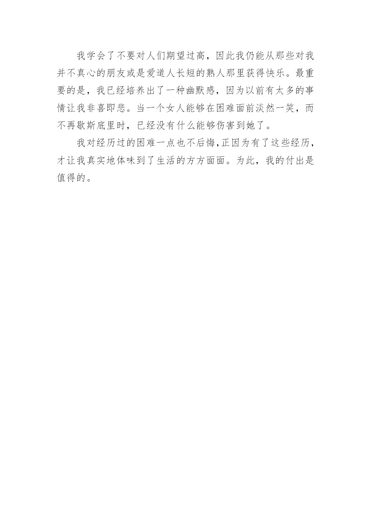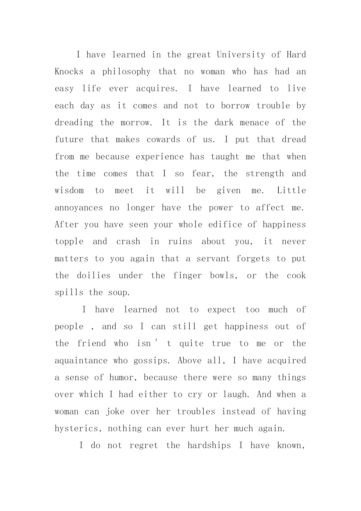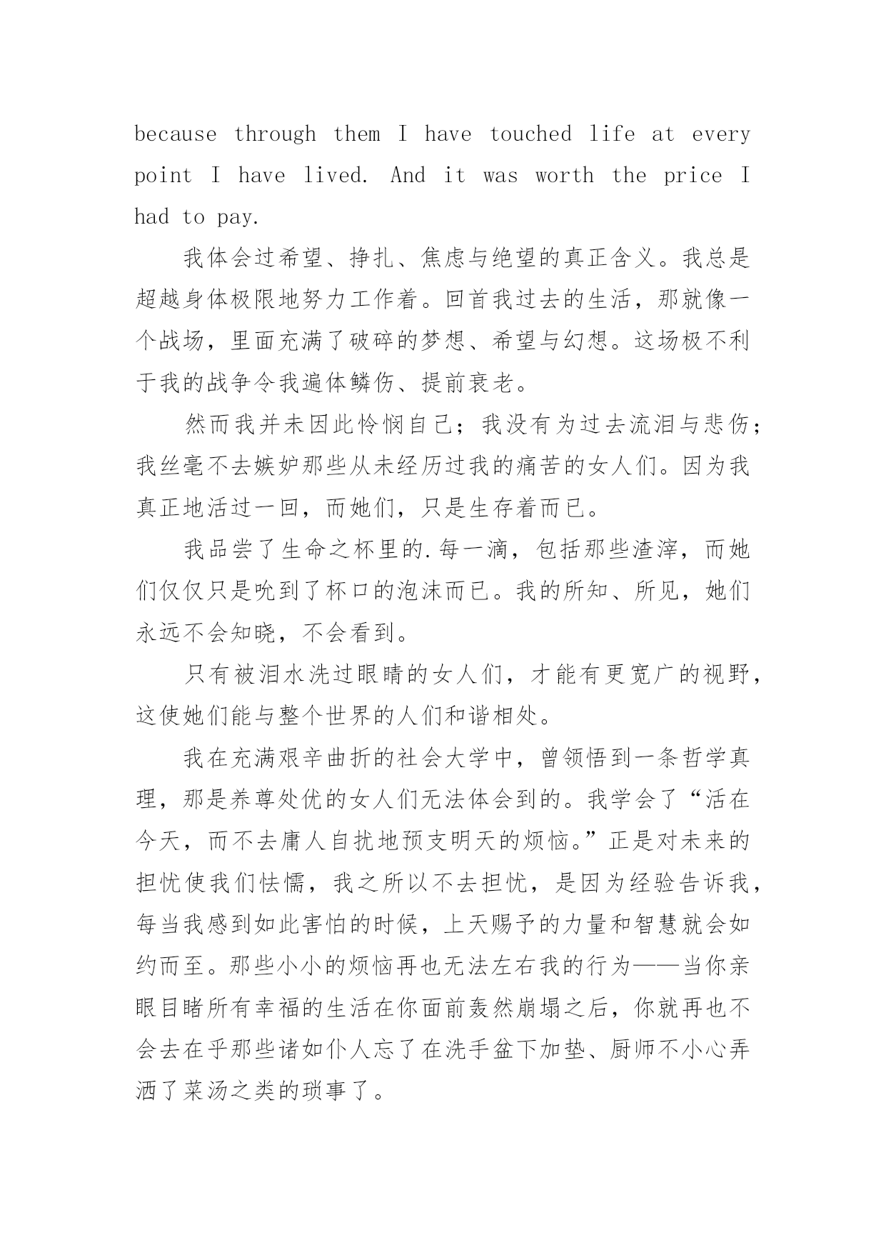 双语阅读:体验生活双语阅读:体验生活ExperienceLife体验生活Ihaveknownwantandstruggleandanxietyanddespair.Ihavealwayshadtoworkbeyondthelimitsofmystrength.AsIlookbackuponmylife,Iseeitasabattlefieldstrewnwiththewrecksofdeaddreamsandbrokenhopesandshatteredillusions--abattleinwhichIalwaysfoughtwiththeoddstremendouslyagainstme,andwhichhasleftmescarredandbruisedandmaimedandoldbeforemytime.Yet,Ihavenopityformyself;notearstoshedoverthepastandgonesorrows;noenvyforthewomenwhohavebeensparedallIhavegonethrough.ForIhavelived.Theyonlyexisted.Ihavedrunkthecupoflifedowntoitsverydregs.Theyhaveonlysippedthebubblesontopofit.Iknowthingstheywillneverknow.Iseethingstowhichtheyareblind.Itisonlythewomenwhoseeyeshavebeenwashedclearwithtearswhogetthebroadvisionthatmakesthemlittlesisterstoalltheworld.IhavelearnedinthegreatUniversityofHardKnocksaphilosophythatnowomanwhohashadaneasylifeeveracquires.Ihavelearnedtoliveeachdayasitcomesandnottoborrowtroublebydreadingthemorrow.Itisthedarkmenaceofthefuturethatmakescowardsofus.IputthatdreadfrommebecauseexperiencehastaughtmethatwhenthetimecomesthatIsofear,thestrengthandwisdomtomeetitwillbegivenme.Littleannoyancesnolongerhavethepowertoaffectme.Afteryouhaveseenyourwholeedificeofhappinesstoppleandcrashinruinsaboutyou,itnevermatterstoyouagainthataservantforgetstoputthedoiliesunderthefingerbowls,orthecookspillsthesoup.Ihavelearnednottoexpecttoomuchofpeople,andsoIcanstillgethappinessoutofthefriendwhoisn′tquitetruetomeortheaquaintancewhogossips.Aboveall,Ihaveacquiredasenseofhumor,becausethereweresomanythingsoverwhichIhadeithertocryorlaugh.Andwhenawomancanjokeoverhertroublesinsteadofhavinghysterics,nothingcaneverhurthermuchagain.IdonotregretthehardshipsIhaveknown,becausethroughthemIhavetouchedlifeateverypointIhavelived.AnditwasworththepriceIhadtopay.我体会过希望、挣扎、焦虑与绝望的真正含义。我总是超越身体极限地努力工作着。回首我过去的生活,那就像一个战场,里面充满了破碎的梦想、希望与幻想。这场极不利于我的战争令我遍体鳞伤、提前衰老。然而我并未因此怜悯自己;我没有为过去流泪与悲伤;我丝毫不去嫉妒那些从未经历过我的痛苦的女人们。因为我真正地活过一回,而她们,只是生存着而已。我品尝了生命之杯里的.每一滴,包括那些渣滓,而她们仅仅只是吮到了杯口的泡沫而已。我的所知、所见,她们永远不会知晓,不会看到。只有被泪水洗过眼睛的女
