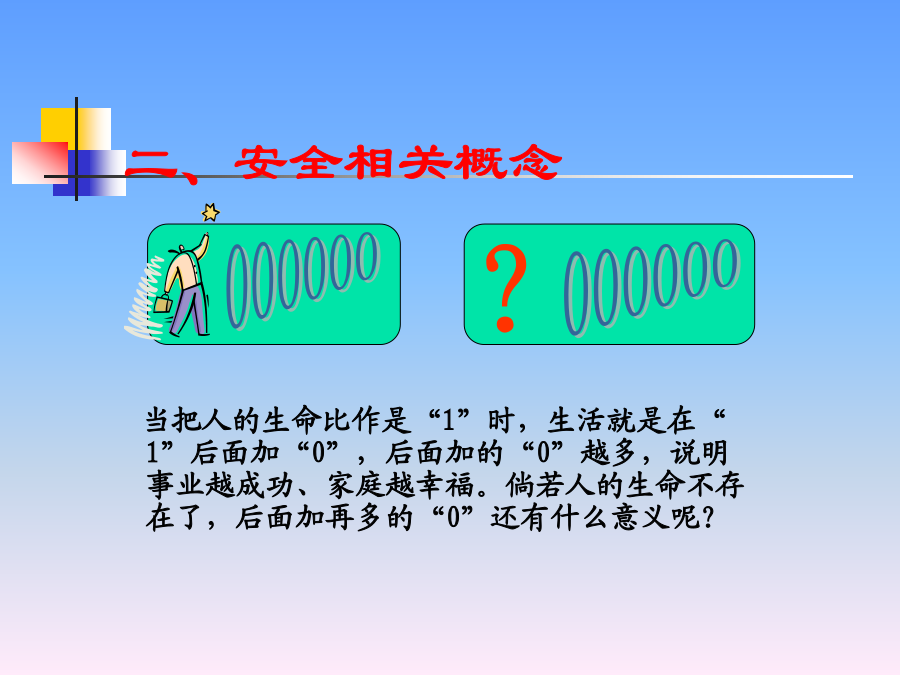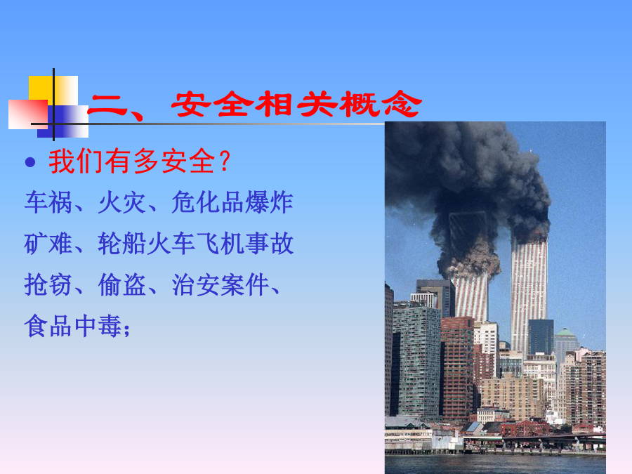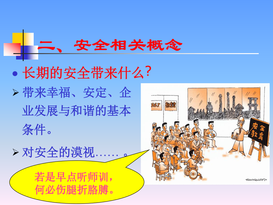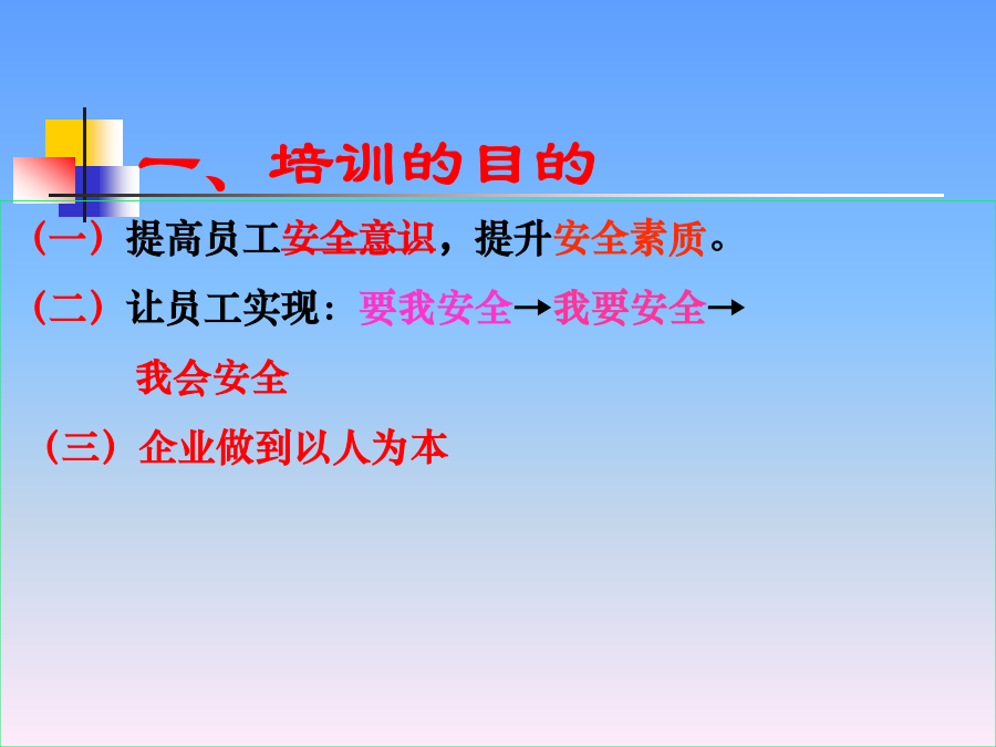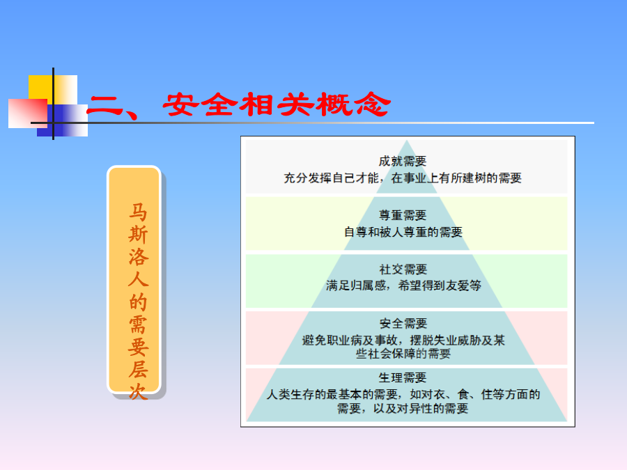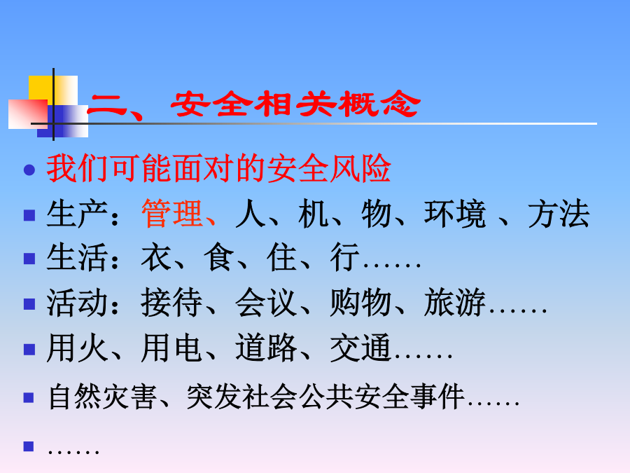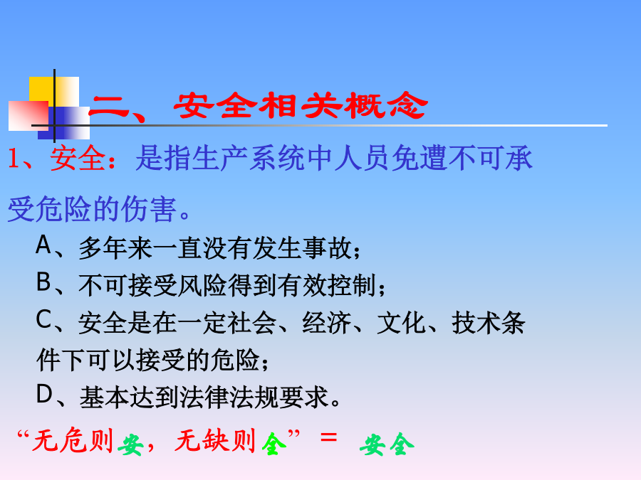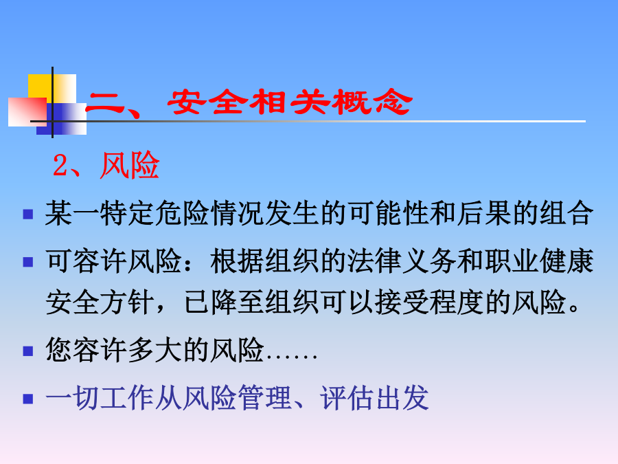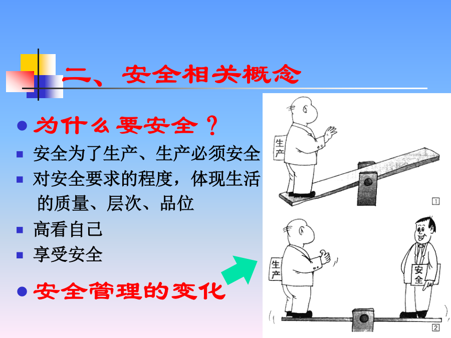 安全教育培训一、培训的目的二、安全相关概念二、安全相关概念二、安全相关概念二、安全相关概念二、安全相关概念二、安全相关概念二、安全相关概念二、安全相关概念二、安全相关概念选择风险控制措施时的优先顺序二、安全相关概念二、安全相关概念20三、安全生产事故案例四、安全生产管理一、事故频发倾向理论:指个别容易发生事故的稳定的个人内在倾向。事故频发者的存在是工业事故发生的主要原因,即少数具有事故频发倾向的工人是事故频发倾向者,他们的存在是工业事故发生的原因。五、安全生产管理理论海因里希理论认为人的不安全行为和物的不安全状态是导致事故的直接原因,把事故的责任归因于人的缺点。三、博德(F.BIRD)事故因果理论:博德在海因里希事故因果理论的基础上,提出了安全管理是事故因果连锁中一个最重要的因素。四、能量失控释放理论:吉布森、哈登提出了解释事故发生物理本质的能量意外释放论。调查伤亡事故原因发现,大多数伤亡事故都是因为过量的能量,或干扰人体与外界正常能量交换的危险物质的意外释放引起的,并且这种过量能量或危险物质的释放都是由于人的不安全行为或物的不安全状态造成。这种理论指出任何造成伤害或损失的事故都是由能量传递失控引起的。人在生产活动中,是通过人体本身的作业活动,以能量传递与转换来完成的。机器设备等在生产过程中,也是通过能量传递的形式来达到其作业目的。当人的活动行为处于非正常状态是,人体作业活动和能量转换失去控制,人体就会与具有能量的设备发生接触或碰撞,以致遭到打击而被伤害。当机器、设备非正常运行时,会使其能量传递产生能量逸散,这种能量逸散去一定的控制时,就会释放出非正常能量传递,致使设备遭破坏和人身伤害。运用这种模式,在安全管理和事故预防中,应以防止人和物的能量逸散失控为核心。控制不安全行为引起的人操作活动中的能量失控,即控制人的不安全行为,实行标准化作业等。控制机器设备的能量传递转换失控,要改进机器装置的性能,对逸散能量采取措施,加以利用,避免其转换为伤害为伤害或损失。系统安全理论:系统中存在的危险源是事故发生的根本原因,防止事故发生就是消除控制系统中的危险源。第一类危险源:系统中存在的危险存在的、可能发生意外释放的能量或危险物质。第二类危险源:导致约束、限制能量措施失效或破坏的各种不安全因素。危险源与事故:第一类危险源的存在是事故发生的前提。第二类危险源的出现是第一类危险源导致事故的必要条件。一、安全生产管理主要内容:安全生产方针,安全生产责任制与目标管理。组织保障:机构和人员保障。安全生产投入与安全技术措施计划。安全教育培训。建设项目“三同时”安全检查。劳动防护用品管理。系统安全评价。危险源辨识与监控。职业危害与职业病管理。事故应急救援。事故的调查与处理。统计分析。OSH、ESH体系。二、80/20法则:20%的人口拥有80%财富。在因和果,努力和收获之间,普遍存在着不平衡关系,典型的情况是:80%的收获来自20%的努力;其他80%的努力只带来20%的结果。在投入与产出,努力与收获,原因与结果之间,普遍存在着不平衡关系,关键的少数,往往是决定整个组织的效率、产出、盈亏和成败的主要因素。80/20法则给我们的启示:专注于真正重要的20%的事件:“人的不安全行为、物的不安全状态、环境因素”三、人的不安全行为主要表现在生产作业和日常工作中出现的盲目性违章、盲从性违章、无知性违章、习惯性违章、管理性违章。即:事故与违章的关系违章不一定出事(故),出事(故)必是违章。“十次工伤,九次违章”。违章是发生事故的起因,事故是违章导致的后果。根据对全国每年近百万起事故原因进行的分析证明,95%以上是由于违章而导致的。化工企业各类事故伤亡原因分析,违章指挥和违章作业,在发生事故的原因中,约占60~70%。六、安全生产管理主要内容、原则、方法二、内容1.不认真按照安全生产责任制有关本职工作规定履行职责,不按“五同时”规定执行。对安全生产不负责任,官僚主义,玩忽职守,瞎指挥。2.不按安全教育规定对新工人、复工工人、换岗工人进行教育;对从事特种作业的工人(如机动车辆、锅炉、压力容器、电气、焊接、起重、爆破等)不进行专业培训和考核发证:在采用新工艺、新技术、新设备、新材料生产时,操作者未经学习教育;节假日加班不进行安全教育等。3.不按要求及时批转、传达贯彻上级有关安全生产方面的文件、规定、通知等,或借故拖廷、积压、拒不执行者。4.新建、改建、扩建、挖潜革新项目,不执行“三同时”的规定,不履行审批手续;不按有关规定要求设计施工,乱改乱建:不经竣工验收、擅自决定投入使用。5.对安技部门已发出停止使用通知单的设施,未消除隐患,擅自安排使用。6.劳动纪律