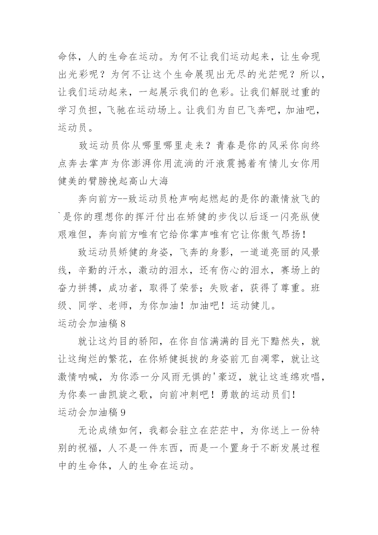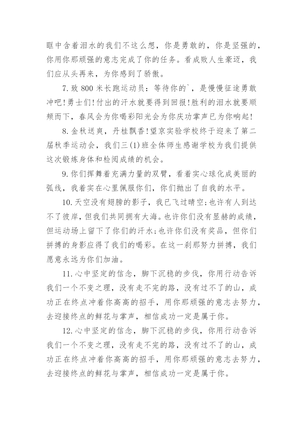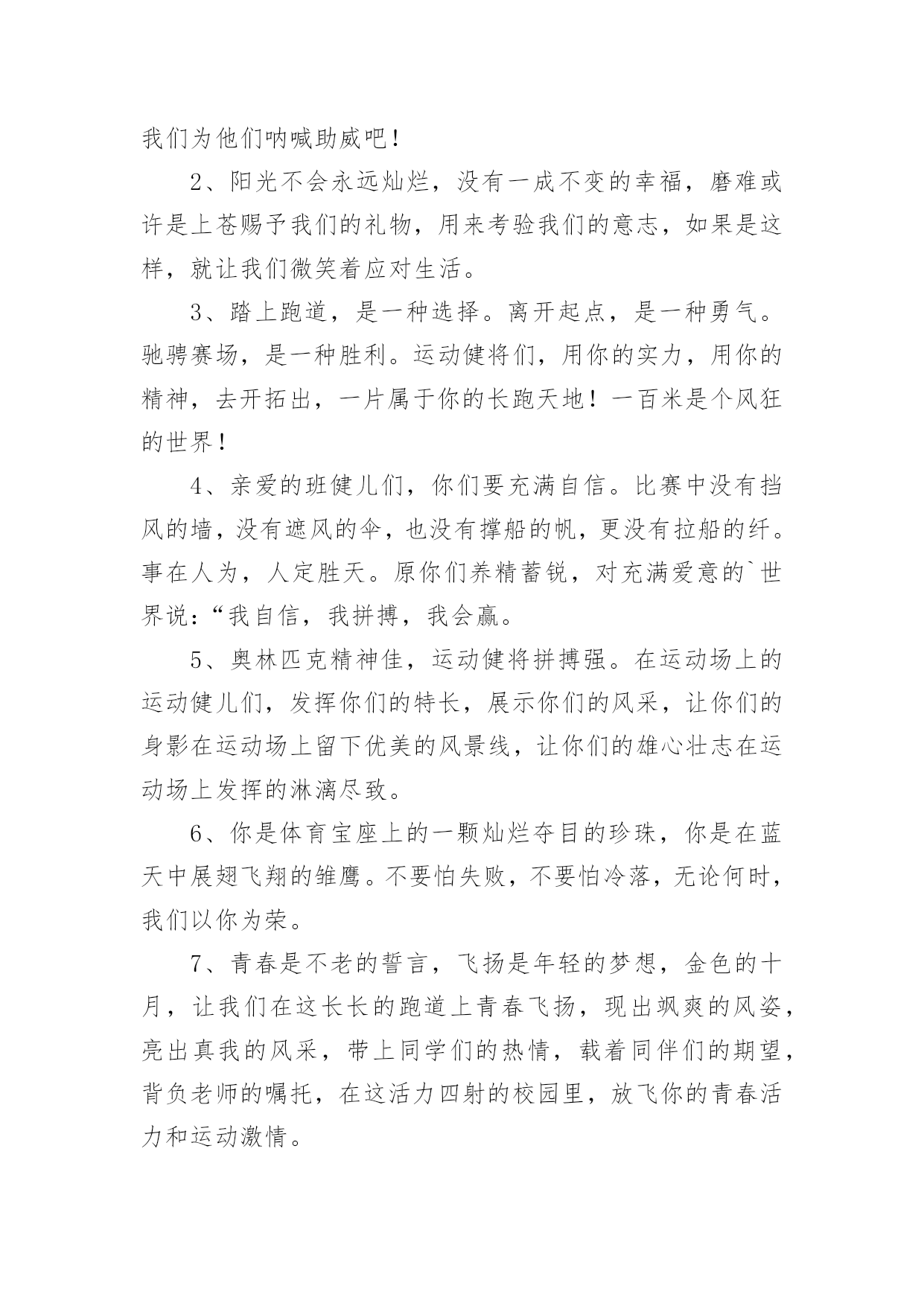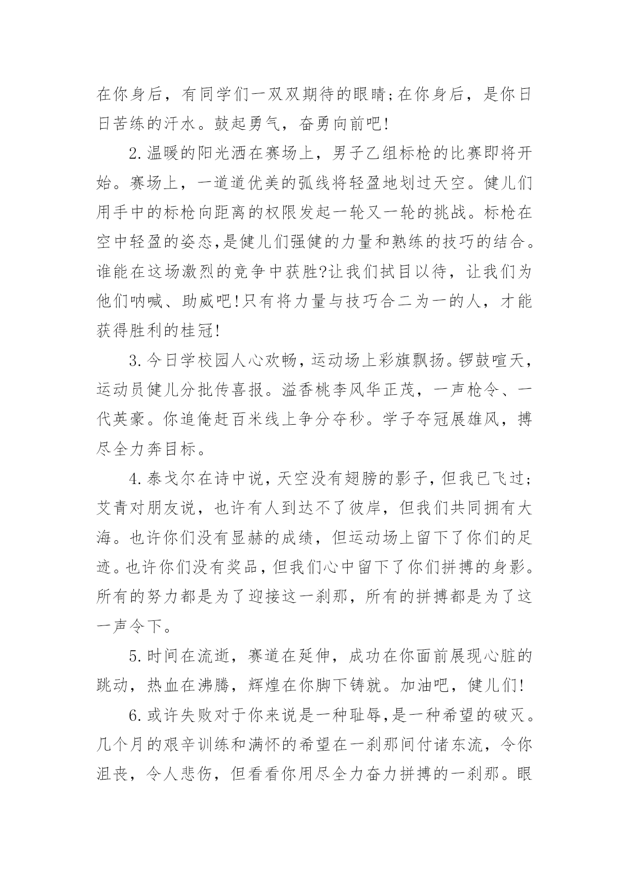 运动会加油稿运动会加油稿在充满活力,日益开放的今天,我们可以使用加油稿的机会越来越多,借助加油稿可以活跃气氛,催人奋进。相信很多朋友都对写加油稿感到非常苦恼吧,下面是小编收集整理的运动会加油稿,仅供参考,大家一起来看看吧。运动会加油稿1观众席上掌声雷动,热热烈烈划破长空,他们的灵魂在叫,血在烧,都是渴望有无限的希望,掌声响起来为新的力量喝彩,掌声响起来,每一棵都精彩。晨风轻轻地唤醒骄阳,校园的操场传来发令枪的声响,彩旗与呐喊声一起在飘荡着,心和起点紧紧的相连,用青春和热血来铺洒白色的`跑道,用激情点燃胜利的曙光!赛场上,无数飞扬的红色生命,无数威武的骑手,映动着一个个跃动的生命。因为有你,初冬的阳光撮成煦暖;因为有你,终点的线条色彩斑斓;因为有你,掌声才显出非凡意义。年轻的心,蓬勃的心,向上的心,酝酿着梦幻,滋润着信念,喷发着志气,即使收效甚微,不愿放弃目标,即使落伍,不愿停止前进的步伐,为了昨天的汗水,去实现今天的辉煌。是的,我们能行,我们能赢,心中重复了无数次,是的,我们,能赢。因为我们富有生命的热情,必胜的信心;未来的挑战,必胜的坚定。向着辽阔大地大呼:我们一定赢!运动会加油稿21.致运动员400米的跑道上,你正在飞驰,面对如此遥远的路途,你也许腿脚发麻,你也许有些茫然。但你可知道,在你身后,有同学们一双双期待的眼睛;在你身后,是你日日苦练的汗水。鼓起勇气,奋勇向前吧!2.温暖的阳光洒在赛场上,男子乙组标枪的比赛即将开始。赛场上,一道道优美的弧线将轻盈地划过天空。健儿们用手中的标枪向距离的权限发起一轮又一轮的挑战。标枪在空中轻盈的姿态,是健儿们强健的力量和熟练的技巧的结合。谁能在这场激烈的竞争中获胜?让我们拭目以待,让我们为他们呐喊、助威吧!只有将力量与技巧合二为一的人,才能获得胜利的桂冠!3.今日学校园人心欢畅,运动场上彩旗飘扬。锣鼓喧天,运动员健儿分批传喜报。溢香桃李风华正茂,一声枪令、一代英豪。你追俺赶百米线上争分夺秒。学子夺冠展雄风,搏尽全力奔目标。4.泰戈尔在诗中说,天空没有翅膀的影子,但我已飞过;艾青对朋友说,也许有人到达不了彼岸,但我们共同拥有大海。也许你们没有显赫的成绩,但运动场上留下了你们的足迹。也许你们没有奖品,但我们心中留下了你们拼搏的身影。所有的努力都是为了迎接这一刹那,所有的拼搏都是为了这一声令下。5.时间在流逝,赛道在延伸,成功在你面前展现心脏的跳动,热血在沸腾,辉煌在你脚下铸就。加油吧,健儿们!6.或许失败对于你来说是一种耻辱,是一种希望的破灭。几个月的艰辛训练和满怀的希望在一刹那间付诸东流,令你沮丧,令人悲伤,但看看你用尽全力奋力拼搏的一刹那。眼眶中含着泪水的我们不这么想,你是勇敢的,你是坚强的,你用你那顽强的意志完成了你的任务。看成败人生豪迈,我们应从头再来,为你感到了骄傲。7.致800米长跑运动员:等待你的`,是慢慢征途勇敢冲吧!勇士们!付出的汗水就要得到回报!胜利的泪水就要顺颊而下,春风会为你喝彩阳光会为你庆功掌声已为你响起!8.金秋送爽,丹桂飘香!望京实验学校终于迎来了第二届秋季运动会,我们三(1)班全体师生感谢学校为我们提供这次锻炼身体和检阅成绩的机会。9.你们挥舞着充满力量的双臂,看着实心球化成美丽的弧线,我着实在心里佩服你们,你们抛出了自我的水平。10.天空没有翅膀的影子,我已飞过晴空;也许有人到达不了彼岸,但我们共同拥有大海。也许你们没有显赫的成绩,但运动场上留下了你们的汗水;也许你们没有奖品,但你们拼搏的身影应得了我们的喝彩。在这一刹那努力拼搏,我们愿意永远为你们加油。11.心中坚定的信念,脚下沉稳的步伐,你用行动告诉我们一个不变之理,没有走不完的路,没有过不了的山,成功正在终点冲着你高高的招手,用你那顽强的意志去努力,去迎接终点的鲜花与掌声,相信成功一定是属于你。12.心中坚定的信念,脚下沉稳的步伐,你用行动告诉我们一个不变之理,没有走不完的路,没有过不了的山,成功正在终点冲着你高高的招手,用你那顽强的意志去努力,去迎接终点的鲜花与掌声,相信成功一定是属于你。13.ibelieve,成功是一幅诱人的蓝图,滴滴汗珠,才能把它绘出;ibelieve,失败是一剂苦口良药,经历风雨,才能见到彩虹;ibelieve,命运不能将我们摆布,年轻的心永不服输,我们笑着面对挑战,笑着比赛,互相祝福!14.就像花儿准备了春、秋、冬,就是为了红透整个盛夏。就像雪花经历了春、夏、秋就是为了洁白整个严冬。蹲下,昂首,出发--轻轻的一抬脚,便牵动了全场的目光。潇洒的挥挥手,便满足了那一份无言的等待。迎着朝阳,你们踏歌而去,背着希望,我们等待你们的归来。15.当然,失败也是很现实的问题,成功的喜悦后也有失败的苦恼。但是,通往成功的道路不会是一帆风顺的,失败了,不要紧,要禁得起考验。“失败是成功之
