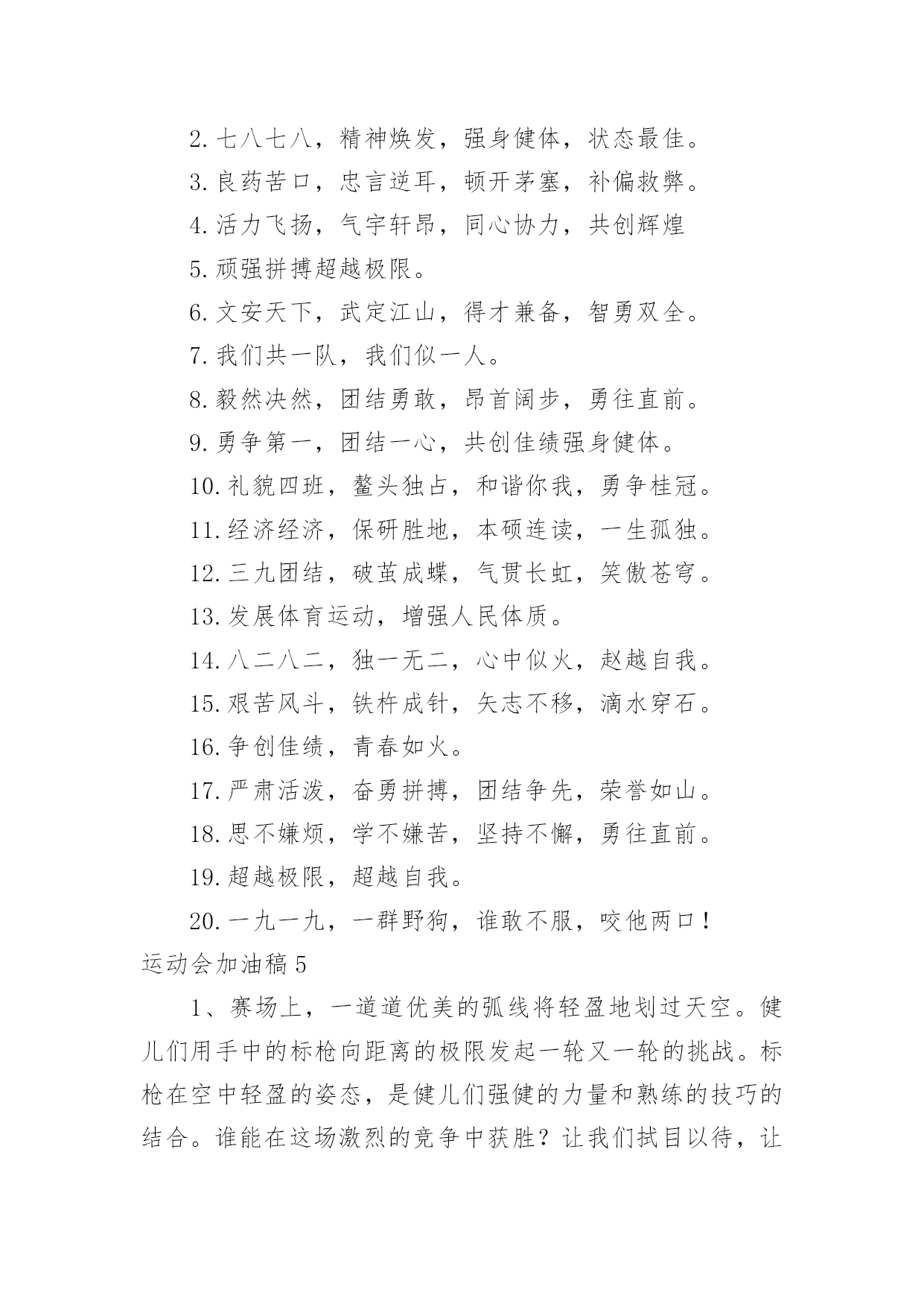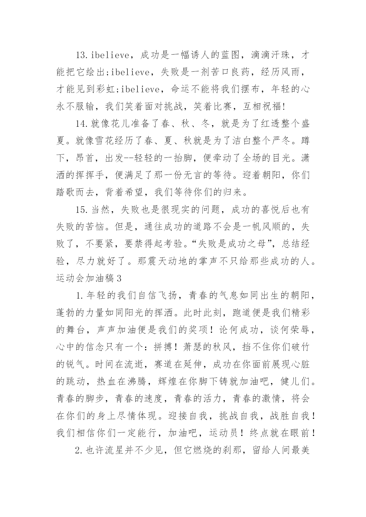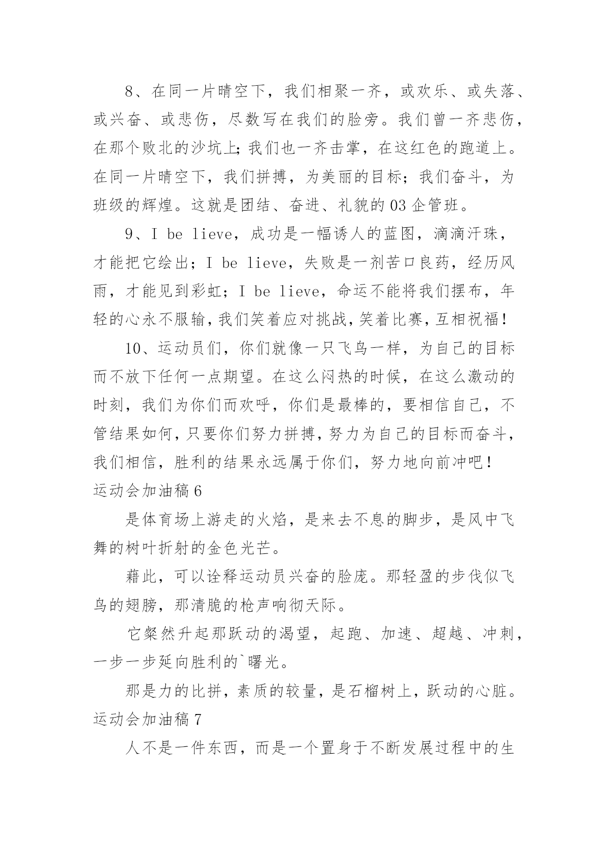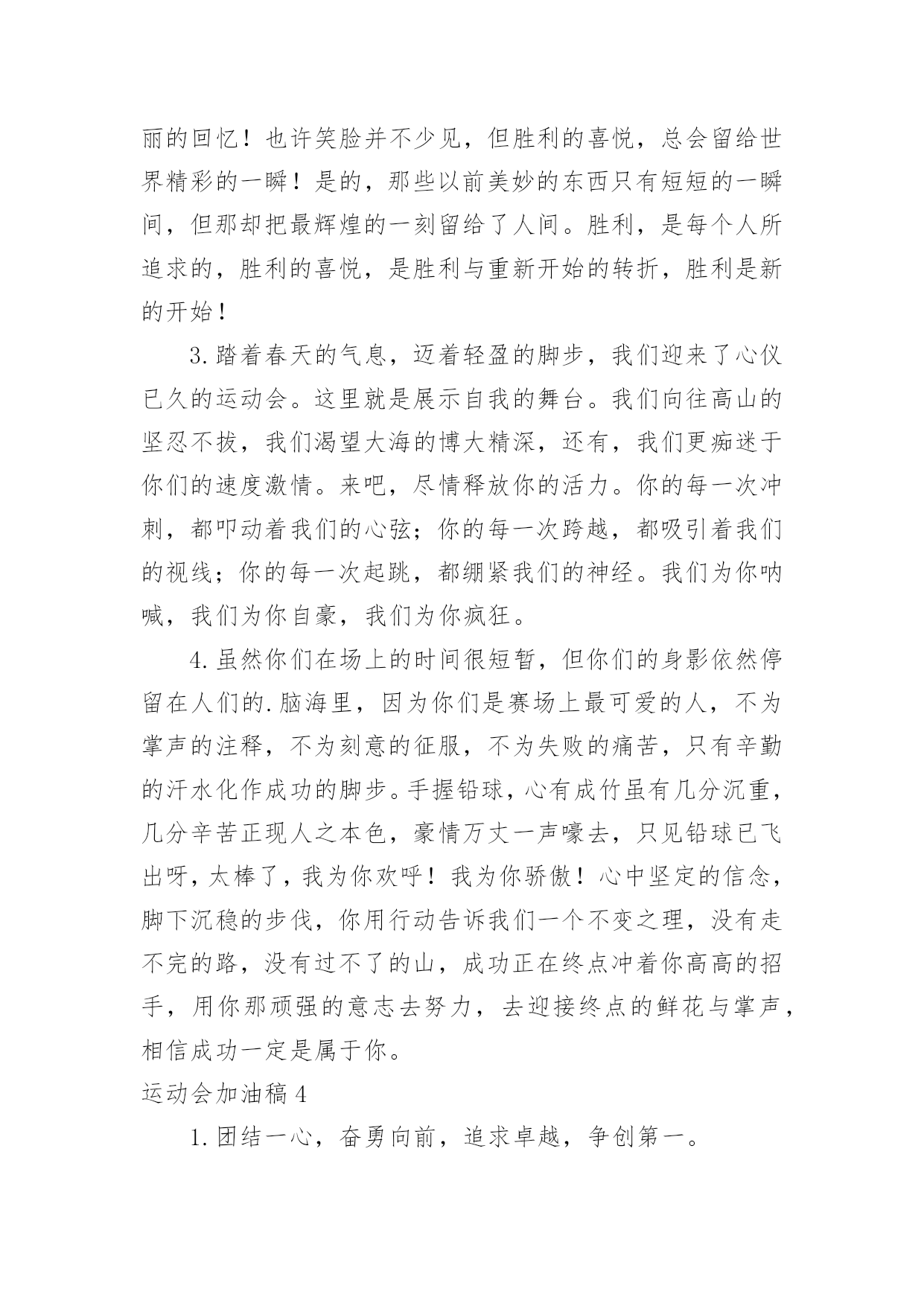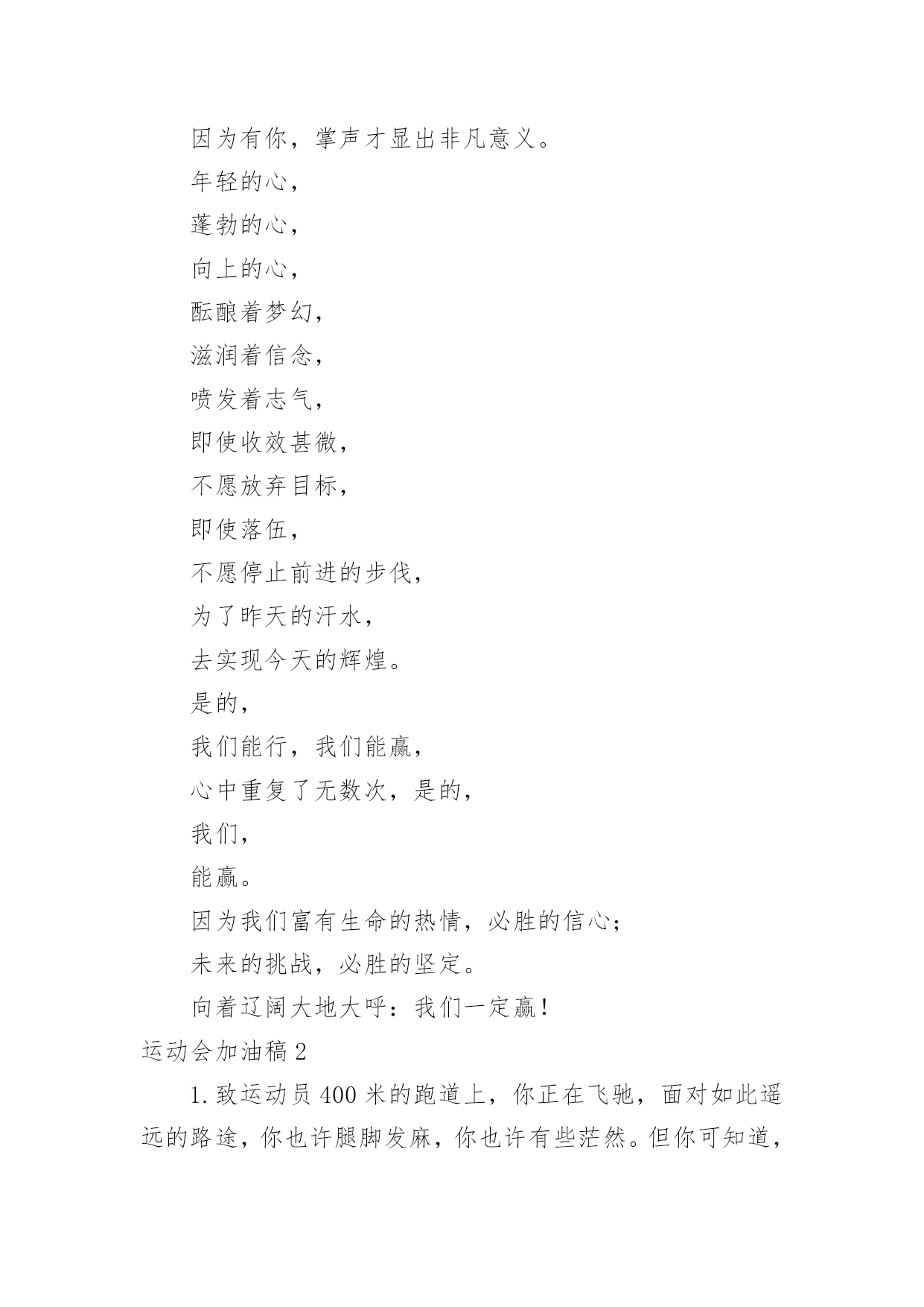 运动会加油稿运动会加油稿在充满活力,日益开放的今天,我们可以使用加油稿的机会越来越多,借助加油稿可以活跃气氛,催人奋进。相信很多朋友都对写加油稿感到非常苦恼吧,下面是小编收集整理的运动会加油稿,仅供参考,大家一起来看看吧。运动会加油稿1观众席上掌声雷动,热热烈烈划破长空,他们的灵魂在叫,血在烧,都是渴望有无限的希望,掌声响起来为新的力量喝彩,掌声响起来,每一棵都精彩。晨风轻轻地唤醒骄阳,校园的操场传来发令枪的声响,彩旗与呐喊声一起在飘荡着,心和起点紧紧的相连,用青春和热血来铺洒白色的`跑道,用激情点燃胜利的曙光!赛场上,无数飞扬的红色生命,无数威武的骑手,映动着一个个跃动的生命。因为有你,初冬的阳光撮成煦暖;因为有你,终点的线条色彩斑斓;因为有你,掌声才显出非凡意义。年轻的心,蓬勃的心,向上的心,酝酿着梦幻,滋润着信念,喷发着志气,即使收效甚微,不愿放弃目标,即使落伍,不愿停止前进的步伐,为了昨天的汗水,去实现今天的辉煌。是的,我们能行,我们能赢,心中重复了无数次,是的,我们,能赢。因为我们富有生命的热情,必胜的信心;未来的挑战,必胜的坚定。向着辽阔大地大呼:我们一定赢!运动会加油稿21.致运动员400米的跑道上,你正在飞驰,面对如此遥远的路途,你也许腿脚发麻,你也许有些茫然。但你可知道,在你身后,有同学们一双双期待的眼睛;在你身后,是你日日苦练的汗水。鼓起勇气,奋勇向前吧!2.温暖的阳光洒在赛场上,男子乙组标枪的比赛即将开始。赛场上,一道道优美的弧线将轻盈地划过天空。健儿们用手中的标枪向距离的权限发起一轮又一轮的挑战。标枪在空中轻盈的姿态,是健儿们强健的力量和熟练的技巧的结合。谁能在这场激烈的竞争中获胜?让我们拭目以待,让我们为他们呐喊、助威吧!只有将力量与技巧合二为一的人,才能获得胜利的桂冠!3.今日学校园人心欢畅,运动场上彩旗飘扬。锣鼓喧天,运动员健儿分批传喜报。溢香桃李风华正茂,一声枪令、一代英豪。你追俺赶百米线上争分夺秒。学子夺冠展雄风,搏尽全力奔目标。4.泰戈尔在诗中说,天空没有翅膀的影子,但我已飞过;艾青对朋友说,也许有人到达不了彼岸,但我们共同拥有大海。也许你们没有显赫的成绩,但运动场上留下了你们的足迹。也许你们没有奖品,但我们心中留下了你们拼搏的身影。所有的努力都是为了迎接这一刹那,所有的拼搏都是为了这一声令下。5.时间在流逝,赛道在延伸,成功在你面前展现心脏的跳动,热血在沸腾,辉煌在你脚下铸就。加油吧,健儿们!6.或许失败对于你来说是一种耻辱,是一种希望的破灭。几个月的艰辛训练和满怀的希望在一刹那间付诸东流,令你沮丧,令人悲伤,但看看你用尽全力奋力拼搏的一刹那。眼眶中含着泪水的我们不这么想,你是勇敢的,你是坚强的,你用你那顽强的意志完成了你的任务。看成败人生豪迈,我们应从头再来,为你感到了骄傲。7.致800米长跑运动员:等待你的`,是慢慢征途勇敢冲吧!勇士们!付出的汗水就要得到回报!胜利的泪水就要顺颊而下,春风会为你喝彩阳光会为你庆功掌声已为你响起!8.金秋送爽,丹桂飘香!望京实验学校终于迎来了第二届秋季运动会,我们三(1)班全体师生感谢学校为我们提供这次锻炼身体和检阅成绩的机会。9.你们挥舞着充满力量的双臂,看着实心球化成美丽的弧线,我着实在心里佩服你们,你们抛出了自我的水平。10.天空没有翅膀的影子,我已飞过晴空;也许有人到达不了彼岸,但我们共同拥有大海。也许你们没有显赫的成绩,但运动场上留下了你们的汗水;也许你们没有奖品,但你们拼搏的身影应得了我们的喝彩。在这一刹那努力拼搏,我们愿意永远为你们加油。11.心中坚定的信念,脚下沉稳的步伐,你用行动告诉我们一个不变之理,没有走不完的路,没有过不了的山,成功正在终点冲着你高高的招手,用你那顽强的意志去努力,去迎接终点的鲜花与掌声,相信成功一定是属于你。12.心中坚定的信念,脚下沉稳的步伐,你用行动告诉我们一个不变之理,没有走不完的路,没有过不了的山,成功正在终点冲着你高高的招手,用你那顽强的意志去努力,去迎接终点的鲜花与掌声,相信成功一定是属于你。13.ibelieve,成功是一幅诱人的蓝图,滴滴汗珠,才能把它绘出;ibelieve,失败是一剂苦口良药,经历风雨,才能见到彩虹;ibelieve,命运不能将我们摆布,年轻的心永不服输,我们笑着面对挑战,笑着比赛,互相祝福!14.就像花儿准备了春、秋、冬,就是为了红透整个盛夏。就像雪花经历了春、夏、秋就是为了洁白整个严冬。蹲下,昂首,出发--轻轻的一抬脚,便牵动了全场的目光。潇洒的挥挥手,便满足了那一份无言的等待。迎着朝阳,你们踏歌而去,背着希望,我们等待你们的归来。15.当然,失败也是很现实的问题,成功的喜悦后也有失败的苦恼。但是,通往成功的道路不会是一帆风顺的,失败了,不要紧,要禁得起考验。“失败是成功之