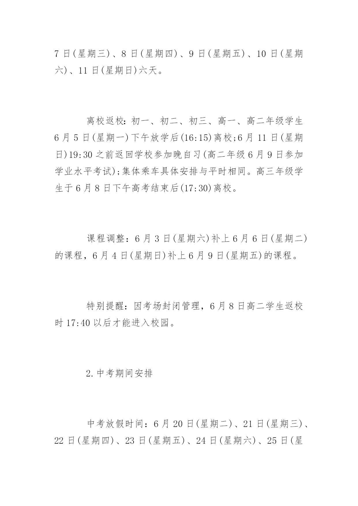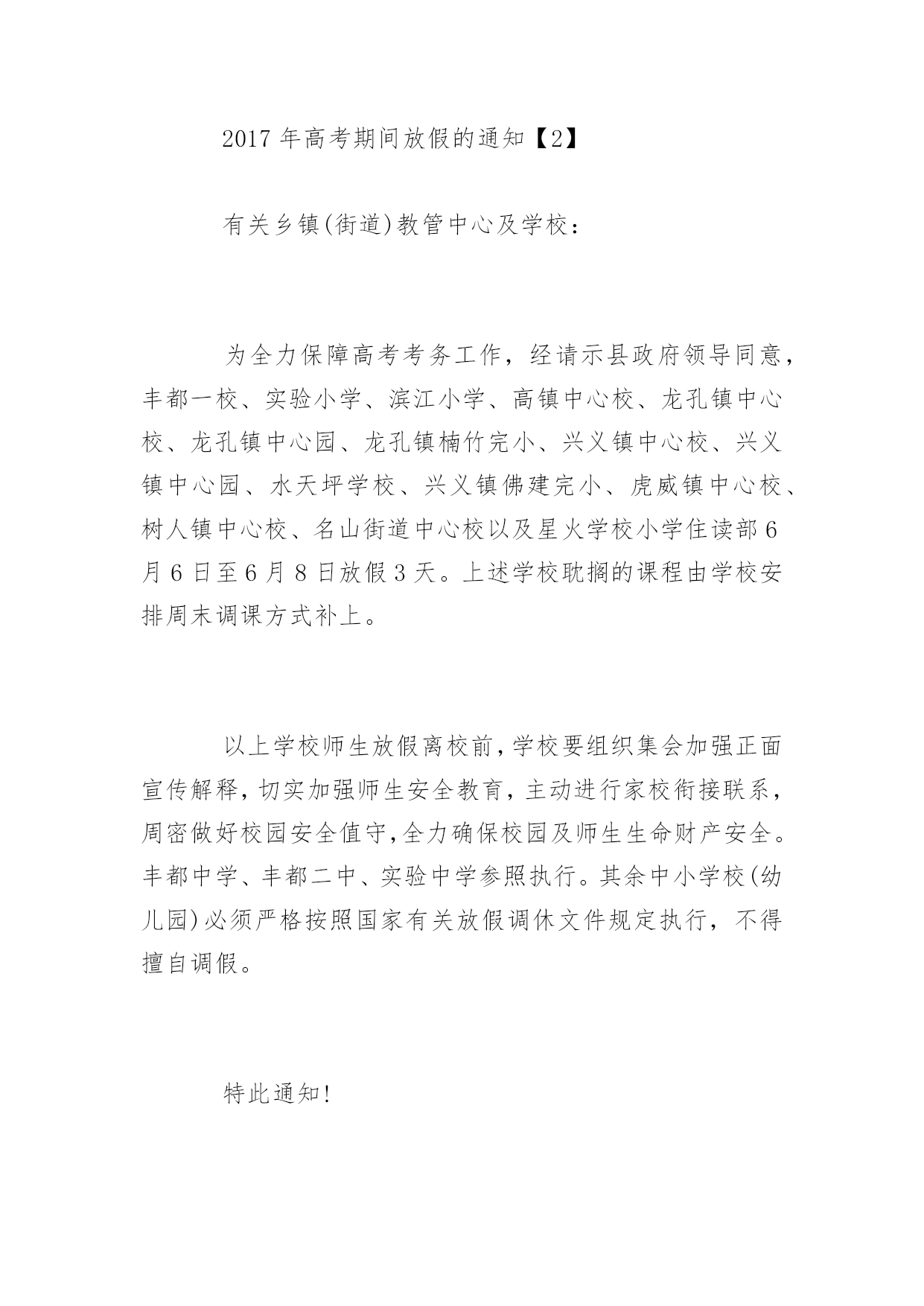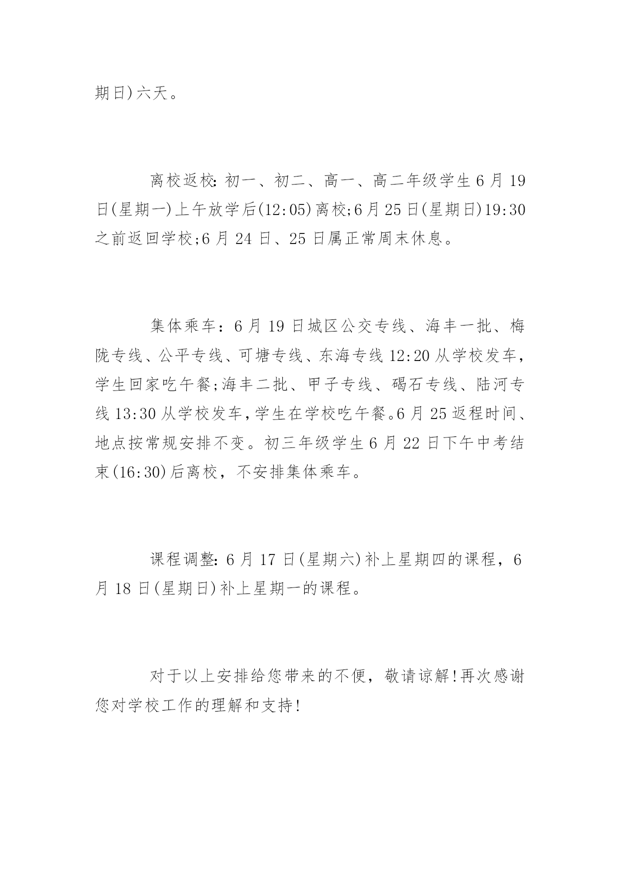 高考期间放假的通知2017年高考期间放假的通知2017年全国普通高校招生考试将于6月7日、8日举行。下面语文迷网整理了相关放假通知,希望对你有帮助。2017年高考期间放假的通知【1】尊敬的家长:根据国务院办公厅有关通知精神,结合我校为国家高考定点考场和汕尾市中考考场的实际,现将2017年高考、中考放假和调休的有关事项通知如下。请您按时做好孩子的.接送工作,高度重视假期安全,指导孩子合理安排假期的学习和生活。1.高考期间安排高考和学业水平考试放假时间:6月6日(星期二)、7日(星期三)、8日(星期四)、9日(星期五)、10日(星期六)、11日(星期日)六天。离校返校:初一、初二、初三、高一、高二年级学生6月5日(星期一)下午放学后(16:15)离校;6月11日(星期日)19:30之前返回学校参加晚自习(高二年级6月9日参加学业水平考试);集体乘车具体安排与平时相同。高三年级学生于6月8日下午高考结束后(17:30)离校。课程调整:6月3日(星期六)补上6月6日(星期二)的课程,6月4日(星期日)补上6月9日(星期五)的课程。特别提醒:因考场封闭管理,6月8日高二学生返校时17:40以后才能进入校园。2.中考期间安排中考放假时间:6月20日(星期二)、21日(星期三)、22日(星期四)、23日(星期五)、24日(星期六)、25日(星期日)六天。离校返校:初一、初二、高一、高二年级学生6月19日(星期一)上午放学后(12:05)离校;6月25日(星期日)19:30之前返回学校;6月24日、25日属正常周末休息。集体乘车:6月19日城区公交专线、海丰一批、梅陇专线、公平专线、可塘专线、东海专线12:20从学校发车,学生回家吃午餐;海丰二批、甲子专线、碣石专线、陆河专线13:30从学校发车,学生在学校吃午餐。6月25返程时间、地点按常规安排不变。初三年级学生6月22日下午中考结束(16:30)后离校,不安排集体乘车。课程调整:6月17日(星期六)补上星期四的课程,6月18日(星期日)补上星期一的课程。对于以上安排给您带来的不便,敬请谅解!再次感谢您对学校工作的理解和支持!2017年高考期间放假的通知【2】有关乡镇(街道)教管中心及学校:为全力保障高考考务工作,经请示县政府领导同意,丰都一校、实验小学、滨江小学、高镇中心校、龙孔镇中心校、龙孔镇中心园、龙孔镇楠竹完小、兴义镇中心校、兴义镇中心园、水天坪学校、兴义镇佛建完小、虎威镇中心校、树人镇中心校、名山街道中心校以及星火学校小学住读部6月6日至6月8日放假3天。上述学校耽搁的课程由学校安排周末调课方式补上。以上学校师生放假离校前,学校要组织集会加强正面宣传解释,切实加强师生安全教育,主动进行家校衔接联系,周密做好校园安全值守,全力确保校园及师生生命财产安全。丰都中学、丰都二中、实验中学参照执行。其余中小学校(幼儿园)必须严格按照国家有关放假调休文件规定执行,不得擅自调假。特此通知!丰都县教育委员会丰都县教育委员会办公室2017年5月26日