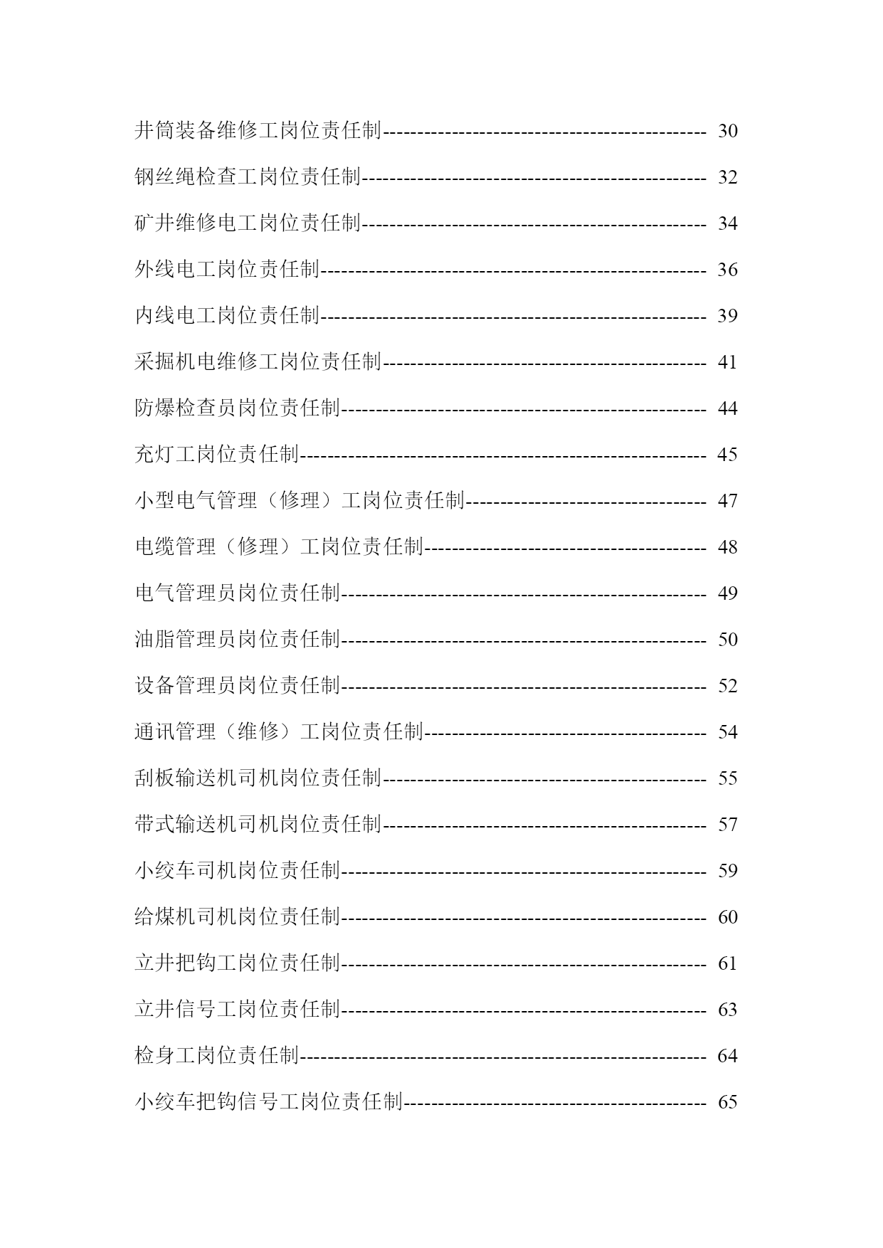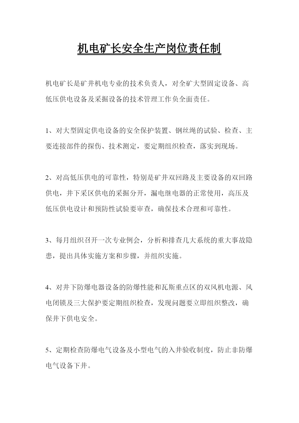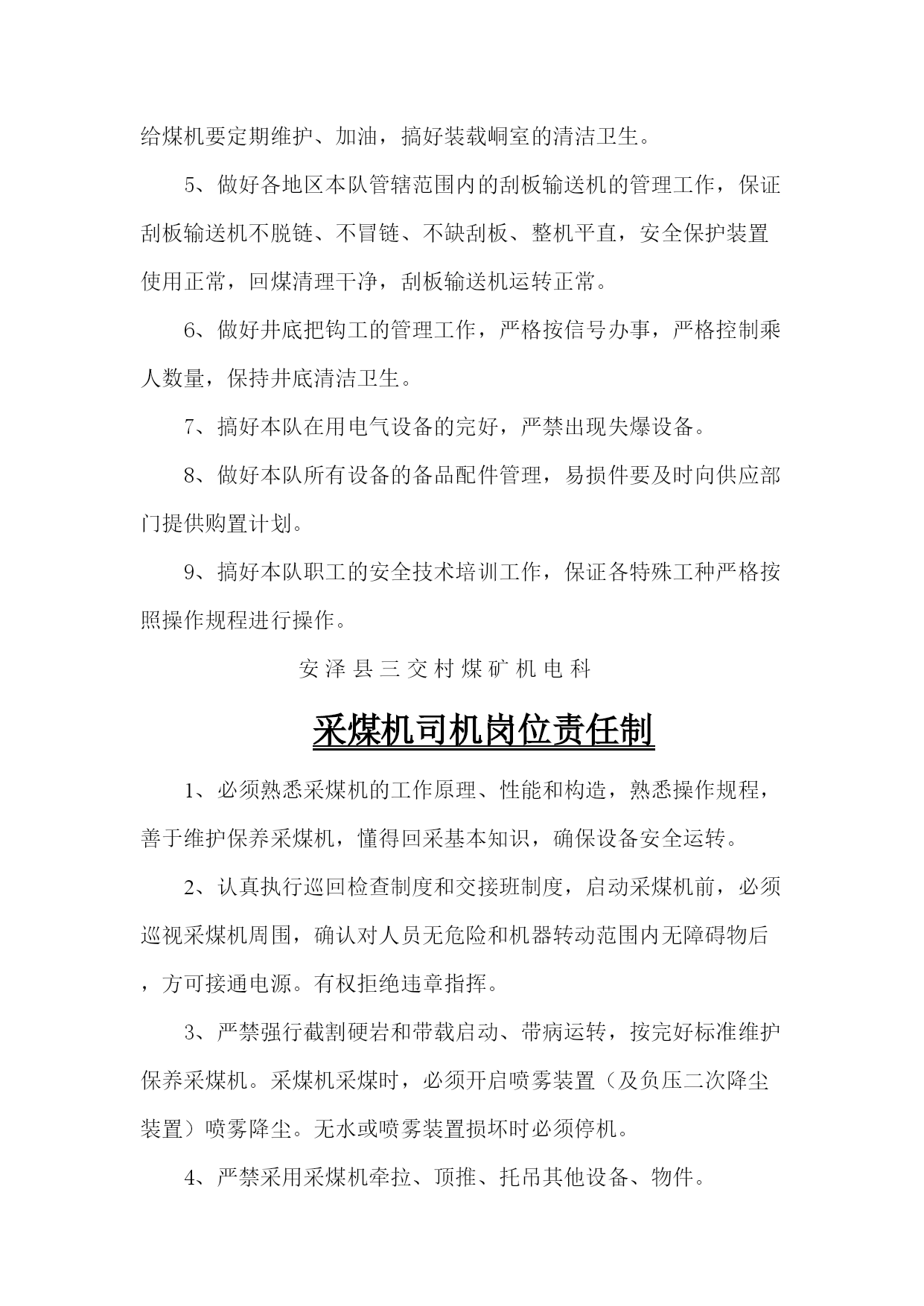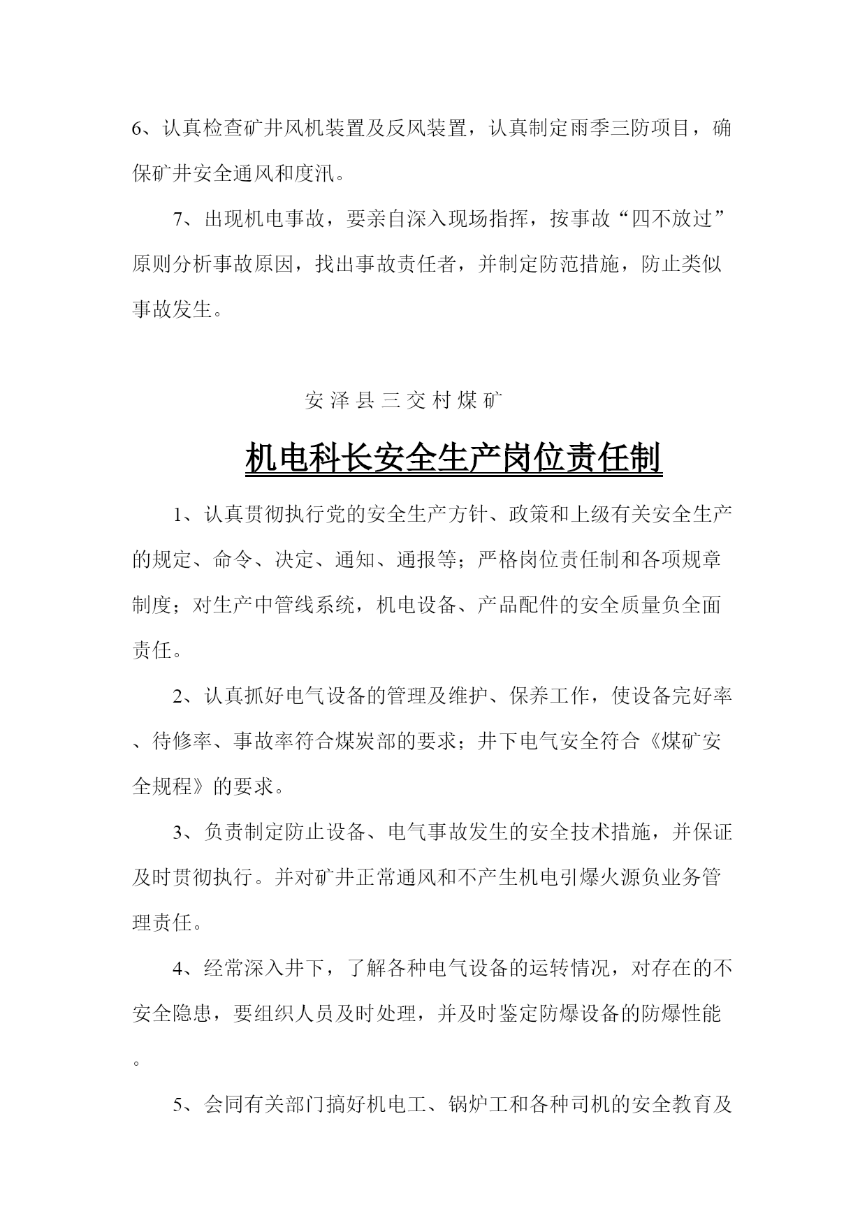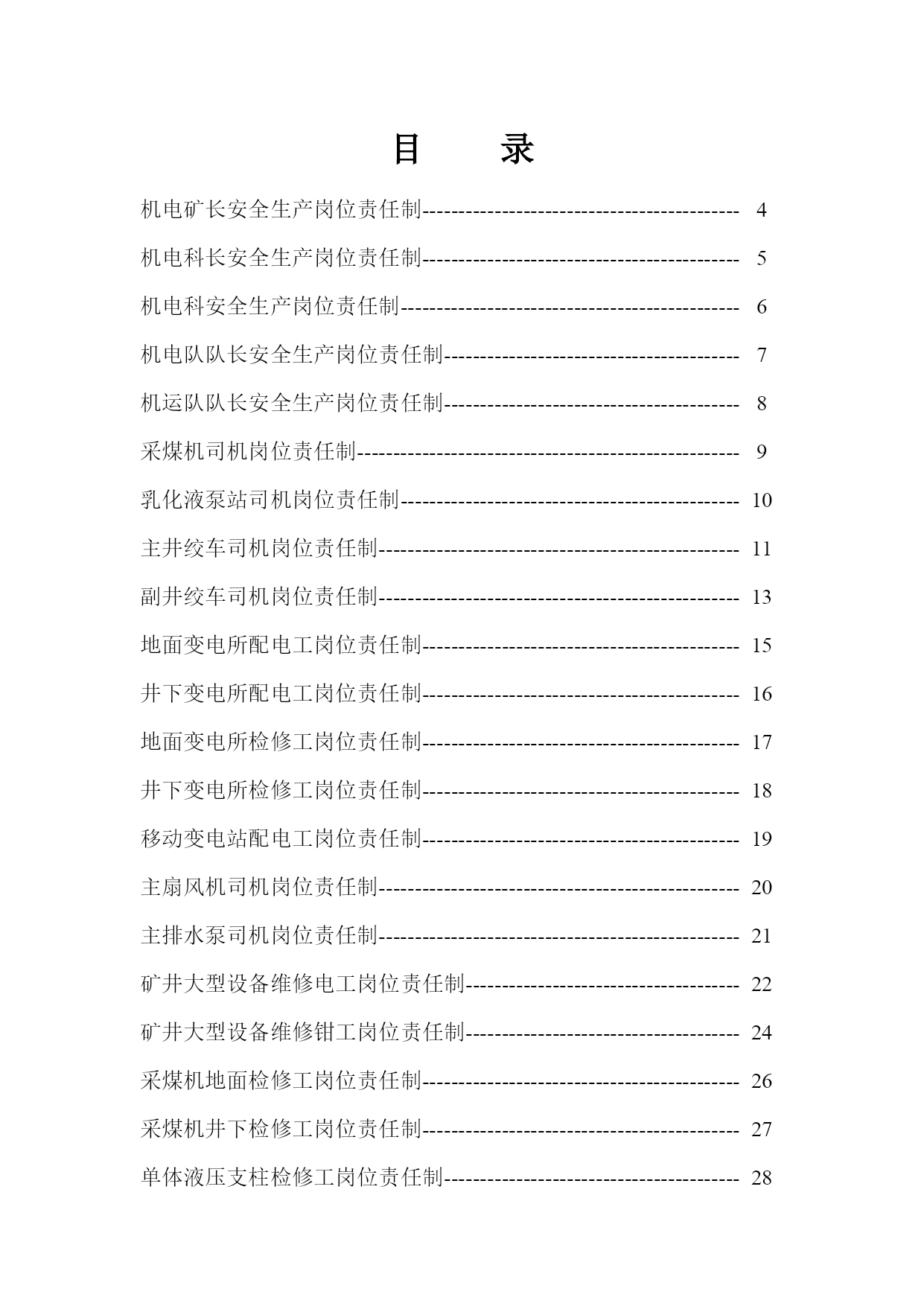 安全生产岗位责任制(机电运输部分)安泽县三交村煤矿目录机电矿长安全生产岗位责任制--------------------------------------------4机电科长安全生产岗位责任制--------------------------------------------5机电科安全生产岗位责任制-----------------------------------------------6机电队队长安全生产岗位责任制-----------------------------------------7机运队队长安全生产岗位责任制-----------------------------------------8采煤机司机岗位责任制-----------------------------------------------------9乳化液泵站司机岗位责任制-----------------------------------------------10主井绞车司机岗位责任制--------------------------------------------------11副井绞车司机岗位责任制--------------------------------------------------13地面变电所配电工岗位责任制--------------------------------------------15井下变电所配电工岗位责任制--------------------------------------------16地面变电所检修工岗位责任制--------------------------------------------17井下变电所检修工岗位责任制--------------------------------------------18移动变电站配电工岗位责任制--------------------------------------------19主扇风机司机岗位责任制--------------------------------------------------20主排水泵司机岗位责任制--------------------------------------------------21矿井大型设备维修电工岗位责任制--------------------------------------22矿井大型设备维修钳工岗位责任制--------------------------------------24采煤机地面检修工岗位责任制--------------------------------------------26采煤机井下检修工岗位责任制--------------------------------------------27单体液压支柱检修工岗位责任制-----------------------------------------28井筒装备维修工岗位责任制-----------------------------------------------30钢丝绳检查工岗位责任制--------------------------------------------------32矿井维修电工岗位责任制--------------------------------------------------34外线电工岗位责任制--------------------------------------------------------36内线电工岗位责任制--------------------------------------------------------39采掘机电维修工岗位责任制-----------------------------------------------41防爆检查员岗位责任制-----------------------------------------------------44充灯工岗位责任制-----------------------------------------------------------45小型电气管理(修理)工岗位责任制-----------------------------------47电缆管理(修理)工岗位责任制-----------------------------------------48电气管理员岗位责任制--------------------------------------