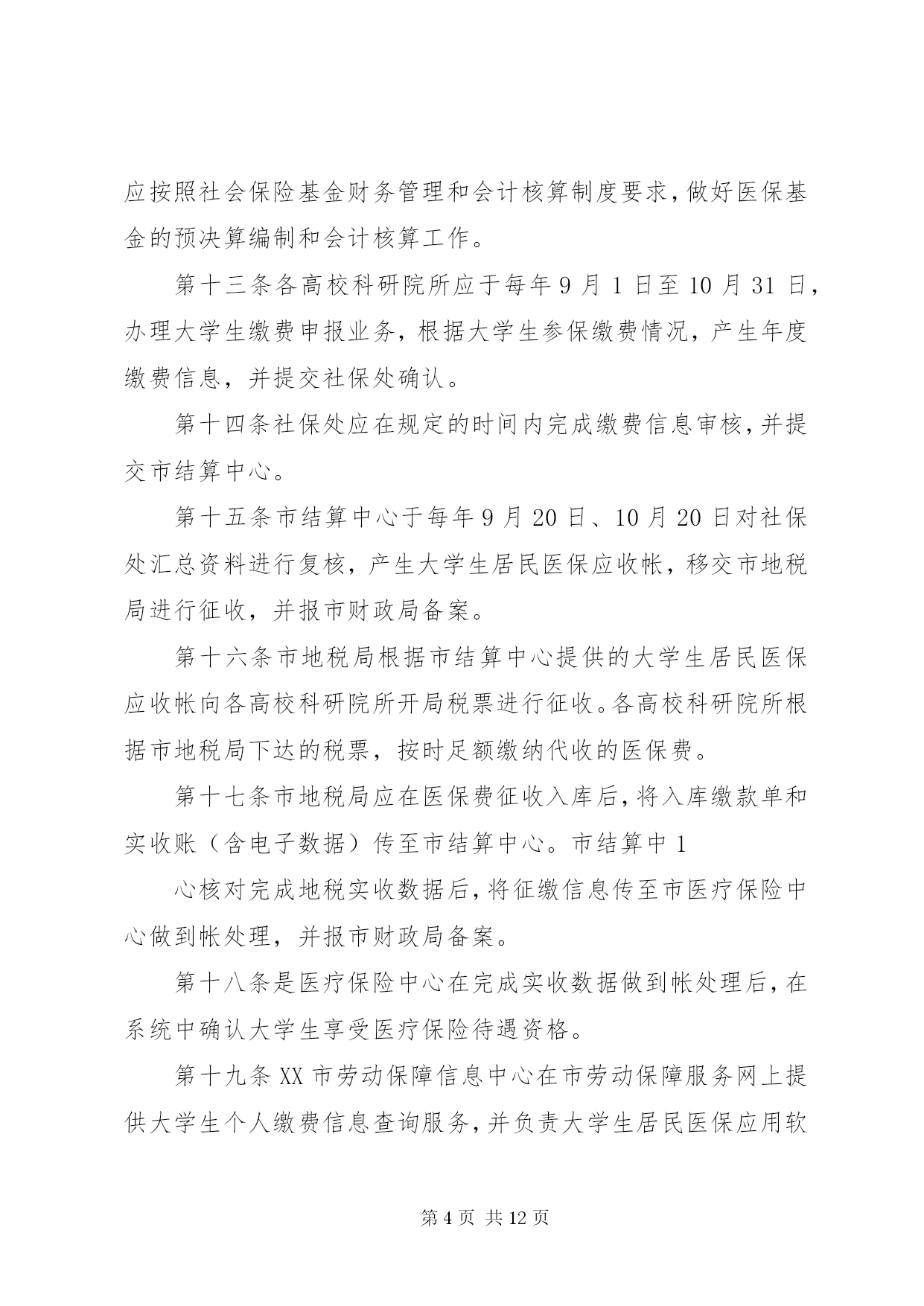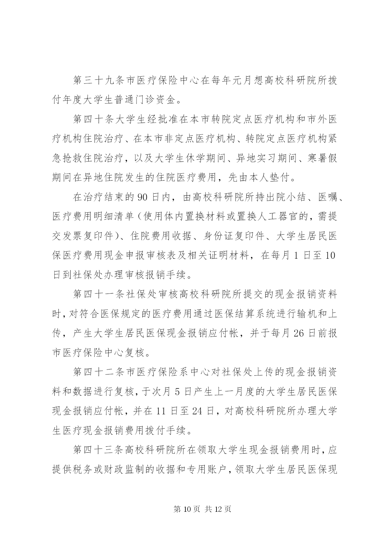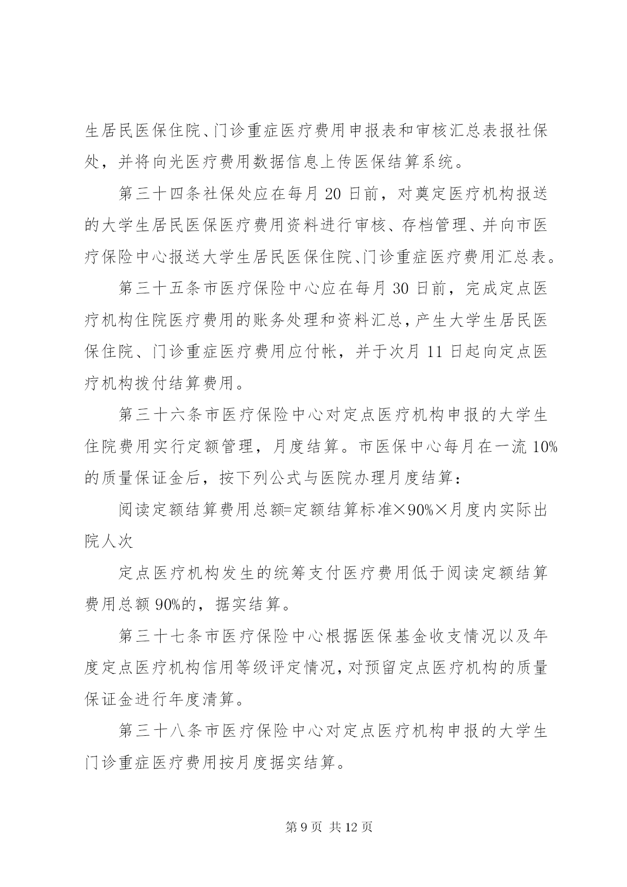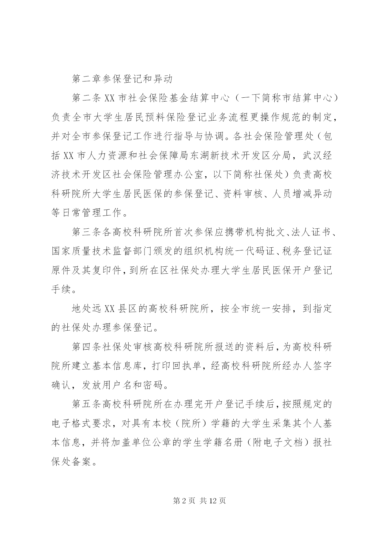 第PAGE\*Arabic\*MERGEFORMAT12页共NUMPAGES\*MERGEFORMAT12页中山基本医疗保险办法关于印发《武汉地区高等学校在校大学生参加城镇居民基本医疗保险业务操作办法》的通知各在汉高等学校、科研院所,各区劳动和社会保障部,各区财政局、各区地税局,各社保经办机构,各定点医疗机构:为推进在汉大学生参加城镇居民基本医疗保险工作,根据《武汉地区高等学校在校大学生参加城镇居民基本医疗保险实施细则》,制订了《武汉地区高等学校在校大学生参加城镇居民基本医疗保险业务操作办法》,现引发给你们,望遵照执行。武汉地区高等学校在校大学生参加城镇居民基本医疗保险业务操作办法为做好武汉地区高等学校在校大学生参加城镇居民基本医疗保险(以下简称大学生居民医保)工作,根据《武汉地区高等学校在校大学生参加城镇居民基本医疗保险实施细则》(武政规{2009}10号)规定,制定本办法。第一章参保范围和对象第一条本市行政区域内各类全日制普通高等学校(含民办高校,独立学院、分校、高等职业技术学院)及科研所(以下简称高校科研院所)中接受普通高等学历教育的全日制本专科学生、去全日制研究生(一下通称大学生)参加居民医保的相关业务办理第二章参保登记和异动第二条XX市社会保险基金结算中心(一下简称市结算中心)负责全市大学生居民预料保险登记业务流程更操作规范的制定,并对全市参保登记工作进行指导与协调。各社会保险管理处(包括XX市人力资源和社会保障局东湖新技术开发区分局,武汉经济技术开发区社会保险管理办公室,以下简称社保处)负责高校科研院所大学生居民医保的参保登记、资料审核、人员增减异动等日常管理工作。第三条各高校科研院所首次参保应携带机构批文、法人证书、国家质量技术监督部门颁发的组织机构统一代码证、税务登记证原件及其复印件,到所在区社保处办理大学生居民医保开户登记手续。地处远XX县区的高校科研院所,按全市统一安排,到指定的社保处办理参保登记。第四条社保处审核高校科研院所报送的资料后,为高校科研院所建立基本信息库,打印回执单,经高校科研院所经办人签字确认,发放用户名和密码。第五条高校科研院所在办理完开户登记手续后,按照规定的电子格式要求,对具有本校(院所)学籍的大学生采集其个人基本信息,并将加盖单位公章的学生学籍名册(附电子文档)报社保处备案。新生入学以及大学生转入时,各高校科研院所应及时报送学籍名册。第六条各高校科研院所通过大学生居民医保网上服务系统,为本校大学生办理参保登记手续。第七条各高校科研院所在每年6月底前对当年毕业大学生在网上集中办理停保手续。对转学、退学、出国(境)的大学生,各高校科研院所应及时持相关资料到社保处办理停保确认手续。第三章费用核定和征缴第八条大学生姓名、性别、身份证号等信息需要变更的,由所在高校科研院所统一到社保处办理定证手续;其他信息变更,有高校科研院所在大学生居民医保业务系统中自行订正。第九条大学生居民医保筹资水平为每人每年120元,实行个人缴费和政府补助相结合。大学生个人每人每年缴费20元,政府每人每年补助100元。第十条市地税局负责大学生居民医疗保险费(以下简称医保费)的征收工作。大学生居民医保费纳入市财政局开设的社保基金专户管理。第十一条各高校科研院所负责代收代缴参保大学生的医保费,并出具地税部门统一印制的专用凭证,其中,低保和重度残疾大学生的医保费由高校科研院所给予补助并代缴。第十二条XX市医疗保险中心(以下简称市医疗保险中心)应按照社会保险基金财务管理和会计核算制度要求,做好医保基金的预决算编制和会计核算工作。第十三条各高校科研院所应于每年9月1日至10月31日,办理大学生缴费申报业务,根据大学生参保缴费情况,产生年度缴费信息,并提交社保处确认。第十四条社保处应在规定的时间内完成缴费信息审核,并提交市结算中心。第十五条市结算中心于每年9月20日、10月20日对社保处汇总资料进行复核,产生大学生居民医保应收帐,移交市地税局进行征收,并报市财政局备案。第十六条市地税局根据市结算中心提供的大学生居民医保应收帐向各高校科研院所开局税票进行征收。各高校科研院所根据市地税局下达的税票,按时足额缴纳代收的医保费。第十七条市地税局应在医保费征收入库后,将入库缴款单和实收账(含电子数据)传至市结算中心。市结算中1心核对完成地税实收数据后,将征缴信息传至市医疗保险中心做到帐处理,并报市财政局备案。第十八条是医疗保险中心在完成实收数据做到帐处理后,在系统中确认大学生享受医疗保险待遇资格。第十九条XX市劳动保障信息中心在市劳动保障服务网上提供大学生个人缴费信息查询服务,并负责大学生居民医保应用软件开发、网络和系统的日常维护等工作。第四章保险待遇和就医管理第二十条大学生居民医保的保险年度为参保当年的9月1日至次