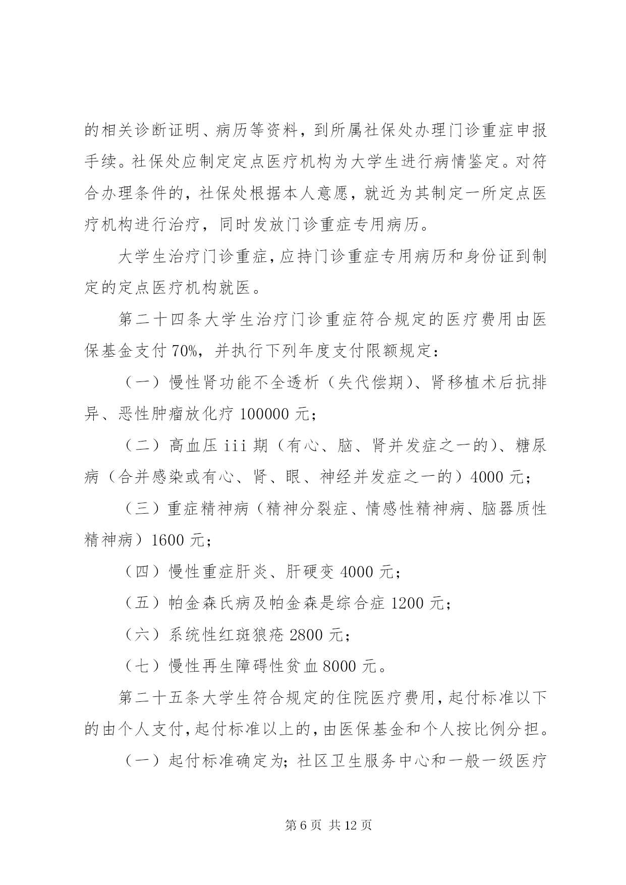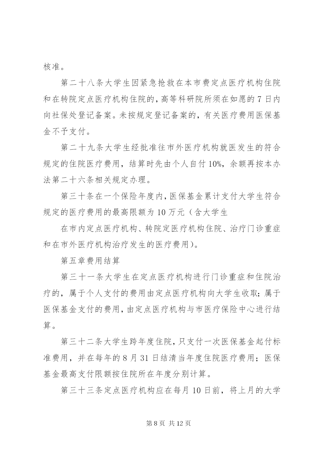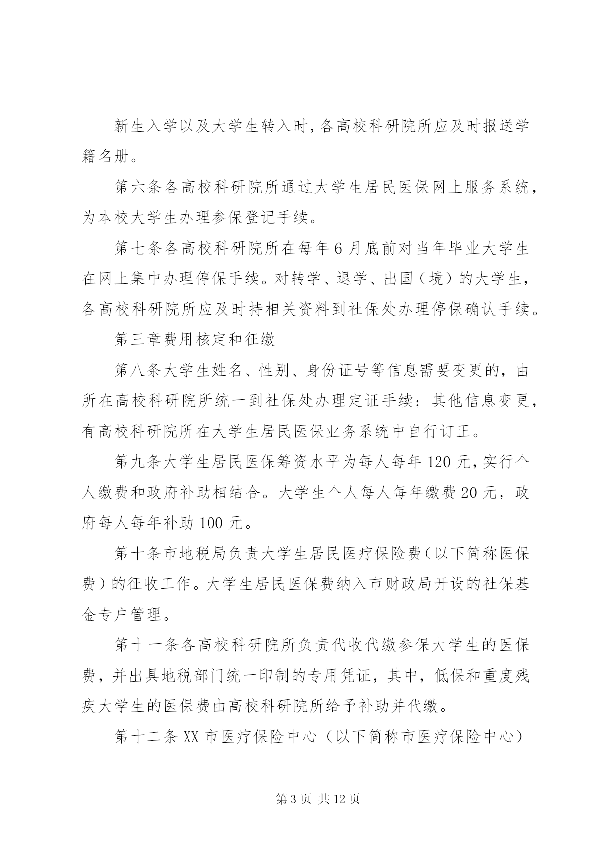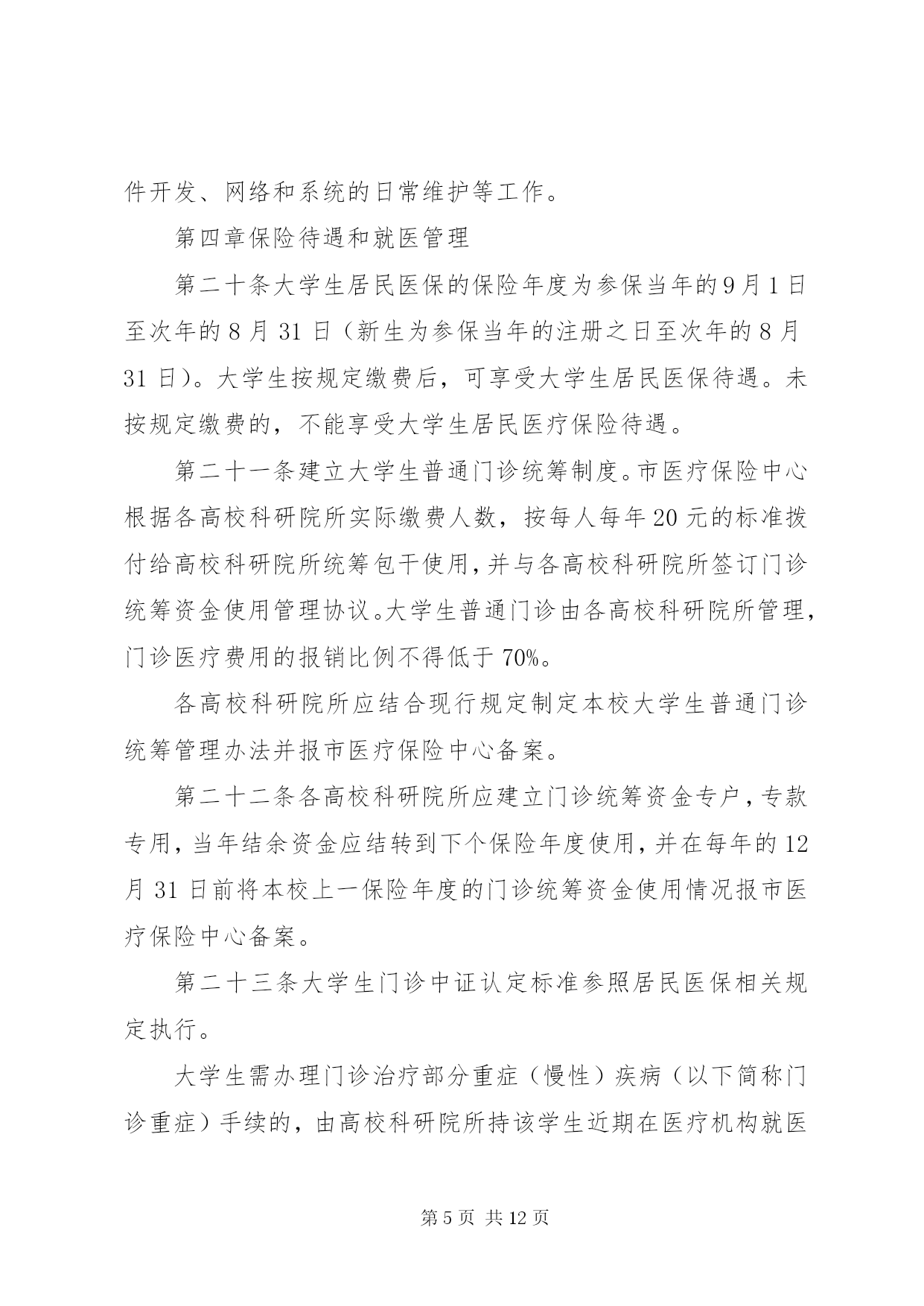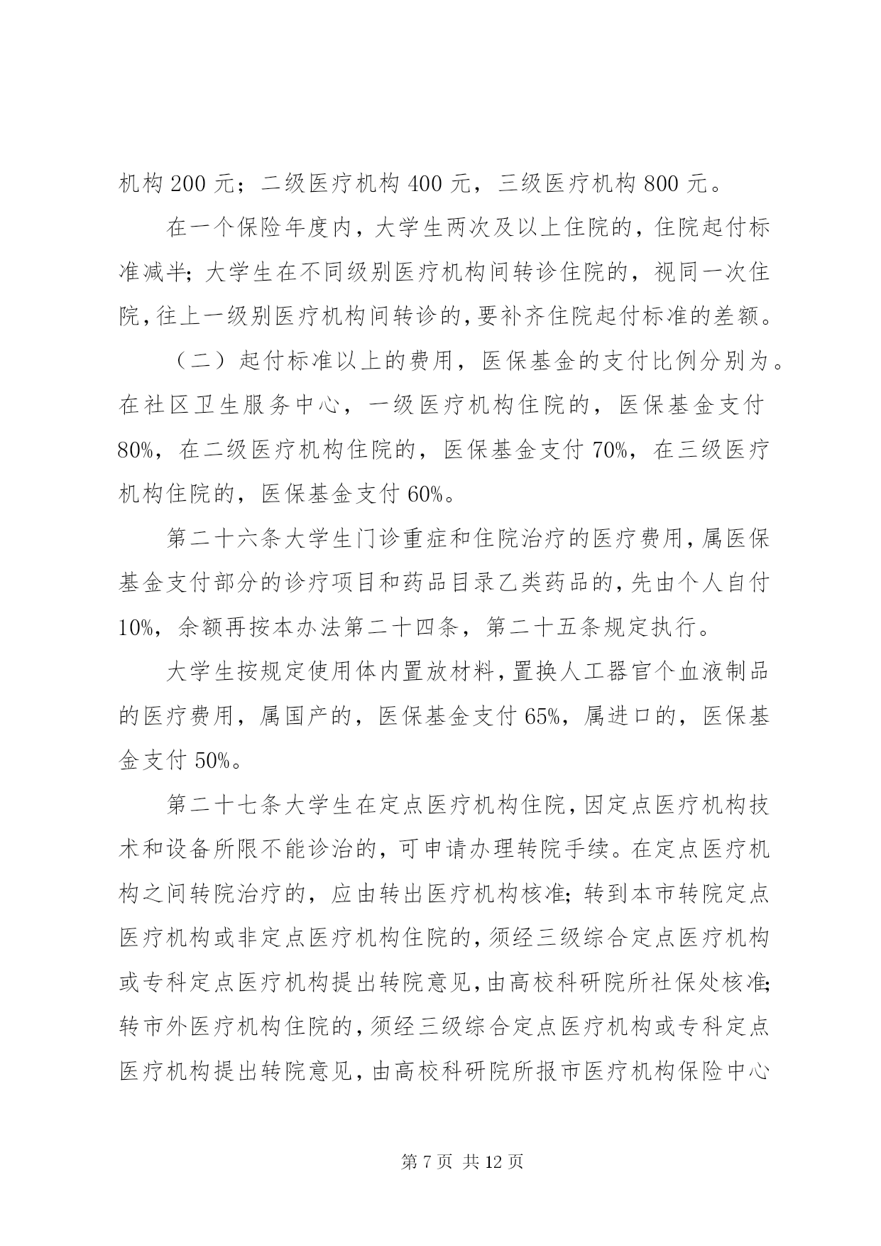 第PAGE\*Arabic\*MERGEFORMAT12页共NUMPAGES\*MERGEFORMAT12页中山基本医疗保险办法关于印发《武汉地区高等学校在校大学生参加城镇居民基本医疗保险业务操作办法》的通知各在汉高等学校、科研院所,各区劳动和社会保障部,各区财政局、各区地税局,各社保经办机构,各定点医疗机构:为推进在汉大学生参加城镇居民基本医疗保险工作,根据《武汉地区高等学校在校大学生参加城镇居民基本医疗保险实施细则》,制订了《武汉地区高等学校在校大学生参加城镇居民基本医疗保险业务操作办法》,现引发给你们,望遵照执行。武汉地区高等学校在校大学生参加城镇居民基本医疗保险业务操作办法为做好武汉地区高等学校在校大学生参加城镇居民基本医疗保险(以下简称大学生居民医保)工作,根据《武汉地区高等学校在校大学生参加城镇居民基本医疗保险实施细则》(武政规{2009}10号)规定,制定本办法。第一章参保范围和对象第一条本市行政区域内各类全日制普通高等学校(含民办高校,独立学院、分校、高等职业技术学院)及科研所(以下简称高校科研院所)中接受普通高等学历教育的全日制本专科学生、去全日制研究生(一下通称大学生)参加居民医保的相关业务办理第二章参保登记和异动第二条XX市社会保险基金结算中心(一下简称市结算中心)负责全市大学生居民预料保险登记业务流程更操作规范的制定,并对全市参保登记工作进行指导与协调。各社会保险管理处(包括XX市人力资源和社会保障局东湖新技术开发区分局,武汉经济技术开发区社会保险管理办公室,以下简称社保处)负责高校科研院所大学生居民医保的参保登记、资料审核、人员增减异动等日常管理工作。第三条各高校科研院所首次参保应携带机构批文、法人证书、国家质量技术监督部门颁发的组织机构统一代码证、税务登记证原件及其复印件,到所在区社保处办理大学生居民医保开户登记手续。地处远XX县区的高校科研院所,按全市统一安排,到指定的社保处办理参保登记。第四条社保处审核高校科研院所报送的资料后,为高校科研院所建立基本信息库,打印回执单,经高校科研院所经办人签字确认,发放用户名和密码。第五条高校科研院所在办理完开户登记手续后,按照规定的电子格式要求,对具有本校(院所)学籍的大学生采集其个人基本信息,并将加盖单位公章的学生学籍名册(附电子文档)报社保处备案。新生入学以及大学生转入时,各高校科研院所应及时报送学籍名册。第六条各高校科研院所通过大学生居民医保网上服务系统,为本校大学生办理参保登记手续。第七条各高校科研院所在每年6月底前对当年毕业大学生在网上集中办理停保手续。对转学、退学、出国(境)的大学生,各高校科研院所应及时持相关资料到社保处办理停保确认手续。第三章费用核定和征缴第八条大学生姓名、性别、身份证号等信息需要变更的,由所在高校科研院所统一到社保处办理定证手续;其他信息变更,有高校科研院所在大学生居民医保业务系统中自行订正。第九条大学生居民医保筹资水平为每人每年120元,实行个人缴费和政府补助相结合。大学生个人每人每年缴费20元,政府每人每年补助100元。第十条市地税局负责大学生居民医疗保险费(以下简称医保费)的征收工作。大学生居民医保费纳入市财政局开设的社保基金专户管理。第十一条各高校科研院所负责代收代缴参保大学生的医保费,并出具地税部门统一印制的专用凭证,其中,低保和重度残疾大学生的医保费由高校科研院所给予补助并代缴。第十二条XX市医疗保险中心(以下简称市医疗保险中心)应按照社会保险基金财务管理和会计核算制度要求,做好医保基金的预决算编制和会计核算工作。第十三条各高校科研院所应于每年9月1日至10月31日,办理大学生缴费申报业务,根据大学生参保缴费情况,产生年度缴费信息,并提交社保处确认。第十四条社保处应在规定的时间内完成缴费信息审核,并提交市结算中心。第十五条市结算中心于每年9月20日、10月20日对社保处汇总资料进行复核,产生大学生居民医保应收帐,移交市地税局进行征收,并报市财政局备案。第十六条市地税局根据市结算中心提供的大学生居民医保应收帐向各高校科研院所开局税票进行征收。各高校科研院所根据市地税局下达的税票,按时足额缴纳代收的医保费。第十七条市地税局应在医保费征收入库后,将入库缴款单和实收账(含电子数据)传至市结算中心。市结算中1心核对完成地税实收数据后,将征缴信息传至市医疗保险中心做到帐处理,并报市财政局备案。第十八条是医疗保险中心在完成实收数据做到帐处理后,在系统中确认大学生享受医疗保险待遇资格。第十九条XX市劳动保障信息中心在市劳动保障服务网上提供大学生个人缴费信息查询服务,并负责大学生居民医保应用软件开发、网络和系统的日常维护等工作。第四章保险待遇和就医管理第二十条大学生居民医保的保险年度为参保当年的9月1日至次