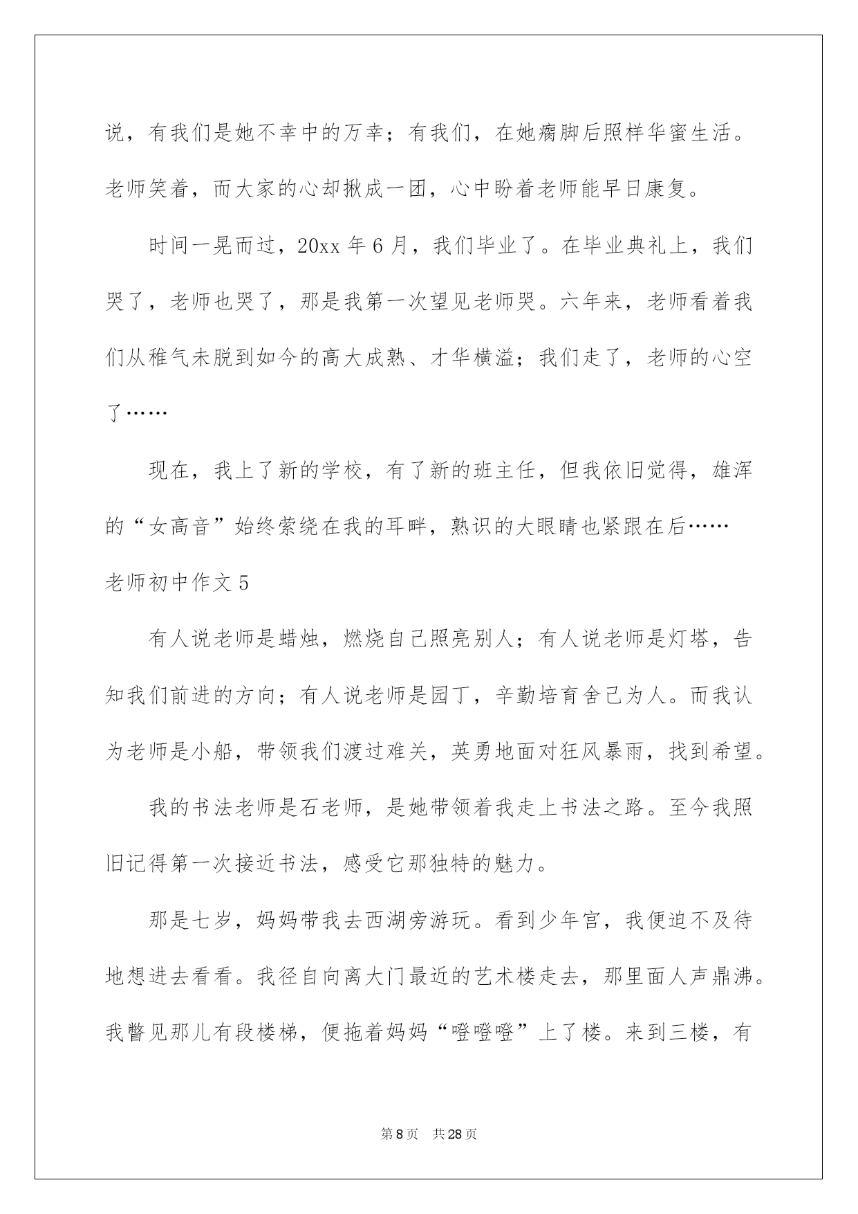 第PAGE\*Arabic\*MERGEFORMAT28页共NUMPAGES\*Arabic\*MERGEFORMAT28页第PAGE\*MERGEFORMAT28页共NUMPAGES\*MERGEFORMAT28页第PAGE\*MERGEFORMAT28页共NUMPAGES\*MERGEFORMAT28页第PAGE\*MERGEFORMAT28页共NUMPAGES\*MERGEFORMAT28页第PAGE\*MERGEFORMAT28页共NUMPAGES\*MERGEFORMAT28页第PAGE\*MERGEFORMAT28页共NUMPAGES\*MERGEFORMAT28页第PAGE\*MERGEFORMAT28页共NUMPAGES\*MERGEFORMAT28页第PAGE\*MERGEFORMAT28页共NUMPAGES\*MERGEFORMAT28页第PAGE\*MERGEFORMAT28页共NUMPAGES\*MERGEFORMAT28页第PAGE\*MERGEFORMAT28页共NUMPAGES\*MERGEFORMAT28页第PAGE\*MERGEFORMAT28页共NUMPAGES\*MERGEFORMAT28页2022老师初中作文老师初中作文在平凡的学习、工作、生活中,大家总少不了接触作文吧,借助作文可以提高我们的语言组织实力。你知道作文怎样才能写的好吗?下面是我收集整理的老师初中作文,欢迎大家借鉴与参考,希望对大家有所帮助。老师初中作文1每一个人都是有自身心中中的超级偶像。有些人崇拜歌手,有些人崇拜生物学家,有些人崇拜士兵,而我心中的偶像就是我的老师一一潘老师。她并不像影视明星,拥有光鲜亮丽的表面;都不像歌星,拥有娓娓好听的嗓音。但她一头乌黑的长头发,愁闷的眼神,又高又挺的鼻梁骨,看起来镇静冷静而低调,她的脸部始终挂着绚烂的笑容,令人一看就有一种亲近感。刚进中学时,我很迷茫,乃至有点儿心烦。由于在中小学的状况下,我语文课始终学得很差。可是潘老师别出心裁第一节语文课,就要我对语文课拥有新的爱好爱好。她给我们共享了她教过的精彩莘莘学子小故事,要我心里遭遇了巨大的激励,拥有自身的长远目标。又给我们讲了在一中念书的不易,要我更为把握现在学习培训的机遇。我每日最盼望的是语文课,潘老师授课唯美的响声,总是能把大家送到梦一般的情景中。她还经常给我们读自身写的文章内容,读到搞笑幽默的地区,她会开怀大笑;读到哀痛的地区,她会热泪盈眶。一节语文课始终在不经意间中就过去,慢慢地我爱上了创作,每一次有写作我都要主动主动发电子文档,这就是超级偶像的风采吧。我之前授课始终担忧老师让我解答问题,可是现在在潘老师的课堂教学上,我总觉得有一种力气激励着我,要我主动主动伸手解答问题。我能不由自主举起手来。一次示范课上我主动主动举手发言,潘老师提了一个难题:“倘如国培老师到家里,你能如何接待她们?”在潘老师的正确引导下我回应得特别好,迈入了整场掌声雷动,拍摄老师归还了我一个特写。那时候我尤其兴奋,好想相拥一下潘老师。潘老师的字写的尤其好看,还经常激励大家书法练字,在老师的细心详细指导下我的字也在不断发展。练得好的老同学聚会获得潘老师亲自写的字帖,这种同学们很骄傲,别的同学很艳羡。我肯定要勤奋获得这一份练字字帖。我还在一望无际的大水上划船,潘老师如一盏明灯,帮我引导了前行的方位,带我持续向前。这就是我心中的偶像,亲善、可亲可敬的潘老师。老师初中作文2随着时间的消逝,我成了四年级的小学生。在这四年里,我付出了许多,也收获了许多。我和老师之间也发生了不少事情,其中有一件事情让我终生难忘。记得我刚进三年级时,英语成了我的克星,我的劲敌。妈妈为了让我的英语成果提上来,为我四处找寻好的培训班来为我辅导英语。后来在别人的介绍下我来到了外语培训学校。在那里我相识了一位温顺、美丽的大姐姐,她长着一双水灵灵的大眼睛,一眨一眨似乎会说话,从她小巧的嘴里说的每一句话,都是那样的有吸引力,她就是我的英语老师。那天,老师教了我们几个简洁的水果单词之后,便在黑板上画了两个相同的楼梯,两个小人各站在两个楼梯下面,又在黑板上写了十二个单词,每边六个,然后把我们分成两组,由老师读中文,让我们选单词,看哪一组上的阶梯多,哪一组便获胜。嬉戏刚起先时,双方都答得很顺当。很快到了最终一问,老师让我回答,可我胆怯自己答错不敢说,当时我满脸涨得通红,不知所措地站在那里,老师微笑着,用她那会说话的眼睛盯着我,似乎在说:“加油,把心中的答案大胆地说出来,答错了没关系,只要你有志气。”看到老师那激励的眼神,我鼓起志气,大胆地说出了我的答案,