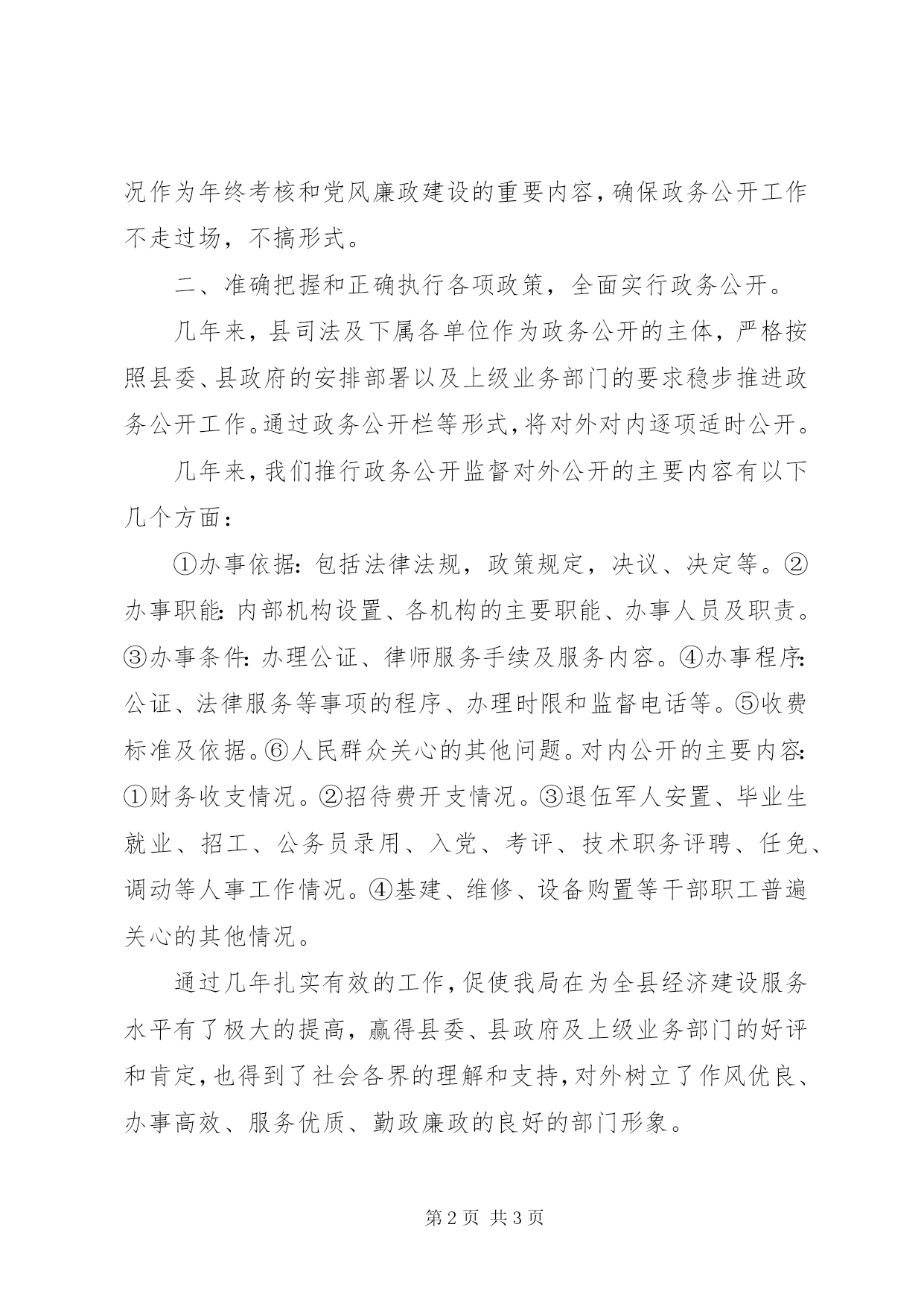 第PAGE\*Arabic\*MERGEFORMAT3页共NUMPAGES\*MERGEFORMAT3页司法局政务公开工作汇报我局的政务公开工作在县委、县政府以及上级业务部门的正确领导下,坚持以“三个代表”重要思想为指导,坚持科学发展观,坚持以人为本,深入扎实开展司法行政政务公开工作,稳步发展,取得了明显成效。一、统一思想,提高认识,增强做好司法行政政务公开工作的责任感和使命感。近几年来,我局为贯彻落实国务院、省、市县关于推行政务公开的精神和要求,我局积极组织学习有关文件、政策。统一思想,提高认识,制订措施,强化责任,一是成立县司法局政务公开领导小组,根据实际情况及时调整和充实政务公开领导小组成员。每年初局政务公开领导小组都专门召开会议,研究部署本年度的政务公开工作。通过几年的工作,学习与实践,全局上下普遍认识到加强政务公开工作是我国实施依法治国方略的重要举措,是推进依法行政的重要手段,是全面提高依法行政水平的重要保障。二是突出重点,扎实工作,制订切实可行的措施切实提高办事效率,改进工作方法增强政务工作透明度,提高服务水平。我局按照民主、公正、公开的原则,制定本系统政务公开实施方案,明确政务公开监督的内容,步骤和措施。三是加强领导,强化责任,为把本系统政务公开工作各项措施落到实处,切实由到明显成效,我局采取一把手负总责,各成员分片负责,把落实情况作为年终考核和党风廉政建设的重要内容,确保政务公开工作不走过场,不搞形式。二、准确把握和正确执行各项政策,全面实行政务公开。几年来,县司法及下属各单位作为政务公开的主体,严格按照县委、县政府的安排部署以及上级业务部门的要求稳步推进政务公开工作。通过政务公开栏等形式,将对外对内逐项适时公开。几年来,我们推行政务公开监督对外公开的主要内容有以下几个方面:①办事依据:包括法律法规,政策规定,决议、决定等。②办事职能:内部机构设置、各机构的主要职能、办事人员及职责。③办事条件:办理公证、律师服务手续及服务内容。④办事程序:公证、法律服务等事项的程序、办理时限和监督电话等。⑤收费标准及依据。⑥人民群众关心的其他问题。对内公开的主要内容:①财务收支情况。②招待费开支情况。③退伍军人安置、毕业生就业、招工、公务员录用、入党、考评、技术职务评聘、任免、调动等人事工作情况。④基建、维修、设备购置等干部职工普遍关心的其他情况。通过几年扎实有效的工作,促使我局在为全县经济建设服务水平有了极大的提高,赢得县委、县政府及上级业务部门的好评和肯定,也得到了社会各界的理解和支持,对外树立了作风优良、办事高效、服务优质、勤政廉政的良好的部门形象。司法局政务公开工作汇报