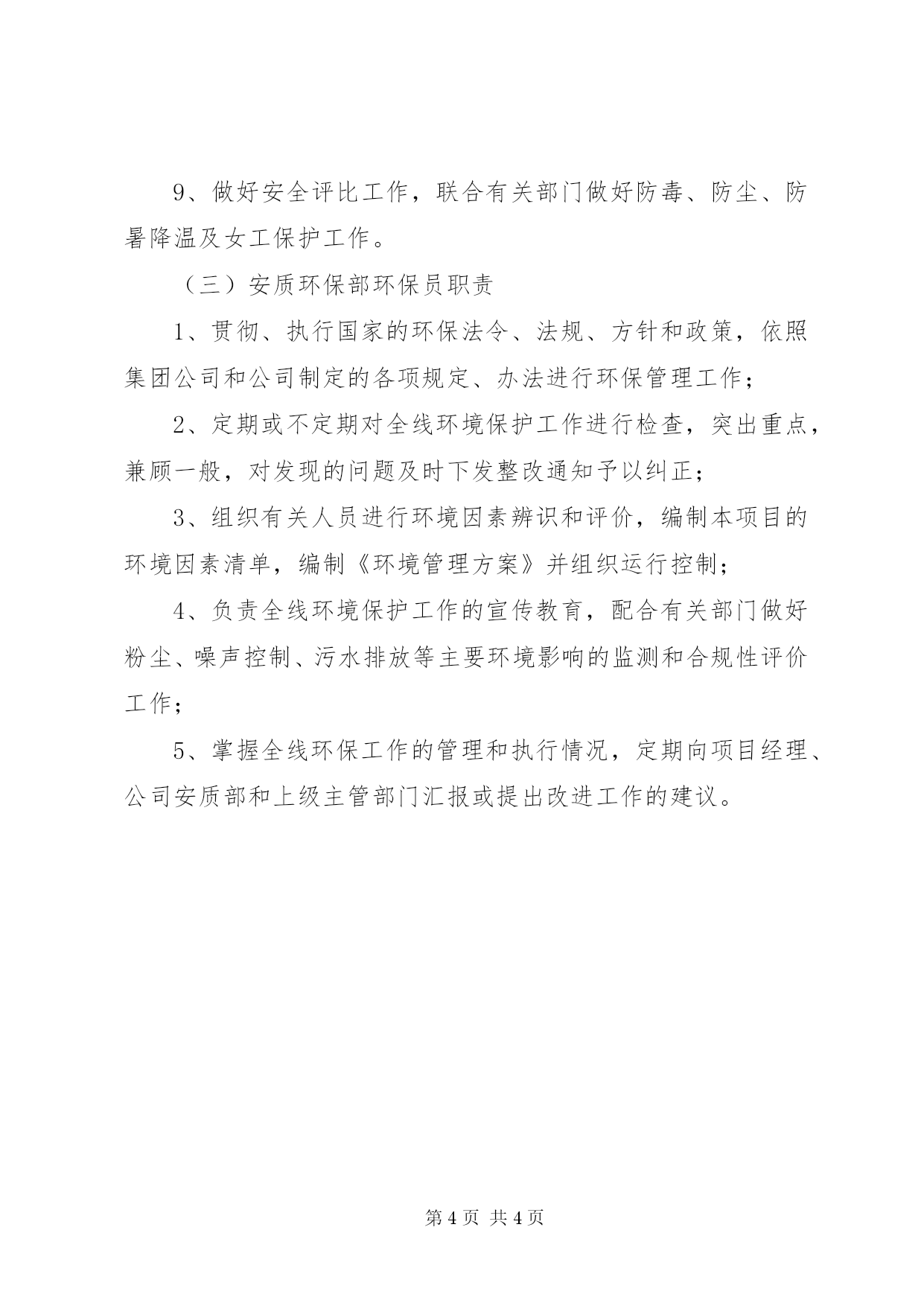第PAGE\*Arabic\*MERGEFORMAT4页共NUMPAGES\*MERGEFORMAT4页安全环保部职责1、对项目环境保护与安全管理工作进行管理控制;2、系统掌握国家、业主及公司关于施工安全、环境保护的方针、政策、法规、制度和要求,并在施工中督促和检查;3、做好安全环保的宣传教育和培训工作,做好安全交底工作,促使全体参建人员树立安全第一、质量兴企的思想,自觉遵守各项规章制度;4、健全安全工作的组织机构,建立健全安全生产管理体系和应急救援体系,完善安全生产包保责任制,控制安全生产成本,实现“杜绝较大的安全生产事故,杜绝安全责任事故,全力打造国家级“平安工程”示范项目”安全生产总目标;5、参与和组织各项安全生产检查活动,制止“三违”行为,排查安全隐患,制定防范措施;6、定期制定安全生产专项资金投入计划,并对投入情况进行统计、核实;7、参与编制本项目危险源辨识与风险评价,编制本项目的安全生产事故应急救援预案,并定期组织相关人员进行演练;8、制定重大危险源管理方案和保证措施,对施工现场安全重大危险源实施动态监控;9、负责本项目劳保用品的计划、发放,并监督检查劳保用品的使用情况;10、参与安全生产事故的调查、处理和事故报告,做好相应的登记工作;11、及时组织、配合项目总工做好入场人员的安全交底工作,及时对劳务队伍做好入场安全教育,及时督促项目部与分包单位签定安全生产协议书;并做好相关记录;12、完善安全内业资料,加强对内业资料的规范、管理和保存。(一)安全环保部部长职责1、贯彻落实国家安全生产方针、政策、法律、法规,上级和公司的安全生产规章制度;2、建立健全安全生产保障体系、监督体系,组织落实项目安全生产管理制度、安全生产责任制;3、负责审定项目安全生产投入计划,保证安全生产投入的有效实施,保证职业健康安全管理体系的有效运行;4、参与审核施工组织设计、施工方案的审查,监督安全技术措施的落实工作,督促设备管理部门开展设备安全管理工作;5、对项目经理部的各级各类人员履行安全生产职责实效性进行监督检查并督促落实;6、对项目经理部开展的安全风险评价、重大危险因素和重要环境影响因素控制措施的落实和管理效果进行督促检查,并给予指导;7、组织实施安全生产检查与考核,事故隐患排查整改,特种作业人员、特种设备、劳动防护用品的管理,应急管理体系的建立、运行和应急预案演练,员工安全教育、培训,施工安全日志、信息管理、报送等日常管理工作;8、组织、参与或配合安全事故的调查处理,监督处理决定的落实工作。(二)安全环保部专职安全员职责1、负责安全措施的监督实施;2、深入现场对施工过程的防护设施和特殊工种操作安全工作进行检查监督,及时解决安全工作存在的问题及事故隐患,制止违章作业,避免损失;3、定期向工人进行安全教育,施工前向作业人员书面交底并办理审批手续;4、及时指导作业队的安全生产,坚持预防为主,杜绝违章指挥和违章操作,做好宣传工作;5、及时发放防护及保健用品;6、总结安全工作,及时提出防范措施;7、建立安全日志,及时上报各种报表;8、组建项目消防队,消除火灾隐患;9、做好安全评比工作,联合有关部门做好防毒、防尘、防暑降温及女工保护工作。(三)安质环保部环保员职责1、贯彻、执行国家的环保法令、法规、方针和政策,依照集团公司和公司制定的各项规定、办法进行环保管理工作;2、定期或不定期对全线环境保护工作进行检查,突出重点,兼顾一般,对发现的问题及时下发整改通知予以纠正;3、组织有关人员进行环境因素辨识和评价,编制本项目的环境因素清单,编制《环境管理方案》并组织运行控制;4、负责全线环境保护工作的宣传教育,配合有关部门做好粉尘、噪声控制、污水排放等主要环境影响的监测和合规性评价工作;5、掌握全线环保工作的管理和执行情况,定期向项目经理、公司安质部和上级主管部门汇报或提出改进工作的建议。