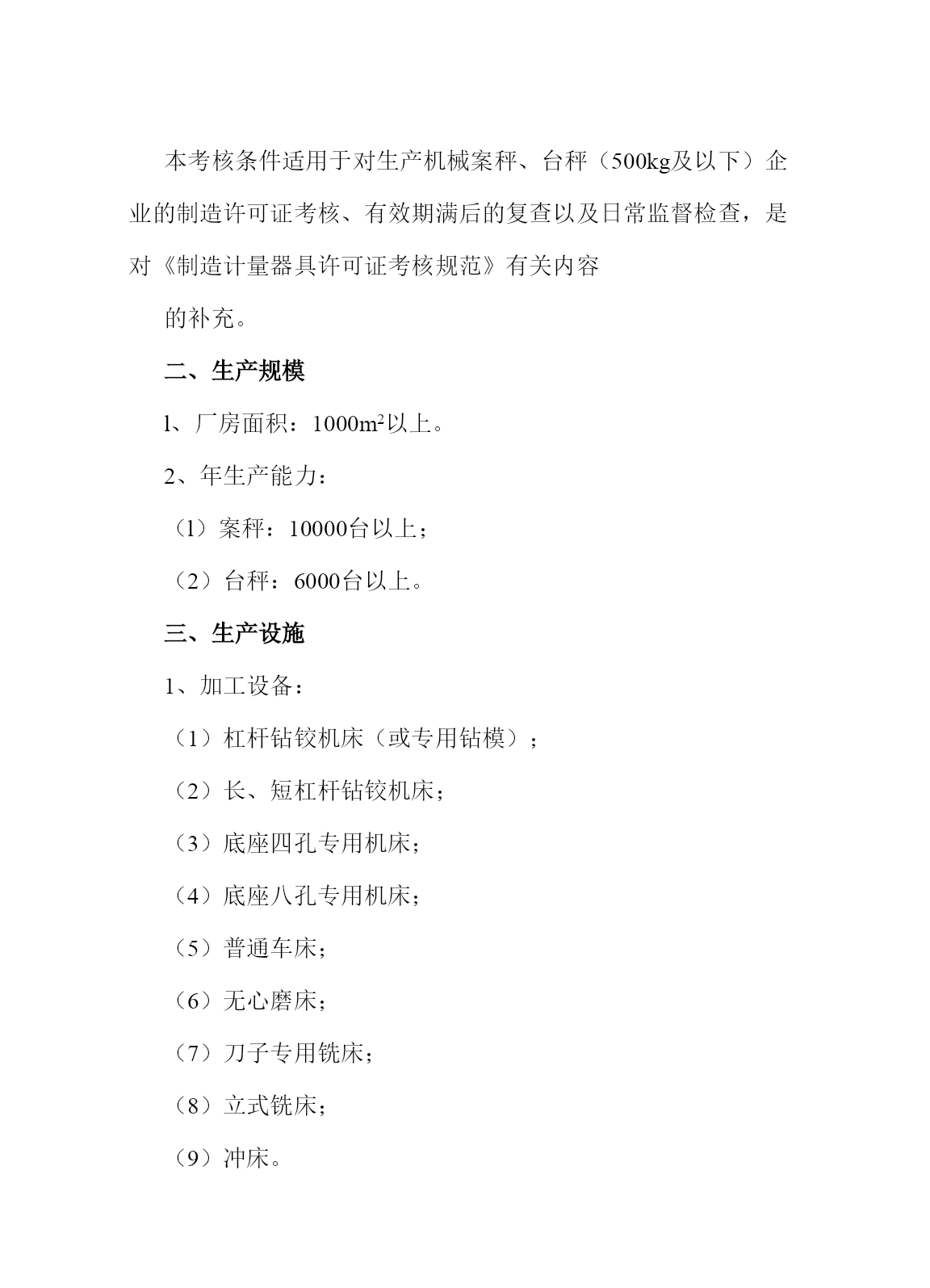衡器制造计量器具许可证考核必备条件电子计价秤、电子计重秤一、适用范围本考核条件适用于对生产电子计价秤、电子计重秤(30kg及以下)企业的制造许可证考核、有效期满后的复查以及日常监督检查,是对《制造计量器具许可证考核规范》有关内容的补充。二、生产规漠1、厂房面积:500m2以上;2、年生产能力:10000台以上。三、生产设施l、多工位装配作业线;2、电路板清洗设备(采用免洗焊剂的除外);3、焊接设备;4、整机老化设备(整机老化试验要求连续通电72小时以上);5、整机测试区域要有空调。四、检测设备1、通用电气仪表;(1)6位半以上数字电压表(准确度优于1μV);(2)示波器;(3)调压器;(4)泄漏电流测试仪;(5)绝缘强度测试仪;(6)绝缘电阻测试仪;2、电子元器件(电阻、电容、电感等)老化与检测装置;3、电路板组件检验装置;4、标准法码:准确度等级M1级以上、量程覆盖最大称量的标准砝码和能测数字示值化整误差的0.1e的小片砝码多个;5、高低温性能试验箱(-20℃~50℃);6、恒温恒湿箱;7、耐久性试验设备;8、外购称重传感器的,要有传感器检测装置;9、键盘耐久性检测设备。电子地上衡、地中衡、汽车衡一、适度范围本考核条件适用于对生产电子地上衡、地中衡、汽车衡企业的制造许可证考核、有效期满后的复查以及日常监督检查,是对《制造计量器具许可证考核规范》有关内容的补充。二、生产规模l、厂房面积:1000m2以上;2、年生产能力:200台以上。三、生产设施1、焊接设备;2、起吊设备;3、满足工艺需要的机械加工设备;4、整机检验平台(场地);5、剪板机或自动、半自动切割设备;6、表面涂漆场地。四、检测设备1、通用电气仪表;(l)调压器;(2)6位半以上数字电压表(准确度优于1μV);(3)泄漏电流测试仪;(4)绝缘强度测试仪;(5)绝缘电阻测试仪;(6)标准信号源(准确度优于0.01%);2、标准砝码:最大称量在100t以下的,应具有不少于最大称量的M1级标准法码和能测数字示值化整误差的0.1e的小珐码多个。弹簧度盘秤一、适用范围本考核条件适用于对生产弹簧度盘秤企业的制造许可证考核、有效期满后的复查以及日常监督检查,是对《制造计量器具许可证考核规范》有关内容的补充。二、生产规模1、厂房面积:600m2以上;2、年生产能力:20000台以上。三、生产设施l、金属件加工设备:(1)80吨以上冲床;(2)40吨以上冲床;(3)剪板机;(4)攻丝机;(5)台钻;(6)车床;(7)铣床;(8)硬度试验机。2、塑料件加工设备(可外协):(1)注塑机;(2)丝网印刷设备;(3)烘干箱。3、计量弹簧加工设备(如能出具弹簧性能和疲劳试验检测报告,可外协):(1)绕簧机;(2)手捣机;(3)拉丝机;(4)定型炉。4、整机组装及试验设备:(l)高低温性能试验室(箱);(2)多工位装配作业线;(3)疲劳试验机;(4)跌落试验装置:(5)标准珐码。电子皮带秤一、适用范围本考核条件适用于对生产电子皮带秤企业的制造许可证考核、有效期满后的复查以及日常监督检查,是对《制造计量器具许可证考核规范》有关内容的补充。二、生产规模厂房面积:500m2以上。三、生产设施l、焊接设备;2、起吊设备;3、满足工艺需要的机械加工设备;4、仪表老化设备。四、检测设备l、通用电气仪表:(1)6位半以上数字电压表(准确度优于1μV);(2)标准信号源(准确度优于0.02%);(3)调压器;(4)绝缘强度测试仪;(5)绝缘电阻测试仪;(6)泄漏电流测试仪;(7)频率计。2、检定用标准珐码(挂码、链码);3、动态性能检测装置。电子吊秤一、适用范围本考核条件适用于对生产电子吊秤企业的制造许可证考核、有效期满后的复查以及日常监督检查,是对《制造计量器具许可证考核规范》有关内容的补充。二、生产规模厂房面积:500m2以上。三、生产设施l、仪表老化设备;2、焊接设备;3、电路板清洗设备(采用免洗焊剂的除外);4、起吊设备。四、检测设备l、调压器;2、泄漏电流测试仪;3、绝缘电阻测试仪;4、绝缘强度测试仪;5、6位半以上数字电压表(准确度优于1μV);6、标准信号源(准确度优于0.01%);7、恒温恒湿箱;8、示波器;9、电子元器件(电阻、电容、电感等)老化与检测装置;10、电路板组件检验装置;11、整机准确度检测设备(标准砝码或测力机);12、误码检测装置(无线吊秤必备)。注:应提供疲劳、过载安全试验报告。机械案秤、台秤