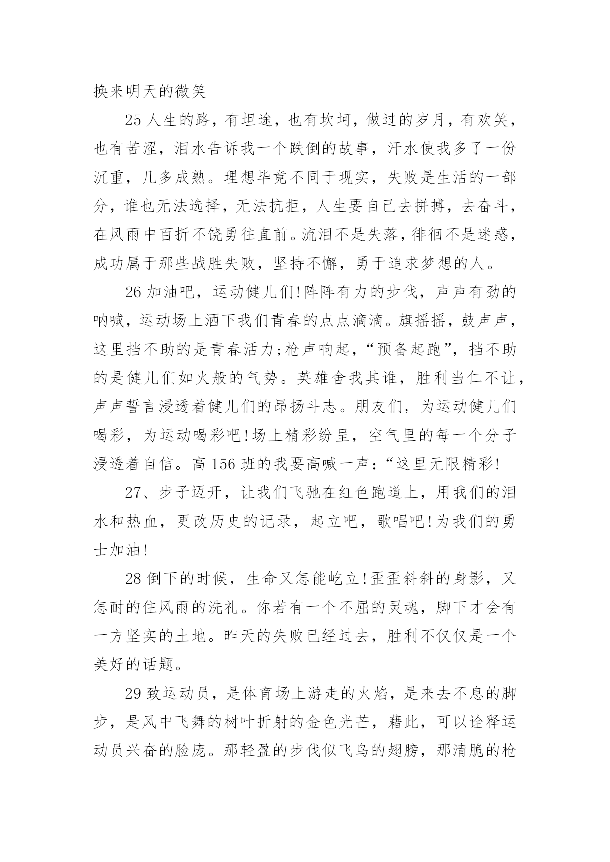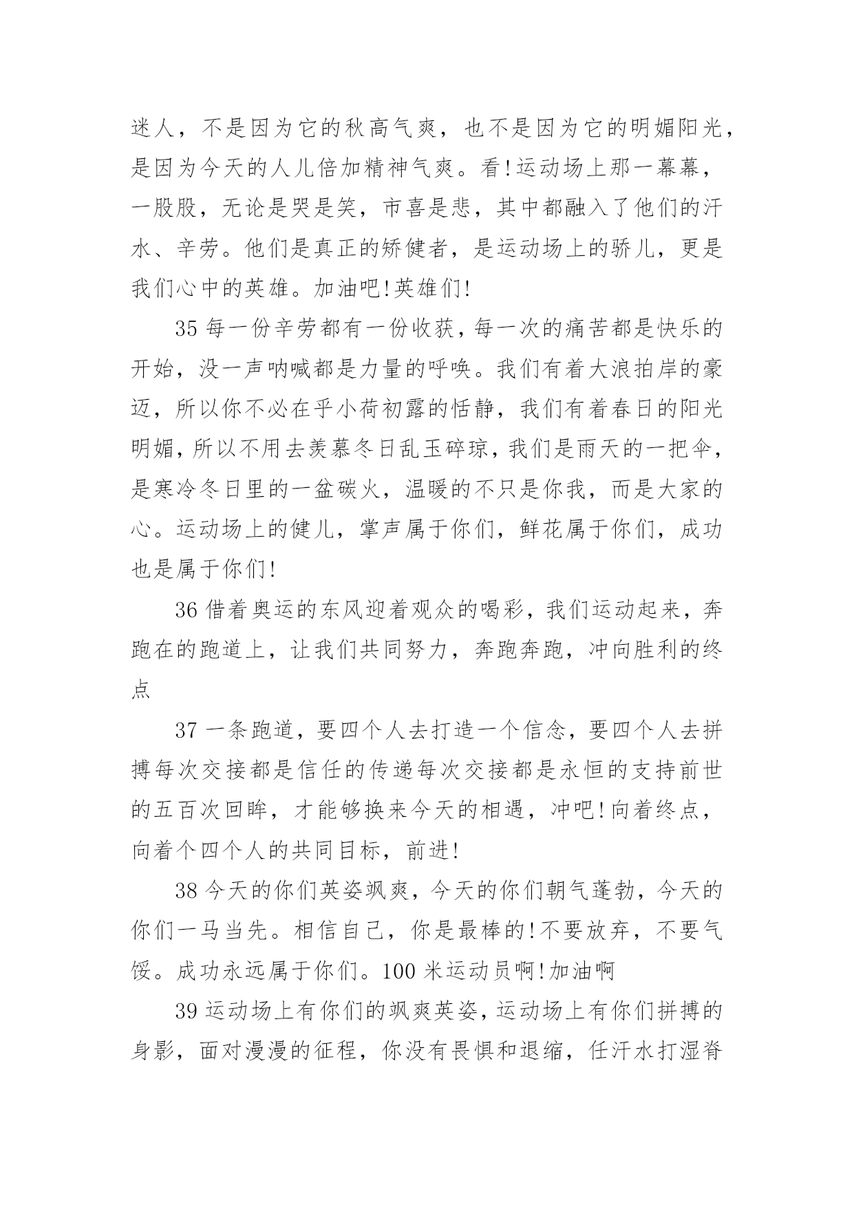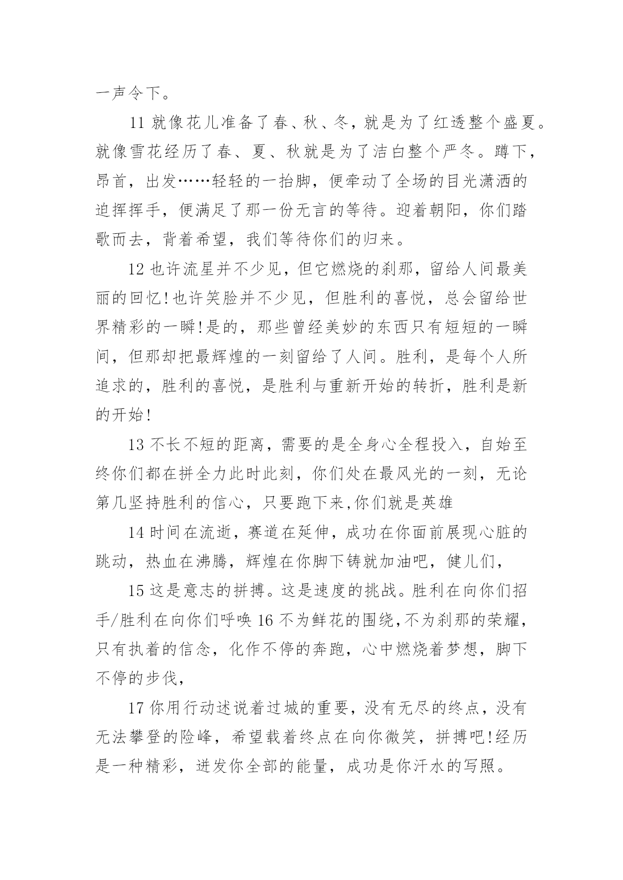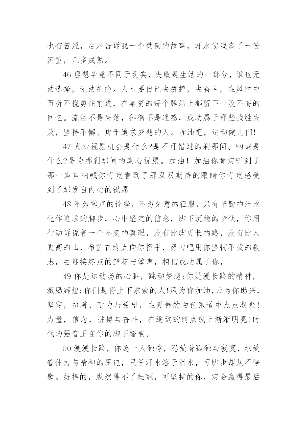 精彩运动会加油稿精彩运动会加油稿模板在我们平凡的日常里,用到加油稿的地方越来越多,借助加油稿可以表达对对方的鼓励和支持。写加油稿的注意事项有许多,你确定会写吗?以下是小编为大家整理的精彩运动会加油稿模板,希望对大家有所帮助。1你的汗水洒在跑道,浇灌着成功的花朵开放。你的欢笑飞扬在赛场,为班争光数你最棒。跑吧,追吧,在这广阔的赛场上,你似骏马似离铉的箭。跑吧,追吧你比虎猛比豹强2你们挥舞着充满力量的双臂,看着实心球化成美丽的弧线,我着实在心里佩服你们你们抛出了自己的水平。3一根小小的木棒,连接的是团结和友爱,一根小小的木棒,传递的是勇气和力量,一根小小的木棒,演绎的是奋斗和拼搏,加油吧!让这激动人心的时刻,一直回荡在我们心中!4踏上跑道,是一种选择。离开起点,是一种勇气。驰骋赛场,是一种胜利。5运动健将们,用你的实力,用你的精神,去开拓出,一片属于你的长跑天地!6温暖的阳光洒在赛场上,男子乙组标枪的比赛即将开始。赛场上,一道道优美的弧线将轻盈地划过天空。健儿们用手中的标枪向距离的权限发起一轮又一轮的挑战。标枪在空中轻盈的姿态,是健儿们强健的力量和熟练的技巧的结合。谁能在这场激烈的竞争中获胜?让我们拭目以待,让我们为他们呐喊、助威吧!只有将力量与技巧合二为一的人,才能获得胜利的桂冠!7有多少次挥汗如雨,伤痛曾添满记忆,只因为始终相信,去拼搏才能胜利。总在鼓舞自己,要成功就得努力。热血在赛场沸腾,巨人在赛场升起。相信自己,你将赢得胜利,创造奇迹;相信自己,梦想在你手中,这是你的天地。当一切过去,你们将是第一。相信自己,你们将超越极限,超越自己!相信自己,加油吧,健儿们,相信你自己。8年轻的我们自信飞扬,青春的气息如同出生的朝阳,蓬勃的力量如同阳光的挥洒。此时此刻,跑道便是我们精彩的舞台,声声加油便是我们的奖项!论何成功,谈何荣辱,心中的信念只有一个:拼搏!8萧瑟的秋风,挡不住你们破竹的锐气,9广阔的绿茵场,是为你们搭建的舞台。张扬吧,年轻的心,我们将为你永远喝彩!10泰戈尔在诗中说,天空没有翅膀的影子,但我已飞过;艾青对朋友说,也许有人到达不了彼岸,但我们共同拥有大海。也许你们没有显赫的成绩,但运动场上留下了你们的足迹。也许你们没有奖品,但我们心中留下了你们拼搏的身影。所有的努力都是为了迎接这一刹那,所有的拼搏都是为了这一声令下。11就像花儿准备了春、秋、冬,就是为了红透整个盛夏。就像雪花经历了春、夏、秋就是为了洁白整个严冬。蹲下,昂首,出发……轻轻的一抬脚,便牵动了全场的目光潇洒的迫挥挥手,便满足了那一份无言的等待。迎着朝阳,你们踏歌而去,背着希望,我们等待你们的归来。12也许流星并不少见,但它燃烧的刹那,留给人间最美丽的回忆!也许笑脸并不少见,但胜利的喜悦,总会留给世界精彩的一瞬!是的,那些曾经美妙的东西只有短短的一瞬间,但那却把最辉煌的一刻留给了人间。胜利,是每个人所追求的,胜利的喜悦,是胜利与重新开始的转折,胜利是新的开始!13不长不短的距离,需要的是全身心全程投入,自始至终你们都在拼全力此时此刻,你们处在最风光的一刻,无论第几坚持胜利的信心,只要跑下来,你们就是英雄14时间在流逝,赛道在延伸,成功在你面前展现心脏的跳动,热血在沸腾,辉煌在你脚下铸就加油吧,健儿们,15这是意志的拼搏。这是速度的挑战。胜利在向你们招手/胜利在向你们呼唤16不为鲜花的围绕,不为刹那的荣耀,只有执着的信念,化作不停的奔跑,心中燃烧着梦想,脚下不停的步伐,17你用行动述说着过城的重要,没有无尽的终点,没有无法攀登的险峰,希望载着终点在向你微笑,拼搏吧!经历是一种精彩,迸发你全部的能量,成功是你汗水的写照。18虽然你们在场上的时间很短暂,但你们的身影依然停留在人们的脑海里,因为你们是赛场上最可爱的人19不为掌声的注释不为刻意的征服不为失败的痛苦只有辛勤的汗水化作成功的脚步20心中坚定的信念,脚下沉稳的步伐,你用行动告诉我们一个不变之理,没有走不完的路,没有过不了的山,成功正在终点冲着你高高的招手,用你那顽强的意志去努力,去迎接终点的鲜花与掌声,相信成功一定是属于你。21坚定,执着,耐力与希望,在延伸的白色跑道中点点凝聚!力量,信念,拼搏与奋斗,在遥远的终点线上渐渐明亮!时代的强音正在你的脚下踏响。22踏着春天的气息,迈着轻盈的脚步,我们迎来了心仪已久的运动会。这里就是展示自我的舞台。我们向往高山的坚忍不拔,我们渴望大海的`博大精深,还有,我们更痴迷于你们的速度激情。来吧,尽情释放你的活力。你的每一次冲刺,都叩动着我们的心弦;你的每一次跨越,都吸引着我们的视线;你的每一次起跳,都绷紧我们的神经。我们为你呐喊,我们为你自豪,我们为你疯狂。23青春的脚步,青春的速度,青春的活力,青春的激情,将会在你们的身上尽情体现。迎接自我,挑战自我,战胜自我!我们相