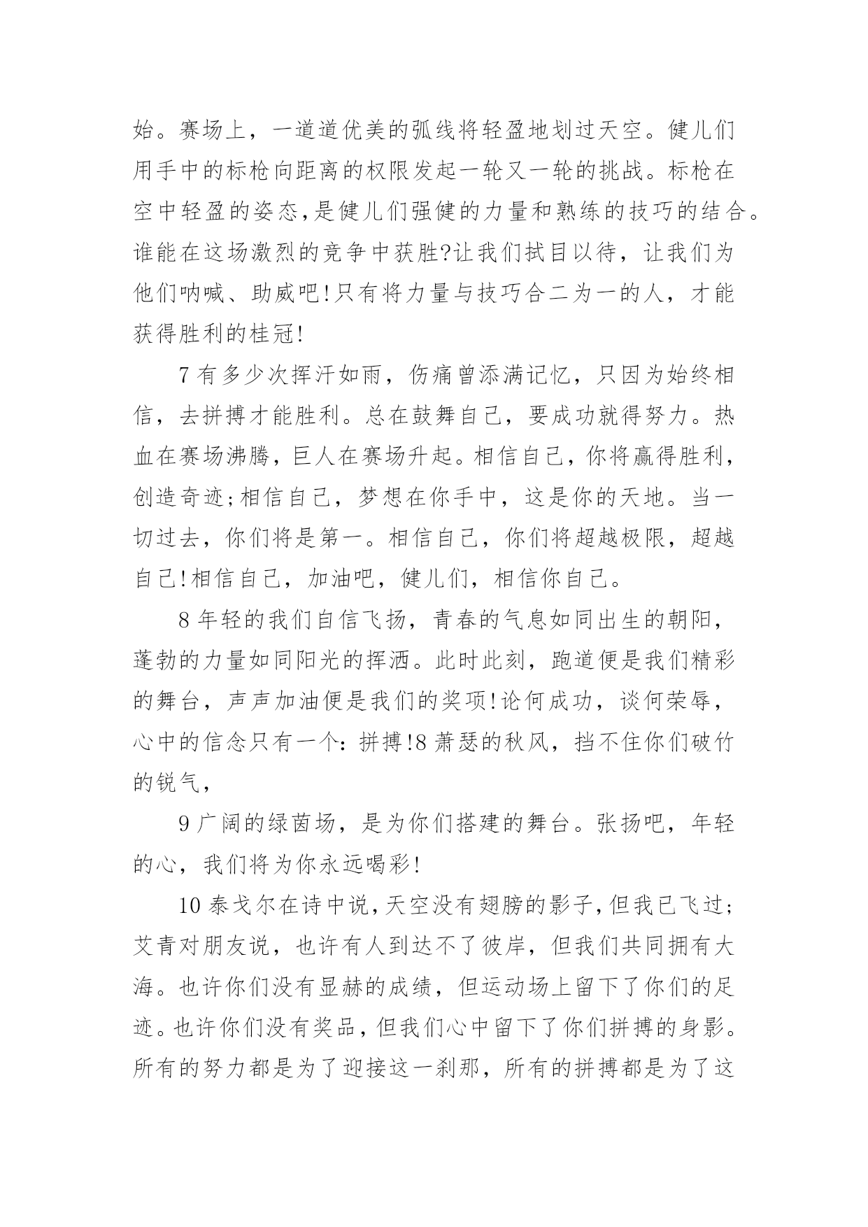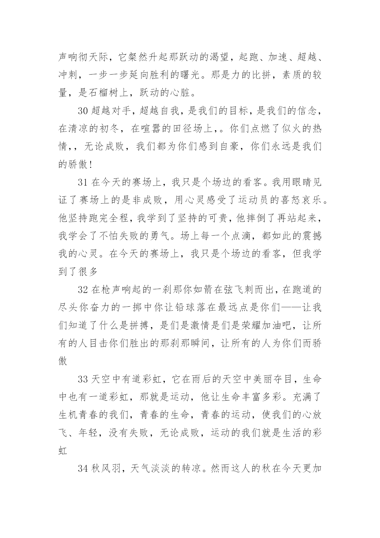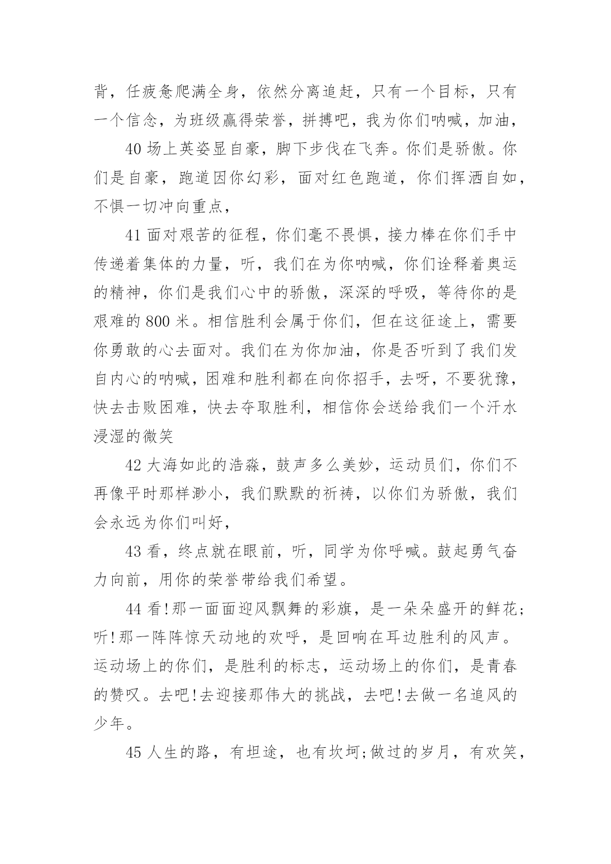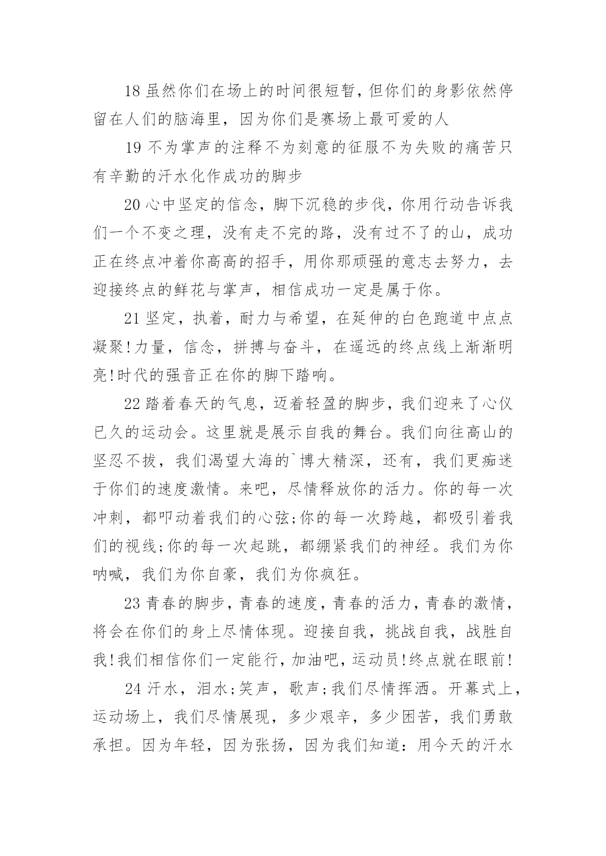 精彩运动会加油稿精彩运动会加油稿模板在我们平凡的日常里,用到加油稿的地方越来越多,借助加油稿可以表达对对方的鼓励和支持。写加油稿的注意事项有许多,你确定会写吗?以下是小编为大家整理的精彩运动会加油稿模板,希望对大家有所帮助。1你的汗水洒在跑道,浇灌着成功的花朵开放。你的欢笑飞扬在赛场,为班争光数你最棒。跑吧,追吧,在这广阔的赛场上,你似骏马似离铉的箭。跑吧,追吧你比虎猛比豹强2你们挥舞着充满力量的双臂,看着实心球化成美丽的弧线,我着实在心里佩服你们你们抛出了自己的水平。3一根小小的木棒,连接的是团结和友爱,一根小小的木棒,传递的是勇气和力量,一根小小的木棒,演绎的是奋斗和拼搏,加油吧!让这激动人心的时刻,一直回荡在我们心中!4踏上跑道,是一种选择。离开起点,是一种勇气。驰骋赛场,是一种胜利。5运动健将们,用你的实力,用你的精神,去开拓出,一片属于你的长跑天地!6温暖的阳光洒在赛场上,男子乙组标枪的比赛即将开始。赛场上,一道道优美的弧线将轻盈地划过天空。健儿们用手中的标枪向距离的权限发起一轮又一轮的挑战。标枪在空中轻盈的姿态,是健儿们强健的力量和熟练的技巧的结合。谁能在这场激烈的竞争中获胜?让我们拭目以待,让我们为他们呐喊、助威吧!只有将力量与技巧合二为一的人,才能获得胜利的桂冠!7有多少次挥汗如雨,伤痛曾添满记忆,只因为始终相信,去拼搏才能胜利。总在鼓舞自己,要成功就得努力。热血在赛场沸腾,巨人在赛场升起。相信自己,你将赢得胜利,创造奇迹;相信自己,梦想在你手中,这是你的天地。当一切过去,你们将是第一。相信自己,你们将超越极限,超越自己!相信自己,加油吧,健儿们,相信你自己。8年轻的我们自信飞扬,青春的气息如同出生的朝阳,蓬勃的力量如同阳光的挥洒。此时此刻,跑道便是我们精彩的舞台,声声加油便是我们的奖项!论何成功,谈何荣辱,心中的信念只有一个:拼搏!8萧瑟的秋风,挡不住你们破竹的锐气,9广阔的绿茵场,是为你们搭建的舞台。张扬吧,年轻的心,我们将为你永远喝彩!10泰戈尔在诗中说,天空没有翅膀的影子,但我已飞过;艾青对朋友说,也许有人到达不了彼岸,但我们共同拥有大海。也许你们没有显赫的成绩,但运动场上留下了你们的足迹。也许你们没有奖品,但我们心中留下了你们拼搏的身影。所有的努力都是为了迎接这一刹那,所有的拼搏都是为了这一声令下。11就像花儿准备了春、秋、冬,就是为了红透整个盛夏。就像雪花经历了春、夏、秋就是为了洁白整个严冬。蹲下,昂首,出发……轻轻的一抬脚,便牵动了全场的目光潇洒的迫挥挥手,便满足了那一份无言的等待。迎着朝阳,你们踏歌而去,背着希望,我们等待你们的归来。12也许流星并不少见,但它燃烧的刹那,留给人间最美丽的回忆!也许笑脸并不少见,但胜利的喜悦,总会留给世界精彩的一瞬!是的,那些曾经美妙的东西只有短短的一瞬间,但那却把最辉煌的一刻留给了人间。胜利,是每个人所追求的,胜利的喜悦,是胜利与重新开始的转折,胜利是新的开始!13不长不短的距离,需要的是全身心全程投入,自始至终你们都在拼全力此时此刻,你们处在最风光的一刻,无论第几坚持胜利的信心,只要跑下来,你们就是英雄14时间在流逝,赛道在延伸,成功在你面前展现心脏的跳动,热血在沸腾,辉煌在你脚下铸就加油吧,健儿们,15这是意志的拼搏。这是速度的挑战。胜利在向你们招手/胜利在向你们呼唤16不为鲜花的围绕,不为刹那的荣耀,只有执着的信念,化作不停的奔跑,心中燃烧着梦想,脚下不停的步伐,17你用行动述说着过城的重要,没有无尽的终点,没有无法攀登的险峰,希望载着终点在向你微笑,拼搏吧!经历是一种精彩,迸发你全部的能量,成功是你汗水的写照。18虽然你们在场上的时间很短暂,但你们的身影依然停留在人们的脑海里,因为你们是赛场上最可爱的人19不为掌声的注释不为刻意的征服不为失败的痛苦只有辛勤的汗水化作成功的脚步20心中坚定的信念,脚下沉稳的步伐,你用行动告诉我们一个不变之理,没有走不完的路,没有过不了的山,成功正在终点冲着你高高的招手,用你那顽强的意志去努力,去迎接终点的鲜花与掌声,相信成功一定是属于你。21坚定,执着,耐力与希望,在延伸的白色跑道中点点凝聚!力量,信念,拼搏与奋斗,在遥远的终点线上渐渐明亮!时代的强音正在你的脚下踏响。22踏着春天的气息,迈着轻盈的脚步,我们迎来了心仪已久的运动会。这里就是展示自我的舞台。我们向往高山的坚忍不拔,我们渴望大海的`博大精深,还有,我们更痴迷于你们的速度激情。来吧,尽情释放你的活力。你的每一次冲刺,都叩动着我们的心弦;你的每一次跨越,都吸引着我们的视线;你的每一次起跳,都绷紧我们的神经。我们为你呐喊,我们为你自豪,我们为你疯狂。23青春的脚步,青春的速度,青春的活力,青春的激情,将会在你们的身上尽情体现。迎接自我,挑战自我,战胜自我!我们相