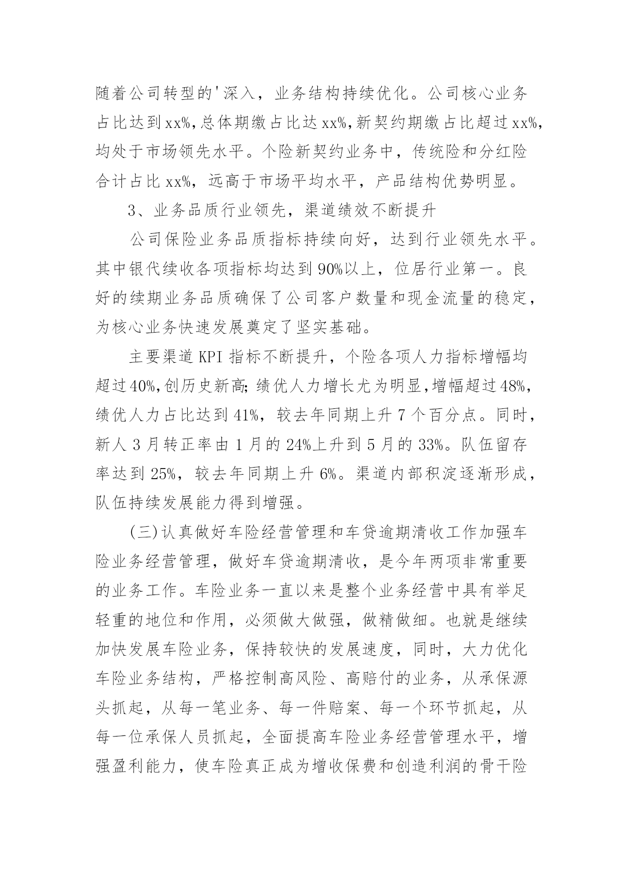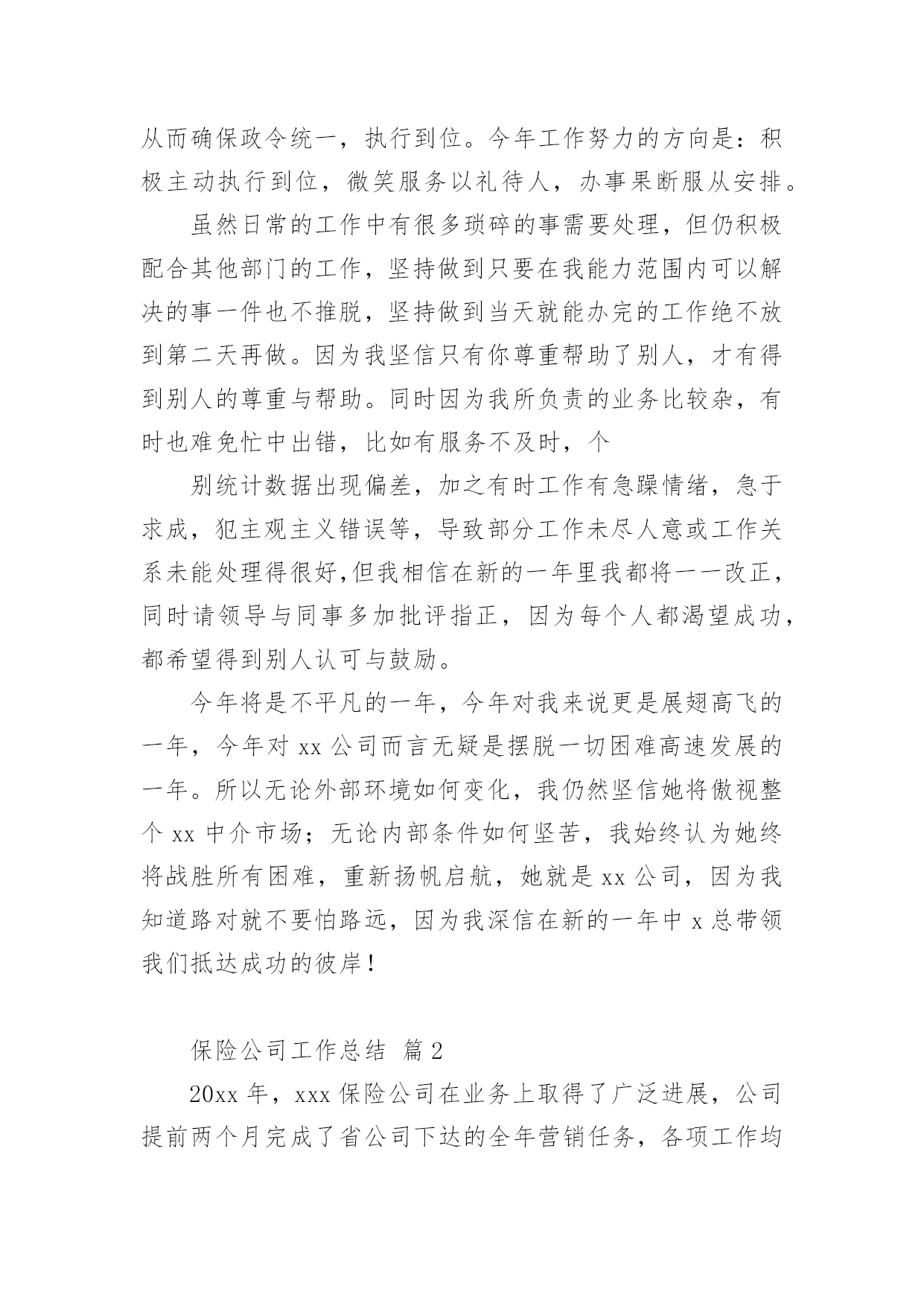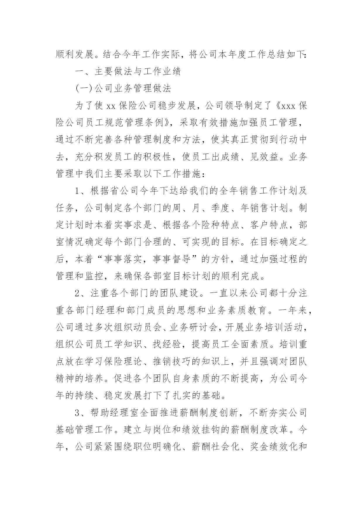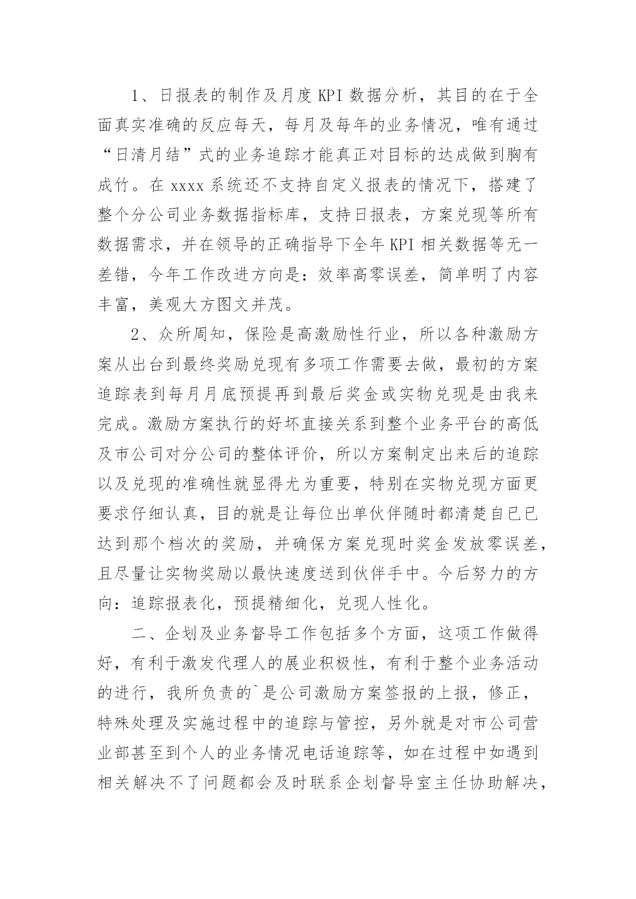 保险公司工作总结总结是对某一特定时间段内的学习和工作生活等表现情况加以回顾和分析的一种书面材料,它有助于我们寻找工作和事物发展的规律,从而掌握并运用这些规律,因此我们需要回头归纳,写一份总结了。但是总结有什么要求呢?以下是小编收集整理的保险公司工作总结,希望能够帮助到大家。保险公司工作总结篇1时间犹如涓涓细流从指尖不经意的溜走,而毫无察觉。20xx年充满了挑战和机遇;20xx年满载着责任与希望;20xx年创造了奇迹和辉煌;20xx年在x总的带领下xx公司走过了一段崎岖漫长但不平凡的创业之路:其中有人继续前行,有人选择放弃,有人还在彷徨,有人一直迷茫,总之大家还在路上。在xxx总的正确领导及细心关怀下我始终以专业的标准严格要求自已;工作上保持一丝不苟工作作风;生活上坚持团结互助永远是一家人;学习上始终如一坚持不懈开拓创新提升自我。去年我主要工作有业管,兼企划及业务督导,下面我对自已主要负责的工作做一个简要总结。一、分公司业管其实就是所有业务数据的管理者,负责业务数据采集,分类,整理,传递等,相当于一个信息发布平台,详细内容包括:每日业务数据及月度KPI制作及发布、月度方案追踪表制作,月度预提及兑现。1、日报表的制作及月度KPI数据分析,其目的在于全面真实准确的反应每天,每月及每年的业务情况,唯有通过“日清月结”式的业务追踪才能真正对目标的达成做到胸有成竹。在xxxx系统还不支持自定义报表的情况下,搭建了整个分公司业务数据指标库,支持日报表,方案兑现等所有数据需求,并在领导的正确指导下全年KPI相关数据等无一差错,今年工作改进方向是:效率高零误差,简单明了内容丰富,美观大方图文并茂。2、众所周知,保险是高激励性行业,所以各种激励方案从出台到最终奖励兑现有多项工作需要去做,最初的方案追踪表到每月月底预提再到最后奖金或实物兑现是由我来完成。激励方案执行的好坏直接关系到整个业务平台的高低及市公司对分公司的整体评价,所以方案制定出来后的追踪以及兑现的准确性就显得尤为重要,特别在实物兑现方面更要求仔细认真,目的就是让每位出单伙伴随时都清楚自已已达到那个档次的奖励,并确保方案兑现时奖金发放零误差,且尽量让实物奖励以最快速度送到伙伴手中。今后努力的方向:追踪报表化,预提精细化,兑现人性化。二、企划及业务督导工作包括多个方面,这项工作做得好,有利于激发代理人的展业积极性,有利于整个业务活动的进行,我所负责的`是公司激励方案签报的上报,修正,特殊处理及实施过程中的追踪与管控,另外就是对市公司营业部甚至到个人的业务情况电话追踪等,如在过程中如遇到相关解决不了问题都会及时联系企划督导室主任协助解决,从而确保政令统一,执行到位。今年工作努力的方向是:积极主动执行到位,微笑服务以礼待人,办事果断服从安排。虽然日常的工作中有很多琐碎的事需要处理,但仍积极配合其他部门的工作,坚持做到只要在我能力范围内可以解决的事一件也不推脱,坚持做到当天就能办完的工作绝不放到第二天再做。因为我坚信只有你尊重帮助了别人,才有得到别人的尊重与帮助。同时因为我所负责的业务比较杂,有时也难免忙中出错,比如有服务不及时,个别统计数据出现偏差,加之有时工作有急躁情绪,急于求成,犯主观主义错误等,导致部分工作未尽人意或工作关系未能处理得很好,但我相信在新的一年里我都将一一改正,同时请领导与同事多加批评指正,因为每个人都渴望成功,都希望得到别人认可与鼓励。今年将是不平凡的一年,今年对我来说更是展翅高飞的一年,今年对xx公司而言无疑是摆脱一切困难高速发展的一年。所以无论外部环境如何变化,我仍然坚信她将傲视整个xx中介市场;无论内部条件如何坚苦,我始终认为她终将战胜所有困难,重新扬帆启航,她就是xx公司,因为我知道路对就不要怕路远,因为我深信在新的一年中x总带领我们抵达成功的彼岸!保险公司工作总结篇220xx年,xxx保险公司在业务上取得了广泛进展,公司提前两个月完成了省公司下达的全年营销任务,各项工作均顺利发展。结合今年工作实际,将公司本年度工作总结如下:一、主要做法与工作业绩(一)公司业务管理做法为了使xx保险公司稳步发展,公司领导制定了《xxx保险公司员工规范管理条例》,采取有效措施加强员工管理,通过不断完善各种管理制度和方法,使其真正贯彻到行动中去,充分积发员工的积极性,使员工出成绩、见效益。业务管理中我们主要采取以下工作措施:1、根据省公司今年下达给我们的全年销售工作计划及任务,公司制定各个部门的周、月、季度、年销售计划。制定计划时本着实事求是、根据各个险种特点、客户特点,部室情况确定每个部门合理的、可实现的目标。在目标确定之后,本着“事事落实,事事督导”的方针,通过加强过程的管理和监控,来确保各部室目标计划的顺利完成。2、注重各个部门的团队建设。一直以来公司都十分注重各部门经理和