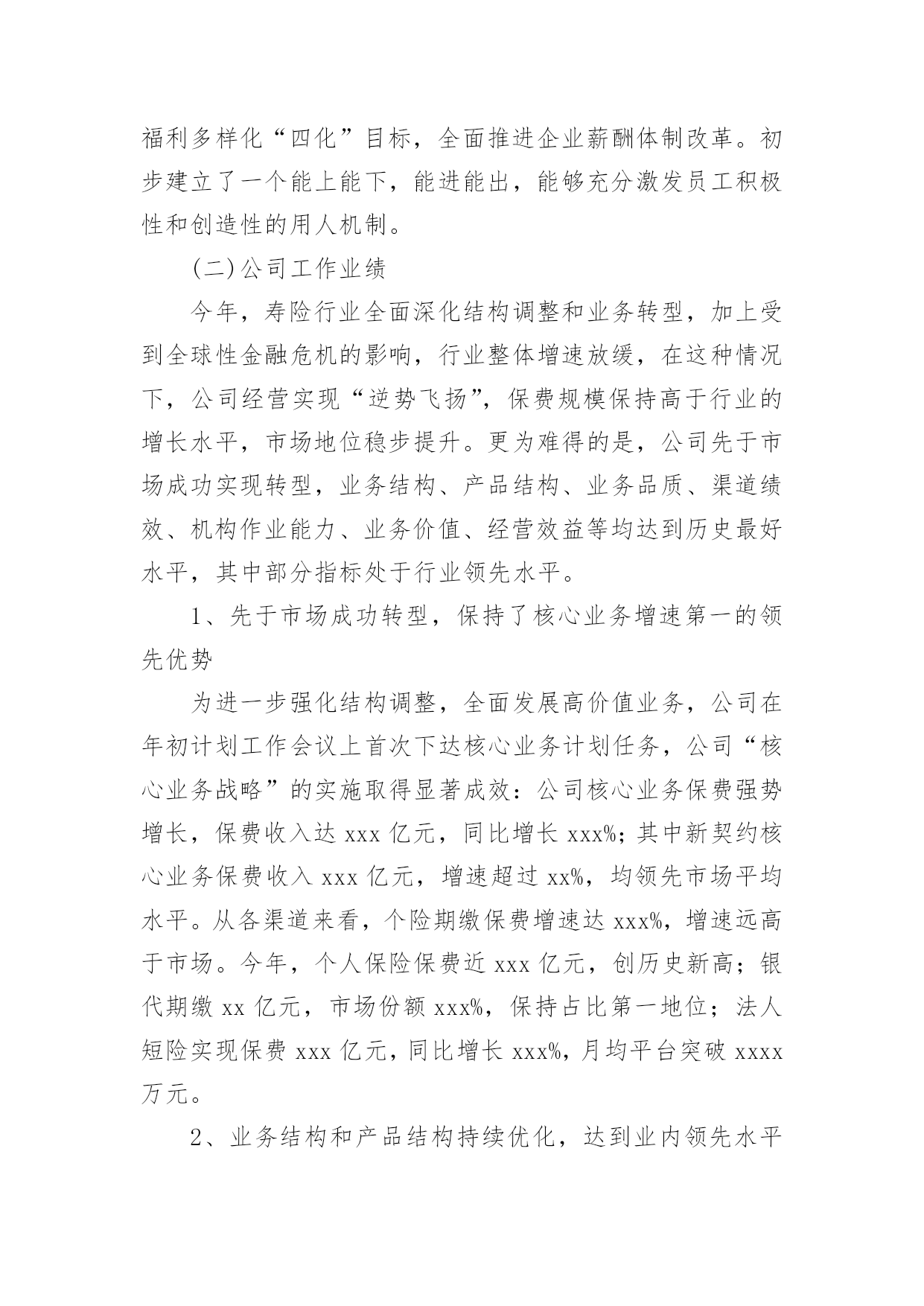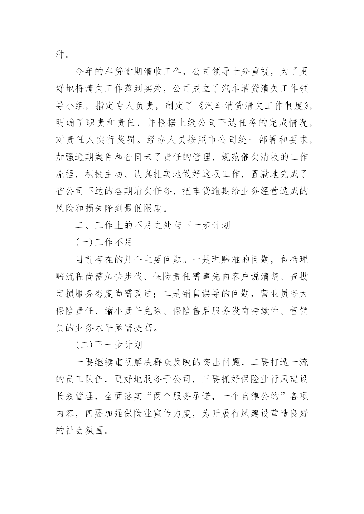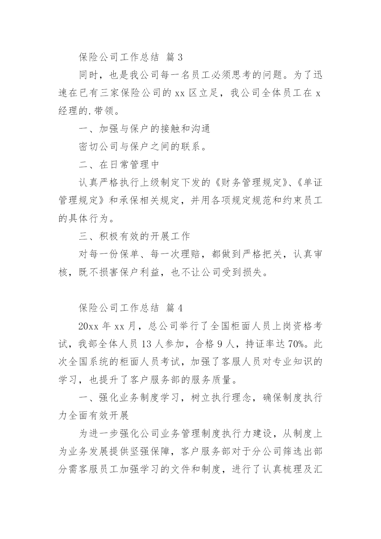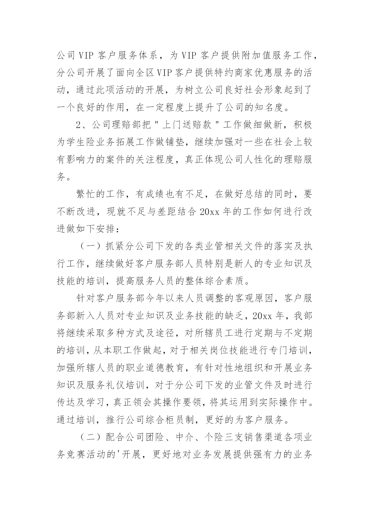 保险公司工作总结总结是对某一特定时间段内的学习和工作生活等表现情况加以回顾和分析的一种书面材料,它有助于我们寻找工作和事物发展的规律,从而掌握并运用这些规律,因此我们需要回头归纳,写一份总结了。但是总结有什么要求呢?以下是小编收集整理的保险公司工作总结,希望能够帮助到大家。保险公司工作总结篇1时间犹如涓涓细流从指尖不经意的溜走,而毫无察觉。20xx年充满了挑战和机遇;20xx年满载着责任与希望;20xx年创造了奇迹和辉煌;20xx年在x总的带领下xx公司走过了一段崎岖漫长但不平凡的创业之路:其中有人继续前行,有人选择放弃,有人还在彷徨,有人一直迷茫,总之大家还在路上。在xxx总的正确领导及细心关怀下我始终以专业的标准严格要求自已;工作上保持一丝不苟工作作风;生活上坚持团结互助永远是一家人;学习上始终如一坚持不懈开拓创新提升自我。去年我主要工作有业管,兼企划及业务督导,下面我对自已主要负责的工作做一个简要总结。一、分公司业管其实就是所有业务数据的管理者,负责业务数据采集,分类,整理,传递等,相当于一个信息发布平台,详细内容包括:每日业务数据及月度KPI制作及发布、月度方案追踪表制作,月度预提及兑现。1、日报表的制作及月度KPI数据分析,其目的在于全面真实准确的反应每天,每月及每年的业务情况,唯有通过“日清月结”式的业务追踪才能真正对目标的达成做到胸有成竹。在xxxx系统还不支持自定义报表的情况下,搭建了整个分公司业务数据指标库,支持日报表,方案兑现等所有数据需求,并在领导的正确指导下全年KPI相关数据等无一差错,今年工作改进方向是:效率高零误差,简单明了内容丰富,美观大方图文并茂。2、众所周知,保险是高激励性行业,所以各种激励方案从出台到最终奖励兑现有多项工作需要去做,最初的方案追踪表到每月月底预提再到最后奖金或实物兑现是由我来完成。激励方案执行的好坏直接关系到整个业务平台的高低及市公司对分公司的整体评价,所以方案制定出来后的追踪以及兑现的准确性就显得尤为重要,特别在实物兑现方面更要求仔细认真,目的就是让每位出单伙伴随时都清楚自已已达到那个档次的奖励,并确保方案兑现时奖金发放零误差,且尽量让实物奖励以最快速度送到伙伴手中。今后努力的方向:追踪报表化,预提精细化,兑现人性化。二、企划及业务督导工作包括多个方面,这项工作做得好,有利于激发代理人的展业积极性,有利于整个业务活动的进行,我所负责的`是公司激励方案签报的上报,修正,特殊处理及实施过程中的追踪与管控,另外就是对市公司营业部甚至到个人的业务情况电话追踪等,如在过程中如遇到相关解决不了问题都会及时联系企划督导室主任协助解决,从而确保政令统一,执行到位。今年工作努力的方向是:积极主动执行到位,微笑服务以礼待人,办事果断服从安排。虽然日常的工作中有很多琐碎的事需要处理,但仍积极配合其他部门的工作,坚持做到只要在我能力范围内可以解决的事一件也不推脱,坚持做到当天就能办完的工作绝不放到第二天再做。因为我坚信只有你尊重帮助了别人,才有得到别人的尊重与帮助。同时因为我所负责的业务比较杂,有时也难免忙中出错,比如有服务不及时,个别统计数据出现偏差,加之有时工作有急躁情绪,急于求成,犯主观主义错误等,导致部分工作未尽人意或工作关系未能处理得很好,但我相信在新的一年里我都将一一改正,同时请领导与同事多加批评指正,因为每个人都渴望成功,都希望得到别人认可与鼓励。今年将是不平凡的一年,今年对我来说更是展翅高飞的一年,今年对xx公司而言无疑是摆脱一切困难高速发展的一年。所以无论外部环境如何变化,我仍然坚信她将傲视整个xx中介市场;无论内部条件如何坚苦,我始终认为她终将战胜所有困难,重新扬帆启航,她就是xx公司,因为我知道路对就不要怕路远,因为我深信在新的一年中x总带领我们抵达成功的彼岸!保险公司工作总结篇220xx年,xxx保险公司在业务上取得了广泛进展,公司提前两个月完成了省公司下达的全年营销任务,各项工作均顺利发展。结合今年工作实际,将公司本年度工作总结如下:一、主要做法与工作业绩(一)公司业务管理做法为了使xx保险公司稳步发展,公司领导制定了《xxx保险公司员工规范管理条例》,采取有效措施加强员工管理,通过不断完善各种管理制度和方法,使其真正贯彻到行动中去,充分积发员工的积极性,使员工出成绩、见效益。业务管理中我们主要采取以下工作措施:1、根据省公司今年下达给我们的全年销售工作计划及任务,公司制定各个部门的周、月、季度、年销售计划。制定计划时本着实事求是、根据各个险种特点、客户特点,部室情况确定每个部门合理的、可实现的目标。在目标确定之后,本着“事事落实,事事督导”的方针,通过加强过程的管理和监控,来确保各部室目标计划的顺利完成。2、注重各个部门的团队建设。一直以来公司都十分注重各部门经理和