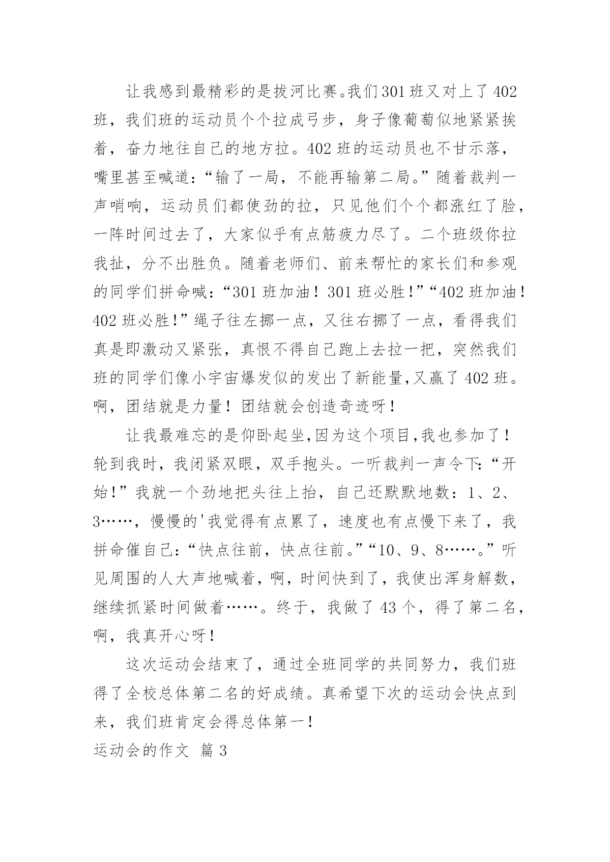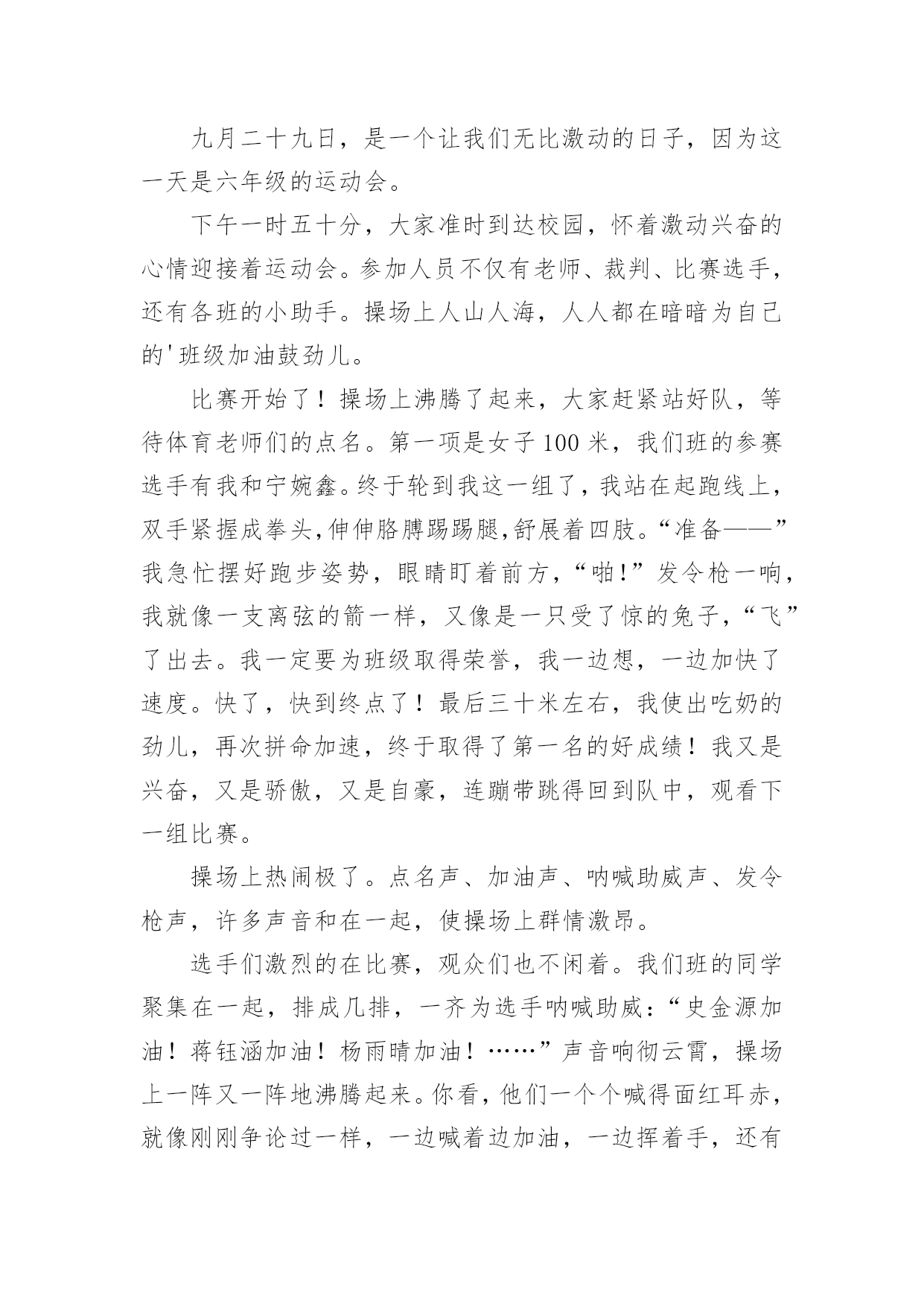 运动会的作文运动会的作文通用(3篇)在学习、工作、生活中,大家总少不了接触作文吧,作文是经过人的思想考虑和语言组织,通过文字来表达一个主题意义的记叙方法。那么你知道一篇好的作文该怎么写吗?以下是小编为大家收集的运动会的作文3篇,供大家参考借鉴,希望可以帮助到有需要的朋友。运动会的作文篇19月30号,一年一度的运动会开幕了,同学们早早的来到了学校,来到操场参加一年一度的运动会,并等待着校运动会的开始。开幕式到了,同学们精神抖擞地向主席台走去,手里拿着各种东西,还喊着口号呢!开幕式走完后,校长宣布运动会正式开始,于是同学们小跑地跑回座位。待一切就绪后,运动员开始上场了。其中,最令我记忆犹新的是女子接力跑和女子长跑。女子接力跑开始了,只见我班第一棒同学卖力的跑着,接着,是第二棒,第三棒,···我班黄鹤雅跑的那叫一个快呀!同学们也十分给力,都站起来了,前面的同学也使劲的敲锣打鼓,大家一起发出排山倒海的掌声,到了最后,我班接力赛跑同学也不辜负同学们的期望,取得了第一名,我看见他们回来时,都大汗淋漓,我知道这跑得第一,是多么不容易呀!接下来,是我班800米女子长跑,我很为我班高兴,因为我班800米女子长跑的是一个专业的.运动员,只见,随着比赛开始,她像一支离弦的箭一样冲了出去,与此同时,“加油、加油”的拍手声更是此起彼伏,只见她跑的奇快,把其他的选手都落下了一大截,而且一直都是这样,这可让我们都啧啧赞叹。“轰”这一结果在全场引起喧然大波,大家都不敢相信自己的眼睛,最后,她一举夺冠。我们班也取得了全年组第二名的好成绩。有一篇作文写得好:蓝天下,有你矫健的身影,热闹的操场上有你坚定的步伐,美丽的鲜花后有你辛勤的汗水,我们的喝彩中,有你的自豪与骄傲!你的飒爽英姿,你的顽强拼搏,你的永不屈服,你是生命乐章中最响的音符。场上的拼搏者,你是我们永远的骄傲!这句话,不也证明了他们吗?这是个难忘的运动会!让我难忘的运动会。运动会的作文篇2上周二,我们学校举行了一场激动人心的运动会。运动会的比赛项目有:跳绳跑,扔沙包,接力跑,转呼啦圈,仰卧起坐,拔河比赛……让我印象最深的是接力跑。我们301班对402班,我拿着话筒拼命地喊:“加油,加油,301班加油!XXX加油!”我们班的运动员个个跑得很快,没有一个迟疑的。402班的运动员,有的像饥饿的兔子见到了胡萝卜,拼命往前冲;有的没有接住棒子又跑回去拿;还有的跑到半路,棒子掉了……。他们气急败坏地追着,我们班全部跑完时,他们最后一棒才跑了一半。最后我们301班获胜了,同学们都欢呼起来。这么有趣的比赛在我们的呐喊声中结束了。让我感到最精彩的是拔河比赛。我们301班又对上了402班,我们班的运动员个个拉成弓步,身子像葡萄似地紧紧挨着,奋力地往自己的地方拉。402班的运动员也不甘示落,嘴里甚至喊道:“输了一局,不能再输第二局。”随着裁判一声哨响,运动员们都使劲的拉,只见他们个个都涨红了脸,一阵时间过去了,大家似乎有点筋疲力尽了。二个班级你拉我扯,分不出胜负。随着老师们、前来帮忙的家长们和参观的同学们拼命喊:“301班加油!301班必胜!”“402班加油!402班必胜!”绳子往左挪一点,又往右挪了一点,看得我们真是即激动又紧张,真恨不得自己跑上去拉一把,突然我们班的同学们像小宇宙爆发似的发出了新能量,又赢了402班。啊,团结就是力量!团结就会创造奇迹呀!让我最难忘的是仰卧起坐,因为这个项目,我也参加了!轮到我时,我闭紧双眼,双手抱头。一听裁判一声令下:“开始!”我就一个劲地把头往上抬,自己还默默地数:1、2、3……,慢慢的'我觉得有点累了,速度也有点慢下来了,我拼命催自己:“快点往前,快点往前。”“10、9、8……。”听见周围的人大声地喊着,啊,时间快到了,我使出浑身解数,继续抓紧时间做着……。终于,我做了43个,得了第二名,啊,我真开心呀!这次运动会结束了,通过全班同学的共同努力,我们班得了全校总体第二名的好成绩。真希望下次的运动会快点到来,我们班肯定会得总体第一!运动会的作文篇3九月二十九日,是一个让我们无比激动的日子,因为这一天是六年级的运动会。下午一时五十分,大家准时到达校园,怀着激动兴奋的心情迎接着运动会。参加人员不仅有老师、裁判、比赛选手,还有各班的小助手。操场上人山人海,人人都在暗暗为自己的'班级加油鼓劲儿。比赛开始了!操场上沸腾了起来,大家赶紧站好队,等待体育老师们的点名。第一项是女子100米,我们班的参赛选手有我和宁婉鑫。终于轮到我这一组了,我站在起跑线上,双手紧握成拳头,伸伸胳膊踢踢腿,舒展着四肢。“准备——”我急忙摆好跑步姿势,眼睛盯着前方,“啪!”发令枪一响,我就像一支离弦的箭一样,又像是一只受了惊的兔子,“飞”了出去。我一定要为班级取得荣誉,我一边想,一边加快了速度。快了,快到终点了!最后三十