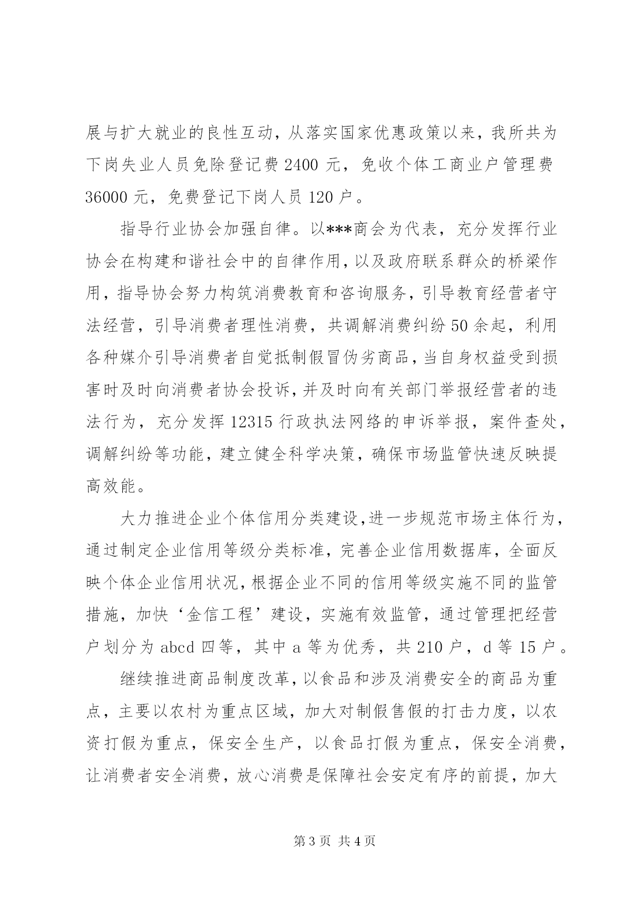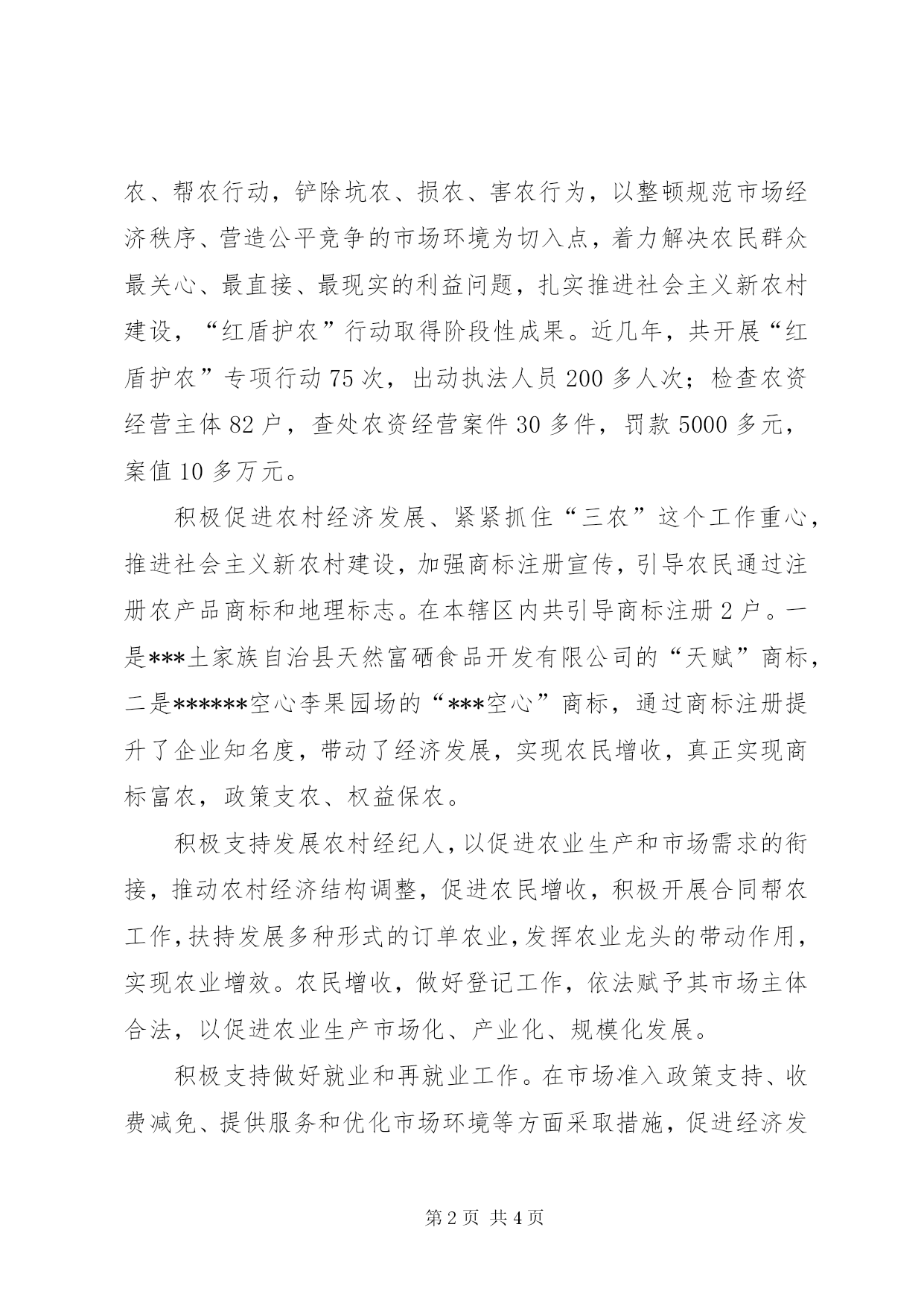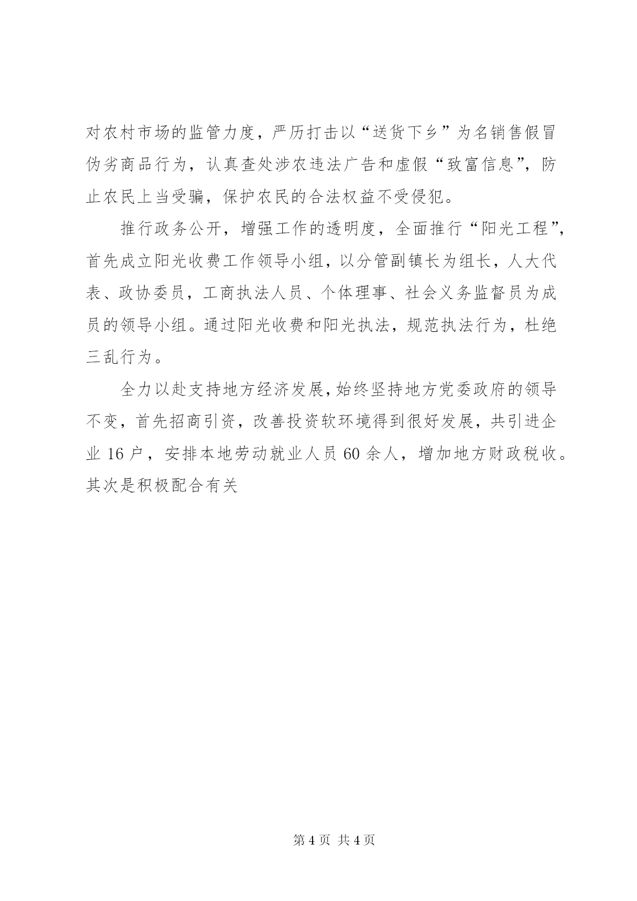 第PAGE\*Arabic\*MERGEFORMAT4页共NUMPAGES\*MERGEFORMAT4页工商所副所长述职述廉报告尊敬的各位领导、各位代表:大家好,我受***县工商行政管理局***工商所委托,现就***工商所在履行工商行政管理职能职责、遵守廉洁从政以及本所人员在维护市场经济秩序、加强党风廉政建设等方面开展的工作和存在的问题以及今后的努力方向向大家作如下汇报:工商机关作为市场监管和行政执法部门,肩负着促进经济发展、维护市场秩序的重任,不断创新市场监管理念,积极营造安全、和谐的消费环境、为促进社会的公平和正义,构建社会主义和谐社会做出应有努力,我所在市场监管中,始终坚持用科学发展观统领各项工作的全局,把促进科学发展作为履行市场监管职责的出发点和落脚点,把握“监管只是手段而不是目的”的原则,尽责尽职抓监管、尽心尽力促发展。首先是积极促进各类市场主体健康发展。发展多种形式的集体经济,支持非公制经济发展,大力支持外商投资企业健康发展,我所共注册个体工商户登记300多户,引导企业注册8户。农业丰则基础强、农民富则国家盛、农村稳则社会安、“三农”问题始终是全党工作的重中之重,是构建社会主义和谐社会的关键所在,我所在镇党委、政府XX县区工商局的领导下,以切实维护农民利益、促进农民增收为着力点,紧紧围绕爱农、护农、帮农行动,铲除坑农、损农、害农行为,以整顿规范市场经济秩序、营造公平竞争的市场环境为切入点,着力解决农民群众最关心、最直接、最现实的利益问题,扎实推进社会主义新农村建设,“红盾护农”行动取得阶段性成果。近几年,共开展“红盾护农”专项行动75次,出动执法人员200多人次;检查农资经营主体82户,查处农资经营案件30多件,罚款5000多元,案值10多万元。积极促进农村经济发展、紧紧抓住“三农”这个工作重心,推进社会主义新农村建设,加强商标注册宣传,引导农民通过注册农产品商标和地理标志。在本辖区内共引导商标注册2户。一是***土家族自治县天然富硒食品开发有限公司的“天赋”商标,二是******空心李果园场的“***空心”商标,通过商标注册提升了企业知名度,带动了经济发展,实现农民增收,真正实现商标富农,政策支农、权益保农。积极支持发展农村经纪人,以促进农业生产和市场需求的衔接,推动农村经济结构调整,促进农民增收,积极开展合同帮农工作,扶持发展多种形式的订单农业,发挥农业龙头的带动作用,实现农业增效。农民增收,做好登记工作,依法赋予其市场主体合法,以促进农业生产市场化、产业化、规模化发展。积极支持做好就业和再就业工作。在市场准入政策支持、收费减免、提供服务和优化市场环境等方面采取措施,促进经济发展与扩大就业的良性互动,从落实国家优惠政策以来,我所共为下岗失业人员免除登记费2400元,免收个体工商业户管理费36000元,免费登记下岗人员120户。指导行业协会加强自律。以***商会为代表,充分发挥行业协会在构建和谐社会中的自律作用,以及政府联系群众的桥梁作用,指导协会努力构筑消费教育和咨询服务,引导教育经营者守法经营,引导消费者理性消费,共调解消费纠纷50余起,利用各种媒介引导消费者自觉抵制假冒伪劣商品,当自身权益受到损害时及时向消费者协会投诉,并及时向有关部门举报经营者的违法行为,充分发挥12315行政执法网络的申诉举报,案件查处,调解纠纷等功能,建立健全科学决策,确保市场监管快速反映提高效能。大力推进企业个体信用分类建设,进一步规范市场主体行为,通过制定企业信用等级分类标准,完善企业信用数据库,全面反映个体企业信用状况,根据企业不同的信用等级实施不同的监管措施,加快‘金信工程’建设,实施有效监管,通过管理把经营户划分为abcd四等,其中a等为优秀,共210户,d等15户。继续推进商品制度改革,以食品和涉及消费安全的商品为重点,主要以农村为重点区域,加大对制假售假的打击力度,以农资打假为重点,保安全生产,以食品打假为重点,保安全消费,让消费者安全消费,放心消费是保障社会安定有序的前提,加大对农村市场的监管力度,严历打击以“送货下乡”为名销售假冒伪劣商品行为,认真查处涉农违法广告和虚假“致富信息”,防止农民上当受骗,保护农民的合法权益不受侵犯。推行政务公开,增强工作的透明度,全面推行“阳光工程”,首先成立阳光收费工作领导小组,以分管副镇长为组长,人大代表、政协委员,工商执法人员、个体理事、社会义务监督员为成员的领导小组。通过阳光收费和阳光执法,规范执法行为,杜绝三乱行为。全力以赴支持地方经济发展,始终坚持地方党委政府的领导不变,首先招商引资,改善投资软环境得到很好发展,共引进企业16户,安排本地劳动就业人员60余人,增加地方财政税收。其次是积极配合有关