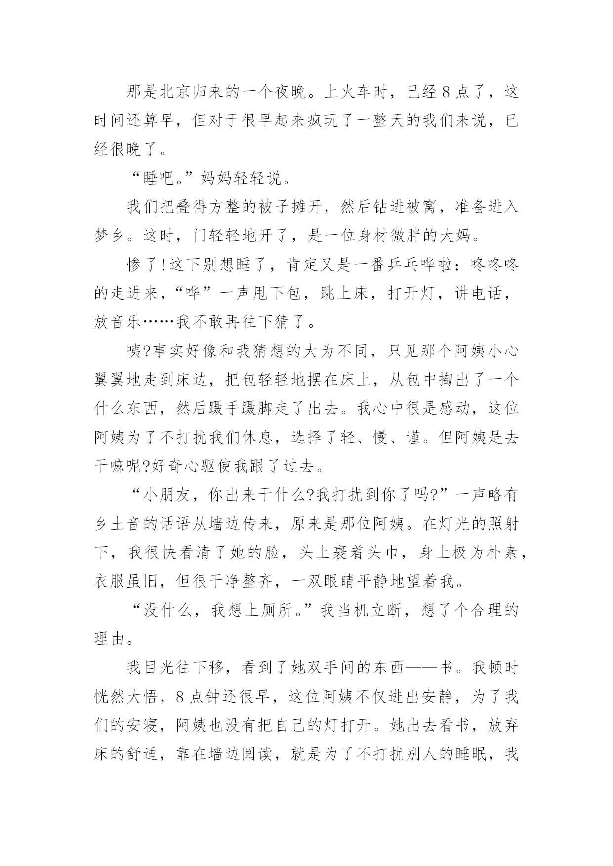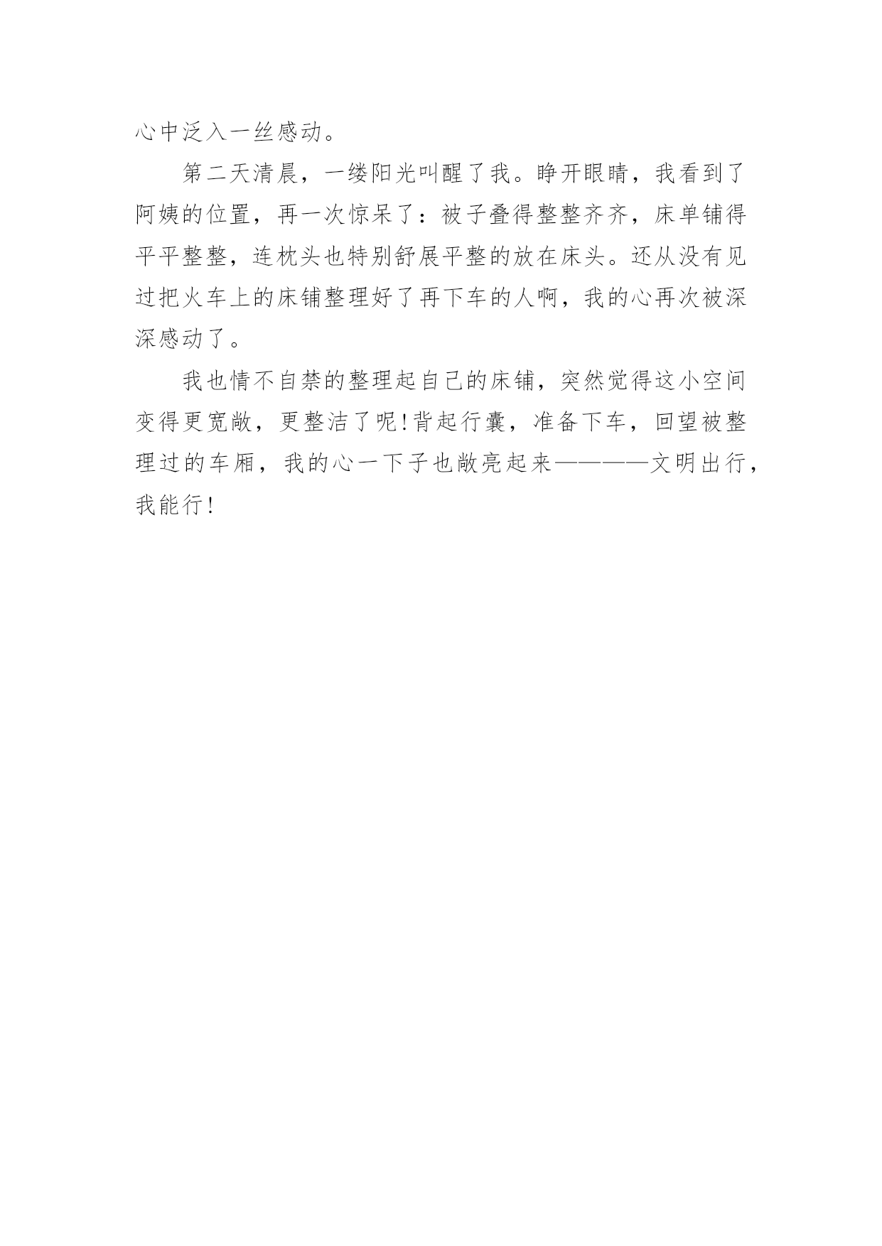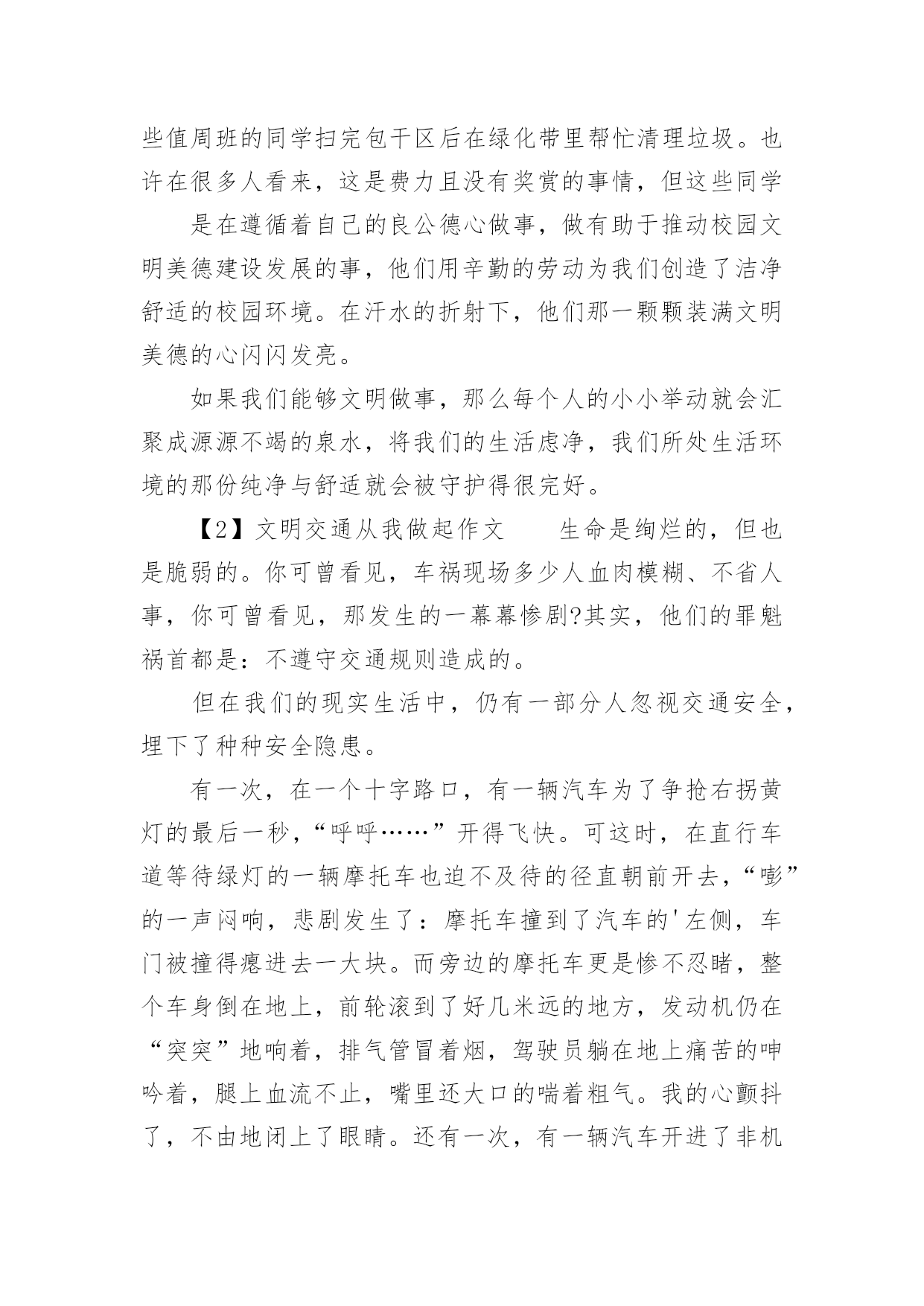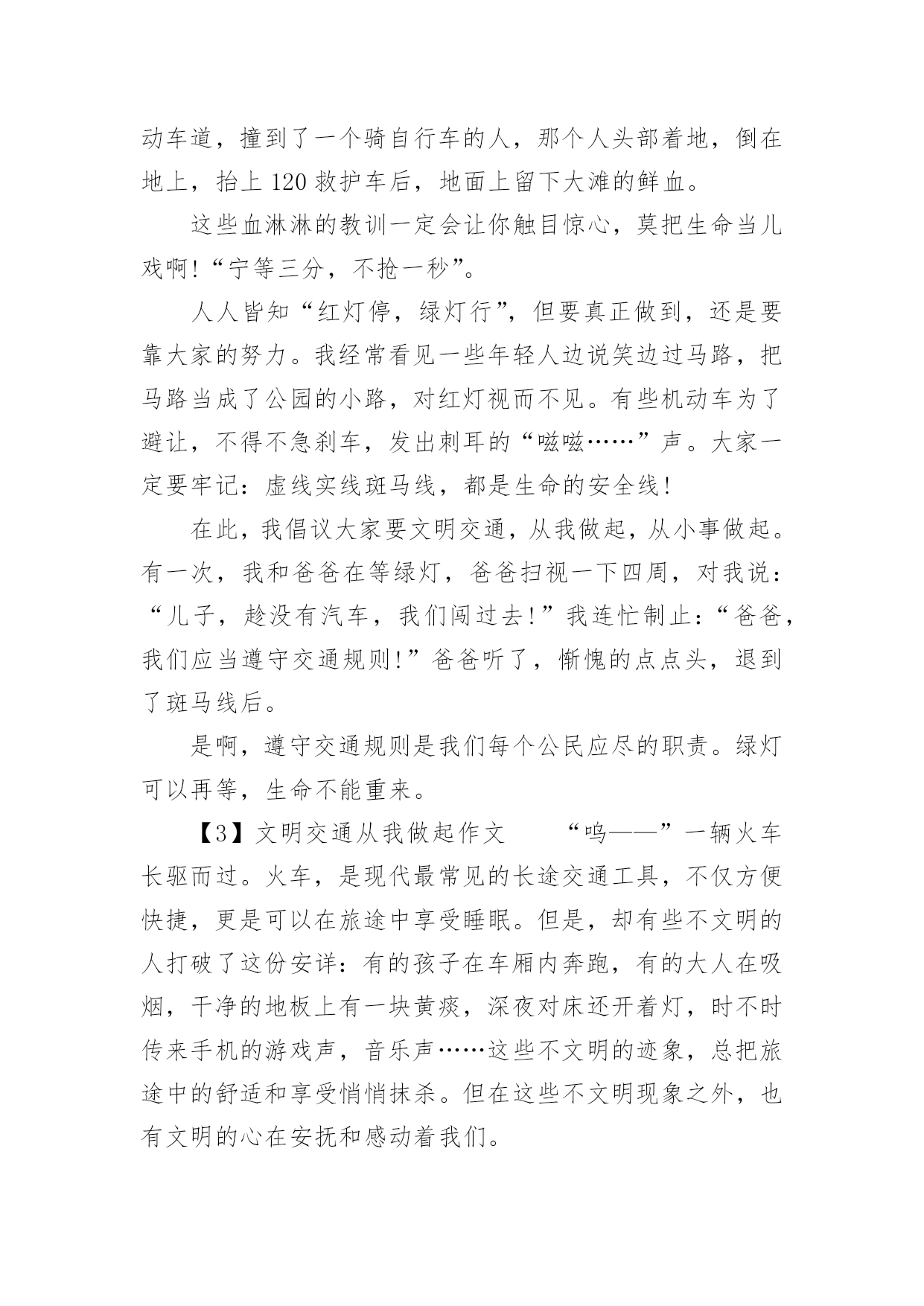 文明交通从我做起作文2017年文明交通从我做起作文文明是一种良好的品质,是一种受人喜爱的行为。下面是小编整理的关于文明交通从我做起作文,希望大家认真阅读!【1】文明交通从我做起作文从小到大,家长、老师们常教育我们要做个讲文明、懂礼貌的孩子,那你知道文明是什么吗?人们说,文明是相遇时的微笑,是同学困难时的热情帮助,是不小心撞上对方时的一声“对不起”,是平时与人相处时的亲切,是在公共汽车上的主动让座。然而,在我们现实社会中,不文明的行为数不胜数,诸如:某些人在公共场合随意吐痰,不在乎他人感受;还有些人,在拥挤的公车上,常常会为了一点小事便肆意谩骂他人;更过分的是,一些人在面对跌倒老人时,置之不理地扬长而去,都怕惹上麻烦的心里让人既生气又无奈。这些不讲文明礼德的行为,是深藏在社会中的毒瘤,影响我们青少年一代的成长,阻碍社会的发展。我们校园的草地上通常会竖着“爱护花草,人人有责”之类的标牌,大而显眼。有的同学却视而不见,坦然地、习惯式地从草坪上踏过,似乎并不认为这是不文明不道德的行为。他们没有意识到被他们踩在脚下的花草也许会因此枯萎死去,原本和谐舒适的校园环境会因此被破坏。我曾见过一些值周班的同学扫完包干区后在绿化带里帮忙清理垃圾。也许在很多人看来,这是费力且没有奖赏的事情,但这些同学是在遵循着自己的良公德心做事,做有助于推动校园文明美德建设发展的事,他们用辛勤的劳动为我们创造了洁净舒适的校园环境。在汗水的折射下,他们那一颗颗装满文明美德的心闪闪发亮。如果我们能够文明做事,那么每个人的小小举动就会汇聚成源源不竭的泉水,将我们的生活虑净,我们所处生活环境的那份纯净与舒适就会被守护得很完好。【2】文明交通从我做起作文生命是绚烂的,但也是脆弱的。你可曾看见,车祸现场多少人血肉模糊、不省人事,你可曾看见,那发生的一幕幕惨剧?其实,他们的罪魁祸首都是:不遵守交通规则造成的。但在我们的现实生活中,仍有一部分人忽视交通安全,埋下了种种安全隐患。有一次,在一个十字路口,有一辆汽车为了争抢右拐黄灯的最后一秒,“呼呼……”开得飞快。可这时,在直行车道等待绿灯的一辆摩托车也迫不及待的径直朝前开去,“嘭”的一声闷响,悲剧发生了:摩托车撞到了汽车的'左侧,车门被撞得瘪进去一大块。而旁边的摩托车更是惨不忍睹,整个车身倒在地上,前轮滚到了好几米远的地方,发动机仍在“突突”地响着,排气管冒着烟,驾驶员躺在地上痛苦的呻吟着,腿上血流不止,嘴里还大口的喘着粗气。我的心颤抖了,不由地闭上了眼睛。还有一次,有一辆汽车开进了非机动车道,撞到了一个骑自行车的人,那个人头部着地,倒在地上,抬上120救护车后,地面上留下大滩的鲜血。这些血淋淋的教训一定会让你触目惊心,莫把生命当儿戏啊!“宁等三分,不抢一秒”。人人皆知“红灯停,绿灯行”,但要真正做到,还是要靠大家的努力。我经常看见一些年轻人边说笑边过马路,把马路当成了公园的小路,对红灯视而不见。有些机动车为了避让,不得不急刹车,发出刺耳的“嗞嗞……”声。大家一定要牢记:虚线实线斑马线,都是生命的安全线!在此,我倡议大家要文明交通,从我做起,从小事做起。有一次,我和爸爸在等绿灯,爸爸扫视一下四周,对我说:“儿子,趁没有汽车,我们闯过去!”我连忙制止:“爸爸,我们应当遵守交通规则!”爸爸听了,惭愧的点点头,退到了斑马线后。是啊,遵守交通规则是我们每个公民应尽的职责。绿灯可以再等,生命不能重来。【3】文明交通从我做起作文“呜——”一辆火车长驱而过。火车,是现代最常见的长途交通工具,不仅方便快捷,更是可以在旅途中享受睡眠。但是,却有些不文明的人打破了这份安详:有的孩子在车厢内奔跑,有的大人在吸烟,干净的地板上有一块黄痰,深夜对床还开着灯,时不时传来手机的游戏声,音乐声……这些不文明的迹象,总把旅途中的舒适和享受悄悄抹杀。但在这些不文明现象之外,也有文明的心在安抚和感动着我们。那是北京归来的一个夜晚。上火车时,已经8点了,这时间还算早,但对于很早起来疯玩了一整天的我们来说,已经很晚了。“睡吧。”妈妈轻轻说。我们把叠得方整的被子摊开,然后钻进被窝,准备进入梦乡。这时,门轻轻地开了,是一位身材微胖的大妈。惨了!这下别想睡了,肯定又是一番乒乓哗啦:咚咚咚的走进来,“哗”一声甩下包,跳上床,打开灯,讲电话,放音乐……我不敢再往下猜了。咦?事实好像和我猜想的大为不同,只见那个阿姨小心翼翼地走到床边,把包轻轻地摆在床上,从包中掏出了一个什么东西,然后蹑手蹑脚走了出去。我心中很是感动,这位阿姨为了不打扰我们休息,选择了轻、慢、谨。但阿姨是去干嘛呢?好奇心驱使我跟了过去。“小朋友,你出来干什么?我打扰到你了吗?”一声略有乡土音的话语从墙边传来,原来是那位阿姨。在灯光的照射下,我很快看清了她的脸,头上裹着头巾,身上极为朴素,衣服虽旧,但很干净整齐,一双眼睛