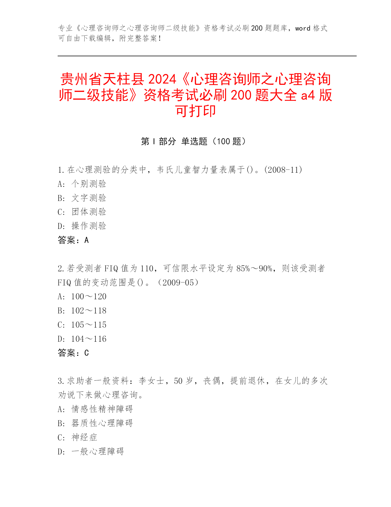 贵州省天柱县2024《心理咨询师之心理咨询师二级技能》资格考试必刷200题大全a4版可打印