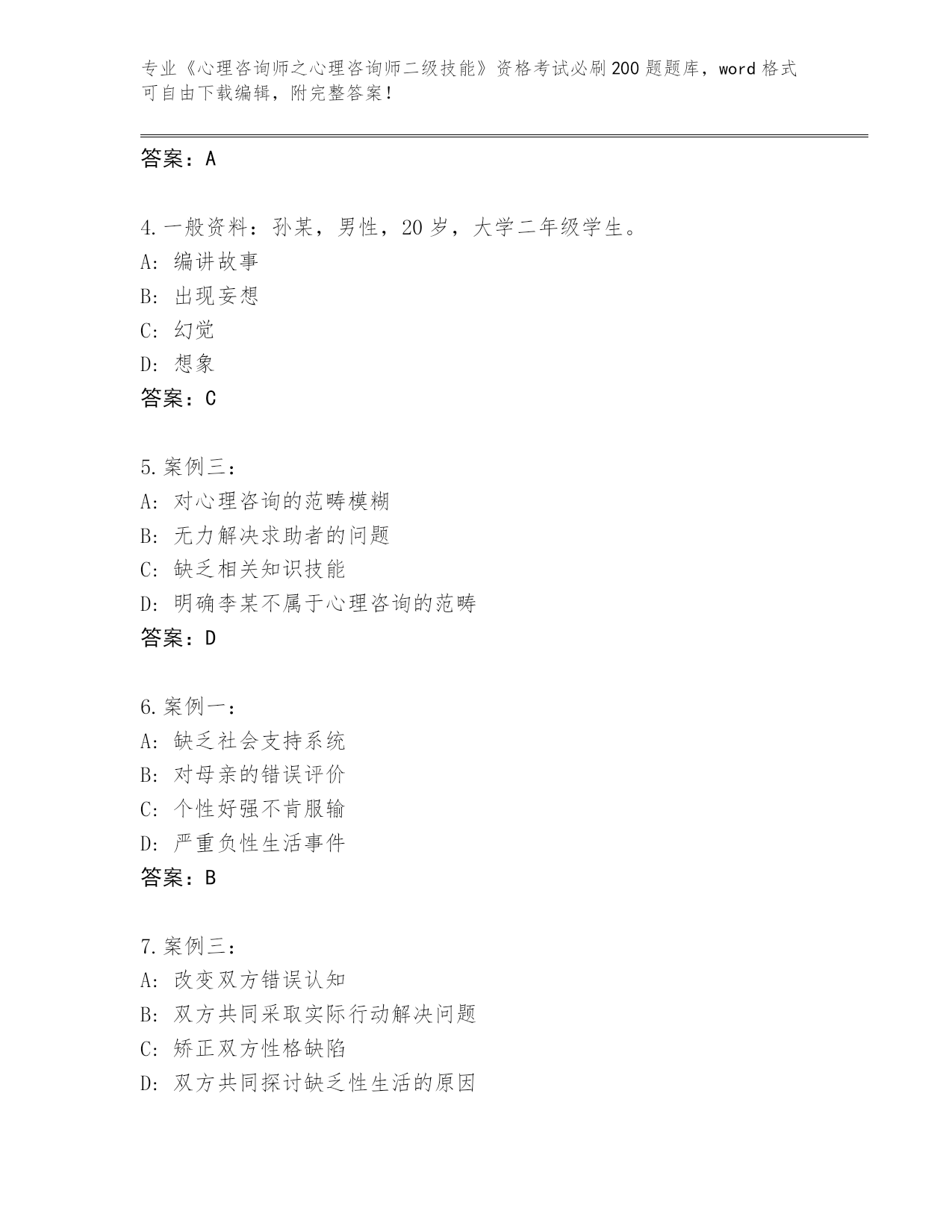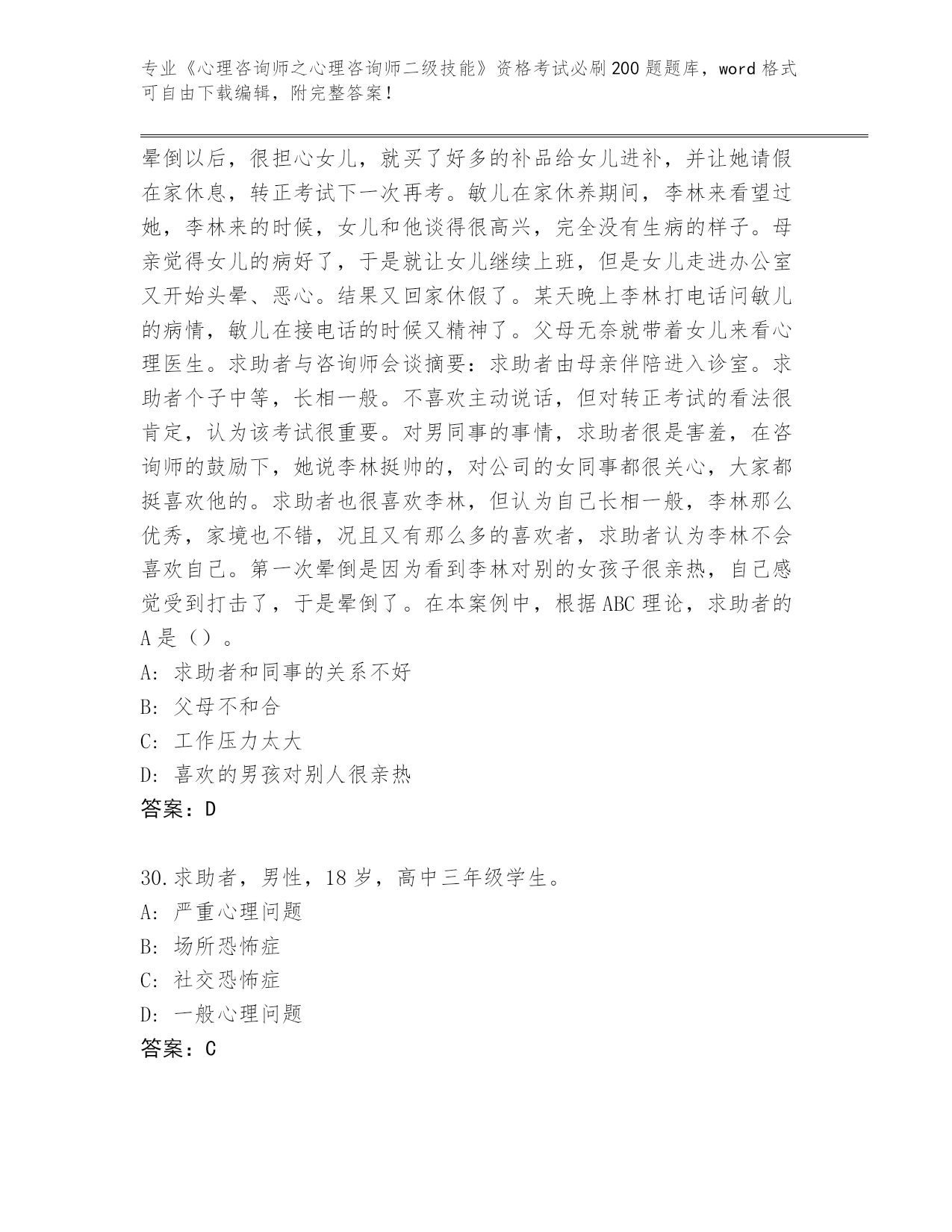 浙江省内部使用《心理咨询师之心理咨询师二级技能》考试必刷200题大全A4版可打印
