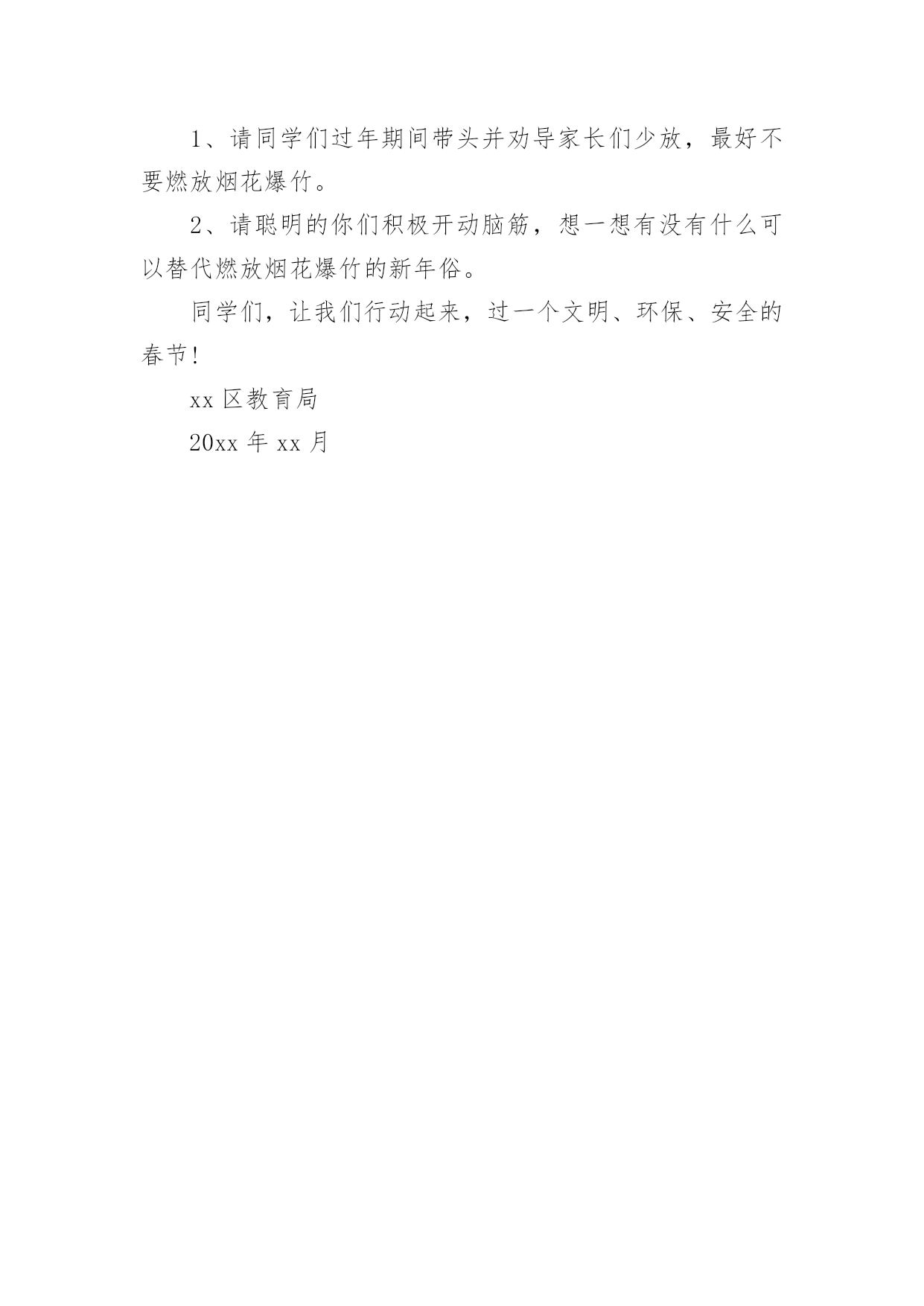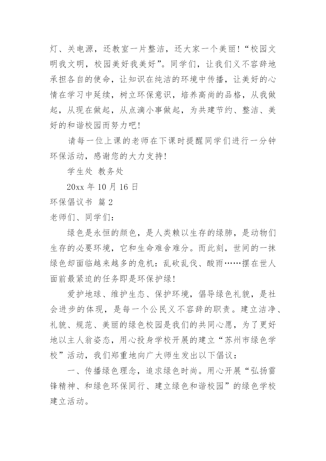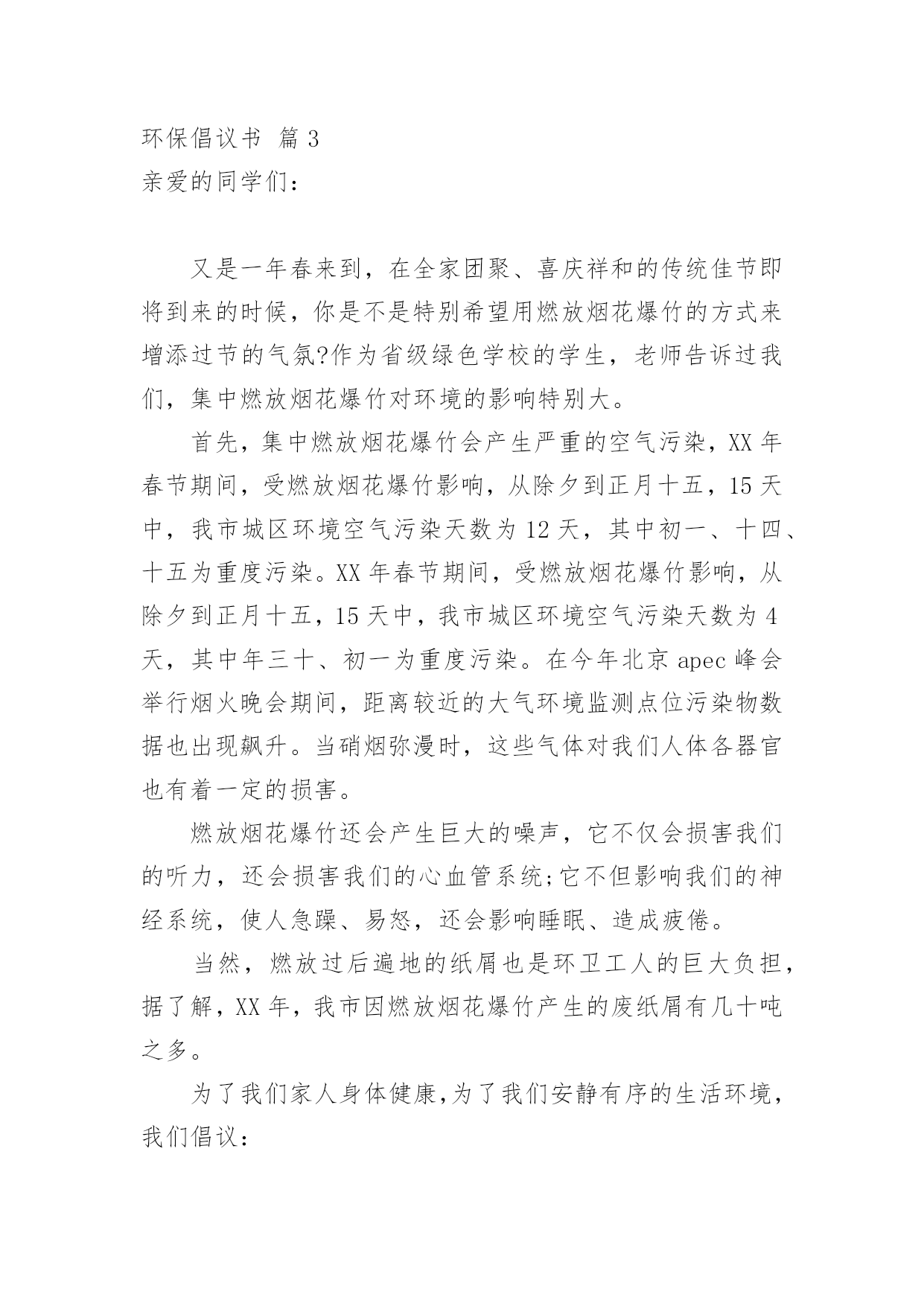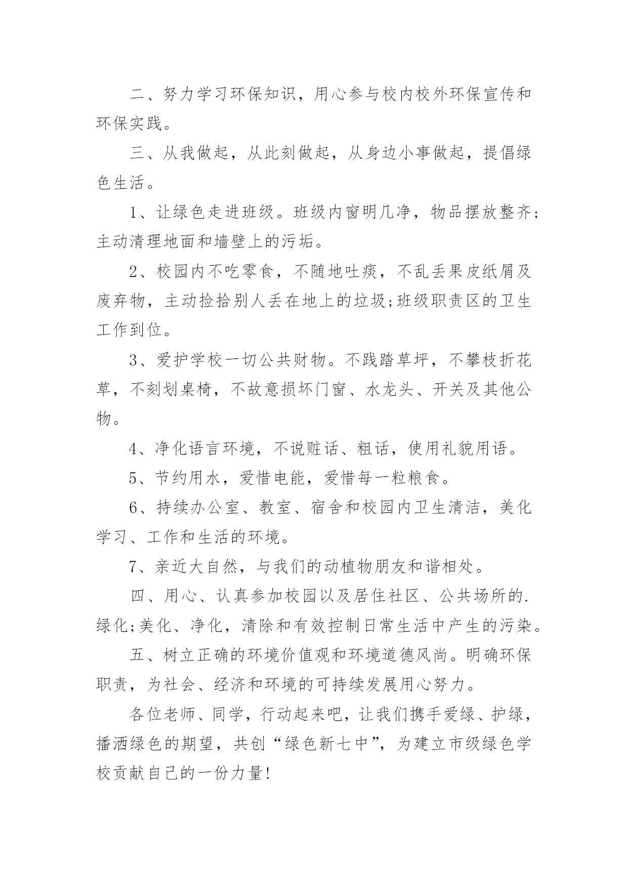 环保倡议书实用的环保倡议书三篇在快速变化和不断变革的新时代,倡议书对我们的作用越来越大,倡议书不是对某个人或某一小集体而发的,它的受众往往是广大群众,或是部门的所有人,或是一个地区的所有人,甚至是全国人民。那么,怎么去写倡议书呢?下面是小编收集整理的环保倡议书3篇,仅供参考,欢迎大家阅读。环保倡议书篇1敬爱的老师们,亲爱的同学们:学校是我们日常活动的基本场所,优美的校园环境不仅是教学秩序的重要保障,也是展现我们良好品德修养与高尚道德情怀的重要窗口。当你在这美丽的校园中学习,为我们美好的未来而努力着时,相信我们每一个同学都渴望有一个干净的校园,渴望我们有一个良好的生活环境,渴望清洁,渴望绿色。为了增强大家的环境保护意识,营造建设节约型校园的良好氛围,让校园、班级环境更加整洁靓丽,我们恳切地向全校师生们提出如下倡议:在你离开教室的时候,请放慢你匆忙的脚步,花1分钟的时间带走自己身边的垃圾,请不要随手乱丢废纸、废塑料等杂物,把在教室产生的垃圾带出教室,离开教室时顺手关灯、关电源,还教室一片整洁,还大家一个美丽!“校园文明我文明,校园美好我美好”。同学们,让我们义不容辞地承担各自的使命,让知识在纯洁的环境中传播,让美好的心情在学习中延续,树立环保意识,培养高尚的品格,从我做起,从现在做起,从点滴小事做起,为共建节约、整洁、美好的和谐校园而努力吧!请每一位上课的老师在下课时提醒同学们进行一分钟环保活动,感谢您的大力支持!学生处教务处20xx年10月16日环保倡议书篇2老师们、同学们:绿色是永恒的颜色,是人类赖以生存的绿肺,是动物们生存的必要环境,它和生命难舍难分。而此刻,世间的一抹绿色却面临越来越多的危机:乱砍乱伐、酸雨……摆在世人面前最紧迫的任务即是环保护绿!爱护地球、维护生态、保护环境,倡导绿色礼貌,是社会进步的体现,是每一个公民义不容辞的职责。建立洁净、礼貌、规范、美丽的绿色校园是我们的共同心愿,为了更好地以主人翁姿态,用心投身学校开展的建立“苏州市绿色学校”活动,我们郑重地向广大师生发出以下倡议:一、传播绿色理念,追求绿色时尚。用心开展“弘扬雷锋精神、和绿色环保同行、建立绿色和谐校园”的绿色学校建立活动。二、努力学习环保知识,用心参与校内校外环保宣传和环保实践。三、从我做起,从此刻做起,从身边小事做起,提倡绿色生活。1、让绿色走进班级。班级内窗明几净,物品摆放整齐;主动清理地面和墙壁上的污垢。2、校园内不吃零食,不随地吐痰,不乱丢果皮纸屑及废弃物,主动捡拾别人丢在地上的垃圾;班级职责区的卫生工作到位。3、爱护学校一切公共财物。不践踏草坪,不攀枝折花草,不刻划桌椅,不故意损坏门窗、水龙头、开关及其他公物。4、净化语言环境,不说赃话、粗话,使用礼貌用语。5、节约用水,爱惜电能,爱惜每一粒粮食。6、持续办公室、教室、宿舍和校园内卫生清洁,美化学习、工作和生活的环境。7、亲近大自然,与我们的动植物朋友和谐相处。四、用心、认真参加校园以及居住社区、公共场所的.绿化;美化、净化,清除和有效控制日常生活中产生的污染。五、树立正确的环境价值观和环境道德风尚。明确环保职责,为社会、经济和环境的可持续发展用心努力。各位老师、同学,行动起来吧,让我们携手爱绿、护绿,播洒绿色的期望,共创“绿色新七中”,为建立市级绿色学校贡献自己的一份力量!环保倡议书篇3亲爱的同学们:又是一年春来到,在全家团聚、喜庆祥和的传统佳节即将到来的时候,你是不是特别希望用燃放烟花爆竹的方式来增添过节的气氛?作为省级绿色学校的学生,老师告诉过我们,集中燃放烟花爆竹对环境的影响特别大。首先,集中燃放烟花爆竹会产生严重的空气污染,XX年春节期间,受燃放烟花爆竹影响,从除夕到正月十五,15天中,我市城区环境空气污染天数为12天,其中初一、十四、十五为重度污染。XX年春节期间,受燃放烟花爆竹影响,从除夕到正月十五,15天中,我市城区环境空气污染天数为4天,其中年三十、初一为重度污染。在今年北京apec峰会举行烟火晚会期间,距离较近的大气环境监测点位污染物数据也出现飙升。当硝烟弥漫时,这些气体对我们人体各器官也有着一定的损害。燃放烟花爆竹还会产生巨大的噪声,它不仅会损害我们的听力,还会损害我们的心血管系统;它不但影响我们的神经系统,使人急躁、易怒,还会影响睡眠、造成疲倦。当然,燃放过后遍地的纸屑也是环卫工人的巨大负担,据了解,XX年,我市因燃放烟花爆竹产生的废纸屑有几十吨之多。为了我们家人身体健康,为了我们安静有序的生活环境,我们倡议:1、请同学们过年期间带头并劝导家长们少放,最好不要燃放烟花爆竹。2、请聪明的你们积极开动脑筋,想一想有没有什么可以替代燃放烟花爆竹的新年俗。同学们,让我们行动起来,过一个文明、环保、安全的春节!xx区教育局20xx年xx月