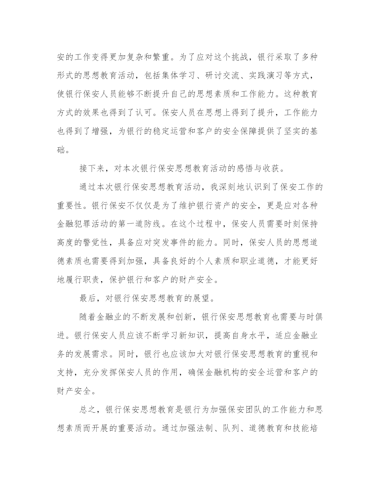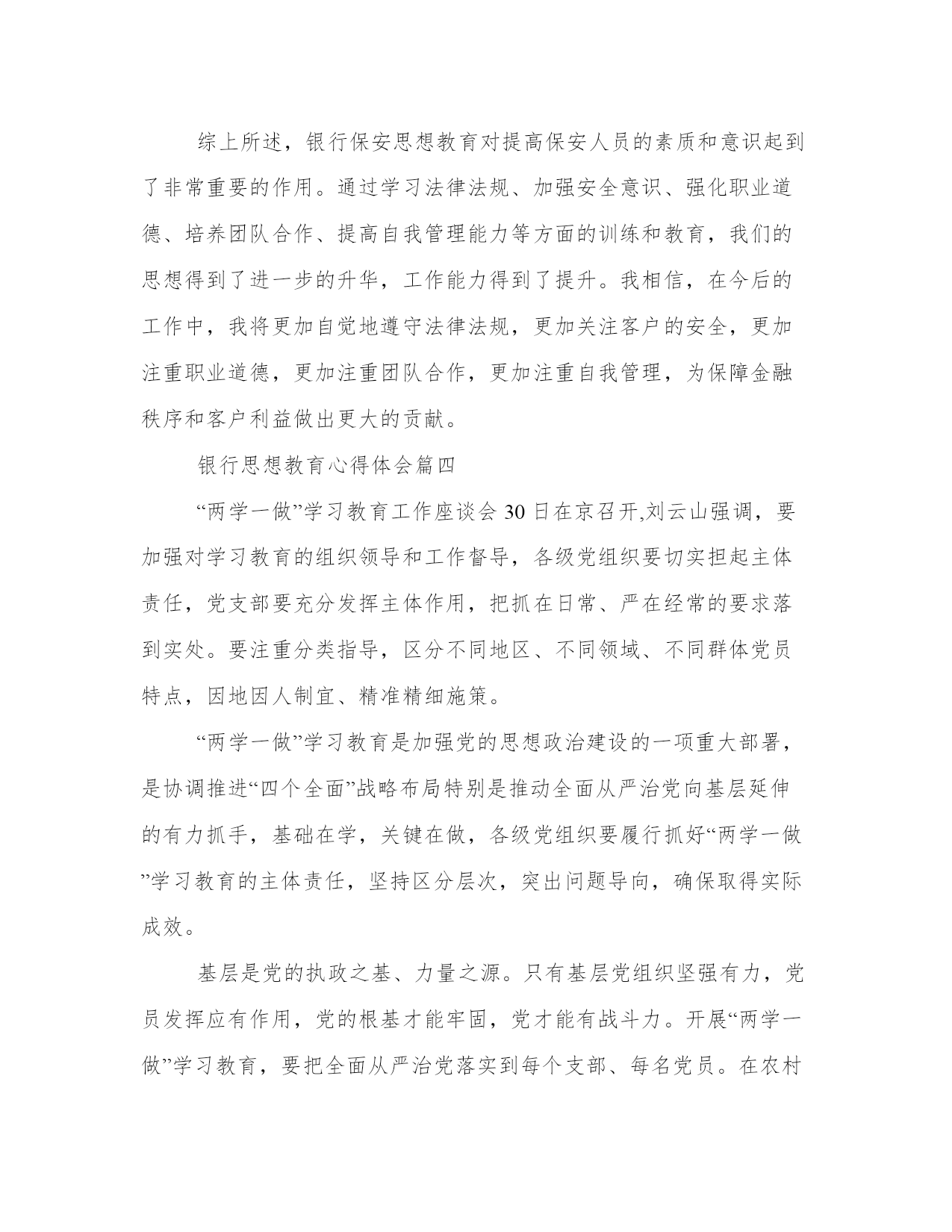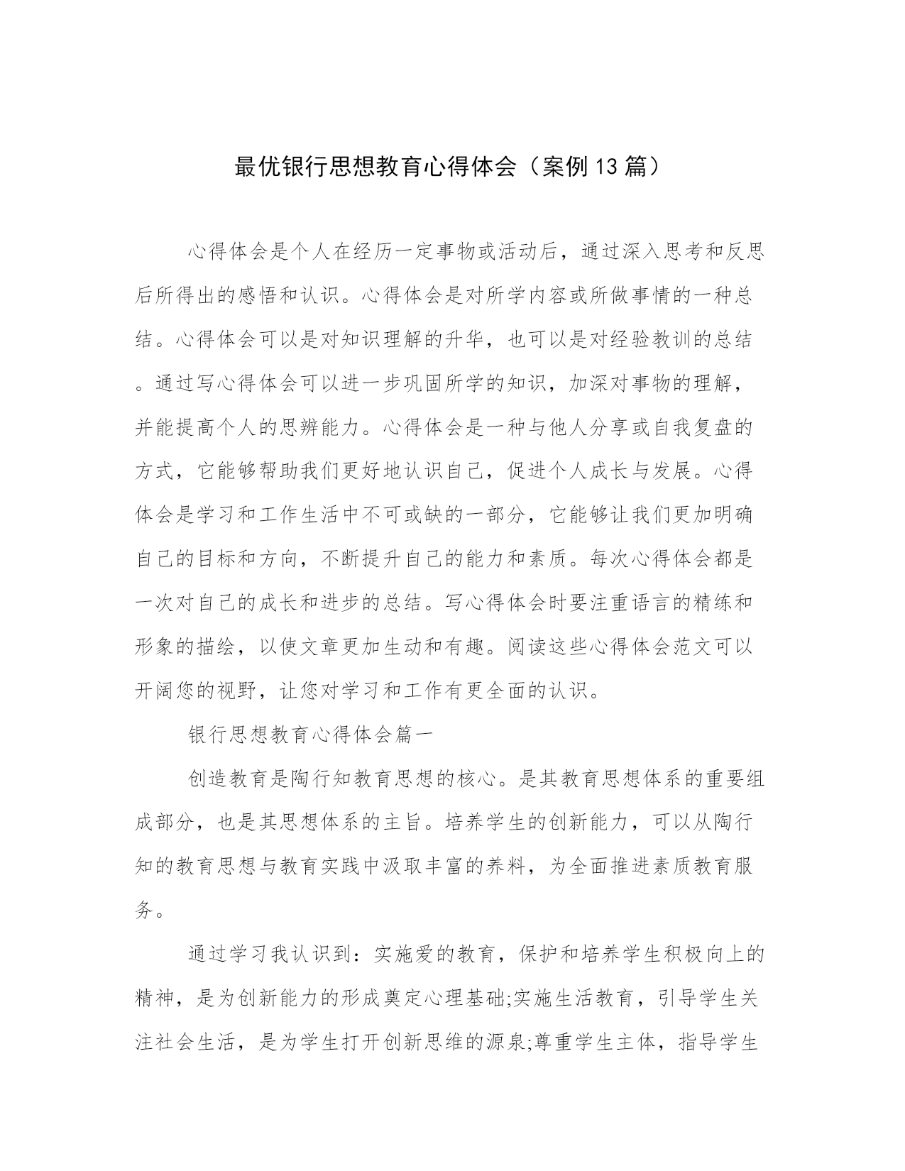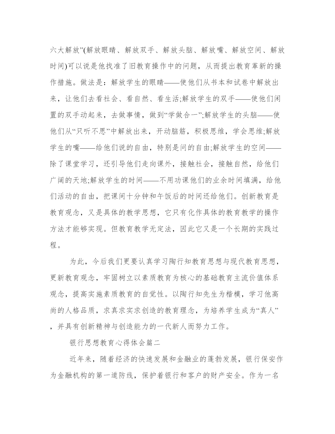 最优银行思想教育心得体会(案例13篇)心得体会是个人在经历一定事物或活动后,通过深入思考和反思后所得出的感悟和认识。心得体会是对所学内容或所做事情的一种总结。心得体会可以是对知识理解的升华,也可以是对经验教训的总结。通过写心得体会可以进一步巩固所学的知识,加深对事物的理解,并能提高个人的思辨能力。心得体会是一种与他人分享或自我复盘的方式,它能够帮助我们更好地认识自己,促进个人成长与发展。心得体会是学习和工作生活中不可或缺的一部分,它能够让我们更加明确自己的目标和方向,不断提升自己的能力和素质。每次心得体会都是一次对自己的成长和进步的总结。写心得体会时要注重语言的精练和形象的描绘,以使文章更加生动和有趣。阅读这些心得体会范文可以开阔您的视野,让您对学习和工作有更全面的认识。银行思想教育心得体会篇一创造教育是陶行知教育思想的核心。是其教育思想体系的重要组成部分,也是其思想体系的主旨。培养学生的创新能力,可以从陶行知的教育思想与教育实践中汲取丰富的养料,为全面推进素质教育服务。通过学习我认识到:实施爱的教育,保护和培养学生积极向上的精神,是为创新能力的形成奠定心理基础;实施生活教育,引导学生关注社会生活,是为学生打开创新思维的源泉;尊重学生主体,指导学生学会学习,是培养创新能力的学习操练;实行“六大解放”,焕发学生活力,是培养创新能力的操作要求。一、实施爱的教育,保护培养学生积极向上的精神。爱的教育是少年、儿童教育的基本原则和方法。陶行知先生的“爱满天下”更把爱的教育发扬光大。教师对学生的爱在教育中具有重要的作用。陶行知说:“小孩子的体力与心理都需要适当的营养。有了适当的营养,才能发生高度的创造力。”人在小学阶段其心理的基本需要中,情感的需要是第一位的。师爱犹如心理发展的精神乳汁,哺育儿童的心灵发展。师爱能营造出和谐、温馨、亲切的师生关系。在这种师生关系中,学生不仅乐学,而且个性会得到充分发展,形成积极向上的精神状态。这是创造能力形成的心理基础。不仅学习陶行知“捧着一颗心来,不带半根草去”献身教育的品格,更要有“爱满天下”的高尚情怀,发扬“因为差,更要抓”“因为差,更要爱”的敬业精神。教师对后进生应有要有一颗爱心,它不埋在胸膛里,而应擎在手上,高高举起,让学生看得见,摸得着,时时感觉到。老师对后进生更要倾注真诚的爱心,使学生感到老师的亲切、集体的温暖,从而树起生活的信心,提高学习的积极性。多给学生关照和温暖。对学习好的学生热心引导,对学习差的学生及调皮的学生也是从爱开始,进行指导帮助,不歧视、不训斥、不讽刺挖苦。学生们感受到老师的爱,有了良好的情绪,学习的积极性也就提高了。使学生们感受时代的脉搏,培育爱他人、爱祖国的情感。情感是理智的基础,善良的心和爱他人、爱祖国的情操也是创新智慧的心理基础。二、实施生活教育,引导学生关注社会生活。陶行知的“生活教育”理论是全新的教育思想,他指出:生活教育是生活所原有,生活所自营,生活所必须的教育。教育的根本意义是生活的变化。教育是为了生活,离开了生活的改进,教育就失去了意义。这就要求教育要从课堂和书本走出来,去关注社会生活,即关注生活重于关注书本。以生活为中心的教育,不仅使书本知识变活,而且使学生开阔视野,从社会生活中吸取综合的多方面的知识,从而获得思想和精神力量。把日常的教育和教学都要和社会生活结合起来,在课堂教学中,书本知识要联系社会实际,引导学生关心家乡的建设、国家的发展、科学技术的成就和丰富多彩的社会文化生活。这样,不仅使学生开阔了眼界,书本上的知识活了起来,而且引发了学生的学习兴趣和学习积极性。组织学生社会实践活动,让学生在文明宣传、公益劳动、社会调查及社会服务中去观察、去感受、去锻炼、去分辨,以吸取有益的思想和知识。三、尊重学生主体,指导学生学会学习。会学习才能创造。学习的欲望和能力,即自己主动获取知识、解决问题的能力,是创新精神和创造能力的重要基础之一。学习是人主观的精神活动,要获取知识,人必须积极地使用并协调自己的感官,发动自己的大脑,并做出主观的意志努力。可是在我们的传统教学中,学生只是知识的容器和被塑造的材料,完全处于被动的地位。教师灌输花时多,效果差,学生听、记、背学得苦,求知欲没有了,创造力抑制了。这样的教学状况怎能培养学生的创新精神和能力呢?因此,在教学操作上,必须改变“老师讲,学生听”的教学模式,把学生放在主体的地位。陶行知的教学思想,“教师的责任不在教,而在教学,教学生学。”“先生教的法子必须根据学生学的法子。”把学生放在主体的地位,探索“引导学生学”的方法,把教学过程变成“教学做合一”的过程。,教学固然要发挥教师积极指导的作用,但决定教学效果的主要还在于学生的学习效果,只有学生愿意学、认真学、乐意学,才算是教学效果好。四、实施“六大解放”,焕