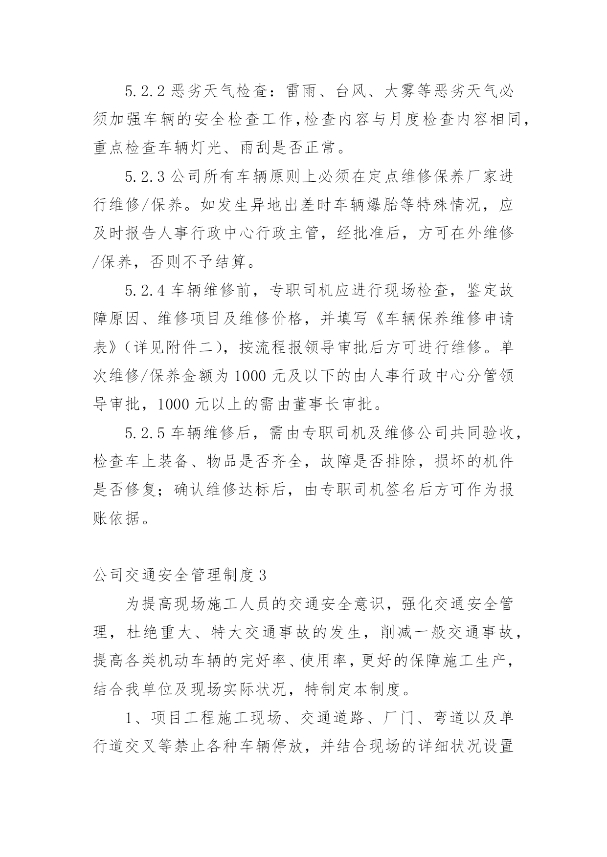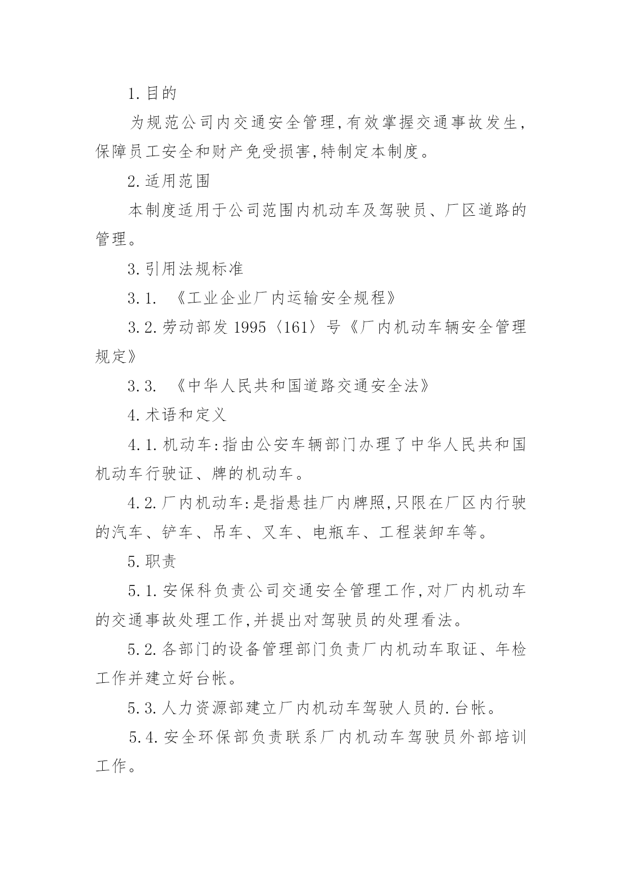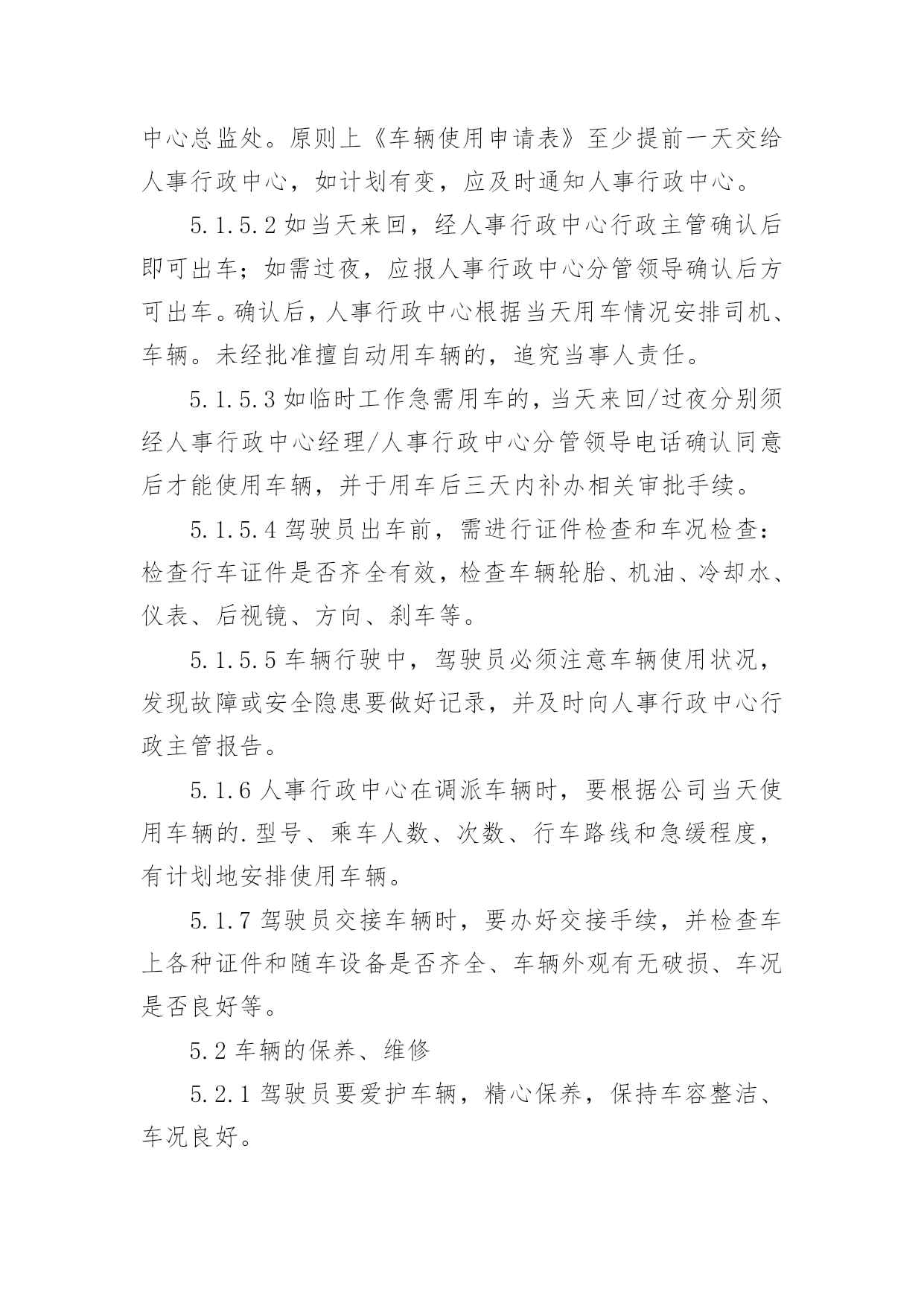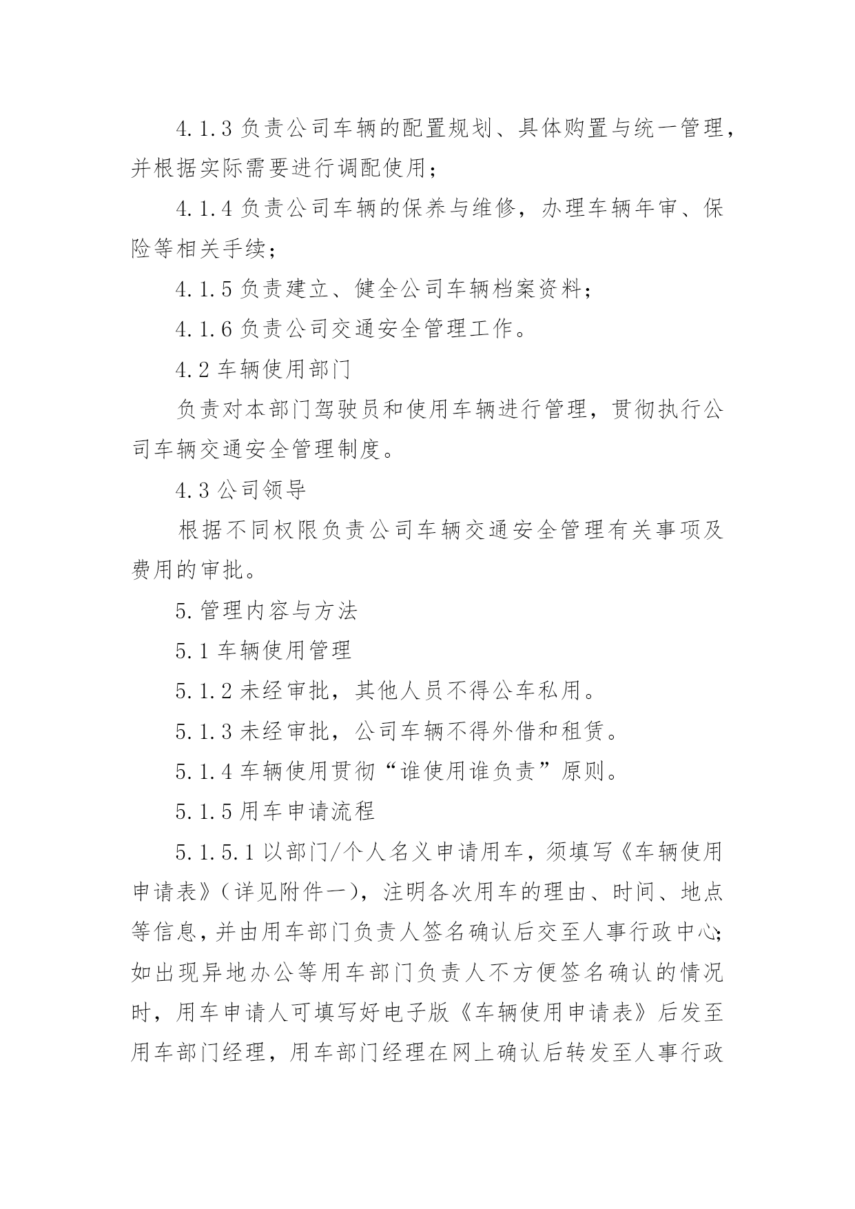 公司交通安全管理制度随着社会不断地进步,制度起到的作用越来越大,制度是一种要求大家共同遵守的规章或准则。想学习拟定制度却不知道该请教谁?下面是小编帮大家整理的公司交通安全管理制度,希望对大家有所帮助。公司交通安全管理制度1为加强校内交通管理,维护校内秩序,保障师生员工安全,特制定本规定。一、校外车辆未经允许不得进入校内内,特别状况需经主管部门同意、登记后方可进入。二、进入校内内的.全部人员、车辆都必需遵守有关交通法规和本规定。三、各种车辆进出校门必需听从门卫执勤人员指挥,自觉接受门卫检查;禁止同学在校内骑自行车。四、各种车辆进入校内,须按规定路线、速度行驶;机动车进入校内后车速不超过每小时25公里,严禁鸣笛,严禁超速。五、各种车辆不得在校内随便停放。非本校机动车辆,未经允许夜间不得在校内停放,经允许过夜停放的车辆,应在指定地点停放。六、校内内严禁学车、练车、无证驾驶、酒后驾驶。七、机动车辆出门要自觉接受检查,对载有货物的车辆要履行手续后方可放行。八、举办校内大型活动,应根据有关规定,支配专人指挥车辆在活动场所四周指定位置有序停放;九、如遇校内施工,施工单位须在施工现场设置明显的安全警示标志。十、不允许同学乘坐无牌、无证、无营运手续、农用车辆及技术状况不好的机动车辆。十一、对违反以上规定者,视情节赐予批判教育和处分。公司交通安全管理制度21.目的为加强公司车辆交通安全管理,合理调配、使用车辆,确保行车安全,更好地为公司生产经营服务,结合公司实际情况,特制定本制度。2.适用范围本制度适用于广东广田丰投资集团有限公司。3.定义车辆交通安全管理:指对公司使用的车辆、驾驶员以及交通安全等的综合管理。4.职责4.1人事行政中心4.1.1负责本制度的解释与修订;4.1.2负责建立、健全公司车辆交通安全管理制度,制定相关安全管理措施并负责监督实施;4.1.3负责公司车辆的配置规划、具体购置与统一管理,并根据实际需要进行调配使用;4.1.4负责公司车辆的保养与维修,办理车辆年审、保险等相关手续;4.1.5负责建立、健全公司车辆档案资料;4.1.6负责公司交通安全管理工作。4.2车辆使用部门负责对本部门驾驶员和使用车辆进行管理,贯彻执行公司车辆交通安全管理制度。4.3公司领导根据不同权限负责公司车辆交通安全管理有关事项及费用的审批。5.管理内容与方法5.1车辆使用管理5.1.2未经审批,其他人员不得公车私用。5.1.3未经审批,公司车辆不得外借和租赁。5.1.4车辆使用贯彻“谁使用谁负责”原则。5.1.5用车申请流程5.1.5.1以部门/个人名义申请用车,须填写《车辆使用申请表》(详见附件一),注明各次用车的理由、时间、地点等信息,并由用车部门负责人签名确认后交至人事行政中心;如出现异地办公等用车部门负责人不方便签名确认的情况时,用车申请人可填写好电子版《车辆使用申请表》后发至用车部门经理,用车部门经理在网上确认后转发至人事行政中心总监处。原则上《车辆使用申请表》至少提前一天交给人事行政中心,如计划有变,应及时通知人事行政中心。5.1.5.2如当天来回,经人事行政中心行政主管确认后即可出车;如需过夜,应报人事行政中心分管领导确认后方可出车。确认后,人事行政中心根据当天用车情况安排司机、车辆。未经批准擅自动用车辆的,追究当事人责任。5.1.5.3如临时工作急需用车的,当天来回/过夜分别须经人事行政中心经理/人事行政中心分管领导电话确认同意后才能使用车辆,并于用车后三天内补办相关审批手续。5.1.5.4驾驶员出车前,需进行证件检查和车况检查:检查行车证件是否齐全有效,检查车辆轮胎、机油、冷却水、仪表、后视镜、方向、刹车等。5.1.5.5车辆行驶中,驾驶员必须注意车辆使用状况,发现故障或安全隐患要做好记录,并及时向人事行政中心行政主管报告。5.1.6人事行政中心在调派车辆时,要根据公司当天使用车辆的.型号、乘车人数、次数、行车路线和急缓程度,有计划地安排使用车辆。5.1.7驾驶员交接车辆时,要办好交接手续,并检查车上各种证件和随车设备是否齐全、车辆外观有无破损、车况是否良好等。5.2车辆的保养、维修5.2.1驾驶员要爱护车辆,精心保养,保持车容整洁、车况良好。5.2.2恶劣天气检查:雷雨、台风、大雾等恶劣天气必须加强车辆的安全检查工作,检查内容与月度检查内容相同,重点检查车辆灯光、雨刮是否正常。5.2.3公司所有车辆原则上必须在定点维修保养厂家进行维修/保养。如发生异地出差时车辆爆胎等特殊情况,应及时报告人事行政中心行政主管,经批准后,方可在外维修/保养,否则不予结算。5.2.4车辆维修前,专职司机应进行现场检查,鉴定故障原因、维修项目及维修价格,并填写《车辆保养维修申请表》(详见附件二),按流程报领导审批后方可进行维修。单次维修/保养金额为100