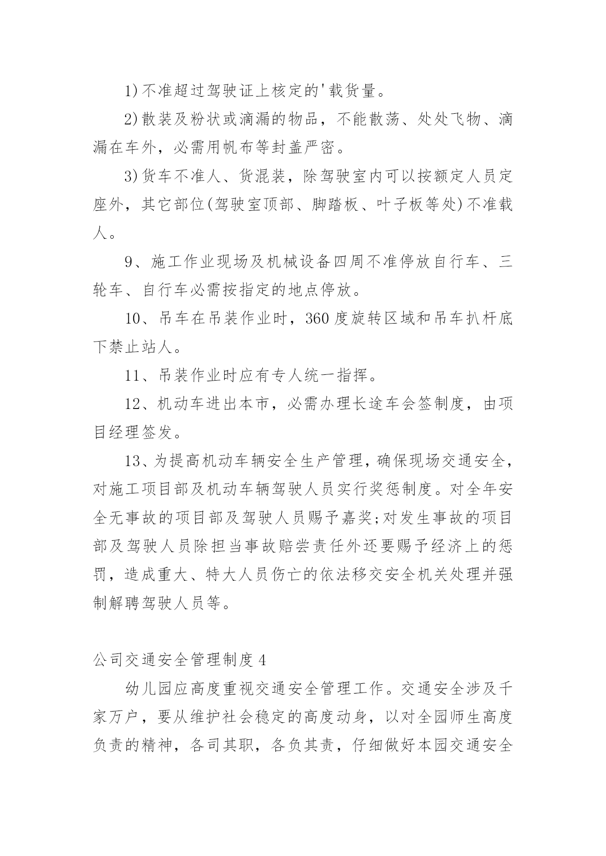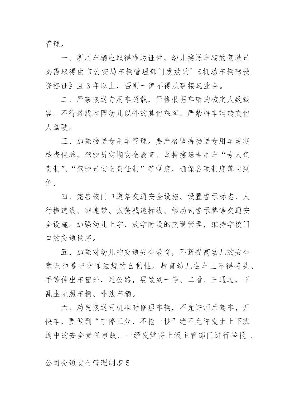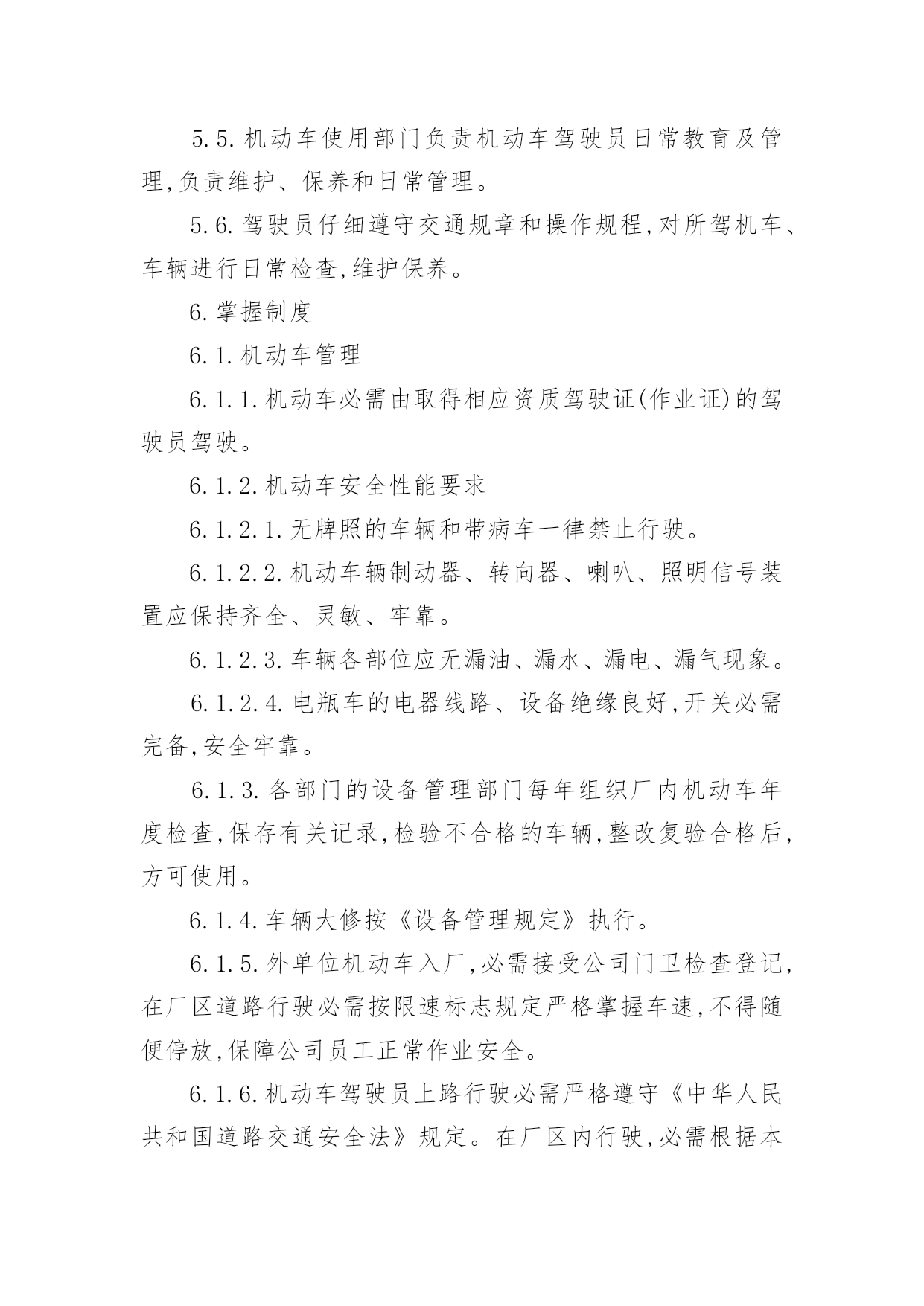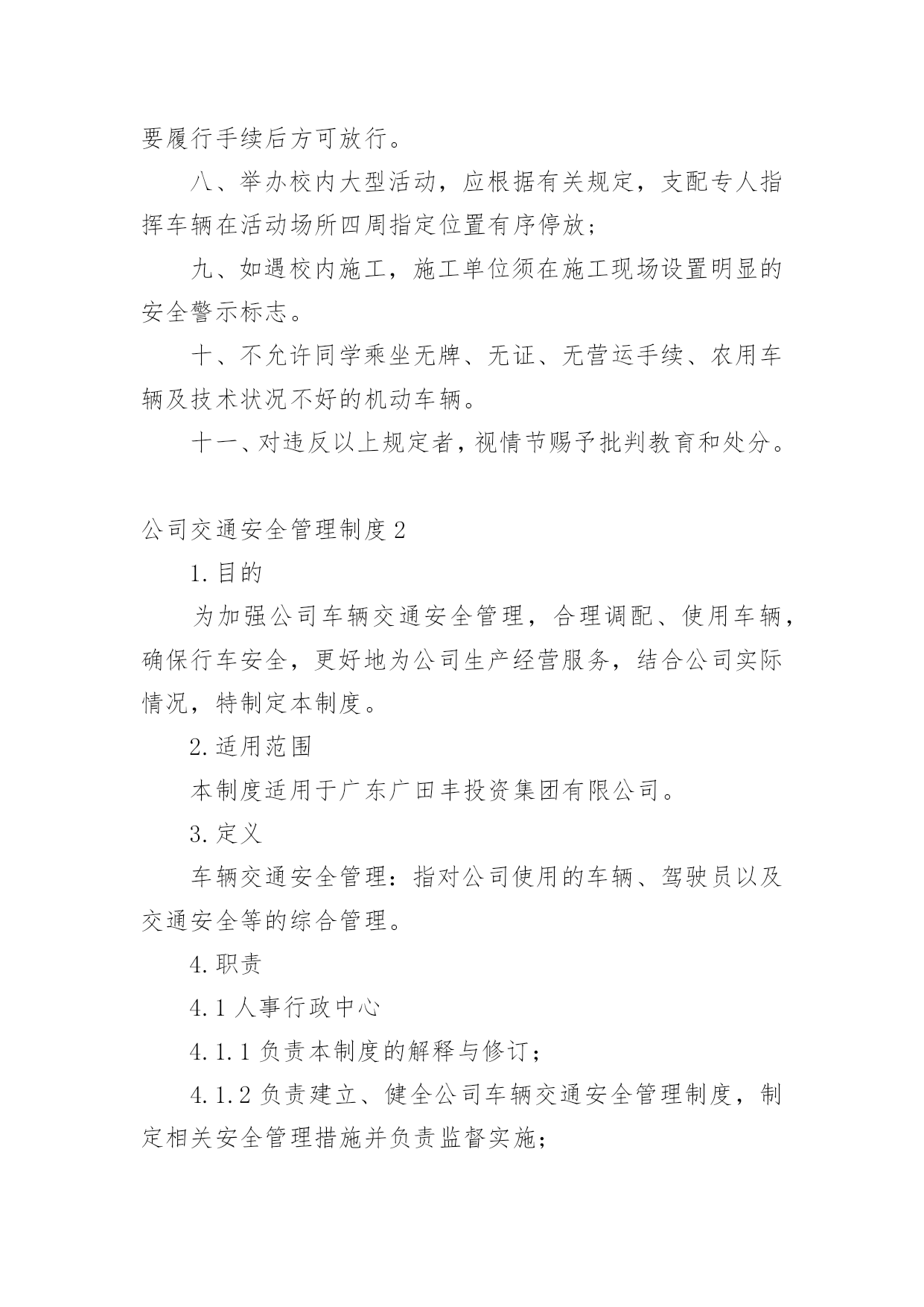 公司交通安全管理制度随着社会不断地进步,制度起到的作用越来越大,制度是一种要求大家共同遵守的规章或准则。想学习拟定制度却不知道该请教谁?下面是小编帮大家整理的公司交通安全管理制度,希望对大家有所帮助。公司交通安全管理制度1为加强校内交通管理,维护校内秩序,保障师生员工安全,特制定本规定。一、校外车辆未经允许不得进入校内内,特别状况需经主管部门同意、登记后方可进入。二、进入校内内的.全部人员、车辆都必需遵守有关交通法规和本规定。三、各种车辆进出校门必需听从门卫执勤人员指挥,自觉接受门卫检查;禁止同学在校内骑自行车。四、各种车辆进入校内,须按规定路线、速度行驶;机动车进入校内后车速不超过每小时25公里,严禁鸣笛,严禁超速。五、各种车辆不得在校内随便停放。非本校机动车辆,未经允许夜间不得在校内停放,经允许过夜停放的车辆,应在指定地点停放。六、校内内严禁学车、练车、无证驾驶、酒后驾驶。七、机动车辆出门要自觉接受检查,对载有货物的车辆要履行手续后方可放行。八、举办校内大型活动,应根据有关规定,支配专人指挥车辆在活动场所四周指定位置有序停放;九、如遇校内施工,施工单位须在施工现场设置明显的安全警示标志。十、不允许同学乘坐无牌、无证、无营运手续、农用车辆及技术状况不好的机动车辆。十一、对违反以上规定者,视情节赐予批判教育和处分。公司交通安全管理制度21.目的为加强公司车辆交通安全管理,合理调配、使用车辆,确保行车安全,更好地为公司生产经营服务,结合公司实际情况,特制定本制度。2.适用范围本制度适用于广东广田丰投资集团有限公司。3.定义车辆交通安全管理:指对公司使用的车辆、驾驶员以及交通安全等的综合管理。4.职责4.1人事行政中心4.1.1负责本制度的解释与修订;4.1.2负责建立、健全公司车辆交通安全管理制度,制定相关安全管理措施并负责监督实施;4.1.3负责公司车辆的配置规划、具体购置与统一管理,并根据实际需要进行调配使用;4.1.4负责公司车辆的保养与维修,办理车辆年审、保险等相关手续;4.1.5负责建立、健全公司车辆档案资料;4.1.6负责公司交通安全管理工作。4.2车辆使用部门负责对本部门驾驶员和使用车辆进行管理,贯彻执行公司车辆交通安全管理制度。4.3公司领导根据不同权限负责公司车辆交通安全管理有关事项及费用的审批。5.管理内容与方法5.1车辆使用管理5.1.2未经审批,其他人员不得公车私用。5.1.3未经审批,公司车辆不得外借和租赁。5.1.4车辆使用贯彻“谁使用谁负责”原则。5.1.5用车申请流程5.1.5.1以部门/个人名义申请用车,须填写《车辆使用申请表》(详见附件一),注明各次用车的理由、时间、地点等信息,并由用车部门负责人签名确认后交至人事行政中心;如出现异地办公等用车部门负责人不方便签名确认的情况时,用车申请人可填写好电子版《车辆使用申请表》后发至用车部门经理,用车部门经理在网上确认后转发至人事行政中心总监处。原则上《车辆使用申请表》至少提前一天交给人事行政中心,如计划有变,应及时通知人事行政中心。5.1.5.2如当天来回,经人事行政中心行政主管确认后即可出车;如需过夜,应报人事行政中心分管领导确认后方可出车。确认后,人事行政中心根据当天用车情况安排司机、车辆。未经批准擅自动用车辆的,追究当事人责任。5.1.5.3如临时工作急需用车的,当天来回/过夜分别须经人事行政中心经理/人事行政中心分管领导电话确认同意后才能使用车辆,并于用车后三天内补办相关审批手续。5.1.5.4驾驶员出车前,需进行证件检查和车况检查:检查行车证件是否齐全有效,检查车辆轮胎、机油、冷却水、仪表、后视镜、方向、刹车等。5.1.5.5车辆行驶中,驾驶员必须注意车辆使用状况,发现故障或安全隐患要做好记录,并及时向人事行政中心行政主管报告。5.1.6人事行政中心在调派车辆时,要根据公司当天使用车辆的.型号、乘车人数、次数、行车路线和急缓程度,有计划地安排使用车辆。5.1.7驾驶员交接车辆时,要办好交接手续,并检查车上各种证件和随车设备是否齐全、车辆外观有无破损、车况是否良好等。5.2车辆的保养、维修5.2.1驾驶员要爱护车辆,精心保养,保持车容整洁、车况良好。5.2.2恶劣天气检查:雷雨、台风、大雾等恶劣天气必须加强车辆的安全检查工作,检查内容与月度检查内容相同,重点检查车辆灯光、雨刮是否正常。5.2.3公司所有车辆原则上必须在定点维修保养厂家进行维修/保养。如发生异地出差时车辆爆胎等特殊情况,应及时报告人事行政中心行政主管,经批准后,方可在外维修/保养,否则不予结算。5.2.4车辆维修前,专职司机应进行现场检查,鉴定故障原因、维修项目及维修价格,并填写《车辆保养维修申请表》(详见附件二),按流程报领导审批后方可进行维修。单次维修/保养金额为100