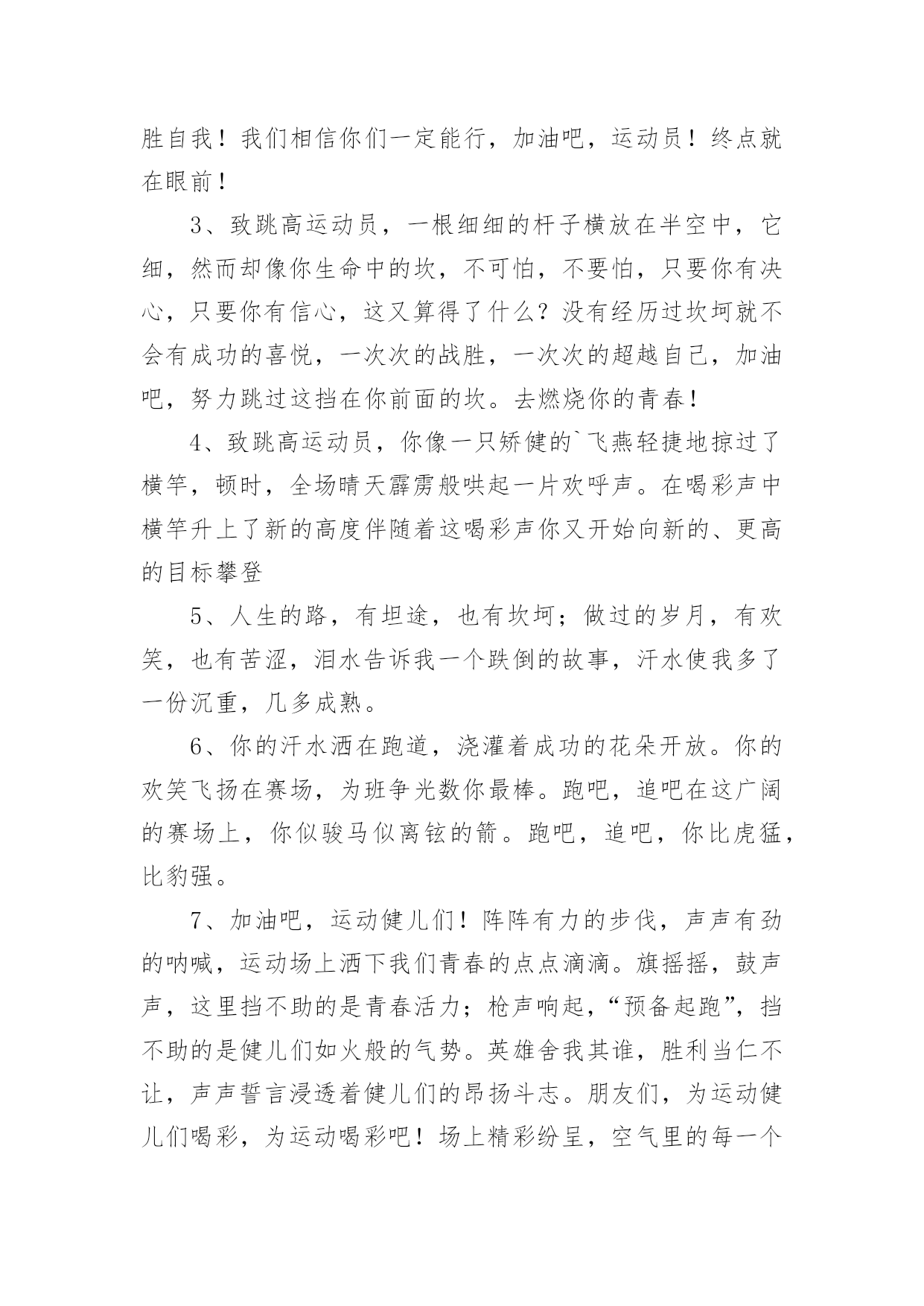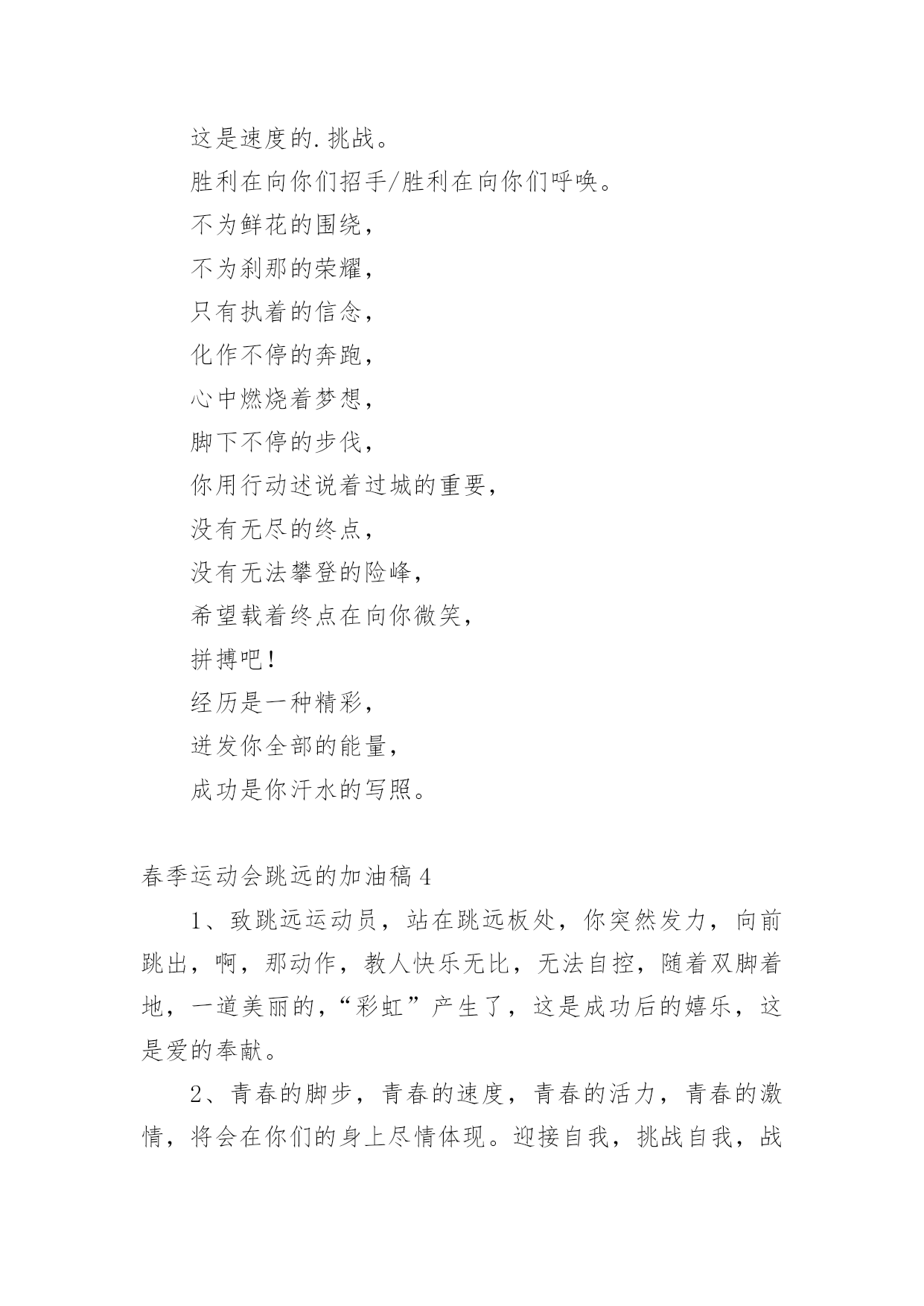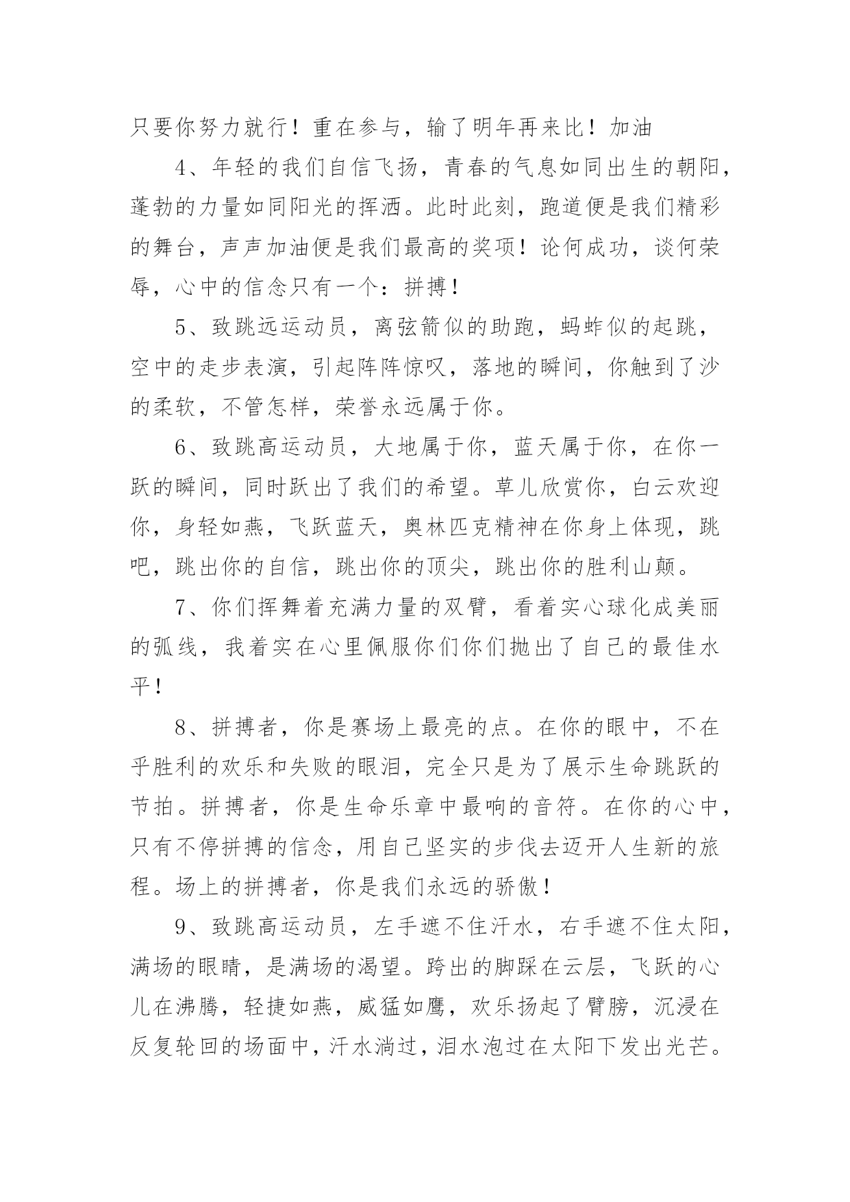 春季运动会跳远的加油稿在发展不断提速的社会中,越来越多人会去使用加油稿,借助加油稿可以表达对对方的鼓励和支持。你知道加油稿怎样才能写的好吗?以下是小编帮大家整理的春季运动会跳远的加油稿,欢迎大家分享。春季运动会跳远的加油稿1向前冲吧把所有的希望都洒在这几十米的跑道上加足油吧把所有的汗水都融在这十几米的.坑道中吧一二三跳!跳一阵有力的助跑后你腾空跃起顿时——然后——就会有个属于你的距离无论远近都是青春的风采无论胜负都是动人的旋律曲线——致跳高运动员你纵身一跃留下一条美丽的彩虹那七彩的色泽就是你灿烂的笑容也许那是一条完美的抛物线那均匀的尺度尽在你的把握之中或许,那是一条盘旋的DNA生命存在的意义被你细细描述春季运动会跳远的加油稿21、致跳高运动员,你像一只轻盈的小鹿,奔跃在那指向胜利的横杆间。一次,两次,不灭的是你那必胜的信心。终于,在那激动人心的瞬间一跃后,你露出了胜利的微笑。2、你赢得十分精彩,无需掩饰你的微笑,流露在你脸上。但我相信,你心中十分明白,征途刚刚开始,漫漫长路刚刚开头。加油啊,朋友,只有不断的拼搏,才可以不断战胜自己,战胜一切!向前、向前、向前!3、你站在草坪上,挥舞着双臂,所有的力量顿时间都凝聚在了手上。你那有力的手上,,抓着一个沉甸甸的实心球,你尽自己最打的力气投了出去。投近投远,都没关系,只要你努力就行!重在参与,输了明年再来比!加油4、年轻的我们自信飞扬,青春的气息如同出生的朝阳,蓬勃的力量如同阳光的挥洒。此时此刻,跑道便是我们精彩的舞台,声声加油便是我们最高的奖项!论何成功,谈何荣辱,心中的信念只有一个:拼搏!5、致跳远运动员,离弦箭似的助跑,蚂蚱似的起跳,空中的走步表演,引起阵阵惊叹,落地的瞬间,你触到了沙的柔软,不管怎样,荣誉永远属于你。6、致跳高运动员,大地属于你,蓝天属于你,在你一跃的瞬间,同时跃出了我们的希望。草儿欣赏你,白云欢迎你,身轻如燕,飞跃蓝天,奥林匹克精神在你身上体现,跳吧,跳出你的自信,跳出你的顶尖,跳出你的胜利山颠。7、你们挥舞着充满力量的双臂,看着实心球化成美丽的弧线,我着实在心里佩服你们你们抛出了自己的最佳水平!8、拼搏者,你是赛场上最亮的点。在你的眼中,不在乎胜利的欢乐和失败的眼泪,完全只是为了展示生命跳跃的节拍。拼搏者,你是生命乐章中最响的音符。在你的心中,只有不停拼搏的信念,用自己坚实的步伐去迈开人生新的旅程。场上的拼搏者,你是我们永远的骄傲!9、致跳高运动员,左手遮不住汗水,右手遮不住太阳,满场的眼睛,是满场的渴望。跨出的脚踩在云层,飞跃的心儿在沸腾,轻捷如燕,威猛如鹰,欢乐扬起了臂膀,沉浸在反复轮回的场面中,汗水淌过,泪水泡过在太阳下发出光芒。10、超越——致跳高运动员,在阳光的照耀下,跳高的比赛场地格外辉煌,运动健儿们,用那矫键的身躯,冲刺着一个又一个的高度。没有尝试,怎会知道自己是否为强者,超越自己,也许会创造一番新天地!运动健儿们加油吧,去创造一份份奇迹,去创造一份份惊喜!11、环形的.跑道一圈又一圈的坚持,毅力与精神活跃在会场上,湿透的衣衫,满头的大汗,无限追求,奋力追赶,我们为你欢呼、跳跃,我们为你骄傲!12、致跳高运动员,轻轻的你来了,正如你轻轻的过杆,悄悄的我们,正向你悄悄的祝福。勇敢的向上吧!你们最帮。勇敢的跃过那根冲向胜利的杆吧,我们期待着你们的胜利!13、致跳高者,在步伐优美的助跑后,一跃,身体在空中划出一道弧线,迅速沉身,收脚。过。真是优美的跳高姿势。每一次,都是挑战,是超越。为了每一次超越喝彩。春季运动会跳远的加油稿3蚂蚱似的起跳,空中的走步表演,引起阵阵惊叹,落地的瞬间,你触到了沙的柔软,不管怎样,荣誉永远属于你。这是意志的拼搏。这是速度的.挑战。胜利在向你们招手/胜利在向你们呼唤。不为鲜花的围绕,不为刹那的荣耀,只有执着的信念,化作不停的奔跑,心中燃烧着梦想,脚下不停的步伐,你用行动述说着过城的重要,没有无尽的终点,没有无法攀登的险峰,希望载着终点在向你微笑,拼搏吧!经历是一种精彩,迸发你全部的能量,成功是你汗水的写照。春季运动会跳远的加油稿41、致跳远运动员,站在跳远板处,你突然发力,向前跳出,啊,那动作,教人快乐无比,无法自控,随着双脚着地,一道美丽的,“彩虹”产生了,这是成功后的嬉乐,这是爱的奉献。2、青春的脚步,青春的速度,青春的活力,青春的激情,将会在你们的身上尽情体现。迎接自我,挑战自我,战胜自我!我们相信你们一定能行,加油吧,运动员!终点就在眼前!3、致跳高运动员,一根细细的杆子横放在半空中,它细,然而却像你生命中的坎,不可怕,不要怕,只要你有决心,只要你有信心,这又算得了什么?没有经历过坎坷就不会有成功的喜悦,一次次的战胜,一次次的超越自己,加油吧,努力跳过这挡在你前面的坎。去燃烧你的青春!4、致跳高运动员,你像一只矫