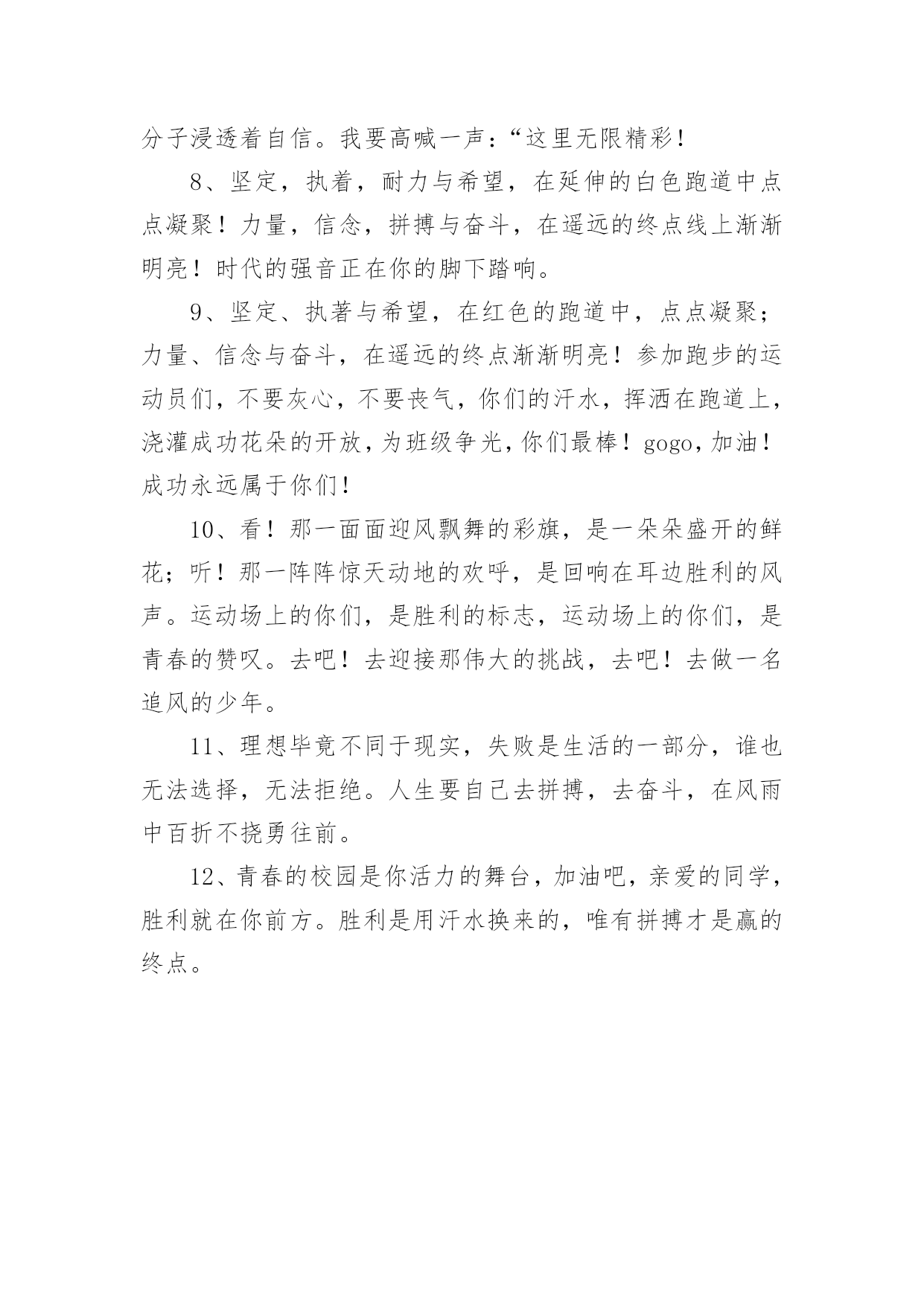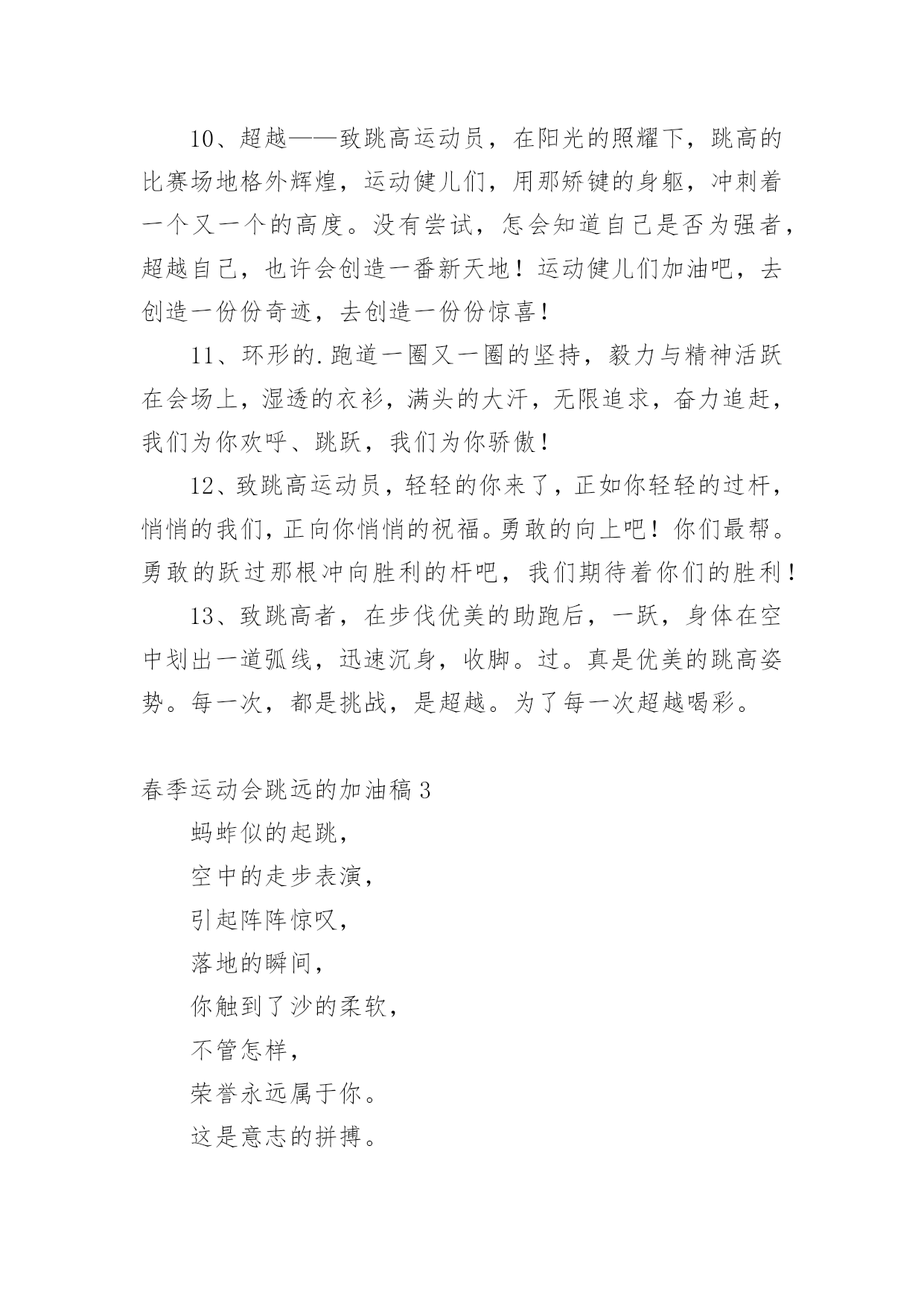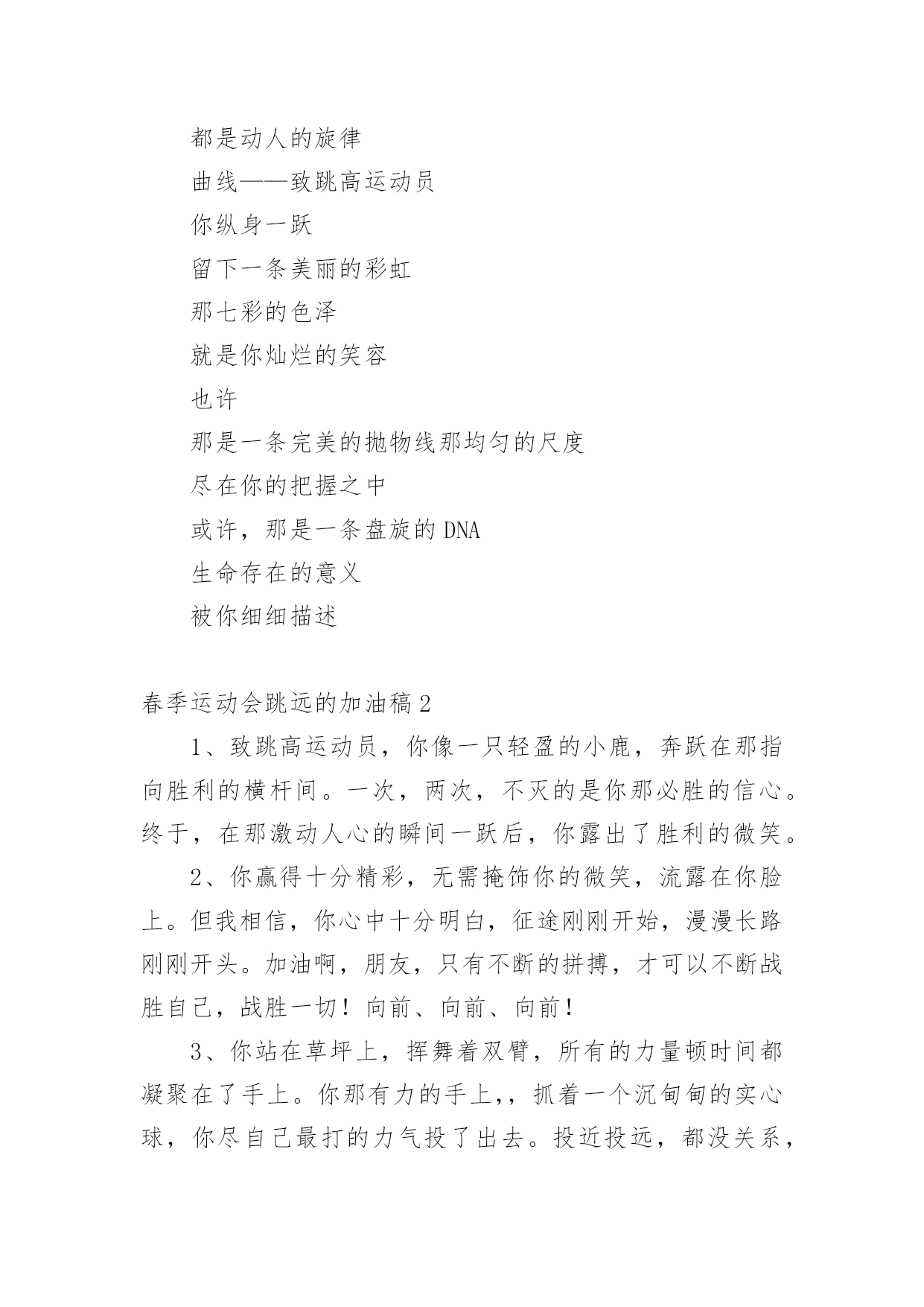 春季运动会跳远的加油稿在发展不断提速的社会中,越来越多人会去使用加油稿,借助加油稿可以表达对对方的鼓励和支持。你知道加油稿怎样才能写的好吗?以下是小编帮大家整理的春季运动会跳远的加油稿,欢迎大家分享。春季运动会跳远的加油稿1向前冲吧把所有的希望都洒在这几十米的跑道上加足油吧把所有的汗水都融在这十几米的.坑道中吧一二三跳!跳一阵有力的助跑后你腾空跃起顿时——然后——就会有个属于你的距离无论远近都是青春的风采无论胜负都是动人的旋律曲线——致跳高运动员你纵身一跃留下一条美丽的彩虹那七彩的色泽就是你灿烂的笑容也许那是一条完美的抛物线那均匀的尺度尽在你的把握之中或许,那是一条盘旋的DNA生命存在的意义被你细细描述春季运动会跳远的加油稿21、致跳高运动员,你像一只轻盈的小鹿,奔跃在那指向胜利的横杆间。一次,两次,不灭的是你那必胜的信心。终于,在那激动人心的瞬间一跃后,你露出了胜利的微笑。2、你赢得十分精彩,无需掩饰你的微笑,流露在你脸上。但我相信,你心中十分明白,征途刚刚开始,漫漫长路刚刚开头。加油啊,朋友,只有不断的拼搏,才可以不断战胜自己,战胜一切!向前、向前、向前!3、你站在草坪上,挥舞着双臂,所有的力量顿时间都凝聚在了手上。你那有力的手上,,抓着一个沉甸甸的实心球,你尽自己最打的力气投了出去。投近投远,都没关系,只要你努力就行!重在参与,输了明年再来比!加油4、年轻的我们自信飞扬,青春的气息如同出生的朝阳,蓬勃的力量如同阳光的挥洒。此时此刻,跑道便是我们精彩的舞台,声声加油便是我们最高的奖项!论何成功,谈何荣辱,心中的信念只有一个:拼搏!5、致跳远运动员,离弦箭似的助跑,蚂蚱似的起跳,空中的走步表演,引起阵阵惊叹,落地的瞬间,你触到了沙的柔软,不管怎样,荣誉永远属于你。6、致跳高运动员,大地属于你,蓝天属于你,在你一跃的瞬间,同时跃出了我们的希望。草儿欣赏你,白云欢迎你,身轻如燕,飞跃蓝天,奥林匹克精神在你身上体现,跳吧,跳出你的自信,跳出你的顶尖,跳出你的胜利山颠。7、你们挥舞着充满力量的双臂,看着实心球化成美丽的弧线,我着实在心里佩服你们你们抛出了自己的最佳水平!8、拼搏者,你是赛场上最亮的点。在你的眼中,不在乎胜利的欢乐和失败的眼泪,完全只是为了展示生命跳跃的节拍。拼搏者,你是生命乐章中最响的音符。在你的心中,只有不停拼搏的信念,用自己坚实的步伐去迈开人生新的旅程。场上的拼搏者,你是我们永远的骄傲!9、致跳高运动员,左手遮不住汗水,右手遮不住太阳,满场的眼睛,是满场的渴望。跨出的脚踩在云层,飞跃的心儿在沸腾,轻捷如燕,威猛如鹰,欢乐扬起了臂膀,沉浸在反复轮回的场面中,汗水淌过,泪水泡过在太阳下发出光芒。10、超越——致跳高运动员,在阳光的照耀下,跳高的比赛场地格外辉煌,运动健儿们,用那矫键的身躯,冲刺着一个又一个的高度。没有尝试,怎会知道自己是否为强者,超越自己,也许会创造一番新天地!运动健儿们加油吧,去创造一份份奇迹,去创造一份份惊喜!11、环形的.跑道一圈又一圈的坚持,毅力与精神活跃在会场上,湿透的衣衫,满头的大汗,无限追求,奋力追赶,我们为你欢呼、跳跃,我们为你骄傲!12、致跳高运动员,轻轻的你来了,正如你轻轻的过杆,悄悄的我们,正向你悄悄的祝福。勇敢的向上吧!你们最帮。勇敢的跃过那根冲向胜利的杆吧,我们期待着你们的胜利!13、致跳高者,在步伐优美的助跑后,一跃,身体在空中划出一道弧线,迅速沉身,收脚。过。真是优美的跳高姿势。每一次,都是挑战,是超越。为了每一次超越喝彩。春季运动会跳远的加油稿3蚂蚱似的起跳,空中的走步表演,引起阵阵惊叹,落地的瞬间,你触到了沙的柔软,不管怎样,荣誉永远属于你。这是意志的拼搏。这是速度的.挑战。胜利在向你们招手/胜利在向你们呼唤。不为鲜花的围绕,不为刹那的荣耀,只有执着的信念,化作不停的奔跑,心中燃烧着梦想,脚下不停的步伐,你用行动述说着过城的重要,没有无尽的终点,没有无法攀登的险峰,希望载着终点在向你微笑,拼搏吧!经历是一种精彩,迸发你全部的能量,成功是你汗水的写照。春季运动会跳远的加油稿41、致跳远运动员,站在跳远板处,你突然发力,向前跳出,啊,那动作,教人快乐无比,无法自控,随着双脚着地,一道美丽的,“彩虹”产生了,这是成功后的嬉乐,这是爱的奉献。2、青春的脚步,青春的速度,青春的活力,青春的激情,将会在你们的身上尽情体现。迎接自我,挑战自我,战胜自我!我们相信你们一定能行,加油吧,运动员!终点就在眼前!3、致跳高运动员,一根细细的杆子横放在半空中,它细,然而却像你生命中的坎,不可怕,不要怕,只要你有决心,只要你有信心,这又算得了什么?没有经历过坎坷就不会有成功的喜悦,一次次的战胜,一次次的超越自己,加油吧,努力跳过这挡在你前面的坎。去燃烧你的青春!4、致跳高运动员,你像一只矫