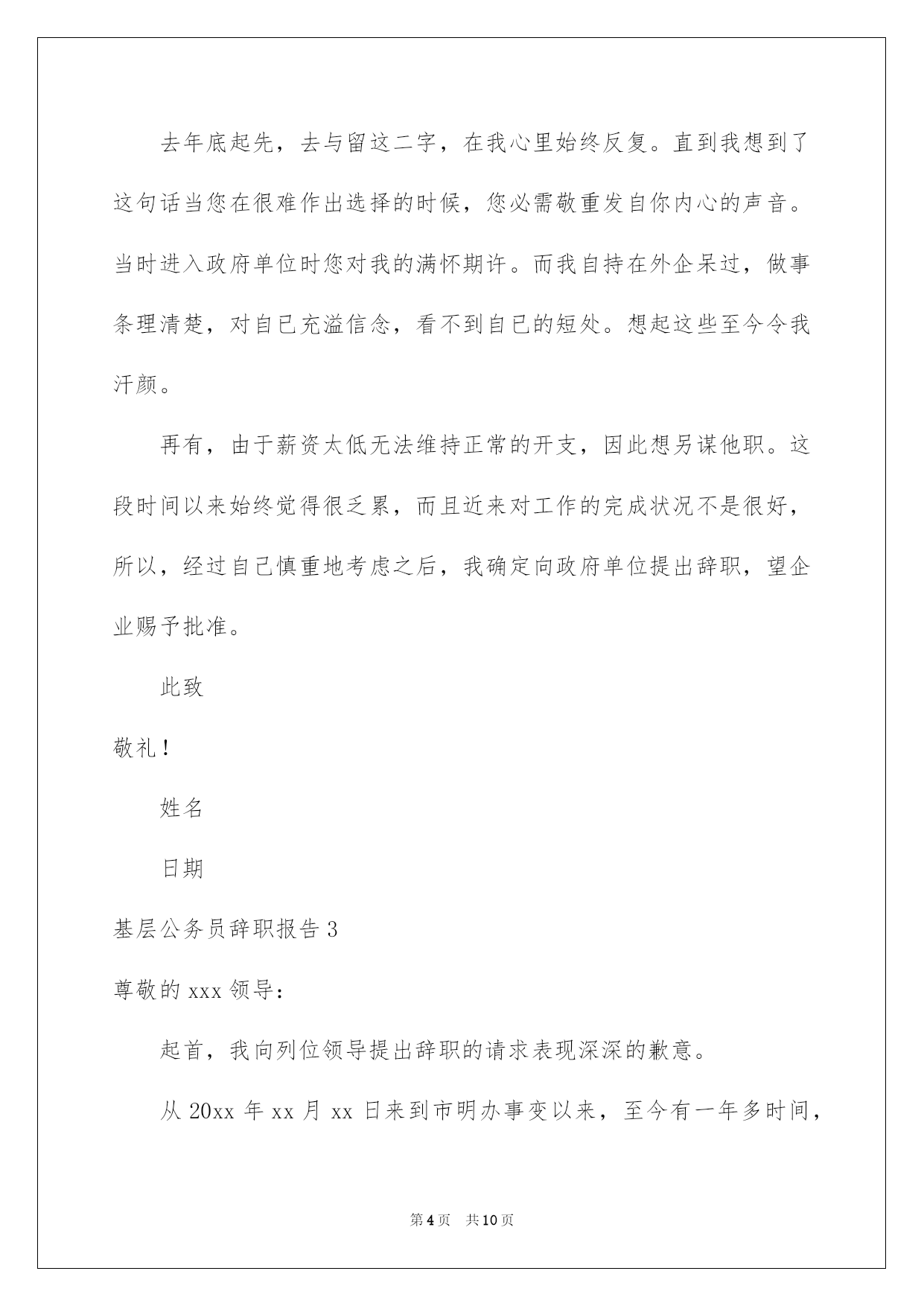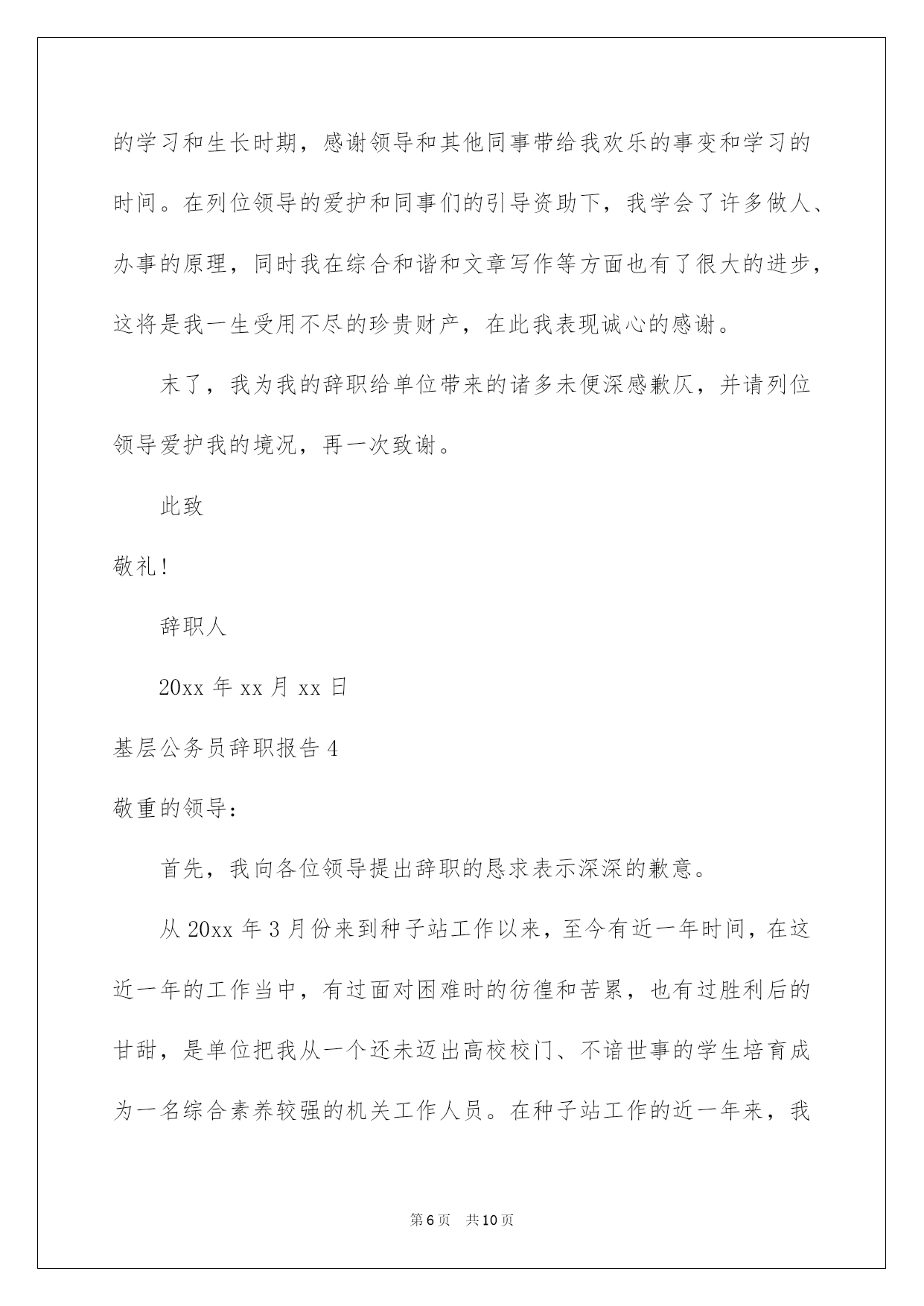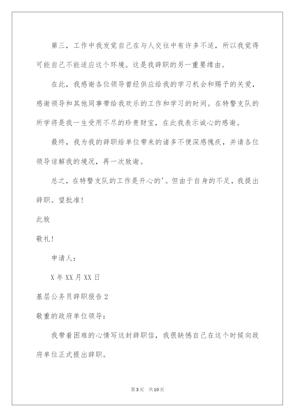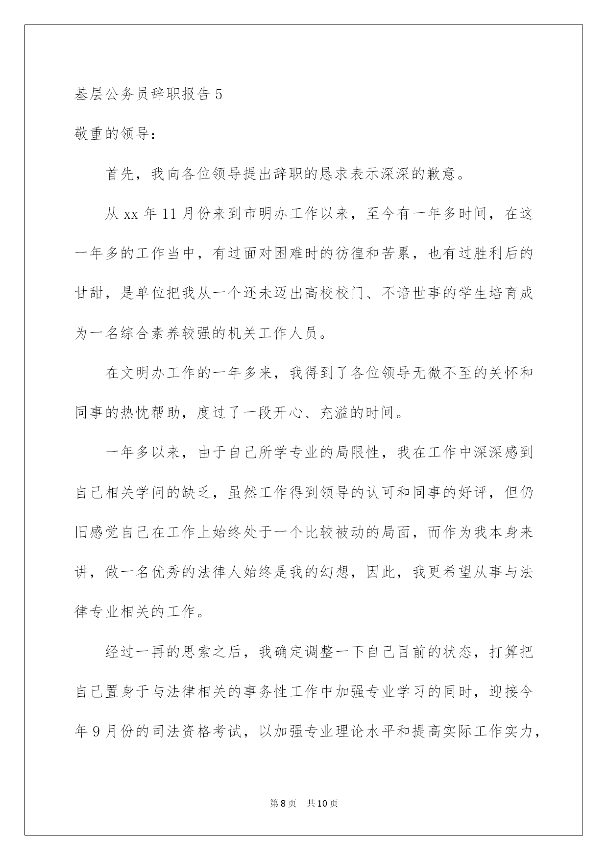 第PAGE\*Arabic\*MERGEFORMAT10页共NUMPAGES\*Arabic\*MERGEFORMAT10页第PAGE\*MERGEFORMAT10页共NUMPAGES\*MERGEFORMAT10页第PAGE\*MERGEFORMAT10页共NUMPAGES\*MERGEFORMAT10页第PAGE\*MERGEFORMAT10页共NUMPAGES\*MERGEFORMAT10页第PAGE\*MERGEFORMAT10页共NUMPAGES\*MERGEFORMAT10页第PAGE\*MERGEFORMAT10页共NUMPAGES\*MERGEFORMAT10页第PAGE\*MERGEFORMAT10页共NUMPAGES\*MERGEFORMAT10页第PAGE\*MERGEFORMAT10页共NUMPAGES\*MERGEFORMAT10页第PAGE\*MERGEFORMAT10页共NUMPAGES\*MERGEFORMAT10页第PAGE\*MERGEFORMAT10页共NUMPAGES\*MERGEFORMAT10页第PAGE\*MERGEFORMAT10页共NUMPAGES\*MERGEFORMAT10页2022基层公务员辞职报告基层公务员辞职报告随着个人素养的提升,报告的运用成为日常生活的常态,报告成为了一种新兴产业。那么什么样的报告才是有效的呢?以下是我为大家收集的基层公务员辞职报告,仅供参考,希望能够帮助到大家。基层公务员辞职报告1敬重的各位领导:你们好!首先为我的辞职申请向各位领导表示深深的歉意。自20xx年进入特警支队工作以来,在领导的关怀、同志的帮助下,我虚心学习,主动实践,获得了以下相识和感悟。第一,通过参加工作、开展教化、深化思索,我树立了公务员的责任感、使命感,相识到特警工作在维护社会稳定、构建和谐社会中的重要作用,相识到特警工作的长期性和困难性,相识到特警工作在维护社会稳定中的重要性,熬炼了细心、耐性、有恒心的工作看法和作风。其次,一年的工作使我体会到:做事先做人,正人先正己;看法确定思路,思路确定出路。可以说,特警支队使我完成了从学生到职业人的角色转变,在思想、相识、技能等方面获得了提高。我在特警支队工作期间,深刻感受到了特警支队的队伍团结,业务过硬的优良作风以及来之能战,战之能胜的过硬素养,在这里学到的东西将使我终生受益,我要感谢这段不平凡的岁月!我自20xx年进入公安队伍以来,不断相识到自身素养的薄弱,各项公安业务学问的不完善,正是这些不足是我决心要辞去职务,再学习再提高,所以经慎重考虑后,确定接着以全脱产形式学习深造,特提出此申请:我自愿申请辞去在合肥市公安局特警巡警支队的一切工作。第一,我自身身体素养不好,加上工作时间的超长和工作压力的加大,使我在身体上和精神上都感到很乏累,身体素养每况愈下,精神状态萎靡不振,所以希望能够在一个宽松的环境中使身体得到复原。这是我辞职的主要缘由。其次,工作中我发觉自己的学问还有许多欠缺,处理实际工作的技能还有许多不足,对真理和信仰的不懈追求使我希望有一个足够的时间来学习提高。这是我辞职的重要缘由。第三,工作中我发觉自己在与人交往中有许多不适,所以我觉得可能自己不能适应这个环境。这是我辞职的另一重要缘由。在此,我感谢各位领导曾经供应给我的学习机会和赐予的关爱,感谢领导和其他同事带给我欢乐的工作和学习的时间。在特警支队的所学将是我一生受用不尽的珍贵财宝,在此我表示诚心的感谢。最终,我为我的辞职给单位带来的诸多不便深感愧疚,并请各位领导谅解我的境况,再一次致谢。总之,在特警支队的工作是开心的'。但由于自身的不足,我提出辞职。望批准!此致敬礼!申请人:X年XX月XX日基层公务员辞职报告2敬重的政府单位领导:我带着困难的心情写这封辞职信,我很缺憾自己在这个时候向政府单位正式提出辞职。去年底起先,去与留这二字,在我心里始终反复。直到我想到了这句话当您在很难作出选择的时候,您必需敬重发自你内心的声音。当时进入政府单位时您对我的满怀期许。而我自持在外企呆过,做事条理清楚,对自已充溢信念,看不到自已的短处。想起这些至今令我汗颜。再有,由于薪资太低无法维持正常的开支,因此想另谋他职。这段时间以来始终觉得很乏累,而且近来对工作的完成状况不是很好,所以,经过自己慎重地考虑之后,我确定向政府单位提出辞职,望企业赐予批准。此致敬礼!姓名日期基层公务员辞职报告3尊敬的xxx领导:起首,我向列位领导提出辞职的请求表现深深的歉意。从20xx年xx月xx日来到市明办事变以来,至今有一年多时间,在这一年多的事变当中,有过面对