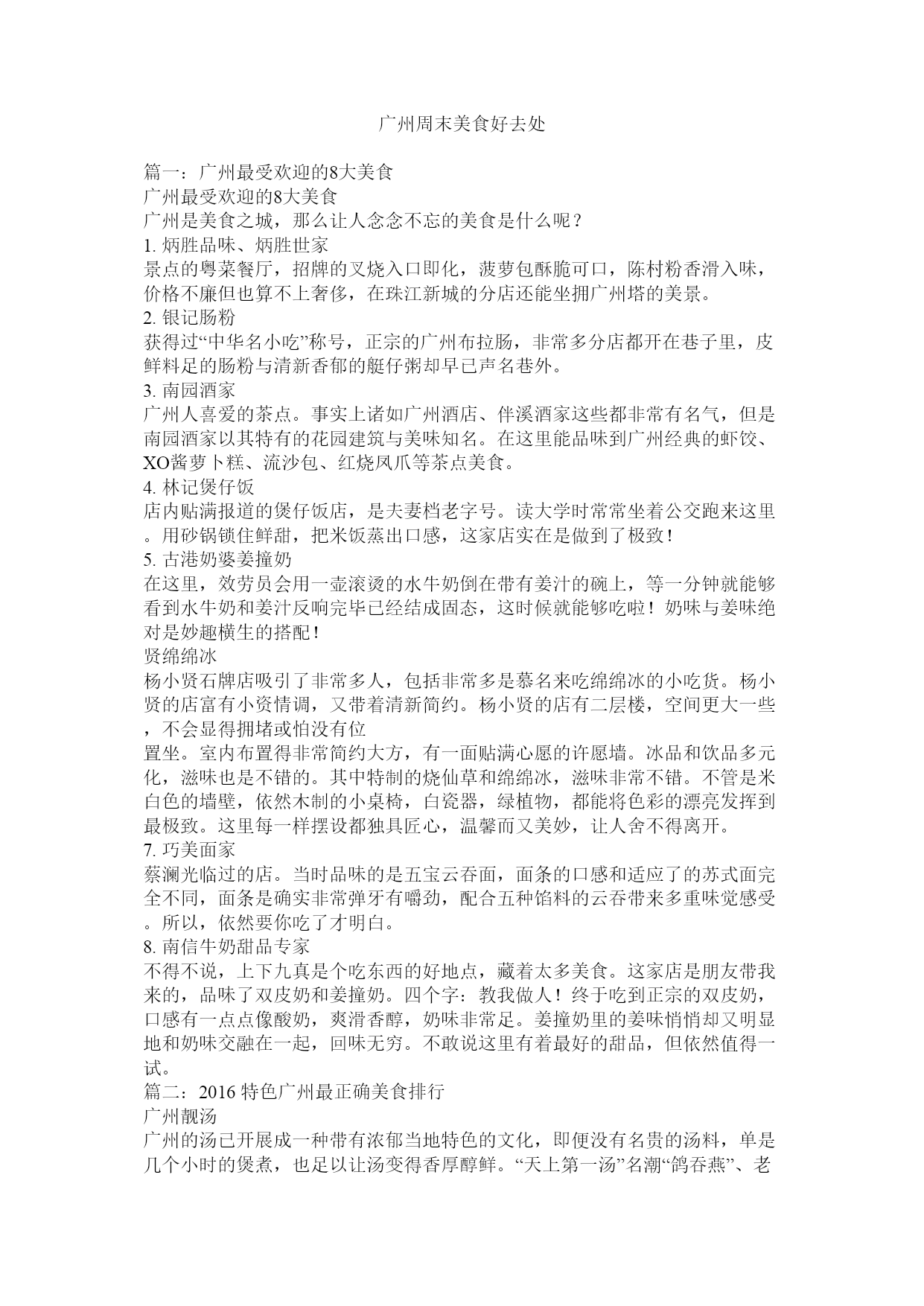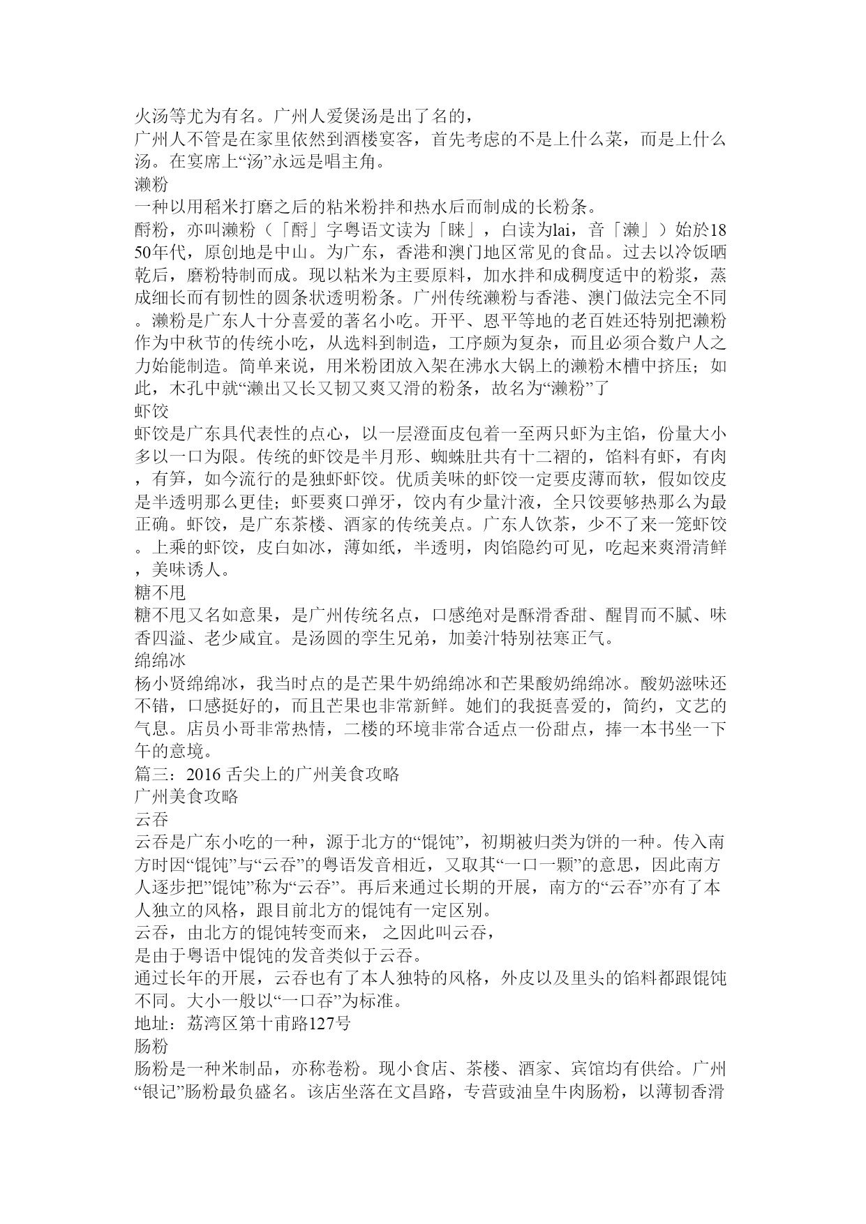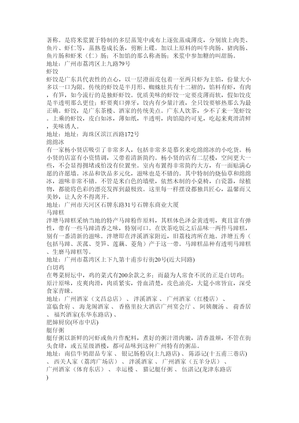 广州周末美食好去处篇一:广州最受欢迎的8大美食广州最受欢迎的8大美食广州是美食之城,那么让人念念不忘的美食是什么呢?1.炳胜品味、炳胜世家景点的粤菜餐厅,招牌的叉烧入口即化,菠萝包酥脆可口,陈村粉香滑入味,价格不廉但也算不上奢侈,在珠江新城的分店还能坐拥广州塔的美景。2.银记肠粉获得过“中华名小吃”称号,正宗的广州布拉肠,非常多分店都开在巷子里,皮鲜料足的肠粉与清新香郁的艇仔粥却早已声名巷外。3.南园酒家广州人喜爱的茶点。事实上诸如广州酒店、伴溪酒家这些都非常有名气,但是南园酒家以其特有的花园建筑与美味知名。在这里能品味到广州经典的虾饺、XO酱萝卜糕、流沙包、红烧凤爪等茶点美食。4.林记煲仔饭店内贴满报道的煲仔饭店,是夫妻档老字号。读大学时常常坐着公交跑来这里。用砂锅锁住鲜甜,把米饭蒸出口感,这家店实在是做到了极致!5.古港奶婆姜撞奶在这里,效劳员会用一壶滚烫的水牛奶倒在带有姜汁的碗上,等一分钟就能够看到水牛奶和姜汁反响完毕已经结成固态,这时候就能够吃啦!奶味与姜味绝对是妙趣横生的搭配!贤绵绵冰杨小贤石牌店吸引了非常多人,包括非常多是慕名来吃绵绵冰的小吃货。杨小贤的店富有小资情调,又带着清新简约。杨小贤的店有二层楼,空间更大一些,不会显得拥堵或怕没有位置坐。室内布置得非常简约大方,有一面贴满心愿的许愿墙。冰品和饮品多元化,滋味也是不错的。其中特制的烧仙草和绵绵冰,滋味非常不错。不管是米白色的墙壁,依然木制的小桌椅,白瓷器,绿植物,都能将色彩的漂亮发挥到最极致。这里每一样摆设都独具匠心,温馨而又美妙,让人舍不得离开。7.巧美面家蔡澜光临过的店。当时品味的是五宝云吞面,面条的口感和适应了的苏式面完全不同,面条是确实非常弹牙有嚼劲,配合五种馅料的云吞带来多重味觉感受。所以,依然要你吃了才明白。8.南信牛奶甜品专家不得不说,上下九真是个吃东西的好地点,藏着太多美食。这家店是朋友带我来的,品味了双皮奶和姜撞奶。四个字:教我做人!终于吃到正宗的双皮奶,口感有一点点像酸奶,爽滑香醇,奶味非常足。姜撞奶里的姜味悄悄却又明显地和奶味交融在一起,回味无穷。不敢说这里有着最好的甜品,但依然值得一试。篇二:2016特色广州最正确美食排行广州靓汤广州的汤已开展成一种带有浓郁当地特色的文化,即便没有名贵的汤料,单是几个小时的煲煮,也足以让汤变得香厚醇鲜。“天上第一汤”名潮“鸽吞燕”、老火汤等尤为有名。广州人爱煲汤是出了名的,广州人不管是在家里依然到酒楼宴客,首先考虑的不是上什么菜,而是上什么汤。在宴席上“汤”永远是唱主角。濑粉一种以用稻米打磨之后的粘米粉拌和热水后而制成的长粉条。酹粉,亦叫濑粉(「酹」字粤语文读为「睐」,白读为lai,音「濑」)始於1850年代,原创地是中山。为广东,香港和澳门地区常见的食品。过去以冷饭晒乾后,磨粉特制而成。现以粘米为主要原料,加水拌和成稠度适中的粉浆,蒸成细长而有韧性的圆条状透明粉条。广州传统濑粉与香港、澳门做法完全不同。濑粉是广东人十分喜爱的著名小吃。开平、恩平等地的老百姓还特别把濑粉作为中秋节的传统小吃,从选料到制造,工序颇为复杂,而且必须合数户人之力始能制造。简单来说,用米粉团放入架在沸水大锅上的濑粉木槽中挤压;如此,木孔中就“濑出又长又韧又爽又滑的粉条,故名为“濑粉”了虾饺虾饺是广东具代表性的点心,以一层澄面皮包着一至两只虾为主馅,份量大小多以一口为限。传统的虾饺是半月形、蜘蛛肚共有十二褶的,馅料有虾,有肉,有笋,如今流行的是独虾虾饺。优质美味的虾饺一定要皮薄而软,假如饺皮是半透明那么更佳;虾要爽口弹牙,饺内有少量汁液,全只饺要够热那么为最正确。虾饺,是广东茶楼、酒家的传统美点。广东人饮茶,少不了来一笼虾饺。上乘的虾饺,皮白如冰,薄如纸,半透明,肉馅隐约可见,吃起来爽滑清鲜,美味诱人。糖不甩糖不甩又名如意果,是广州传统名点,口感绝对是酥滑香甜、醒胃而不腻、味香四溢、老少咸宜。是汤圆的孪生兄弟,加姜汁特别祛寒正气。绵绵冰杨小贤绵绵冰,我当时点的是芒果牛奶绵绵冰和芒果酸奶绵绵冰。酸奶滋味还不错,口感挺好的,而且芒果也非常新鲜。她们的我挺喜爱的,简约,文艺的气息。店员小哥非常热情,二楼的环境非常合适点一份甜点,捧一本书坐一下午的意境。篇三:2016舌尖上的广州美食攻略广州美食攻略云吞云吞是广东小吃的一种,源于北方的“馄饨”,初期被归类为饼的一种。传入南方时因“馄饨”与“云吞”的粤语发音相近,又取其“一口一颗”的意思,因此南方人逐步把”馄饨”称为“云吞”。再后来通过长期的开展,南方的“云吞”亦有了本人独立的风格,跟目前北方的馄饨有一定区别。云吞,由北方的馄饨转变而来,之因此叫云吞,是由于粤语中馄饨的发音类似于云吞。通过长年的开展,云吞也有了本人独特的风